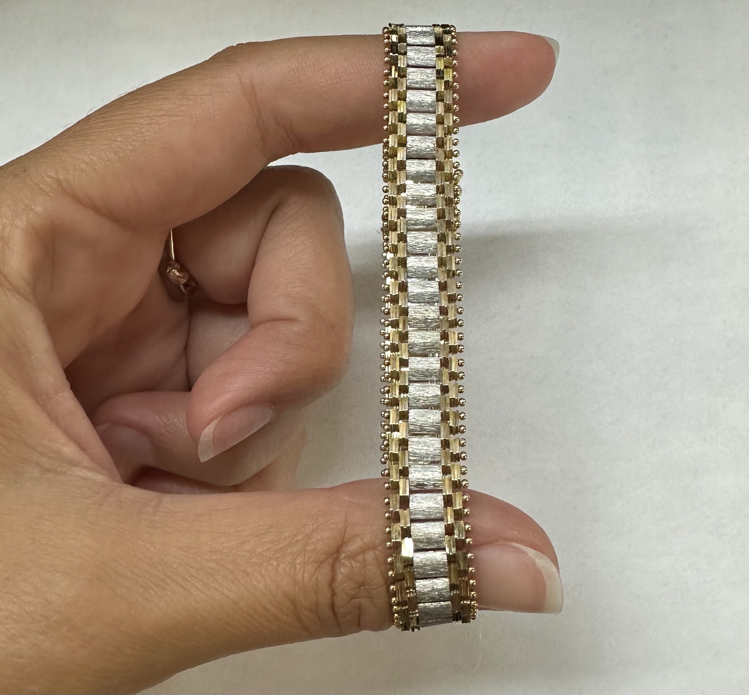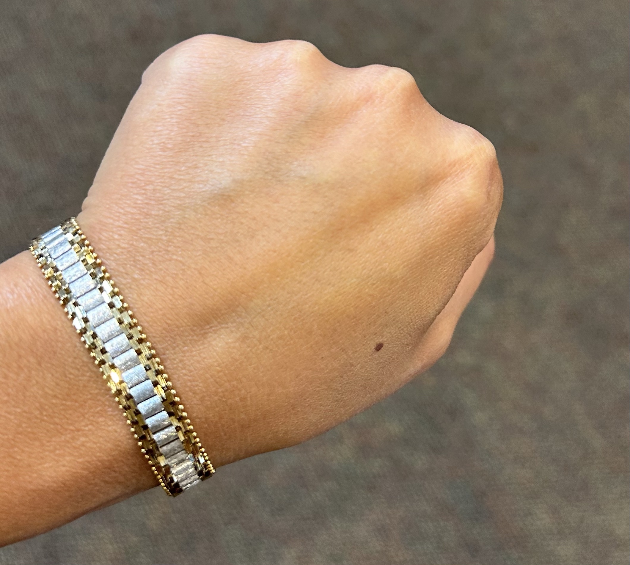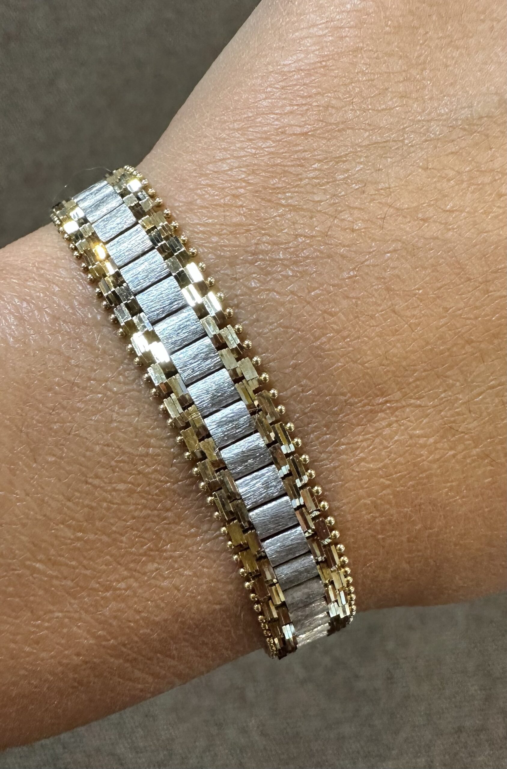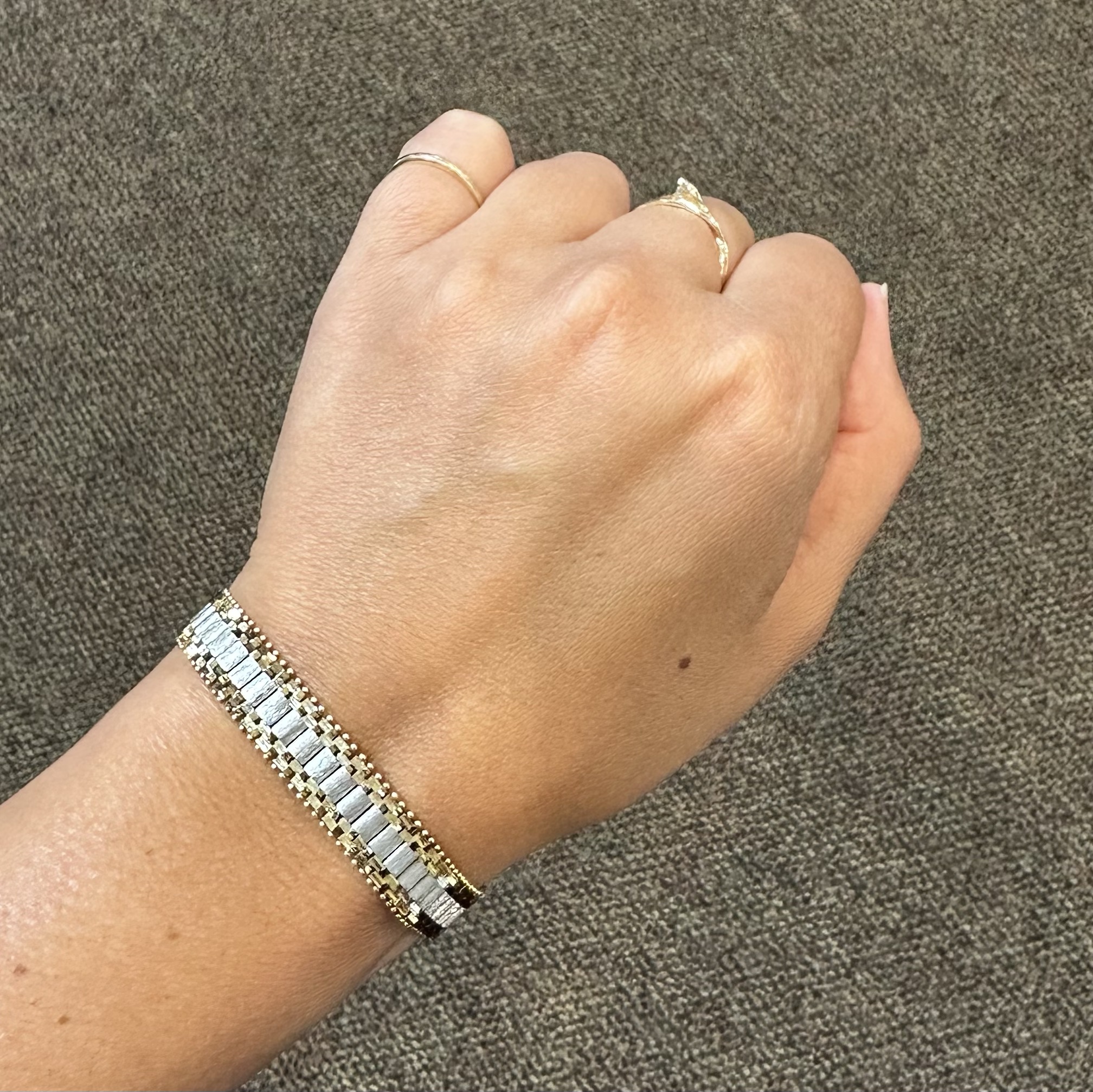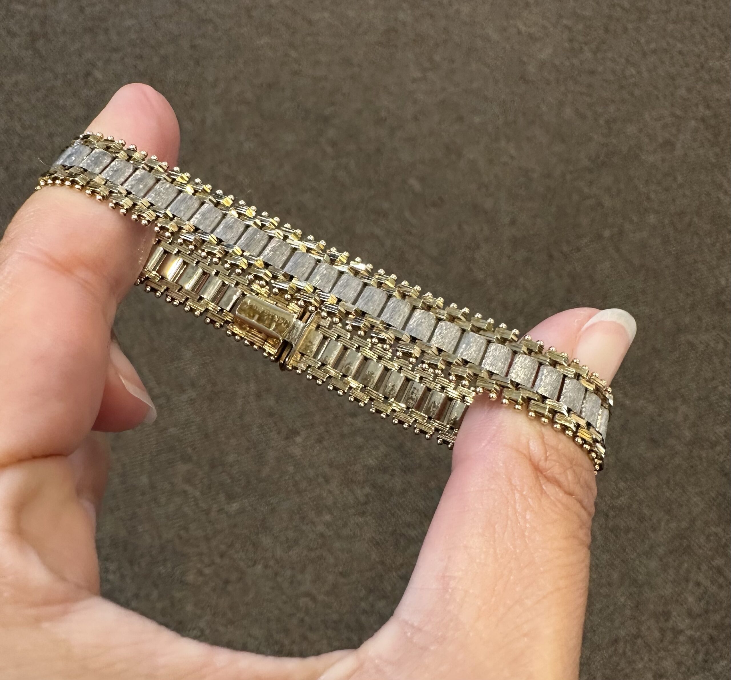 This is such a fun one- so sparkly! One-of-a-kind 14k white & 14k yellow gold 10 mm flexible link bracelet, 7 1/8”, 18.2 grams.