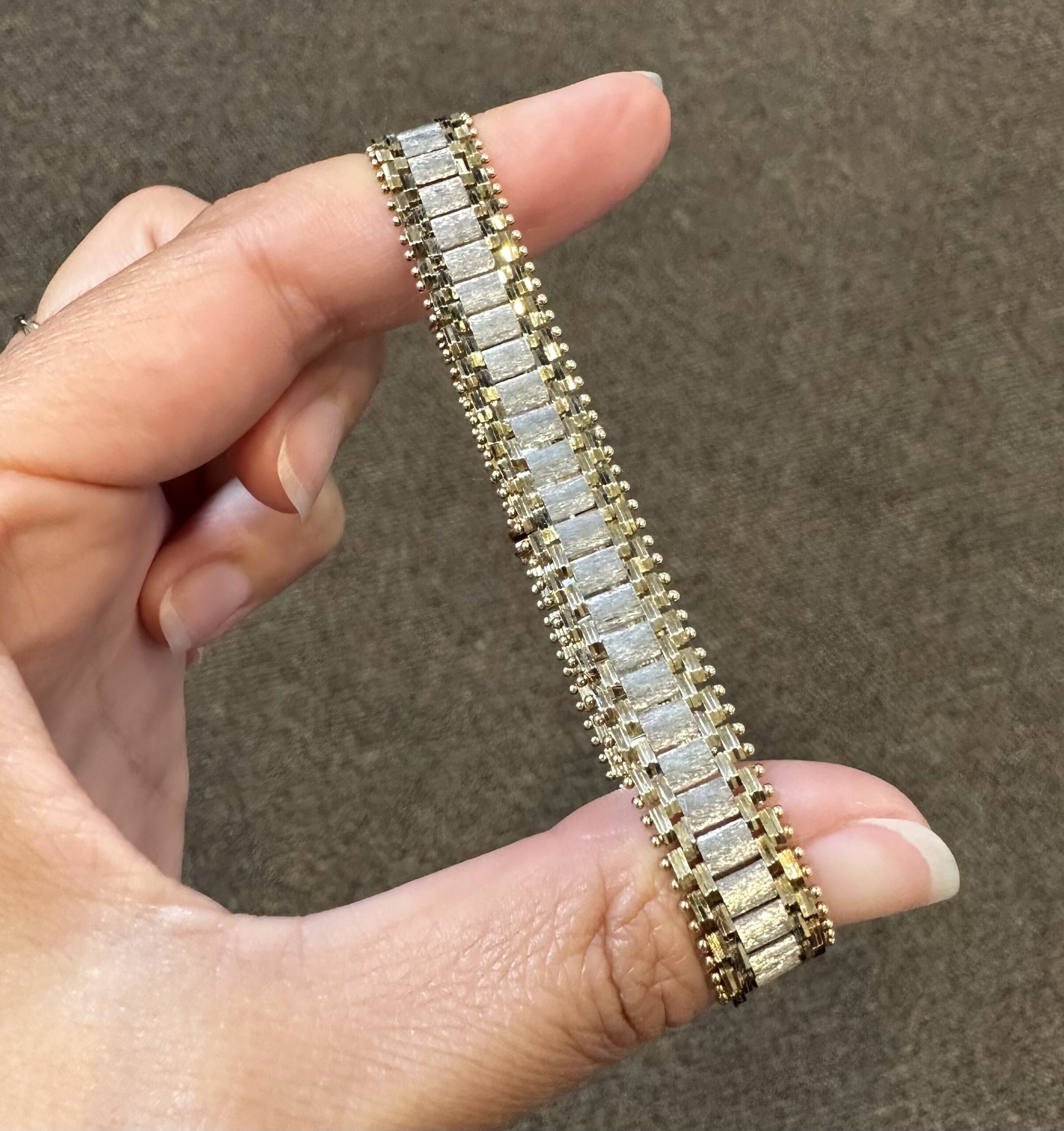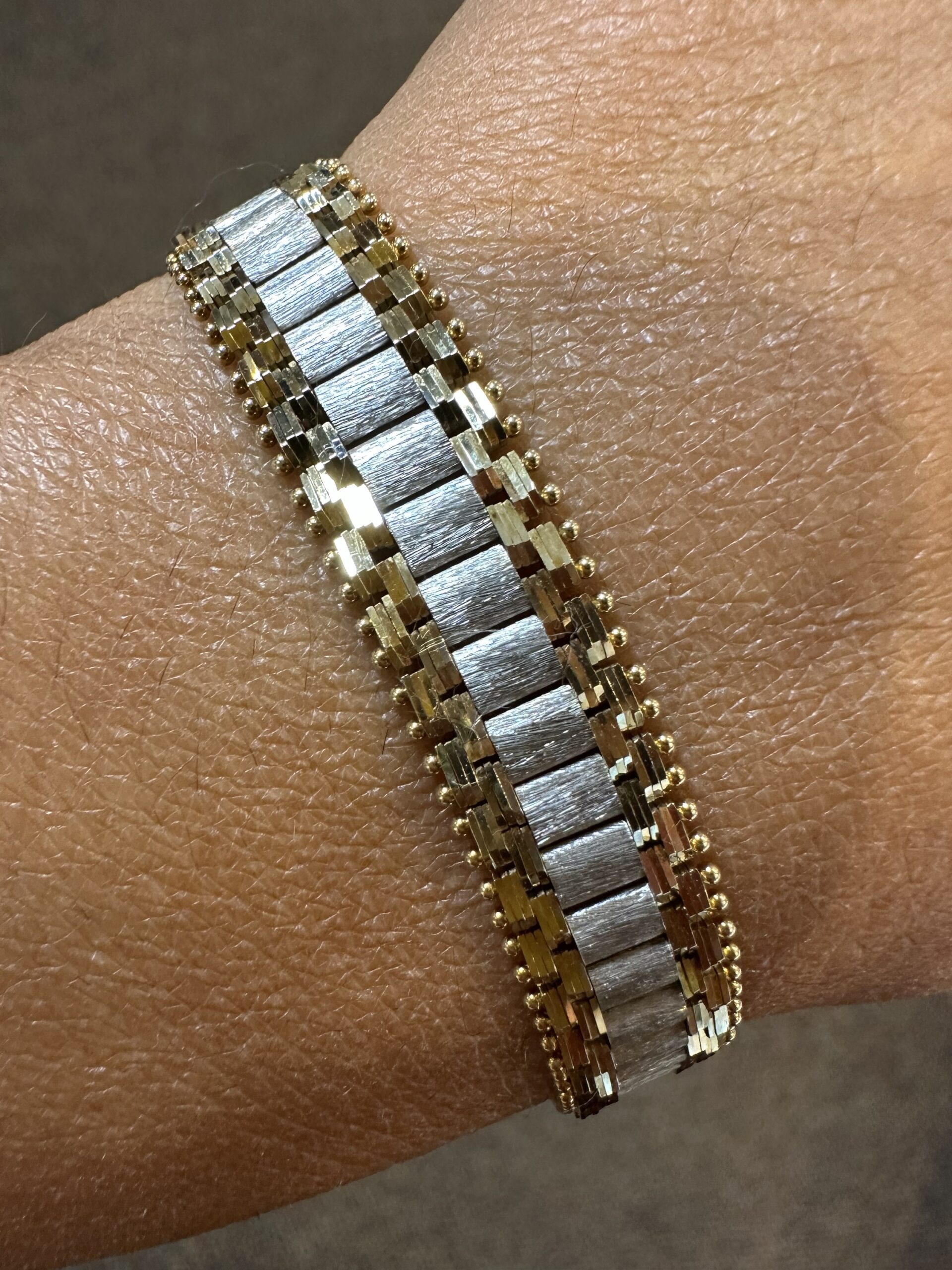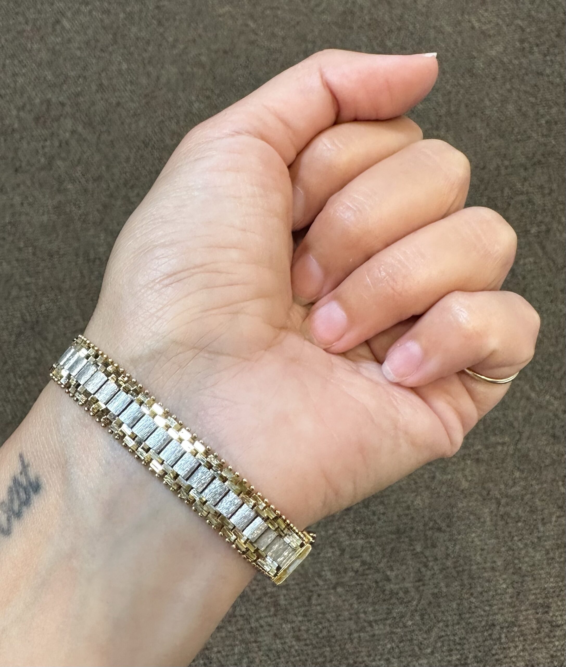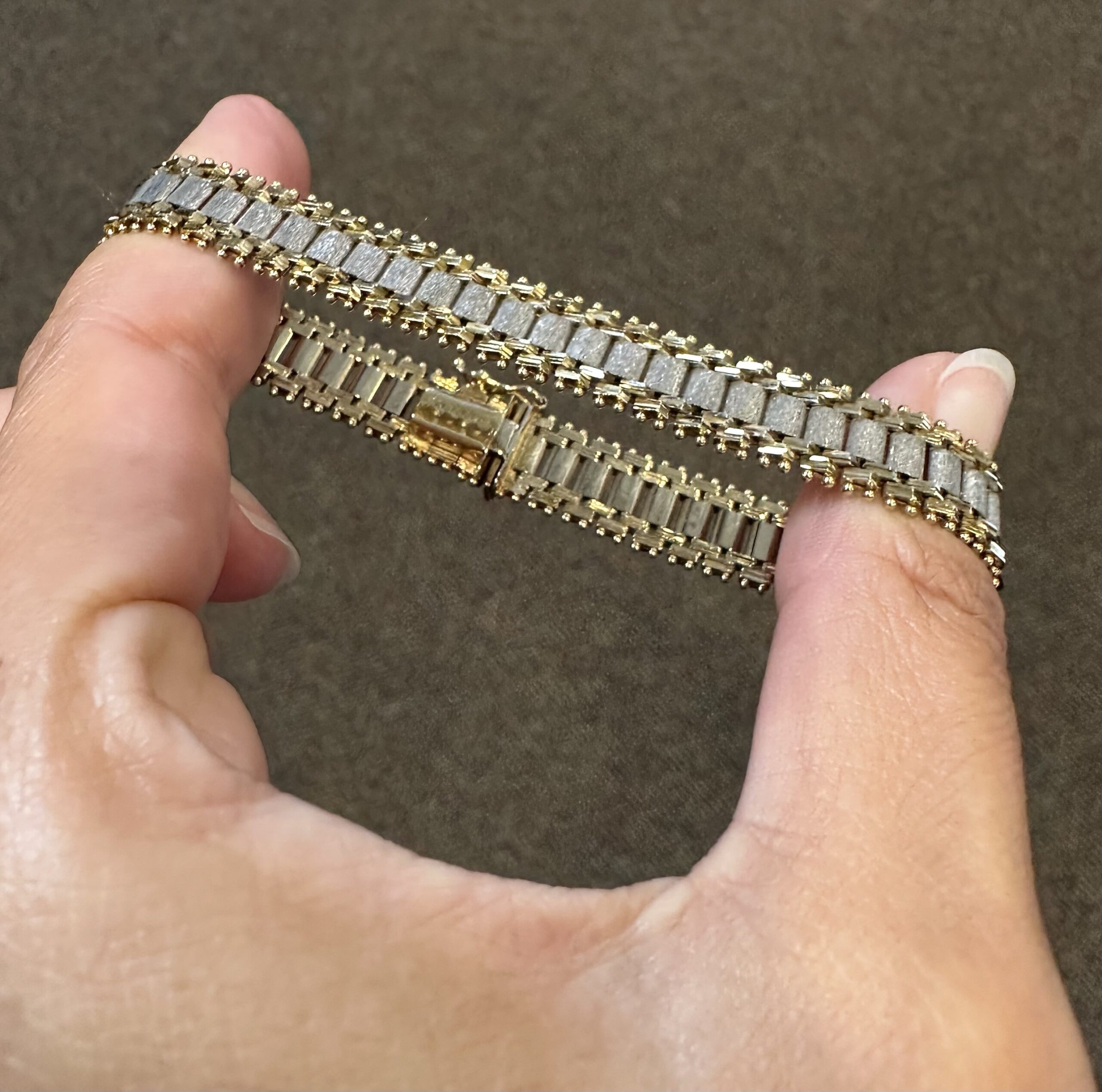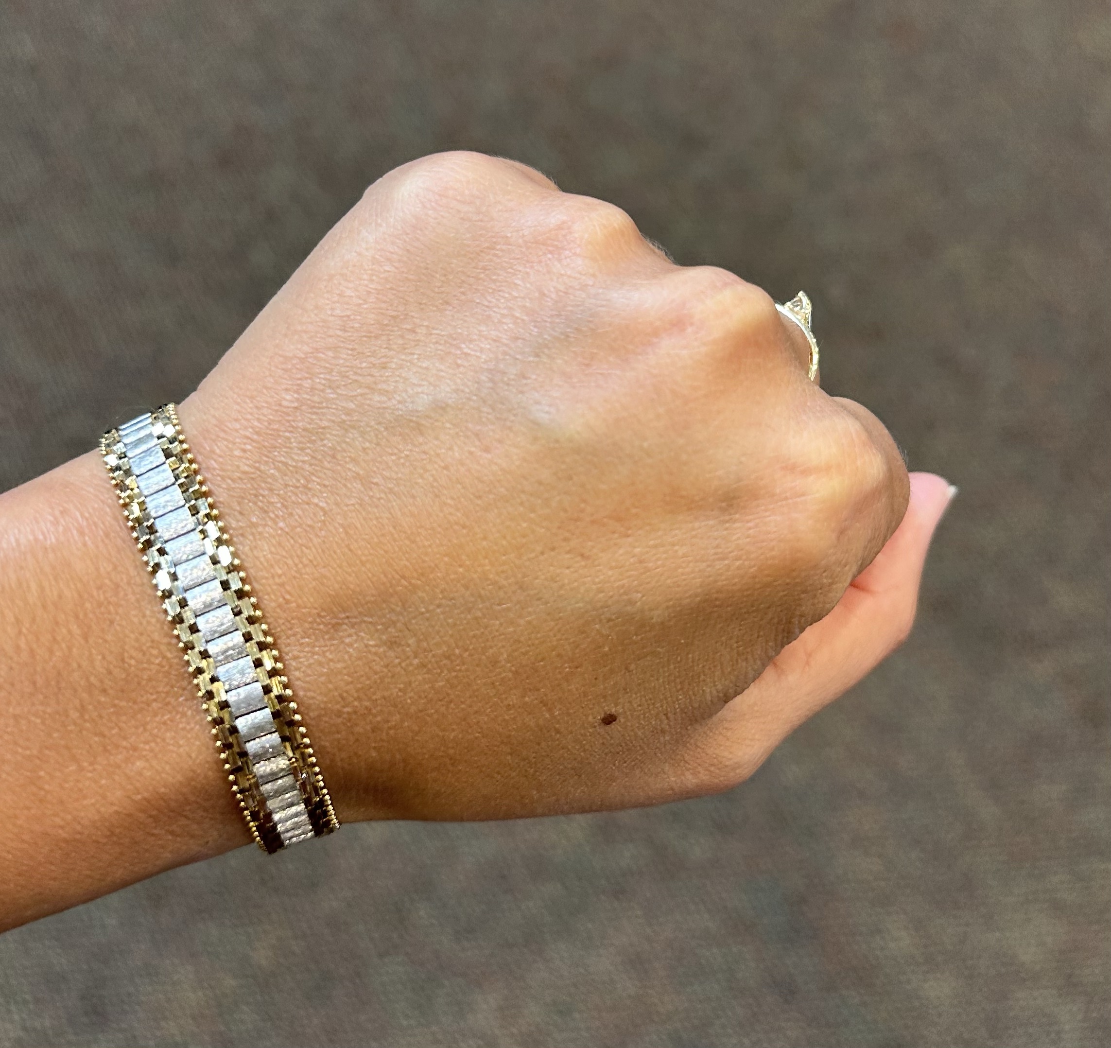 This is such a fun one- so sparkly! One-of-a-kind 14k white & 14k yellow gold 10 mm flexible link bracelet, 7 1/8”, 18.2 grams.