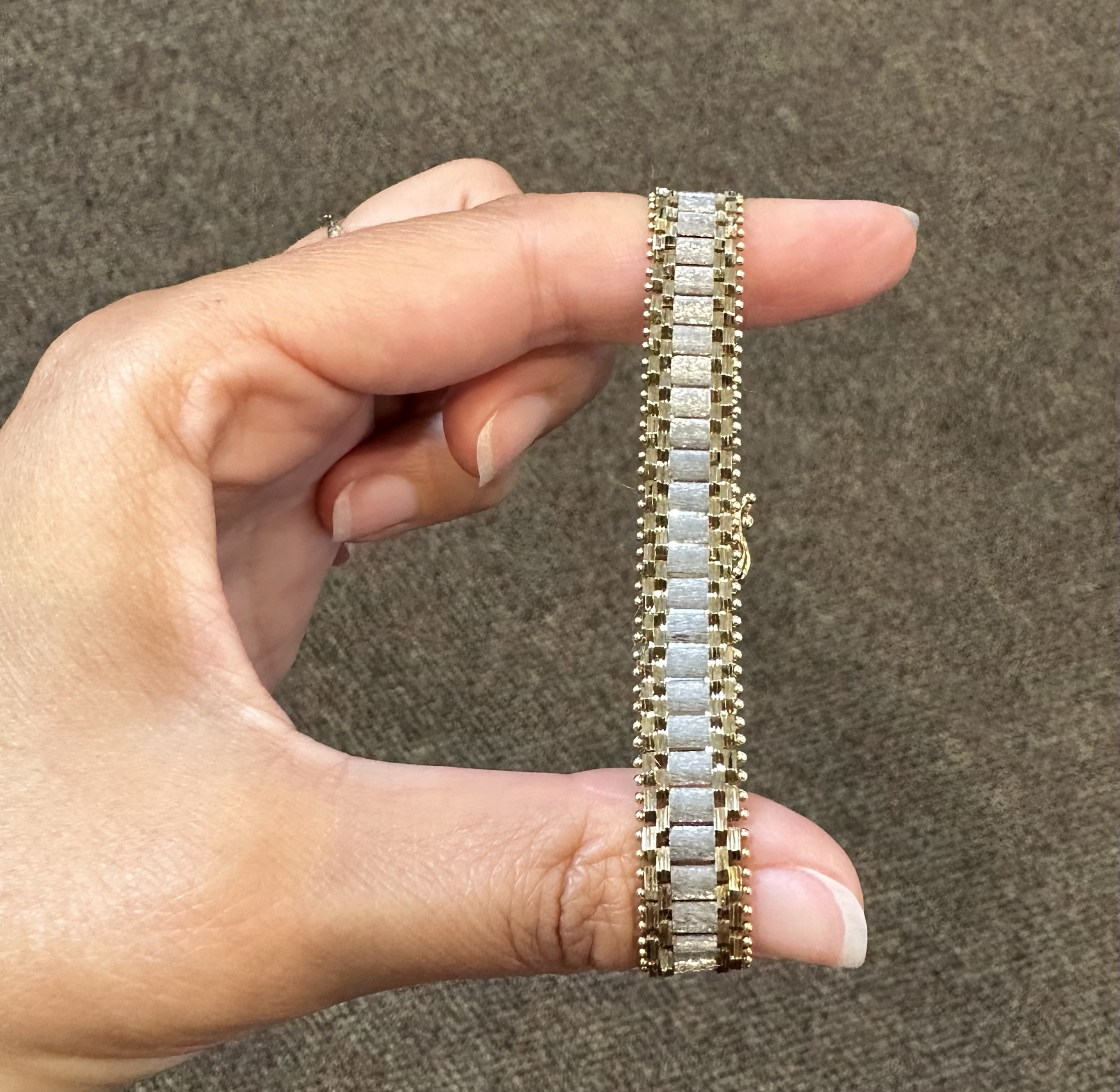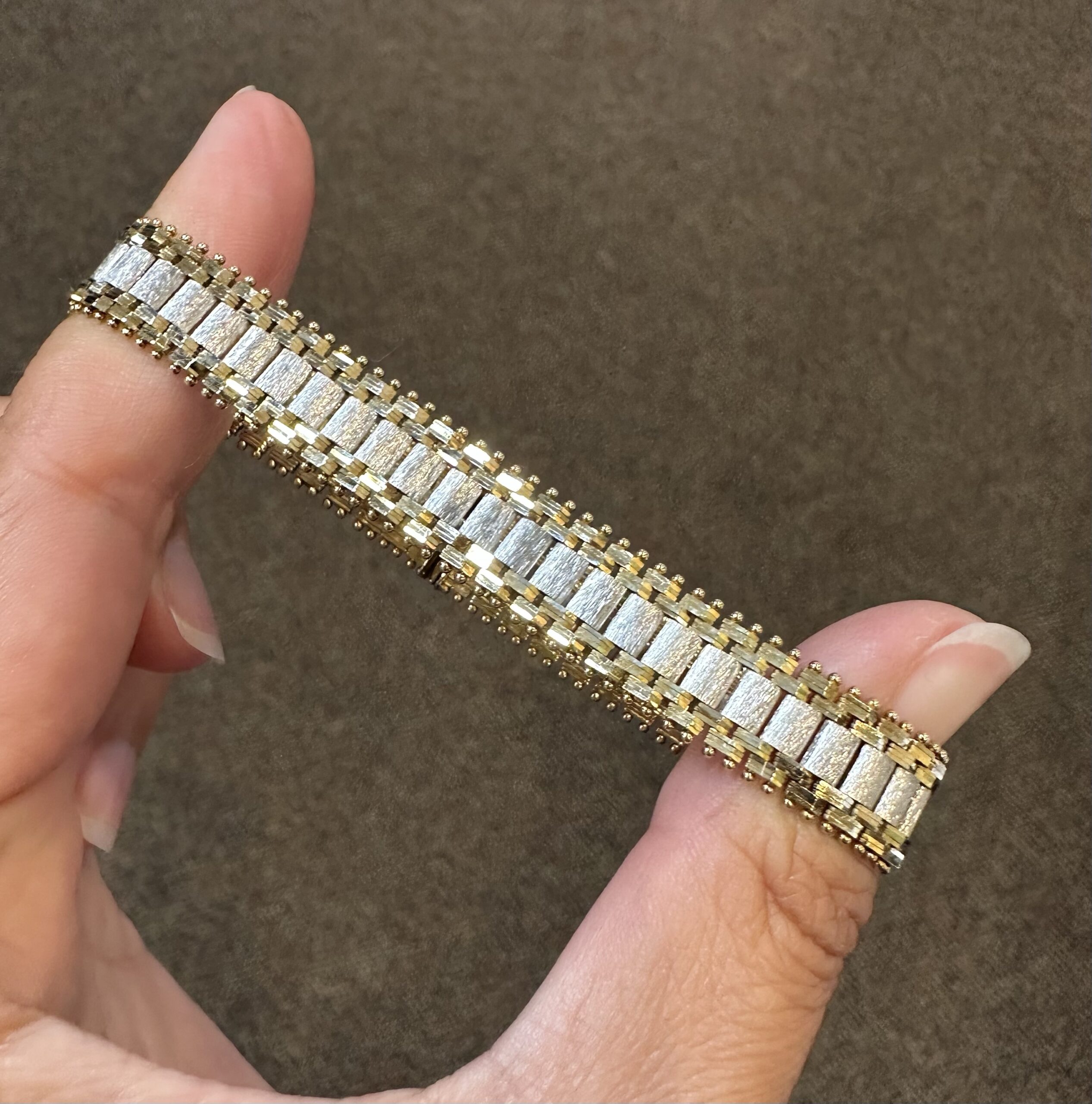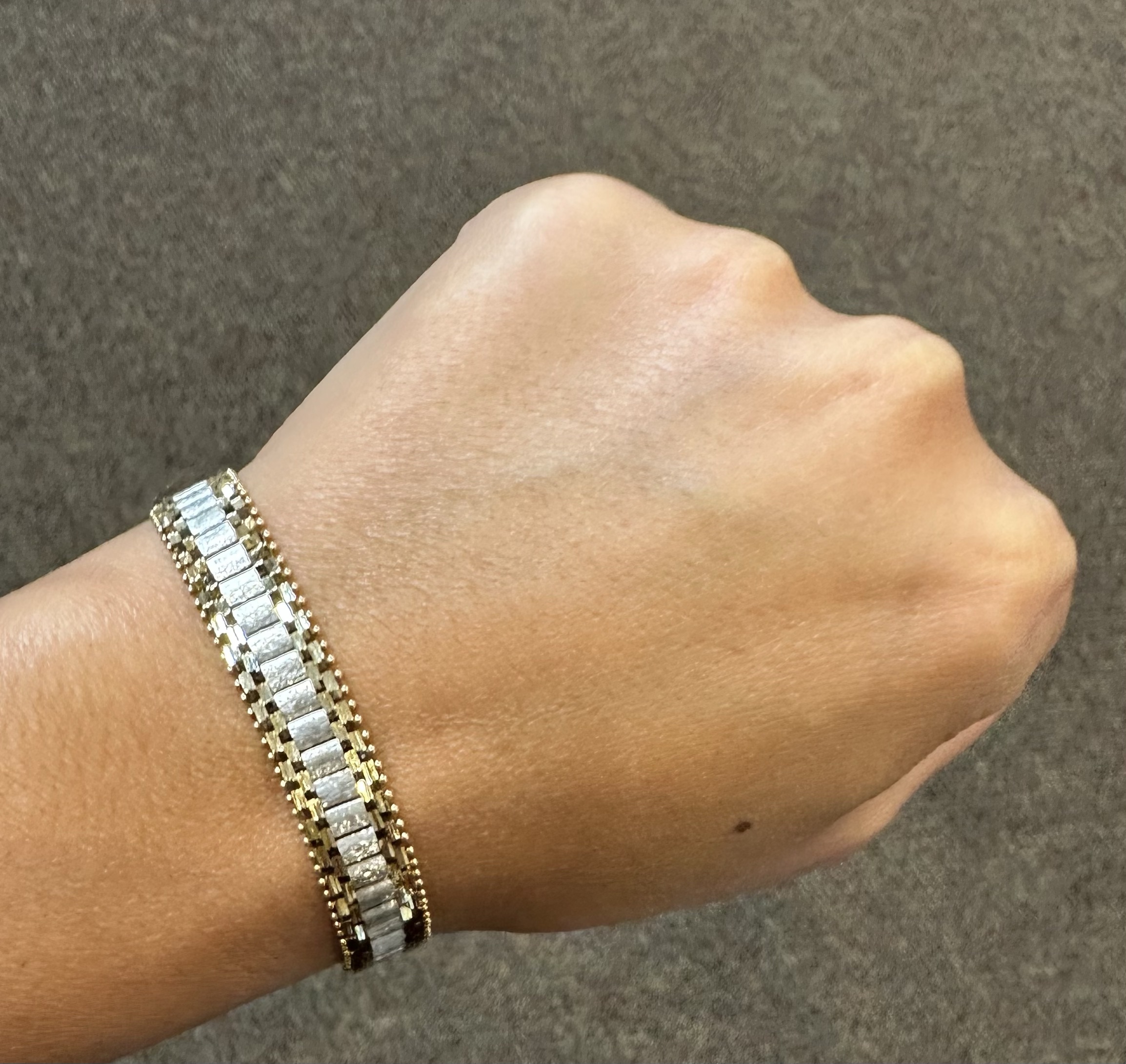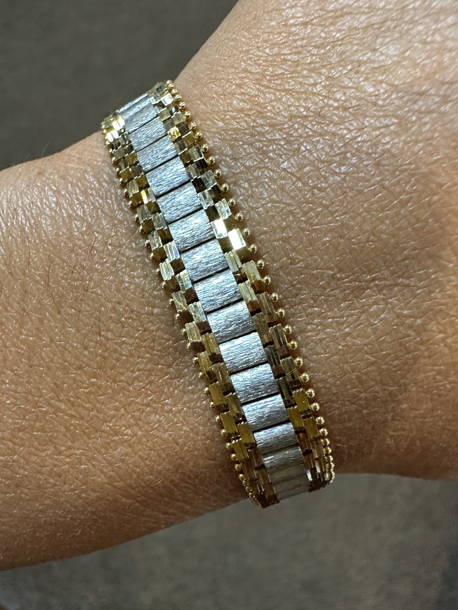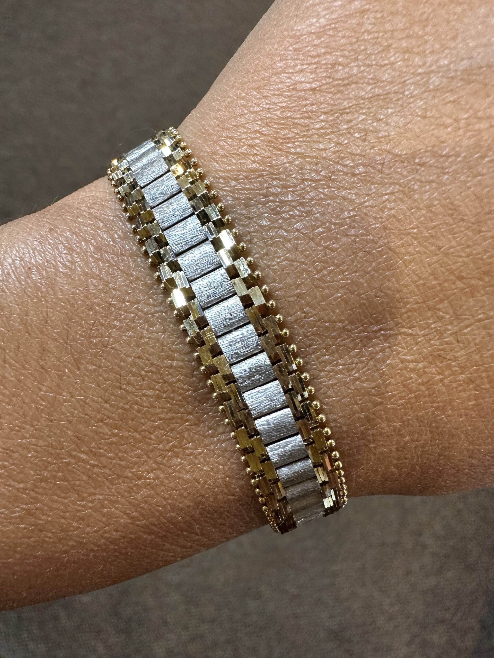 This is such a fun one- so sparkly! One-of-a-kind 14k white & 14k yellow gold 10 mm flexible link bracelet, 7 1/8”, 18.2 grams.