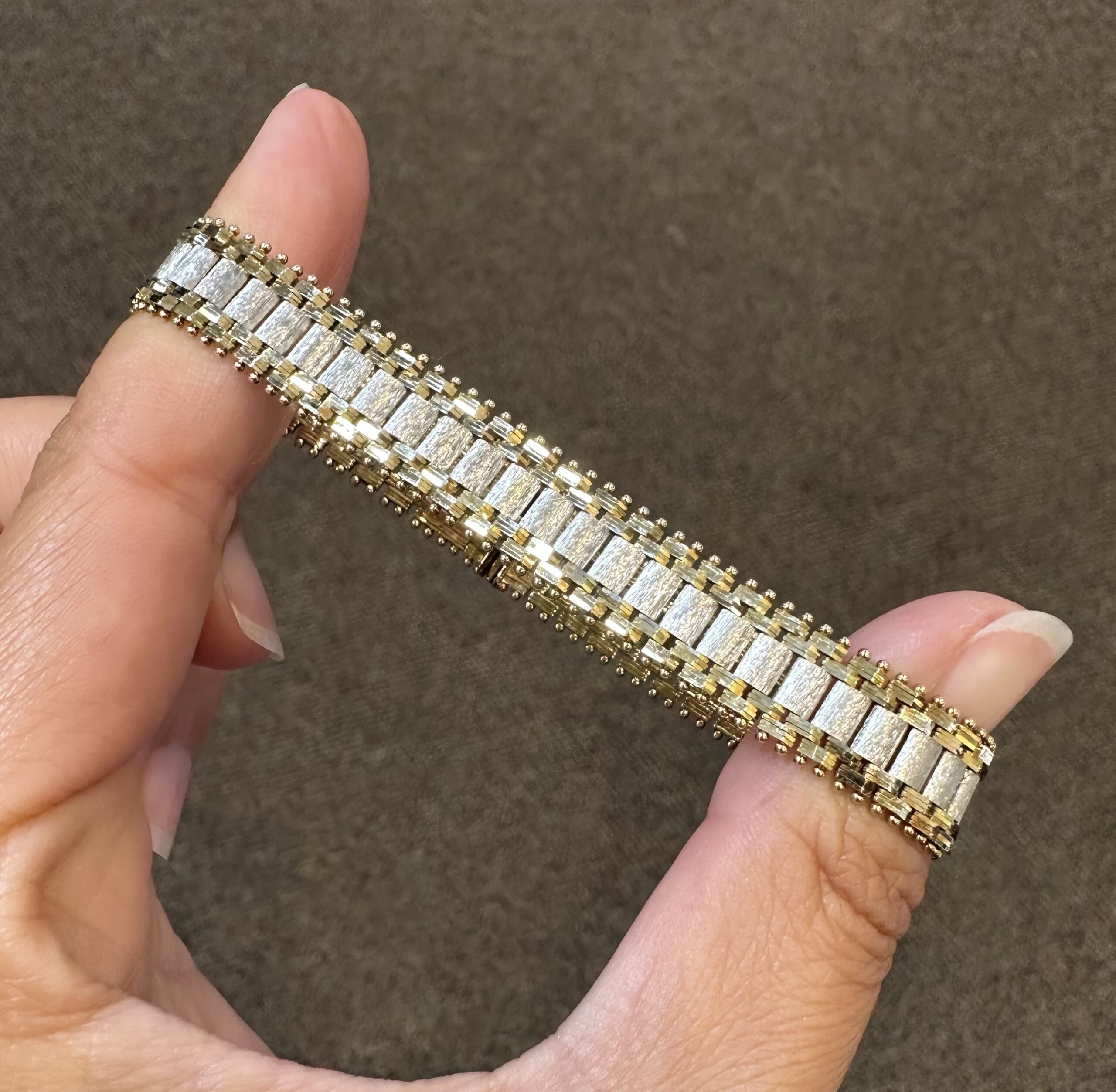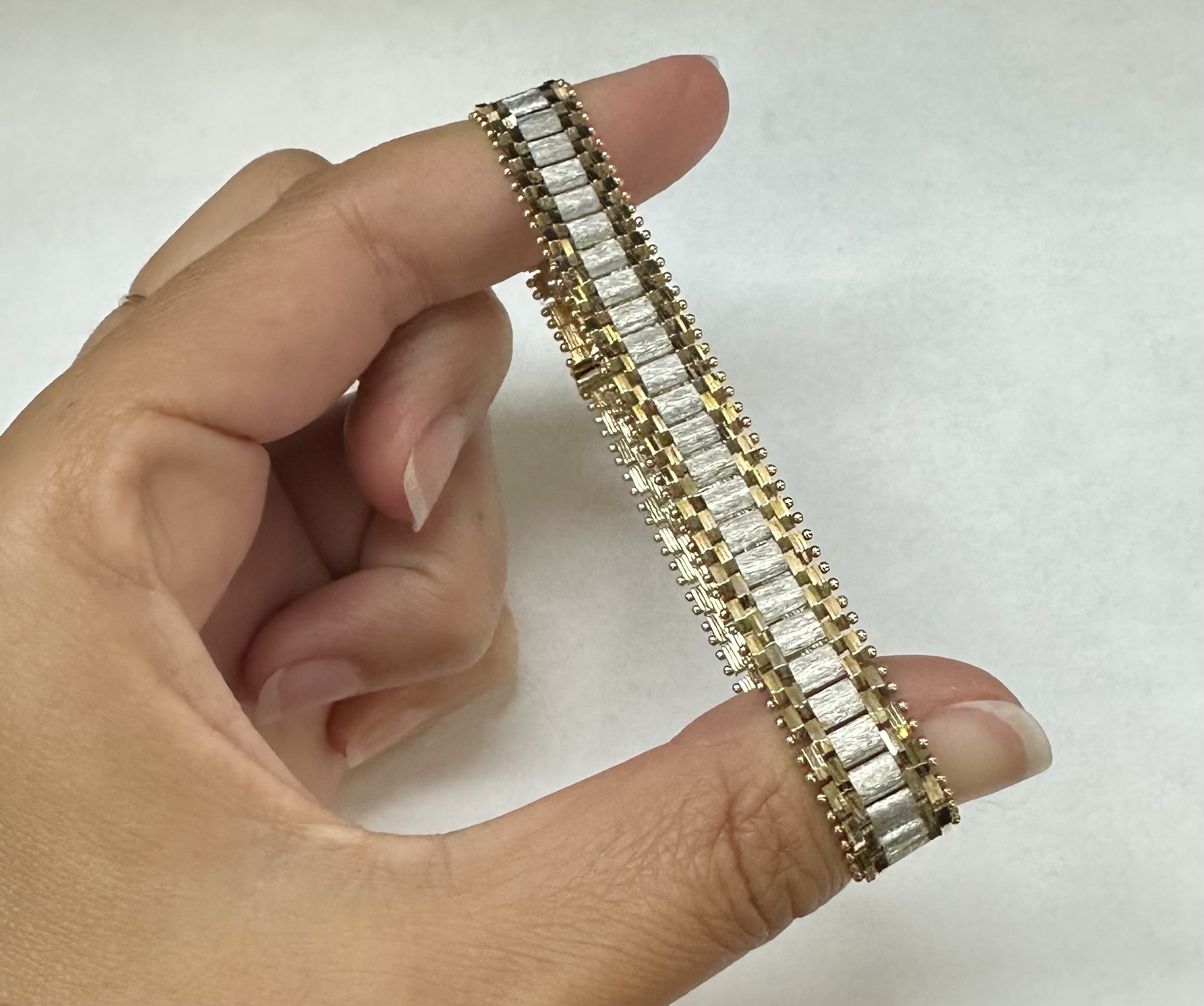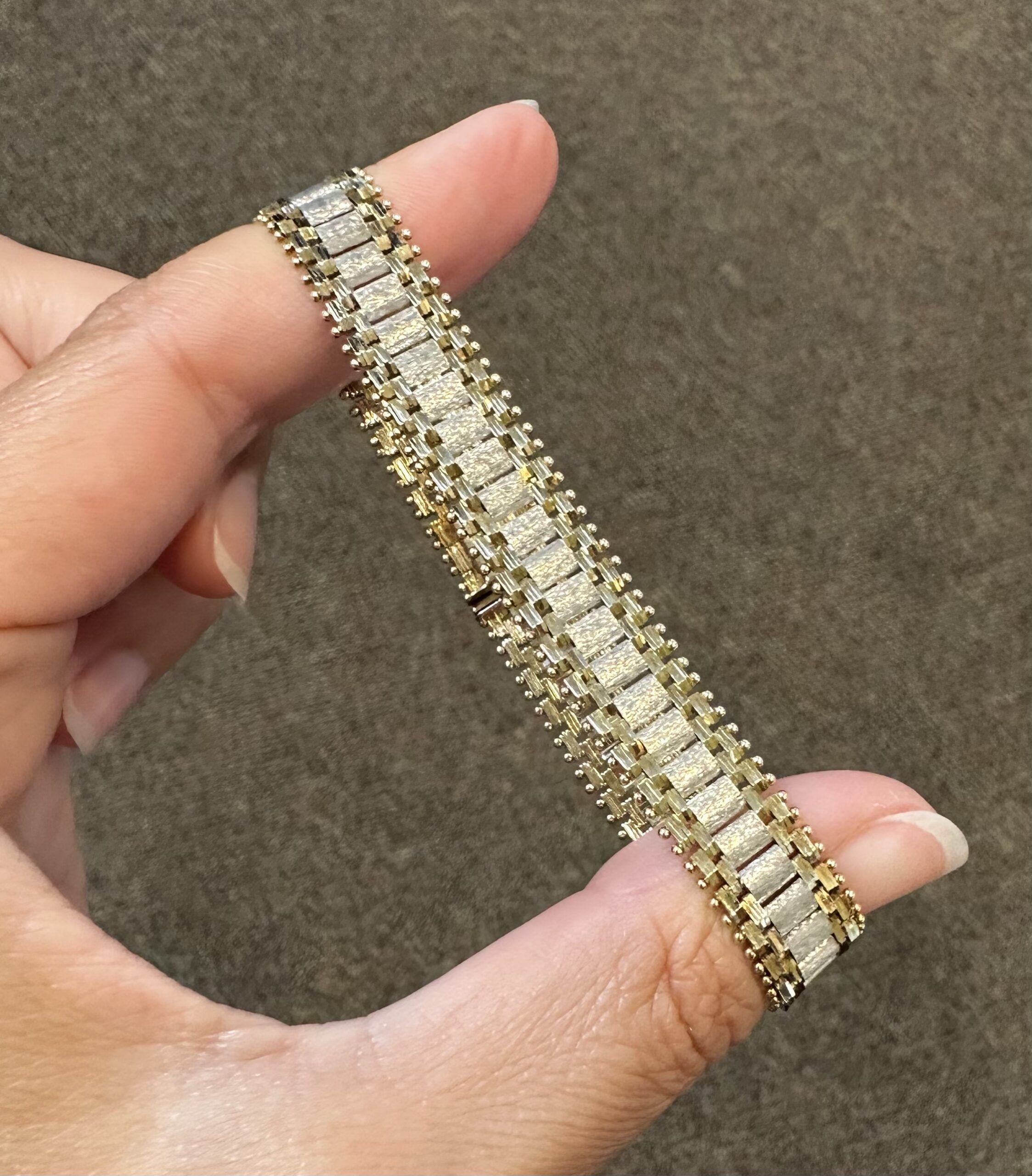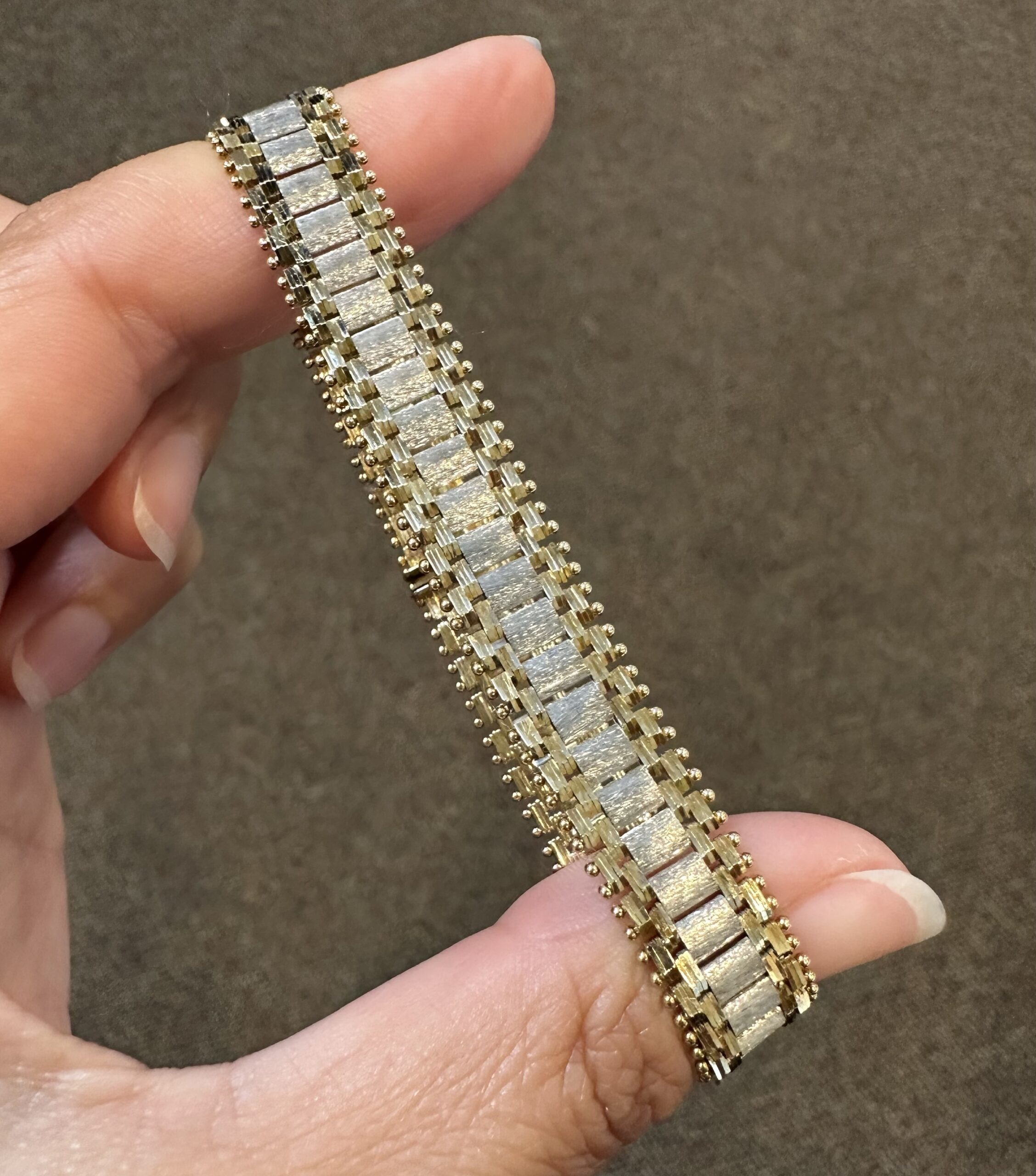 This is such a fun one- so sparkly! One-of-a-kind 14k white & 14k yellow gold 10 mm flexible link bracelet, 7 1/8”, 18.2 grams.