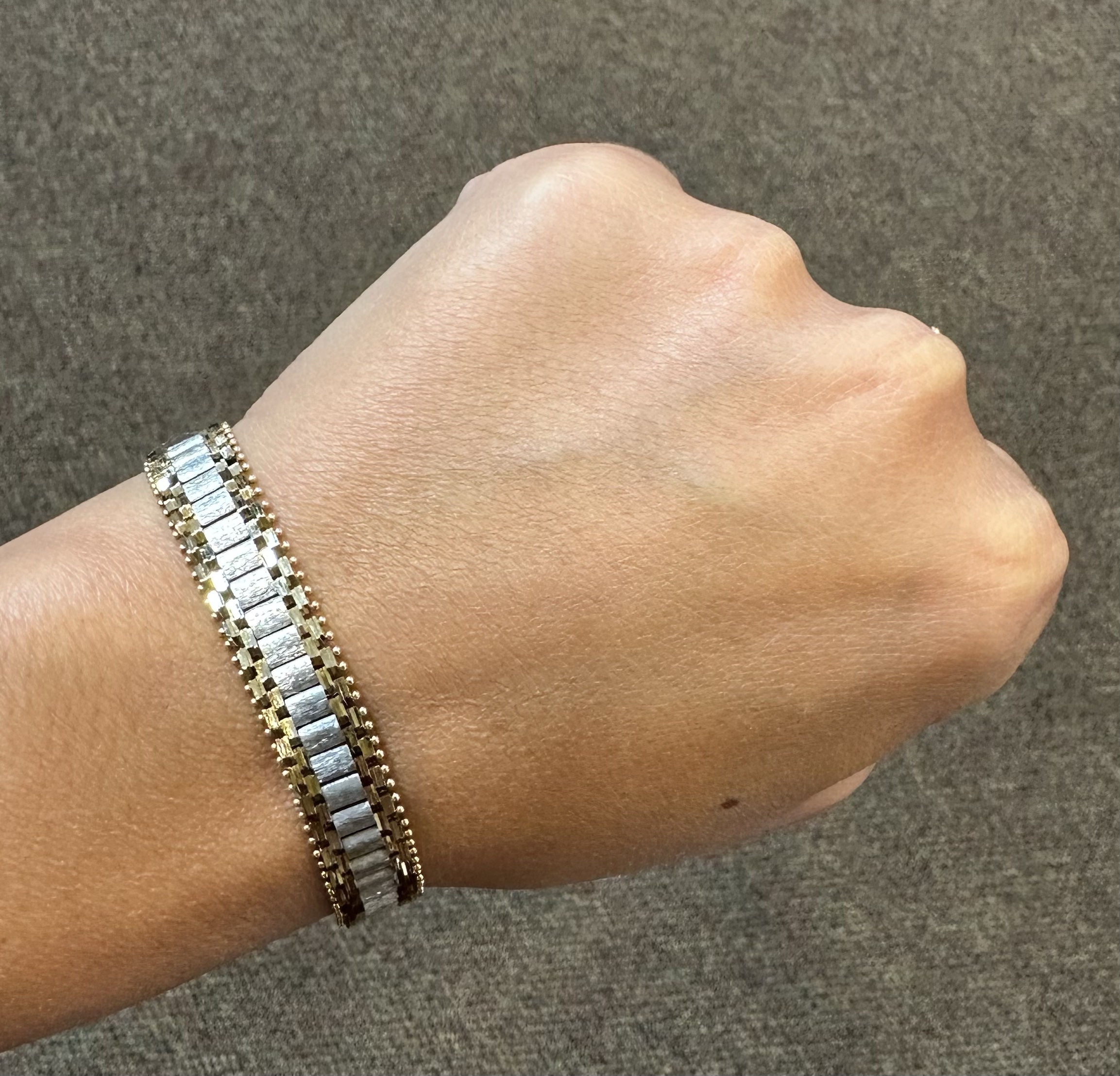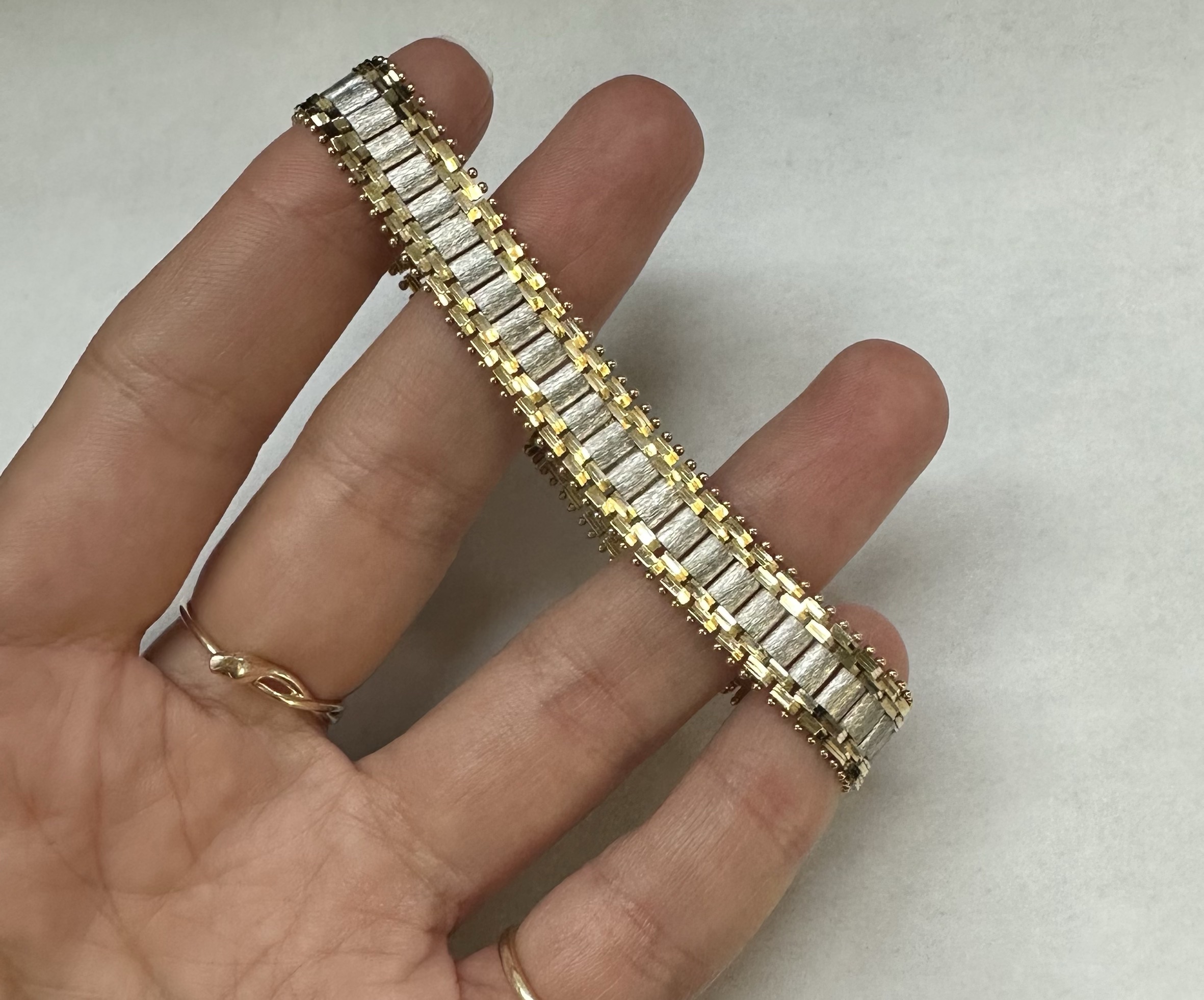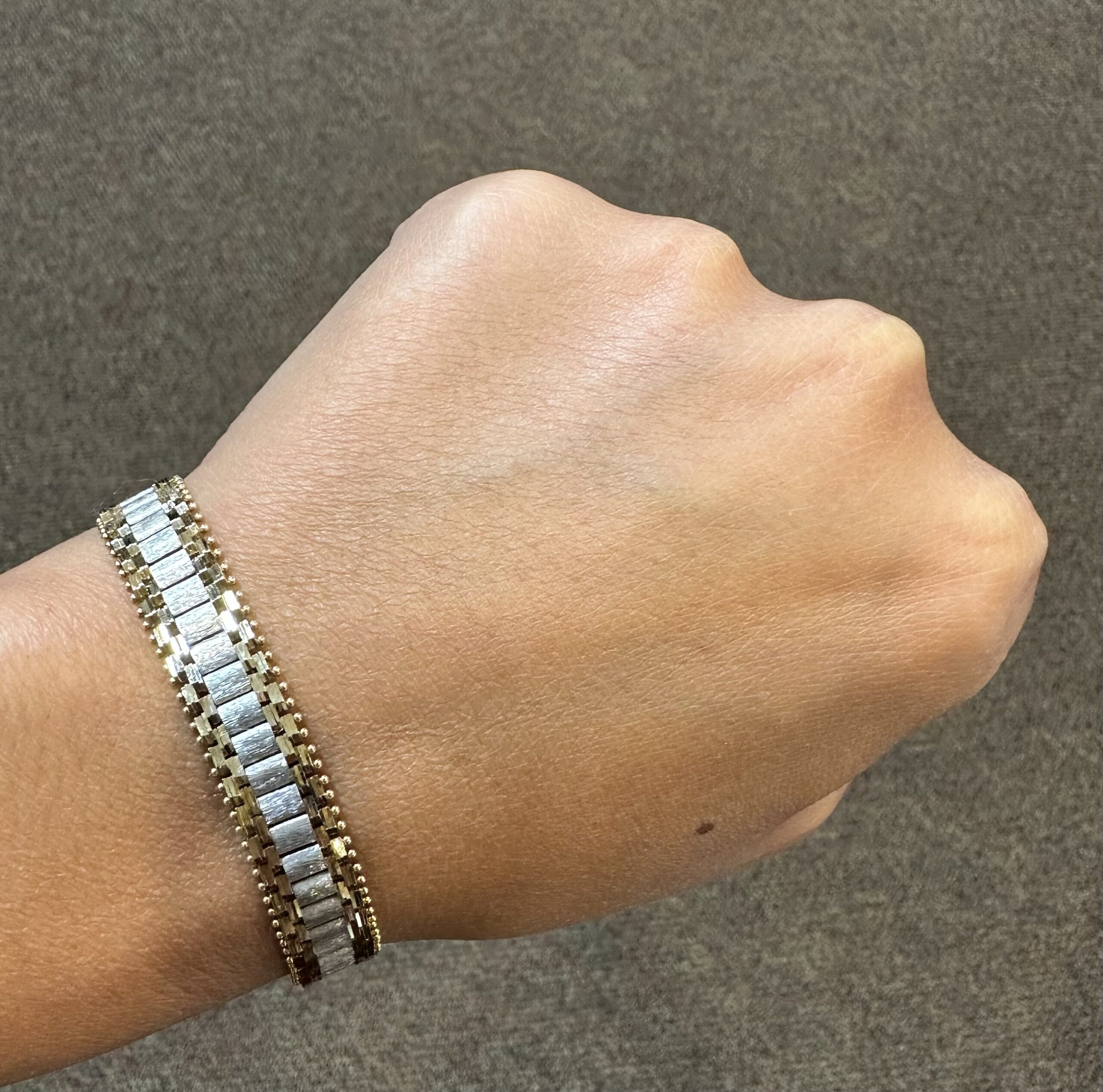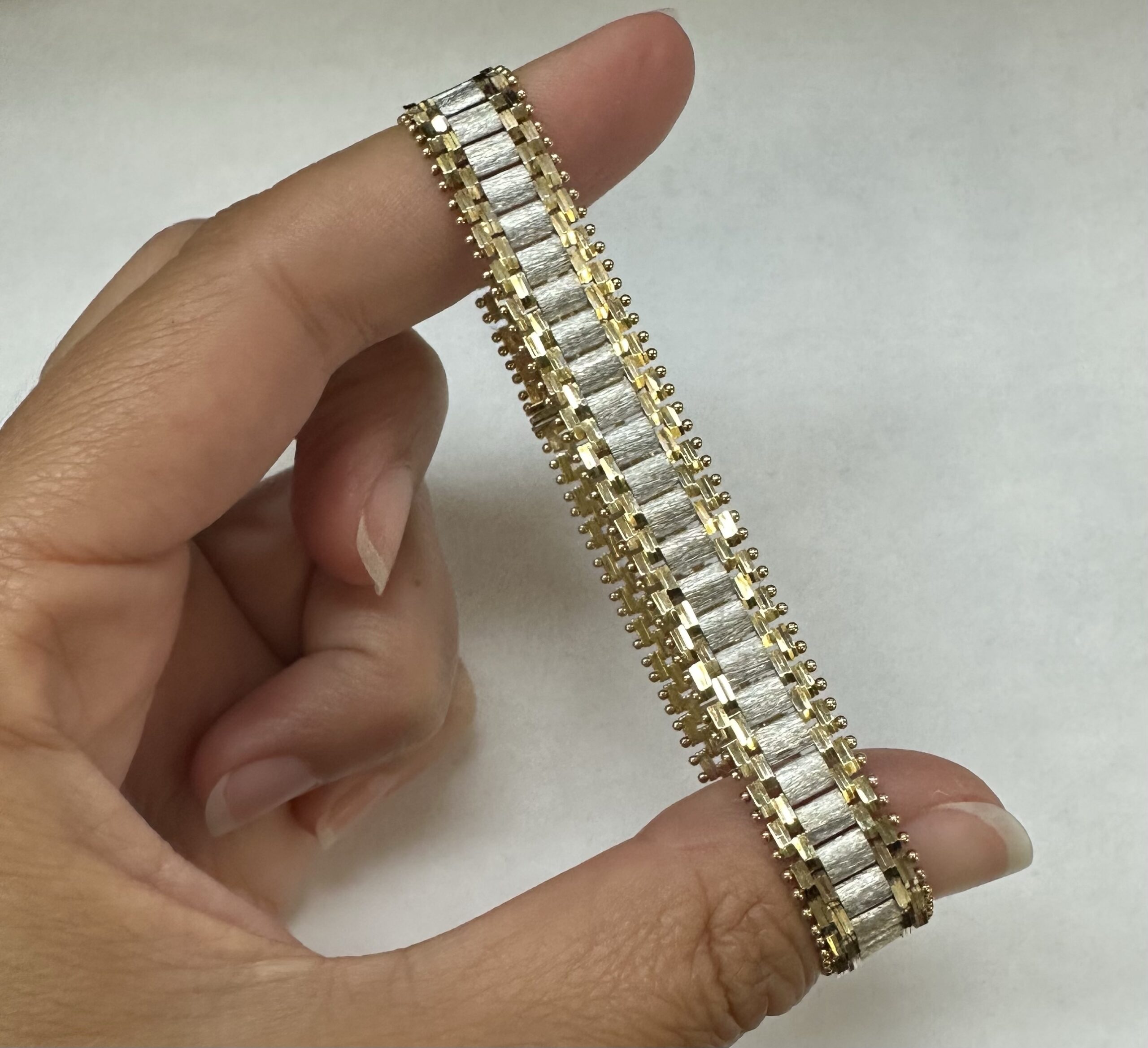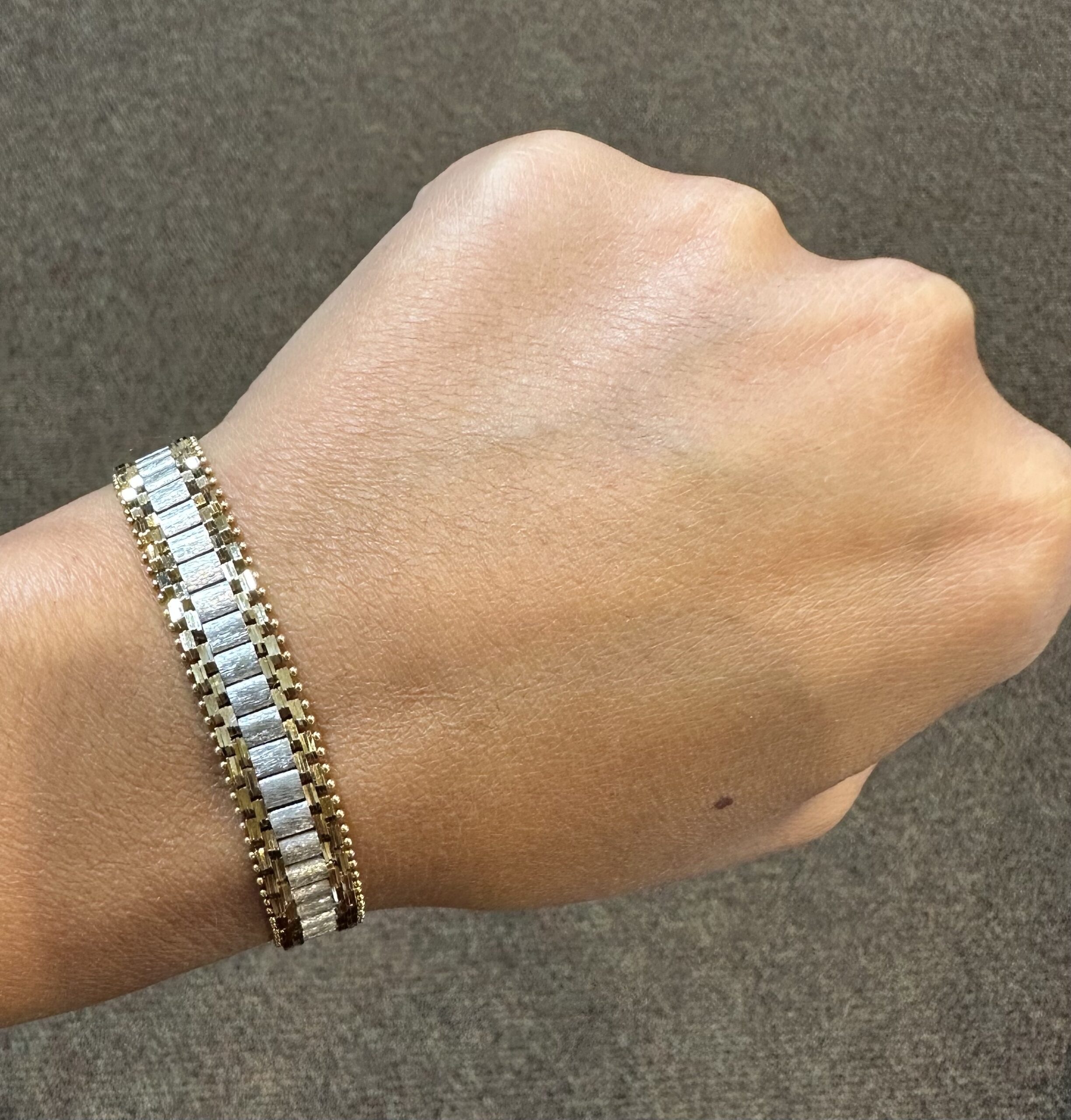 This is such a fun one- so sparkly! One-of-a-kind 14k white & 14k yellow gold 10 mm flexible link bracelet, 7 1/8”, 18.2 grams.