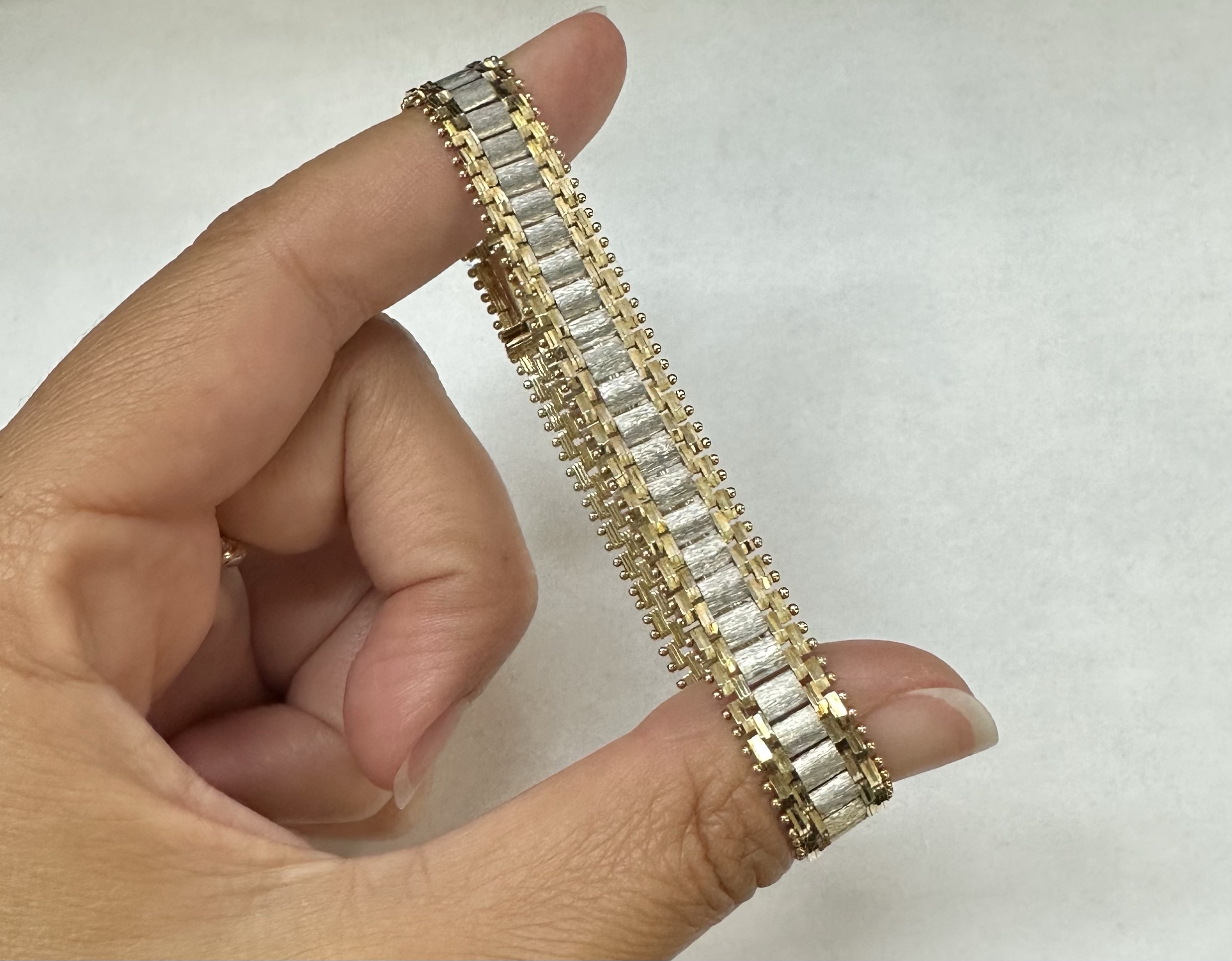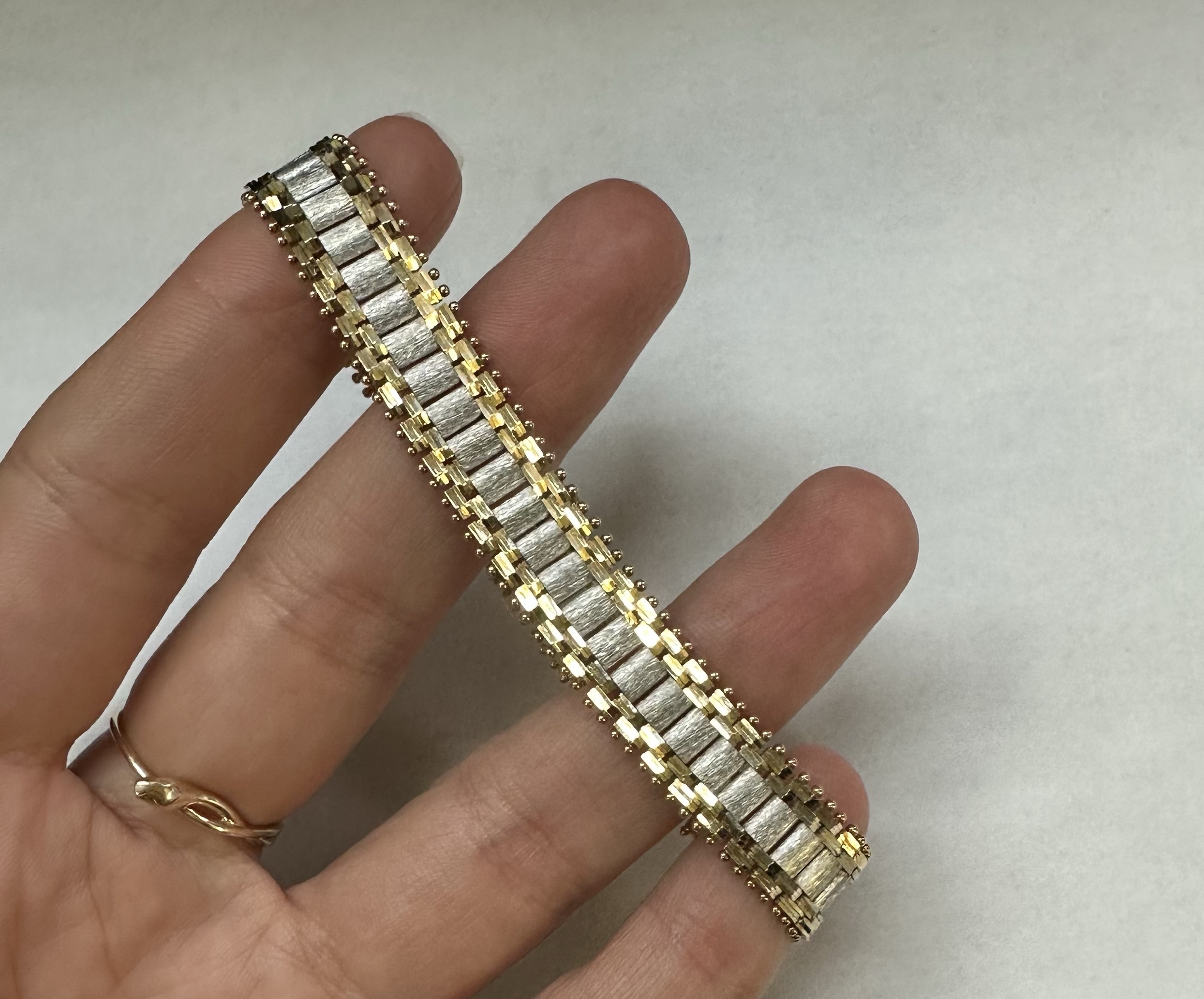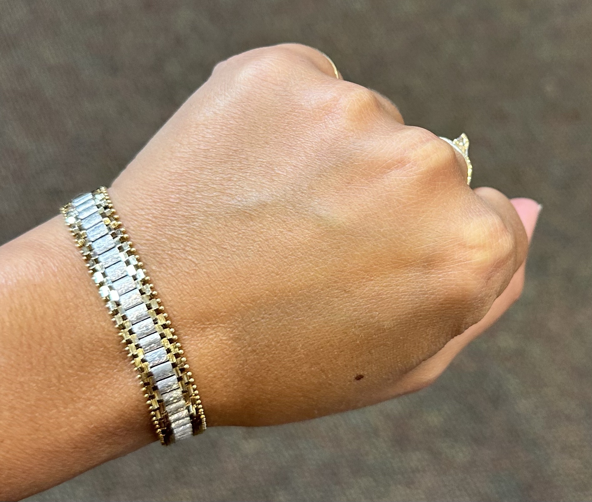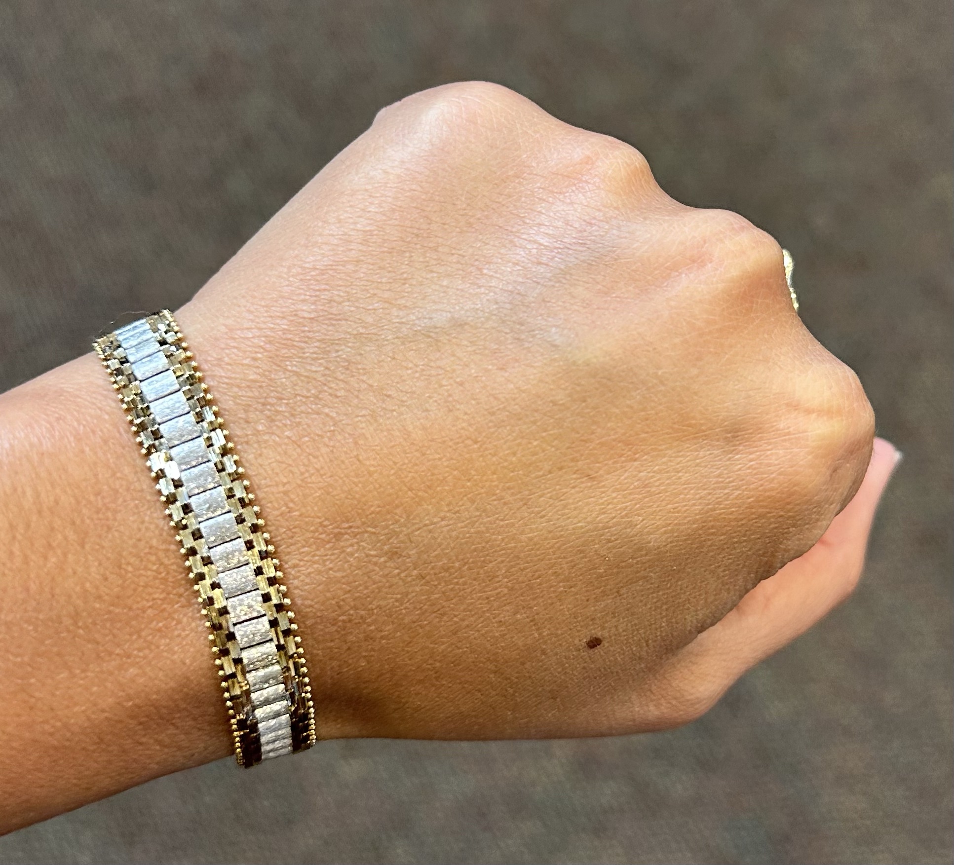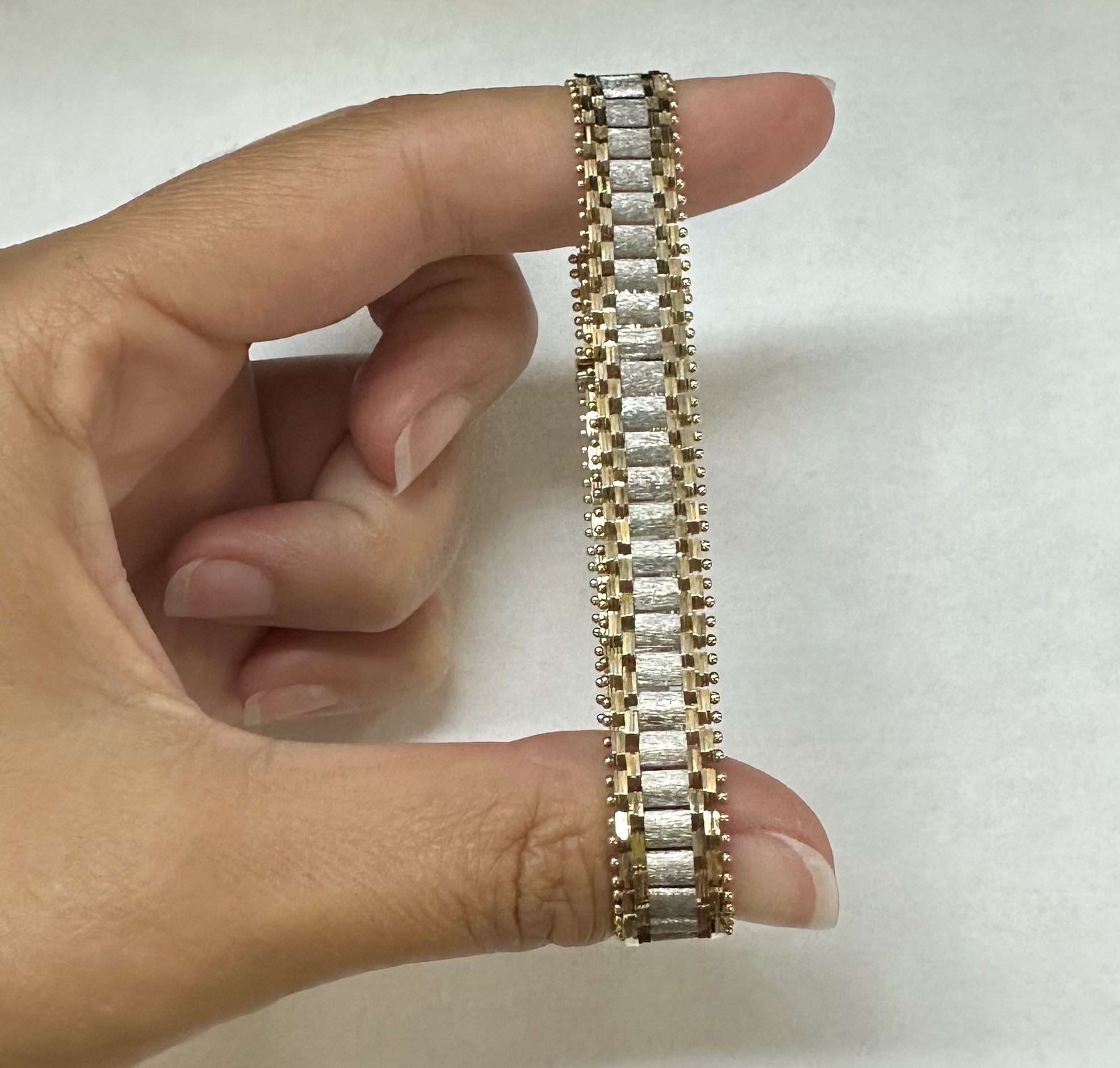 This is such a fun one- so sparkly! One-of-a-kind 14k white & 14k yellow gold 10 mm flexible link bracelet, 7 1/8”, 18.2 grams.