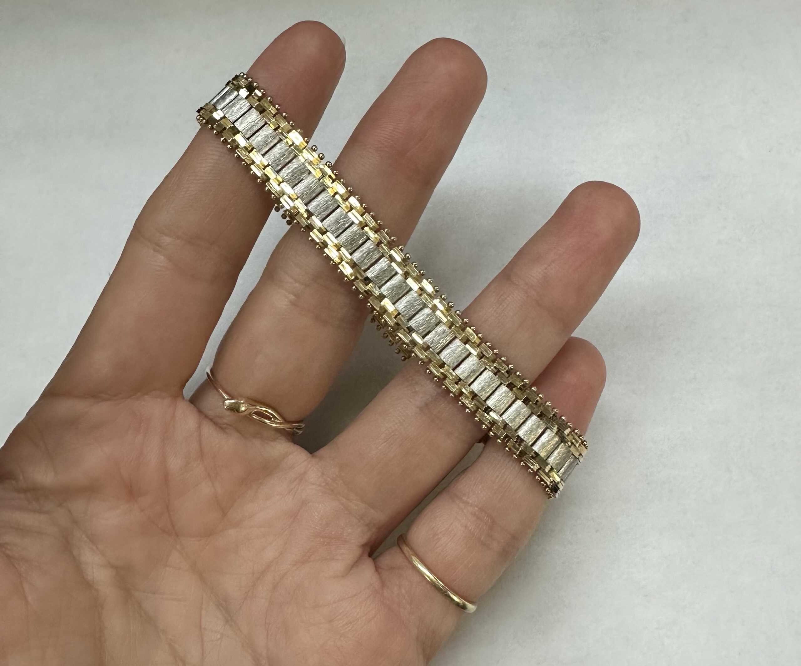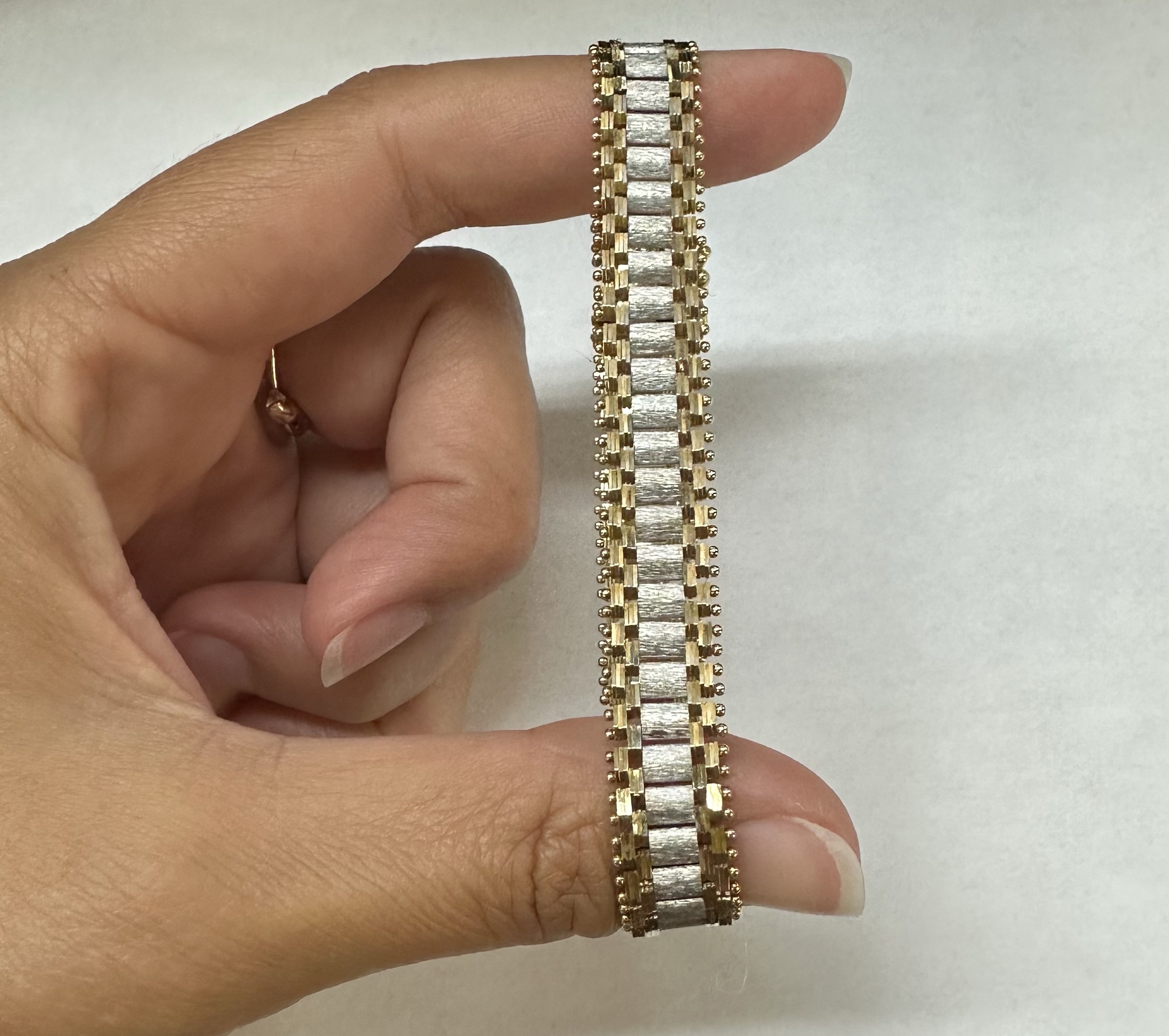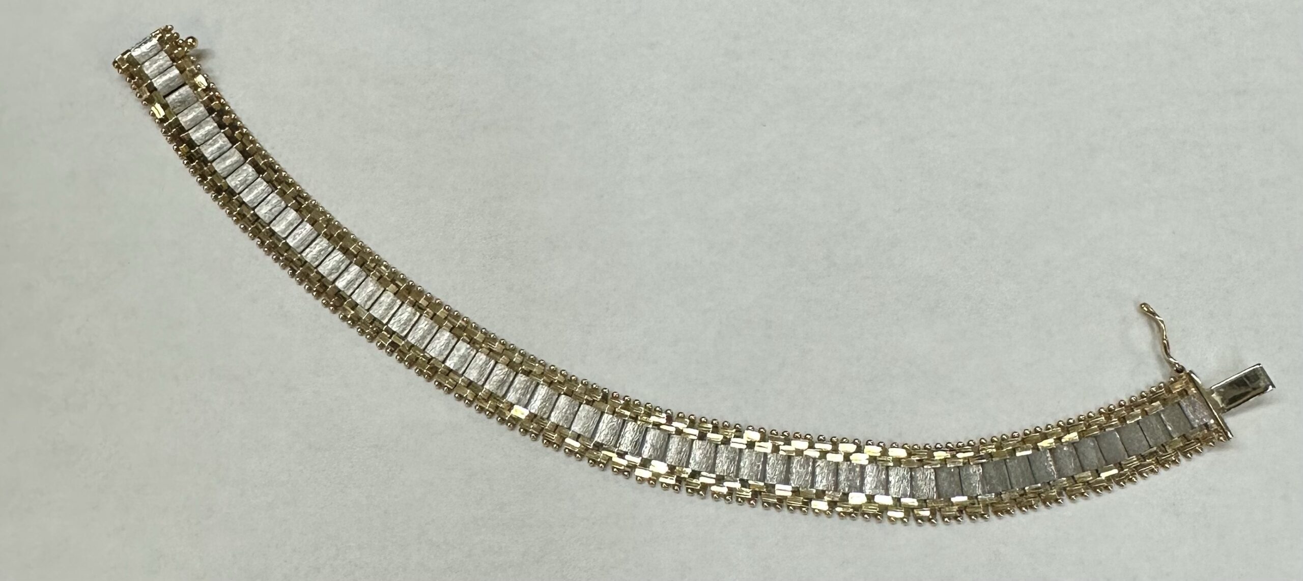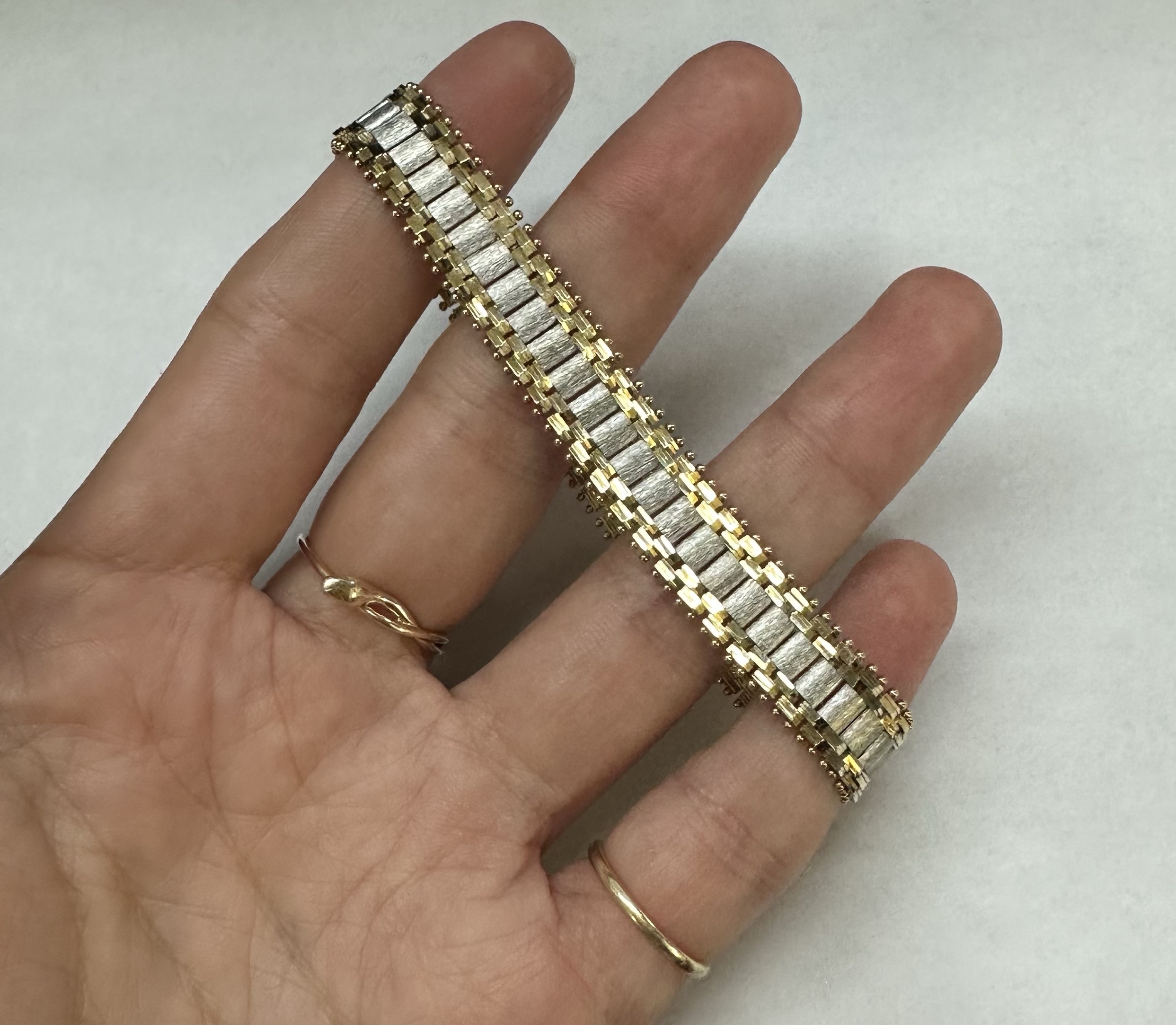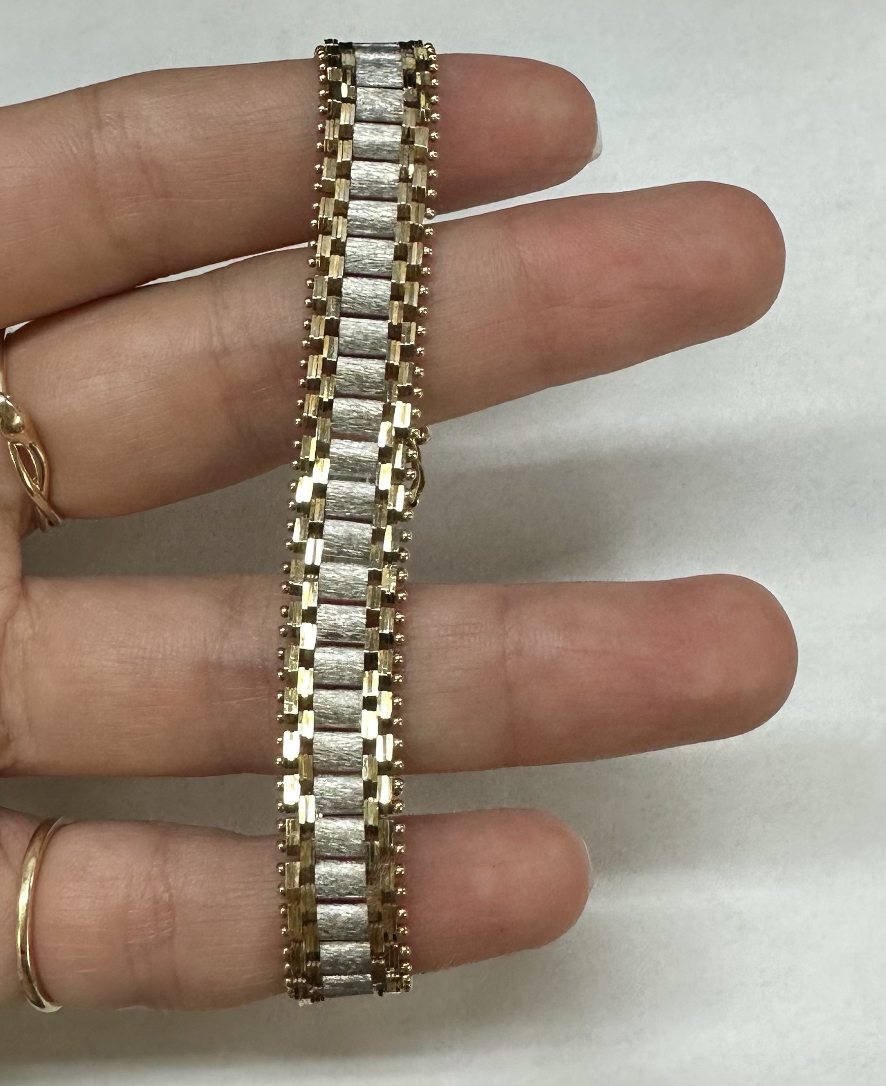This is such a fun one- so sparkly! One-of-a-kind 14k white & 14k yellow gold 10 mm flexible link bracelet, 7 1/8”, 18.2 grams.