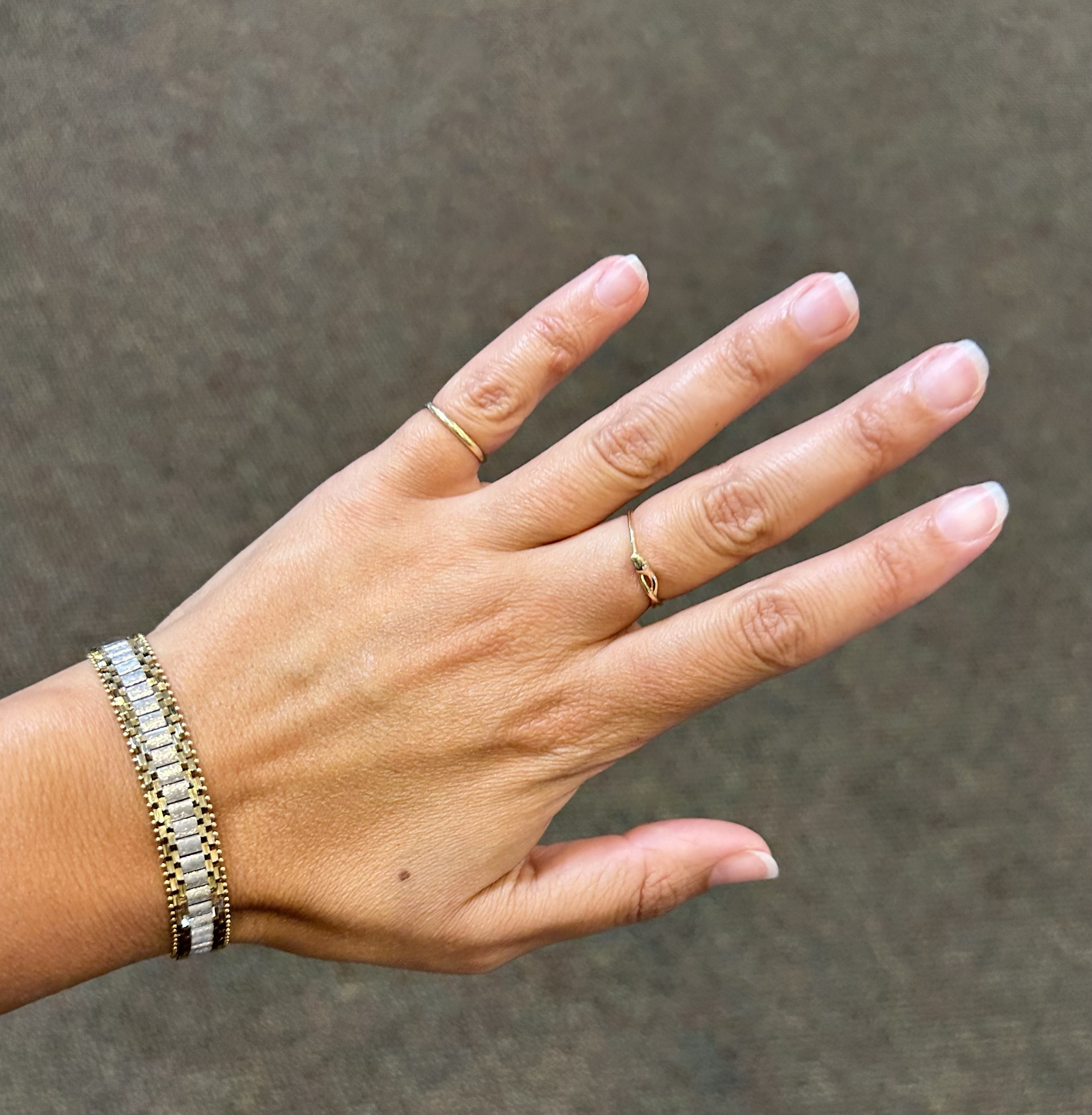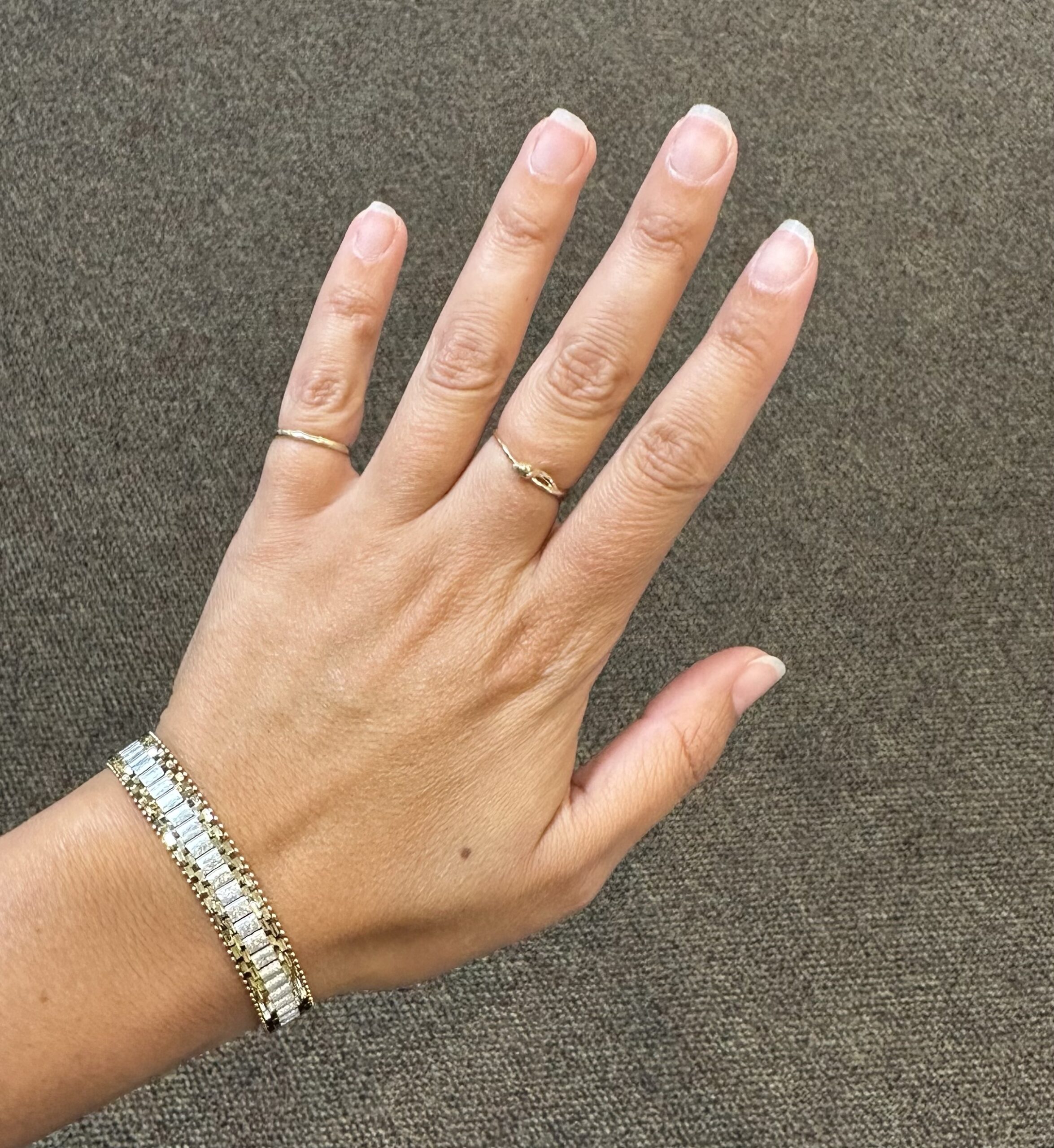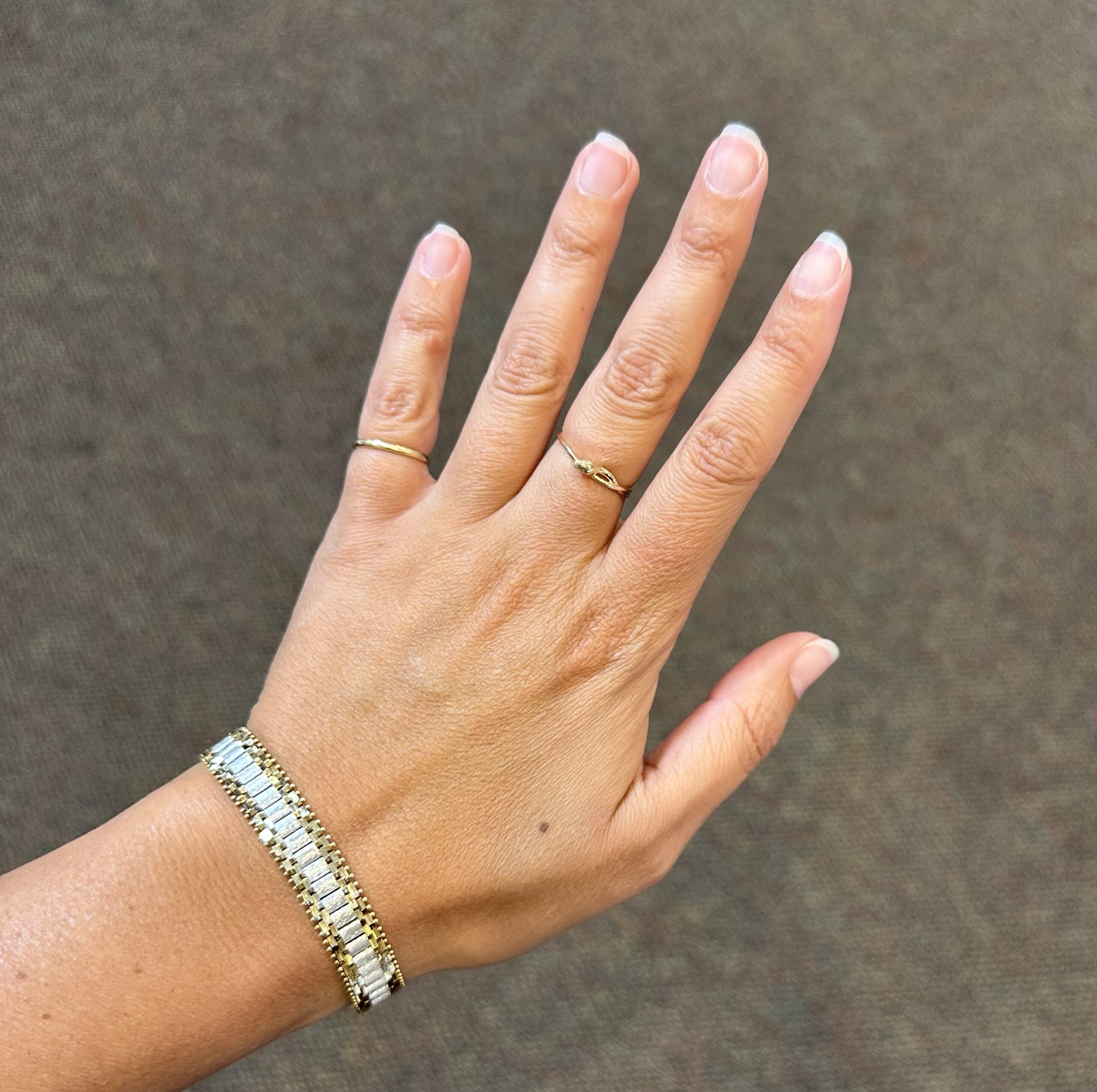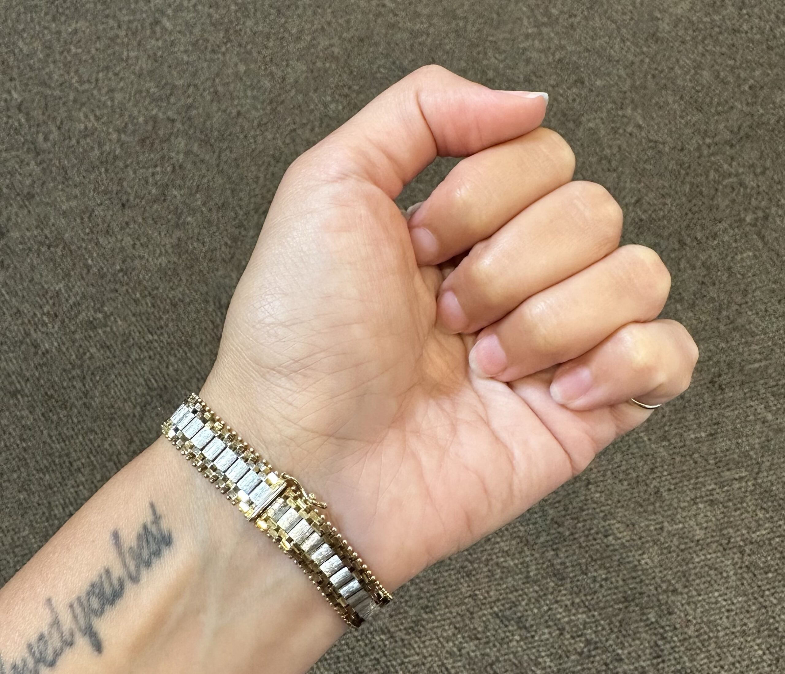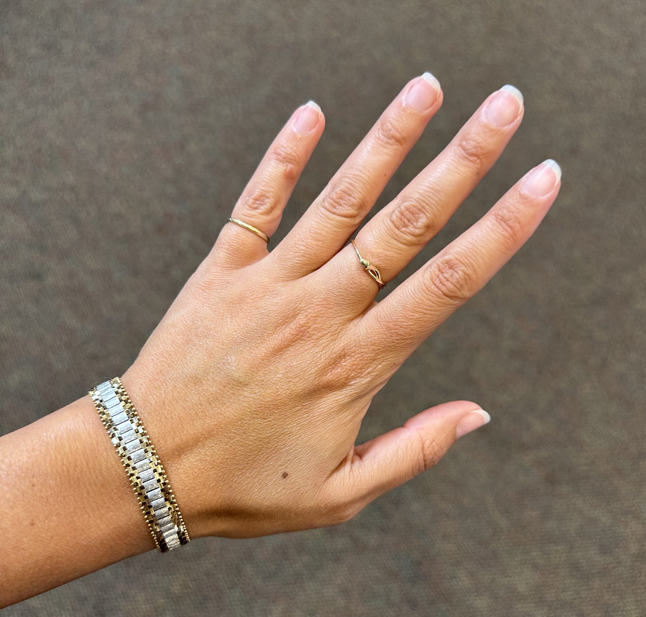 This is such a fun one- so sparkly! One-of-a-kind 14k white & 14k yellow gold 10 mm flexible link bracelet, 7 1/8”, 18.2 grams.