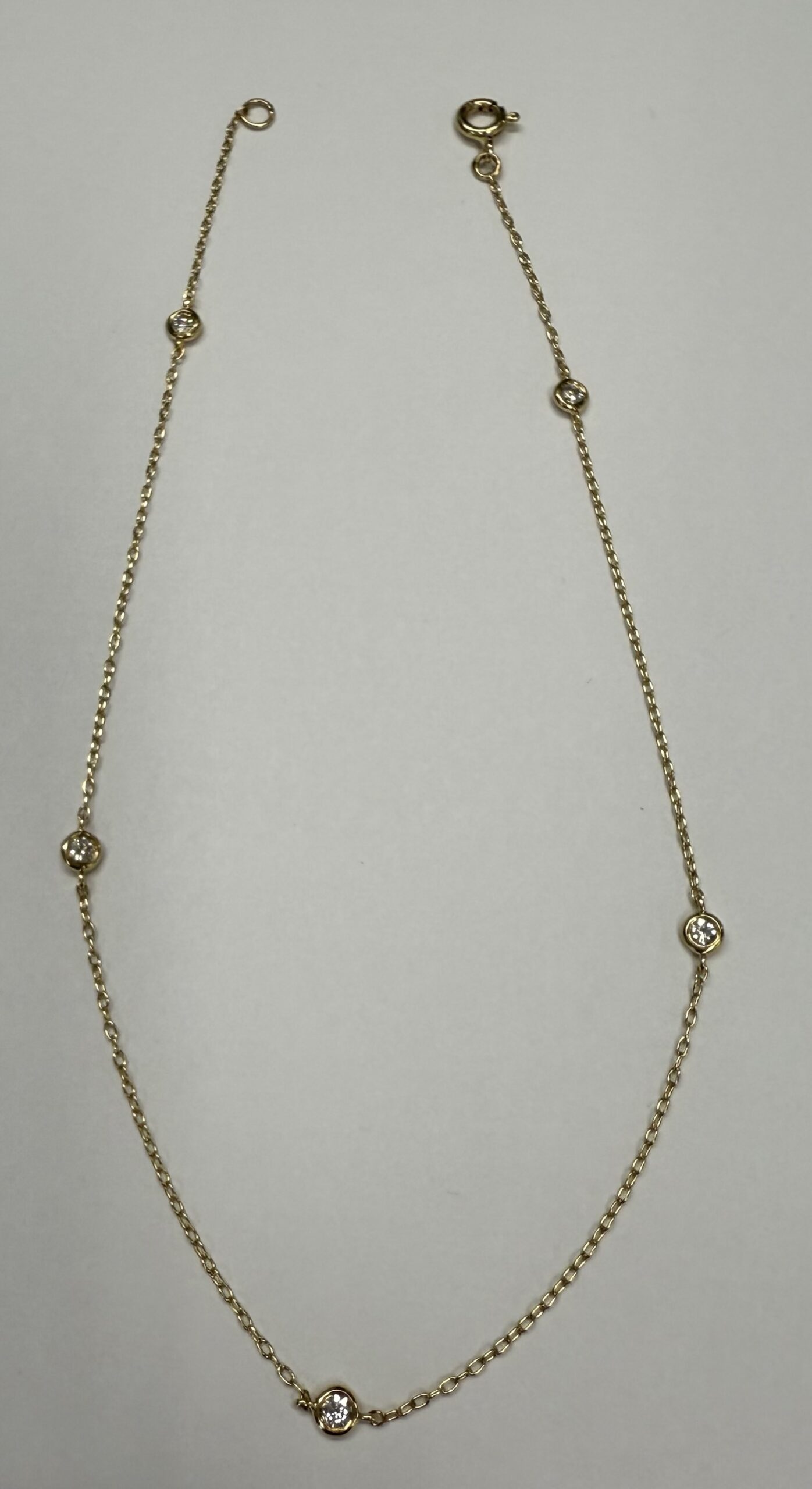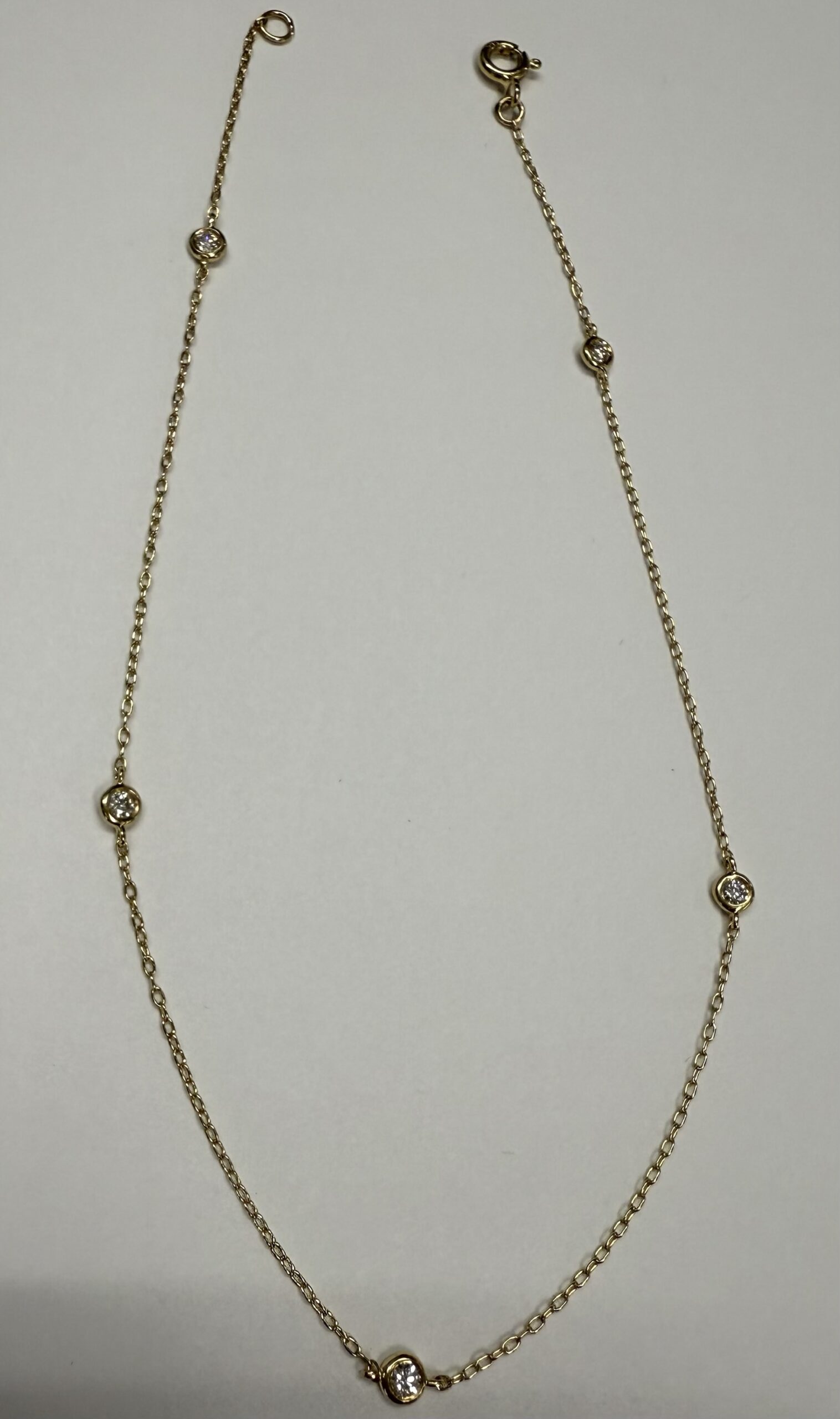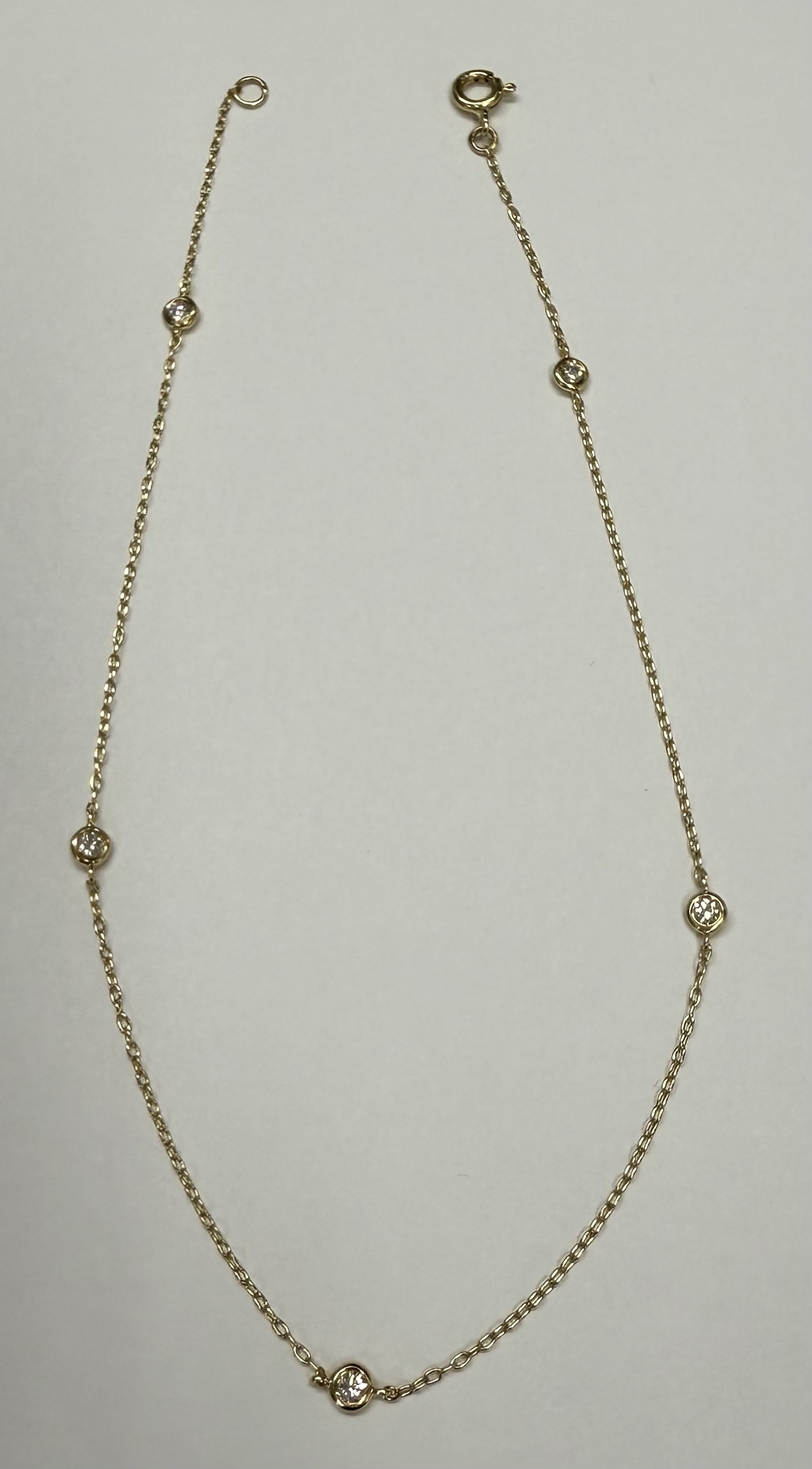 14k yellow gold 5 stone genuine 1/2 cttw Round Brilliant Cut diamond bezel set “by the yard” anklet. These diamonds average H-I in color, and SI2 in clarity. This anklet measures 11″ in length, and it has an entire weight of 1.3 grams.