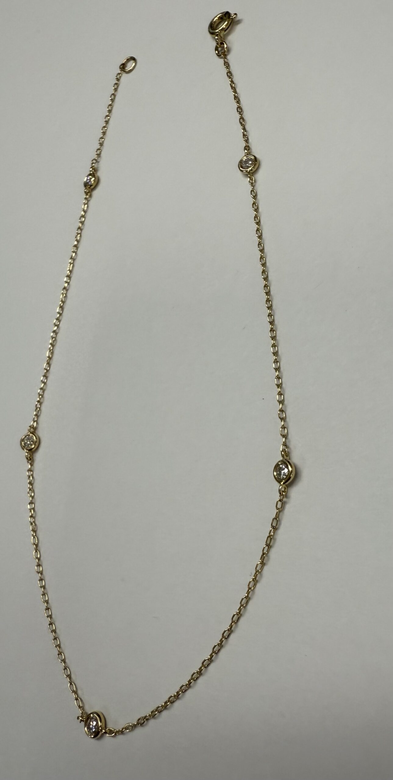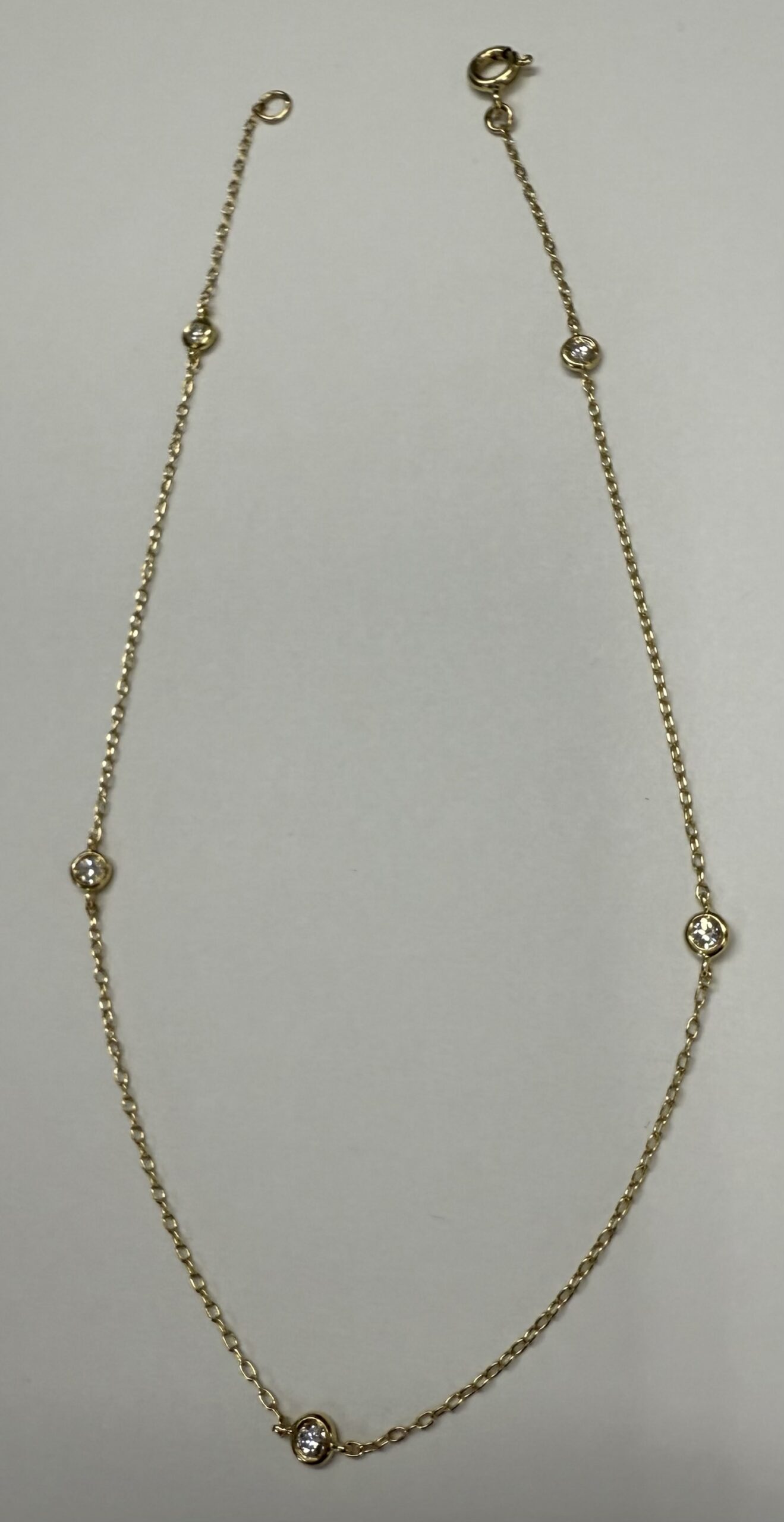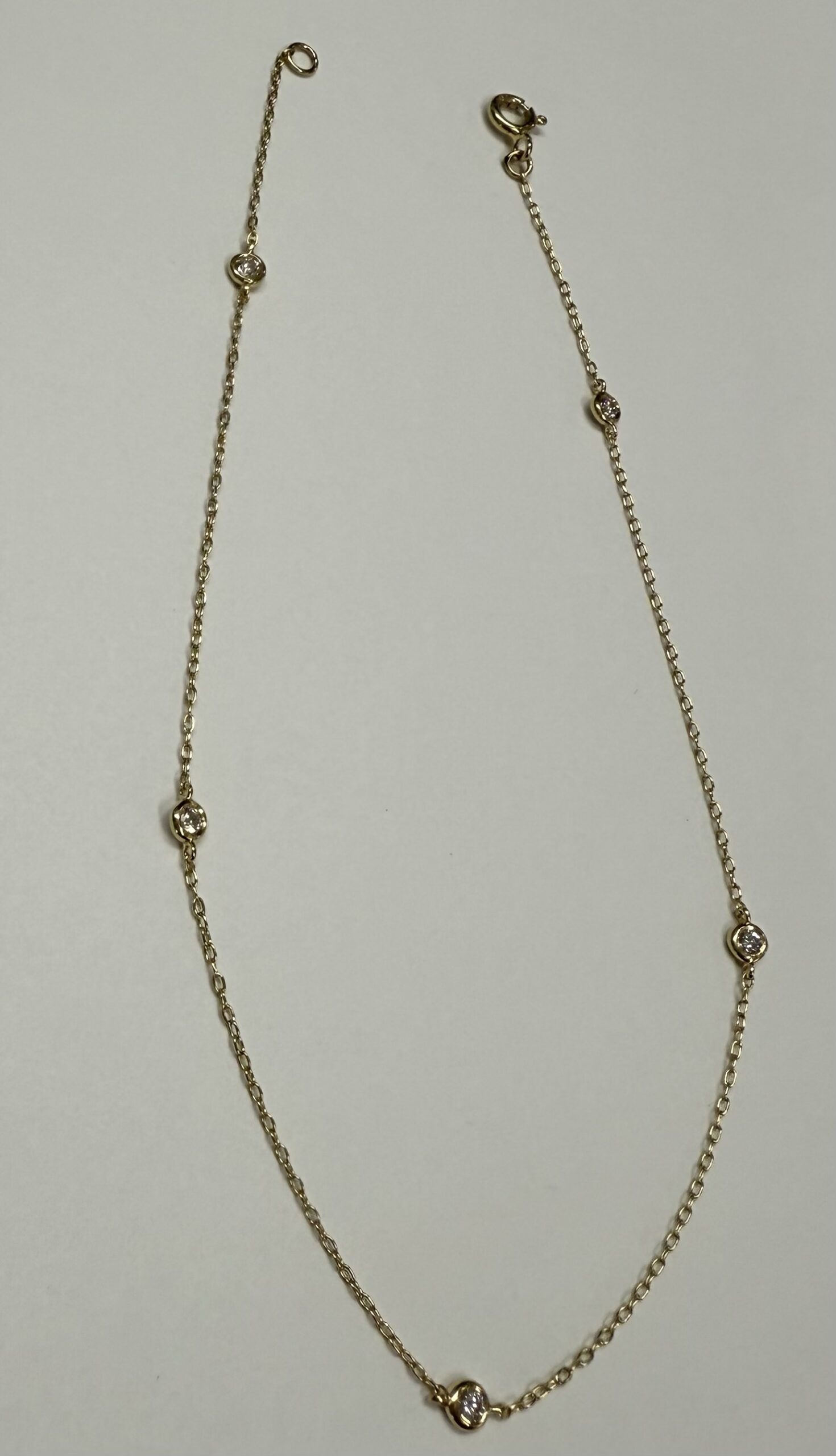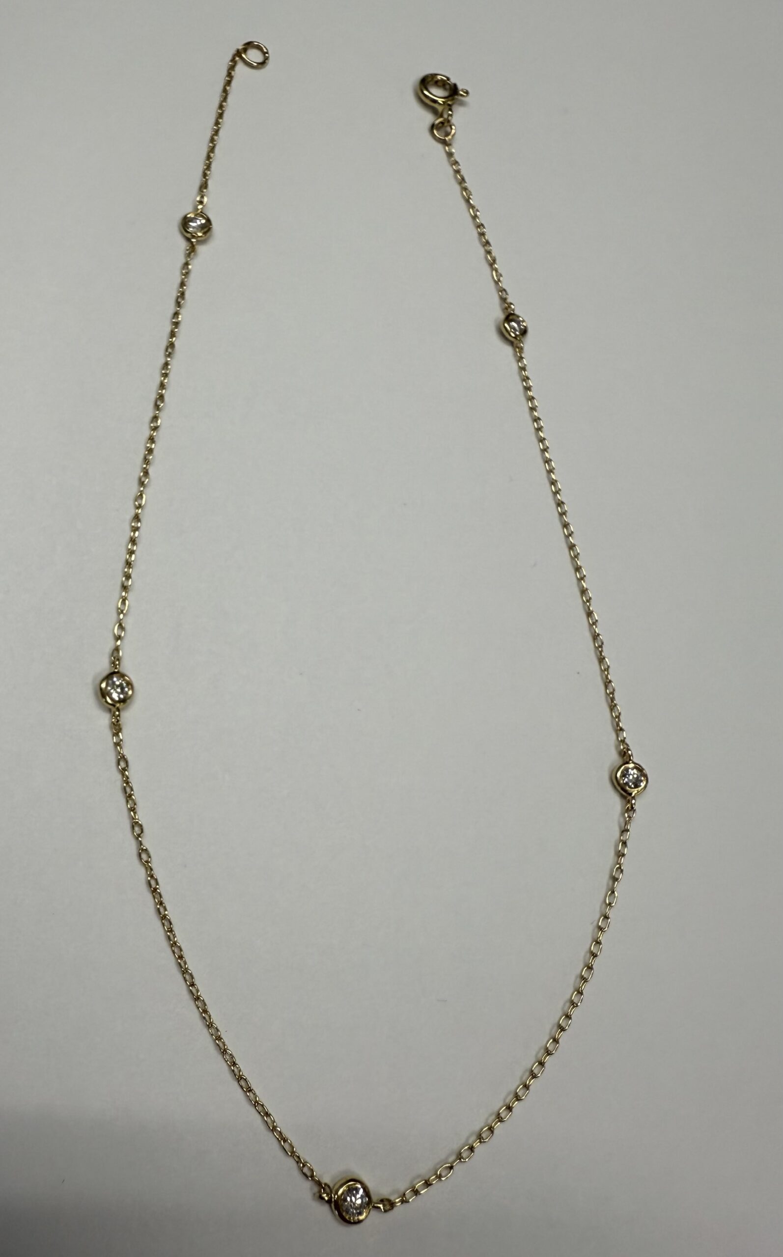 14k yellow gold 5 stone genuine 1/2 cttw Round Brilliant Cut diamond bezel set “by the yard” anklet. These diamonds average H-I in color, and SI2 in clarity. This anklet measures 11″ in length, and it has an entire weight of 1.3 grams.