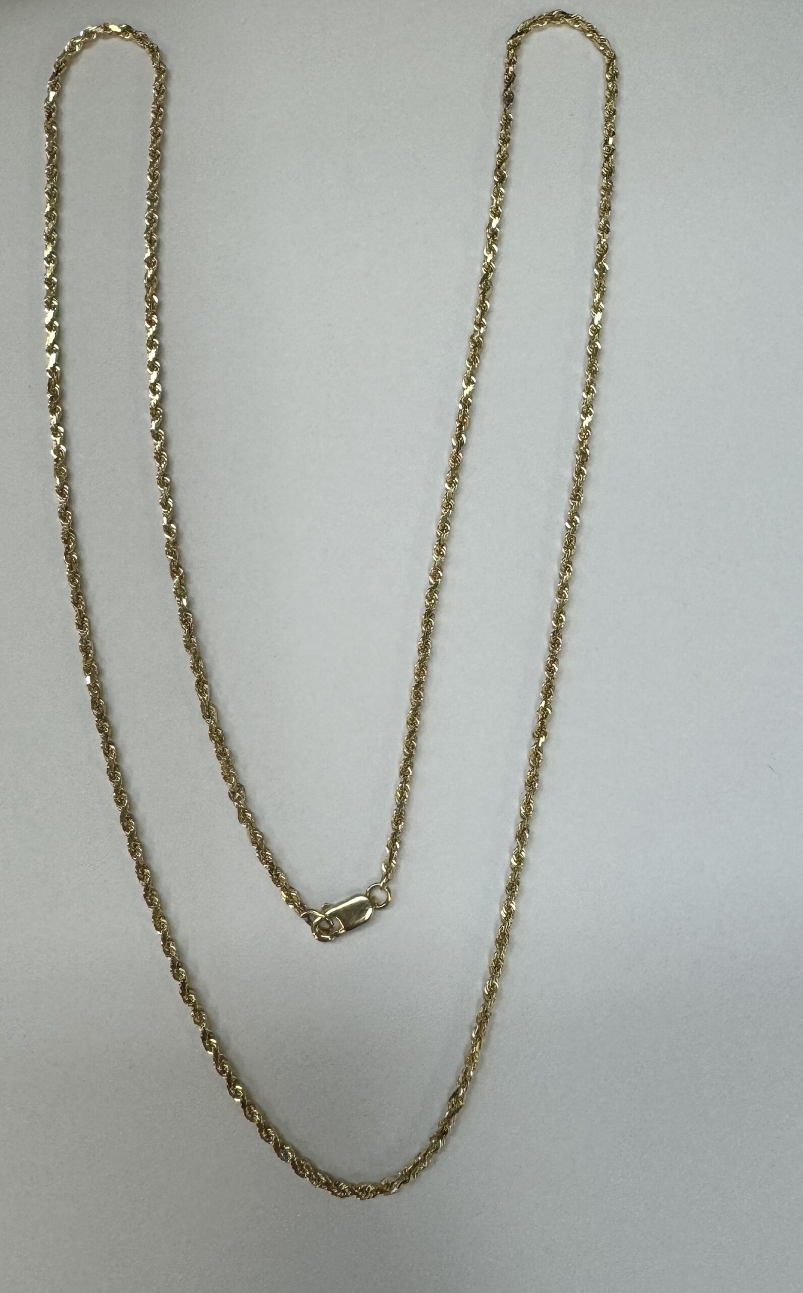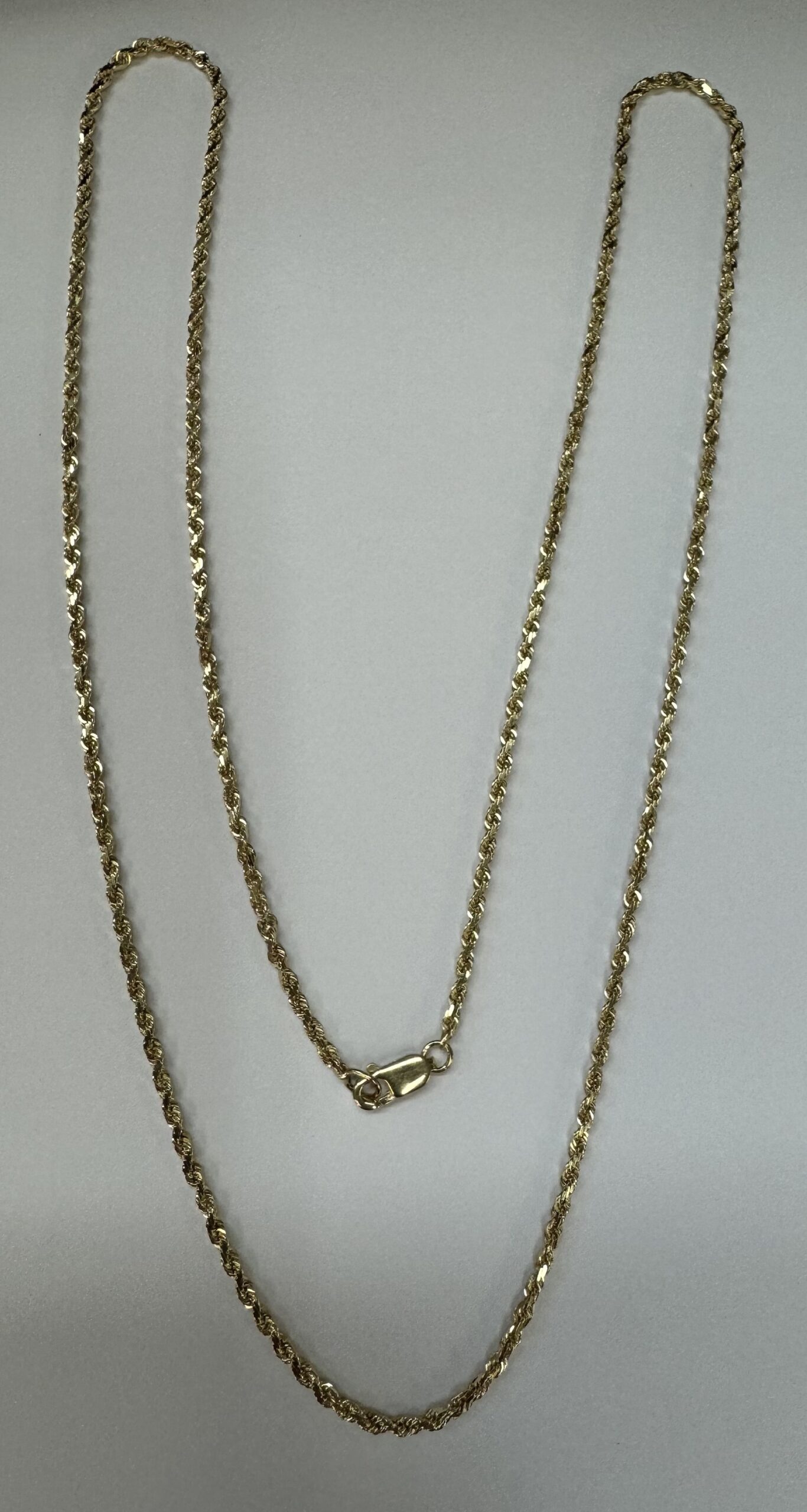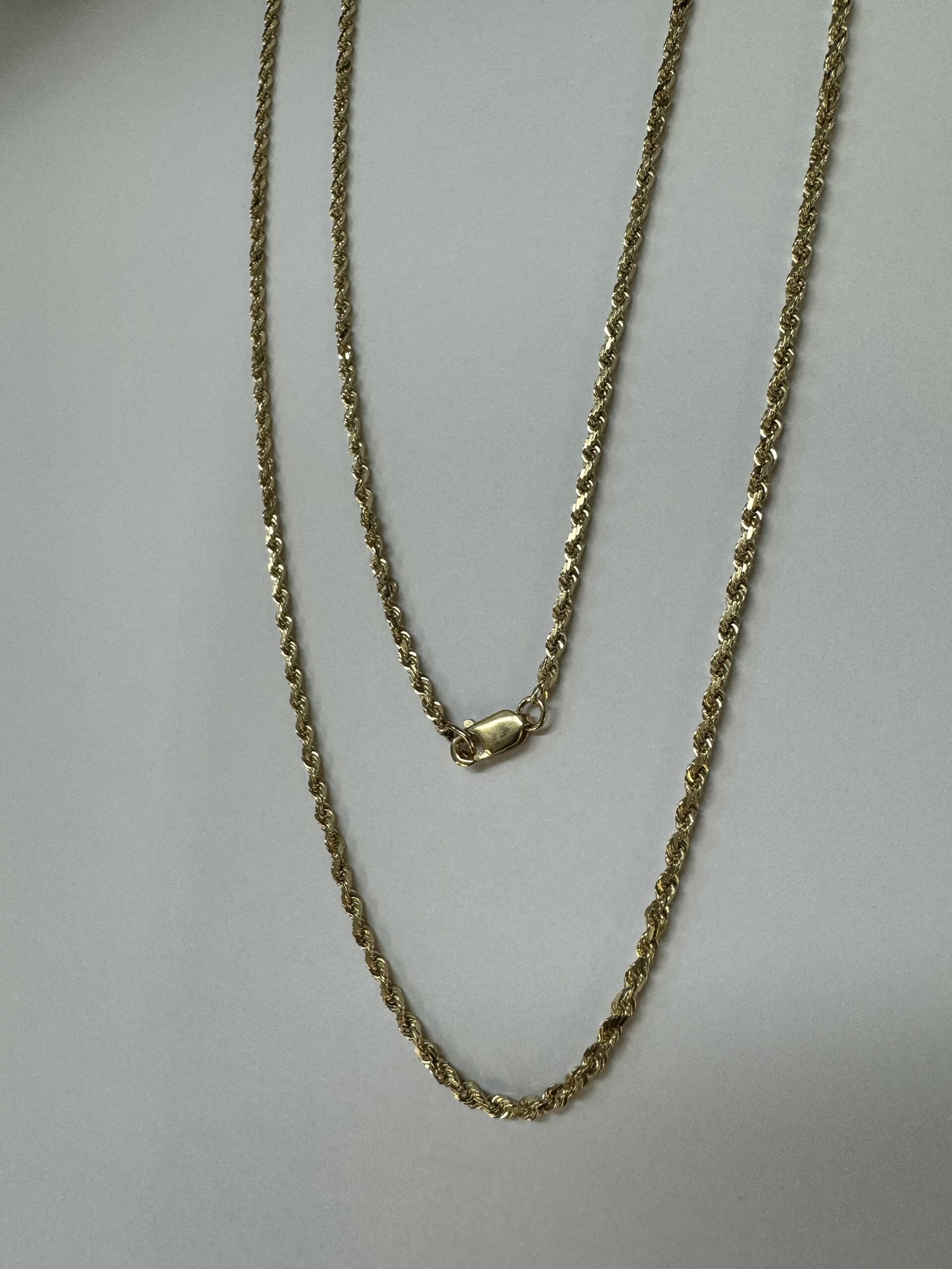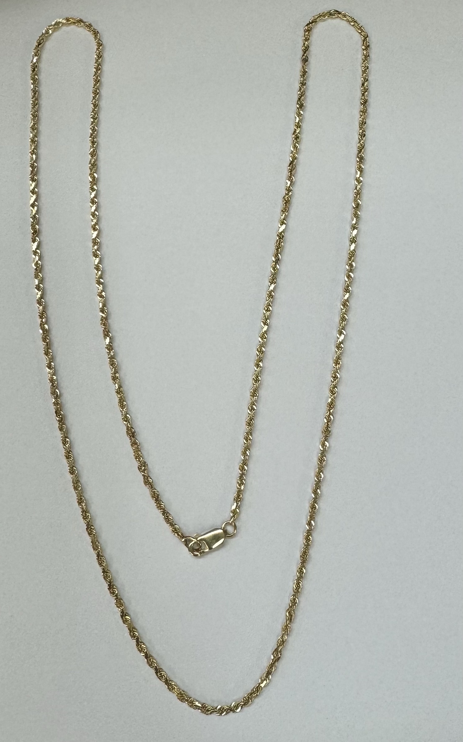 14k yellow gold 1.5 mm 22” rope chain with lobster claw clasp. This chain has an entire weight of 6.0 grams.