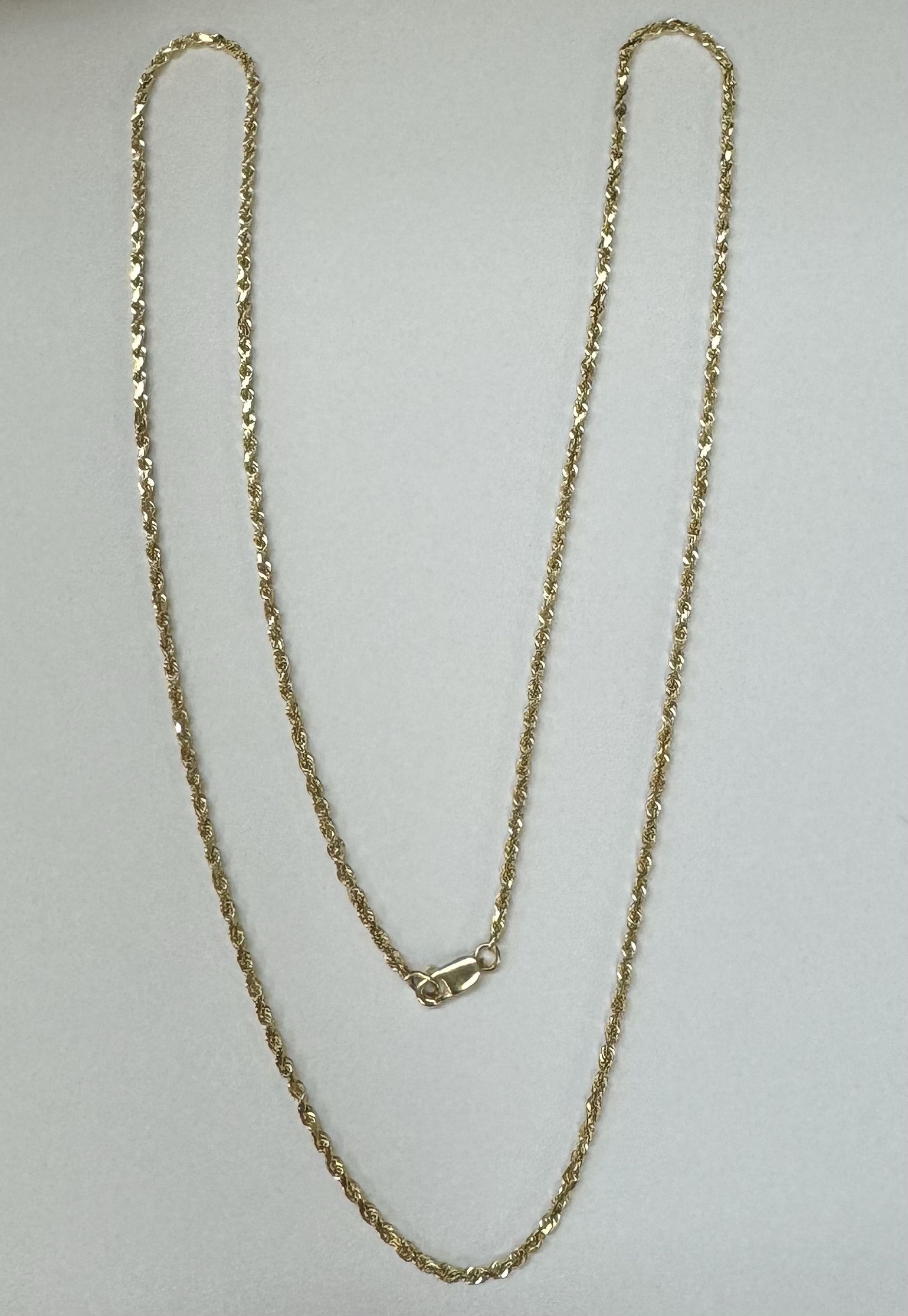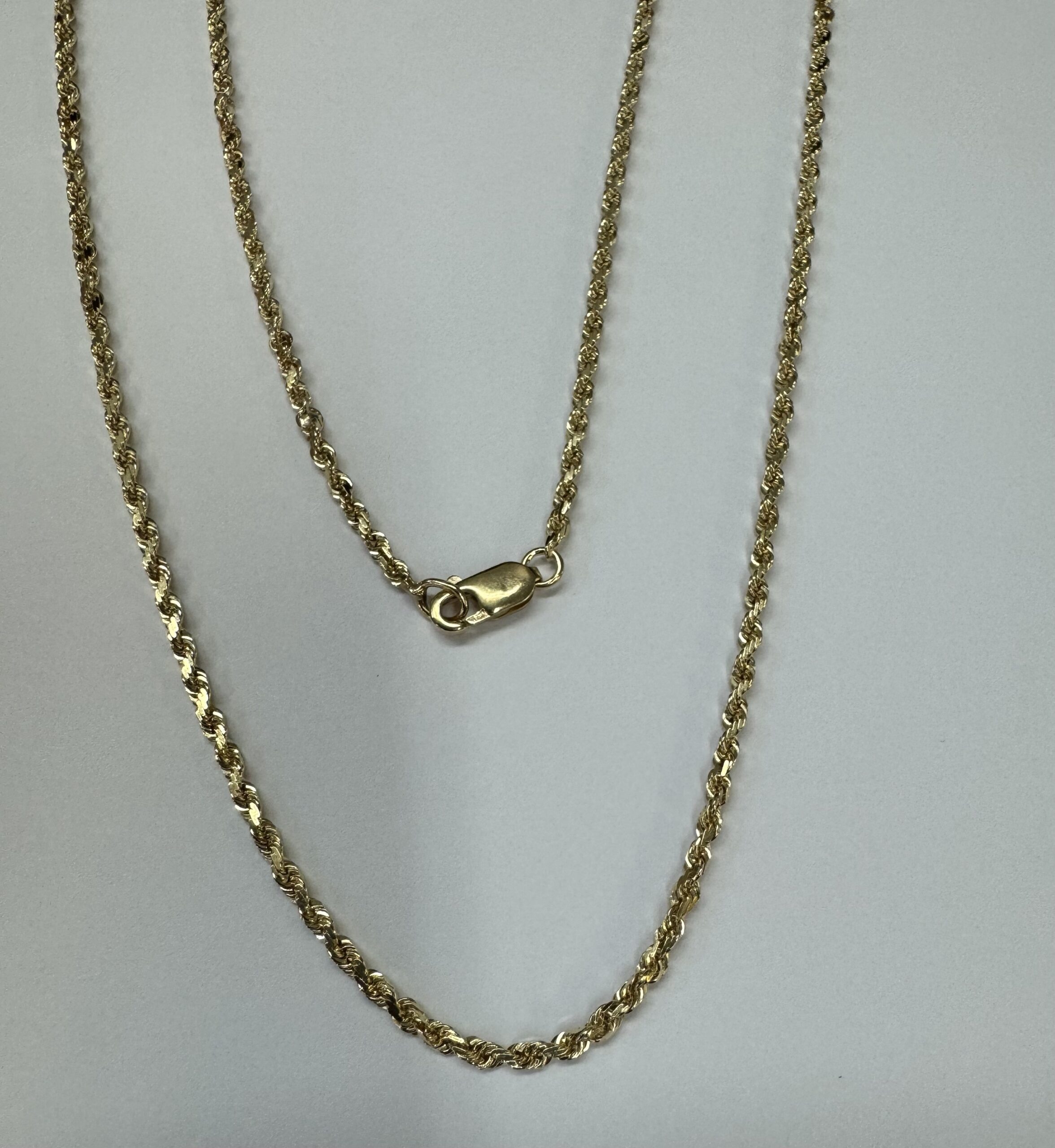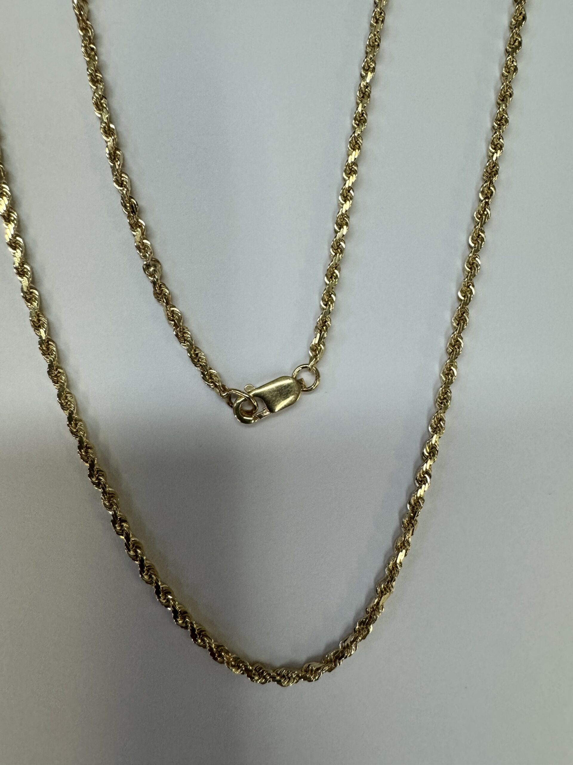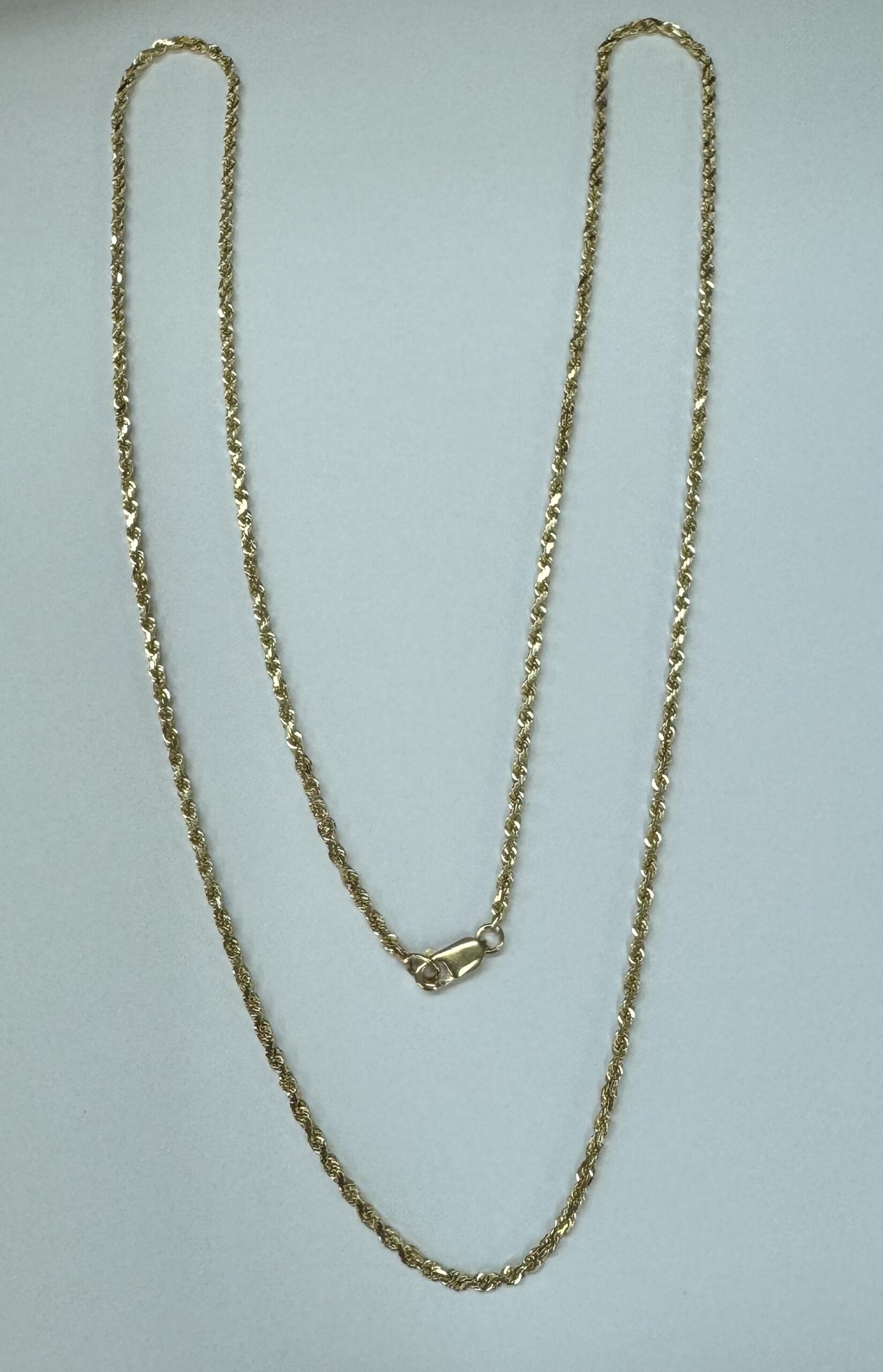 14k yellow gold 1.5 mm 22” rope chain with lobster claw clasp. This chain has an entire weight of 6.0 grams.