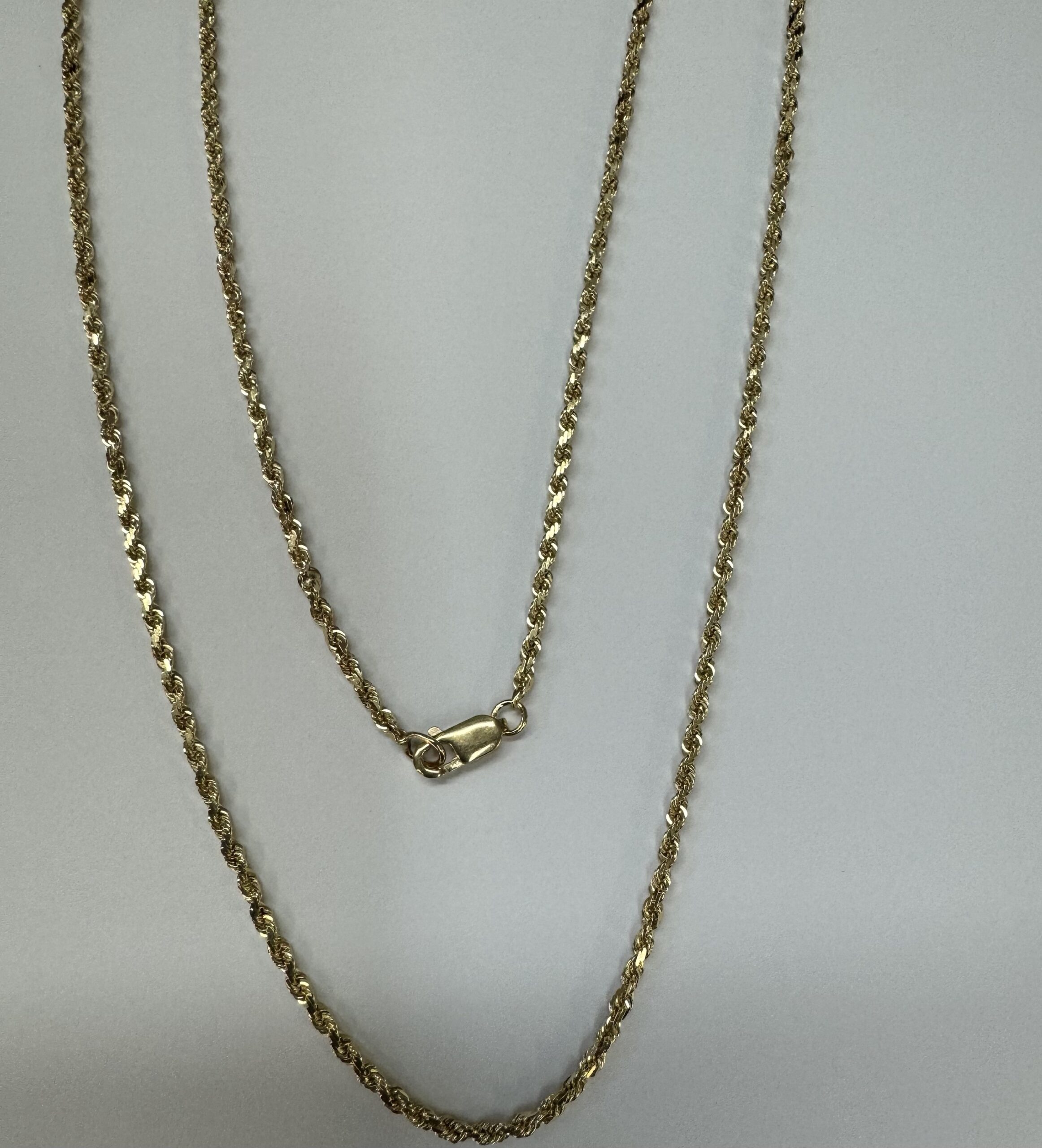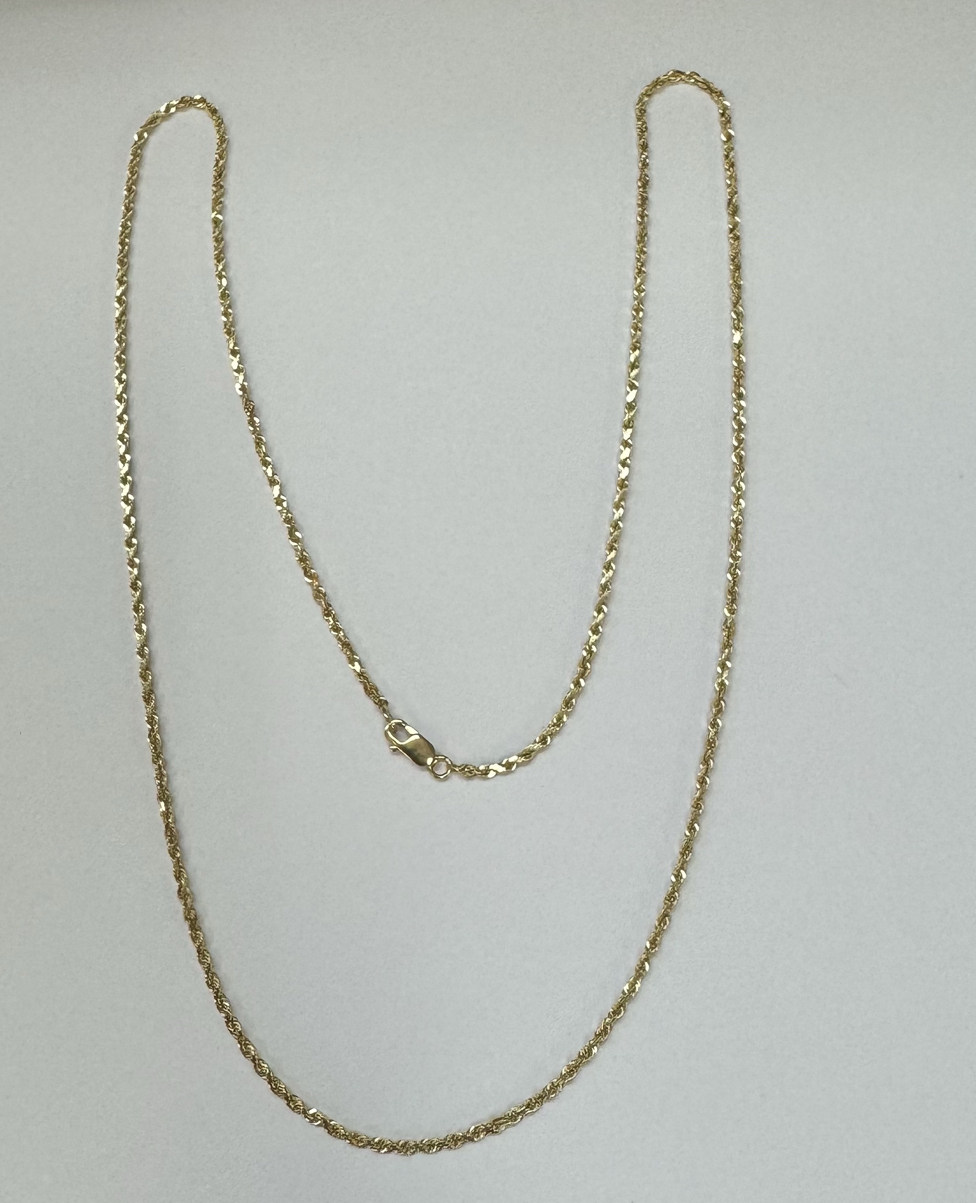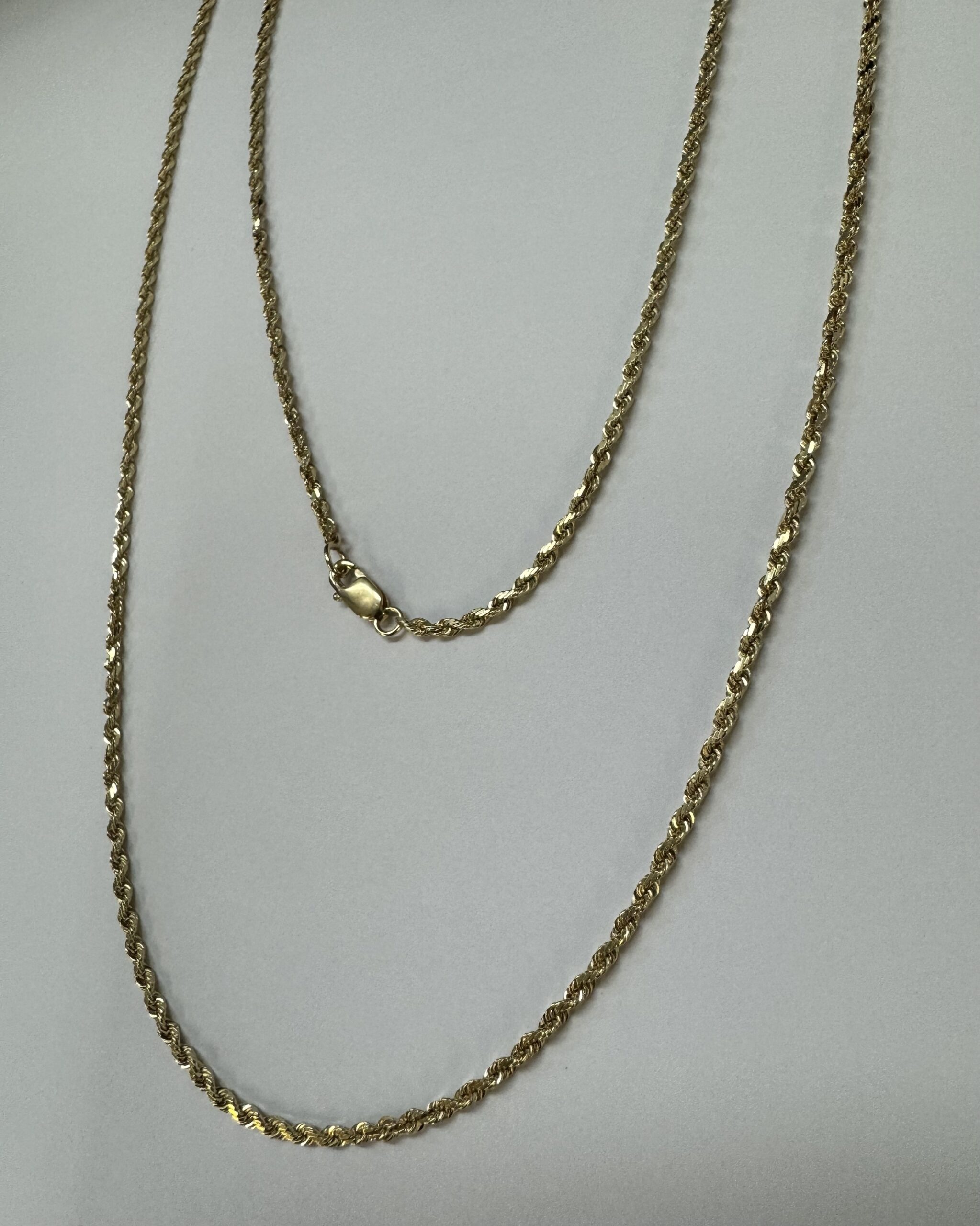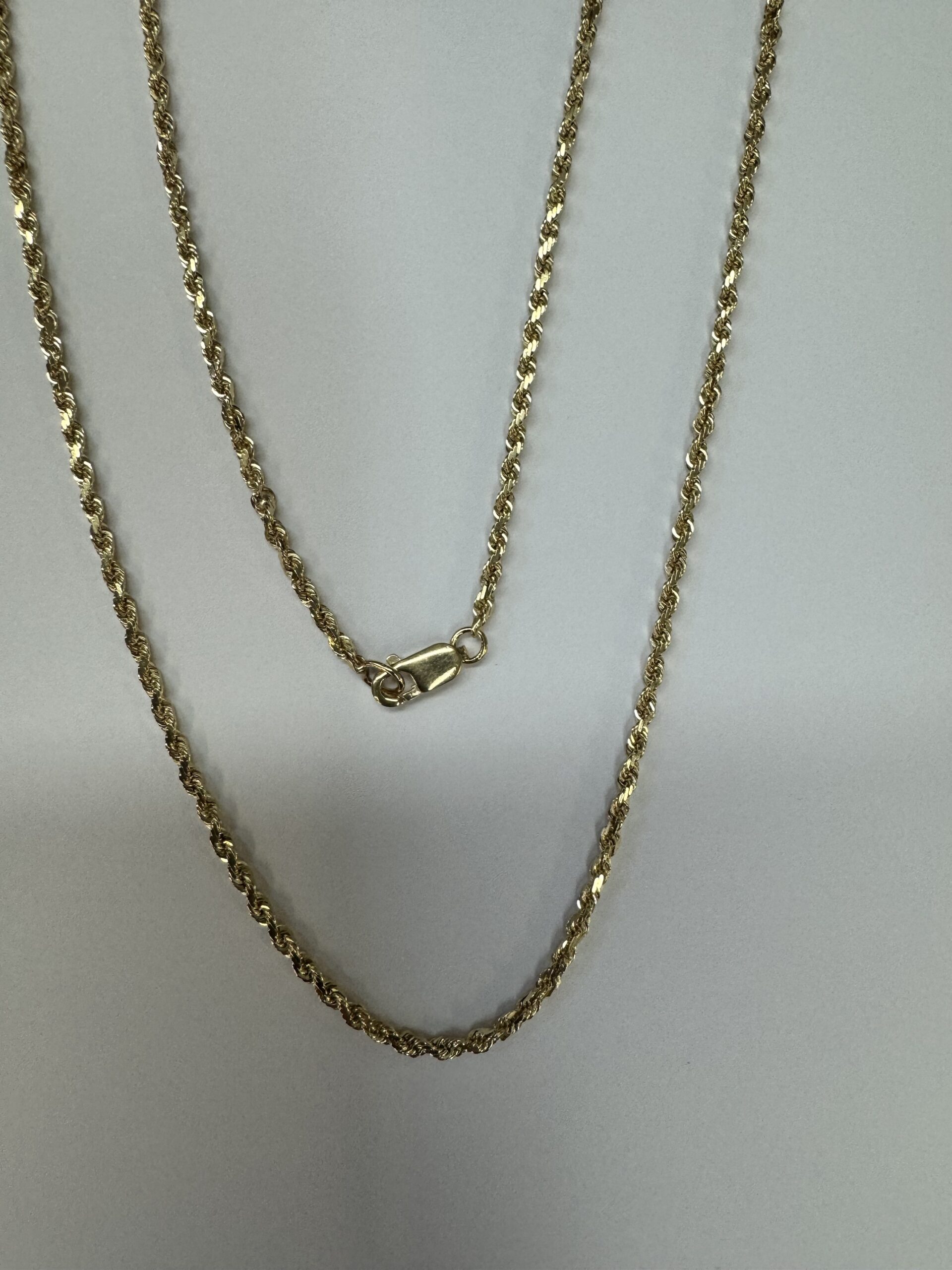 14k yellow gold 1.5 mm 22” rope chain with lobster claw clasp. This chain has an entire weight of 6.0 grams.