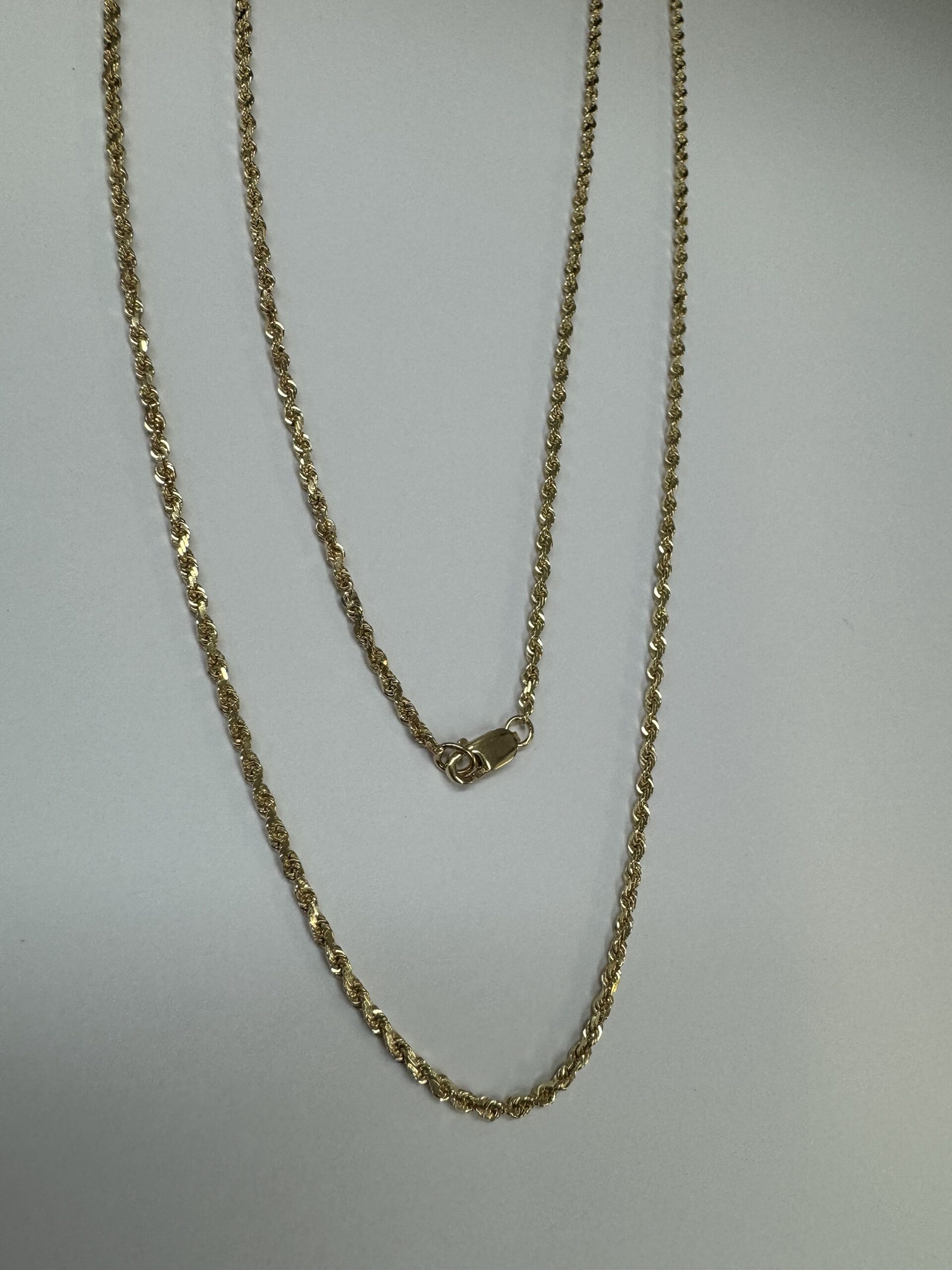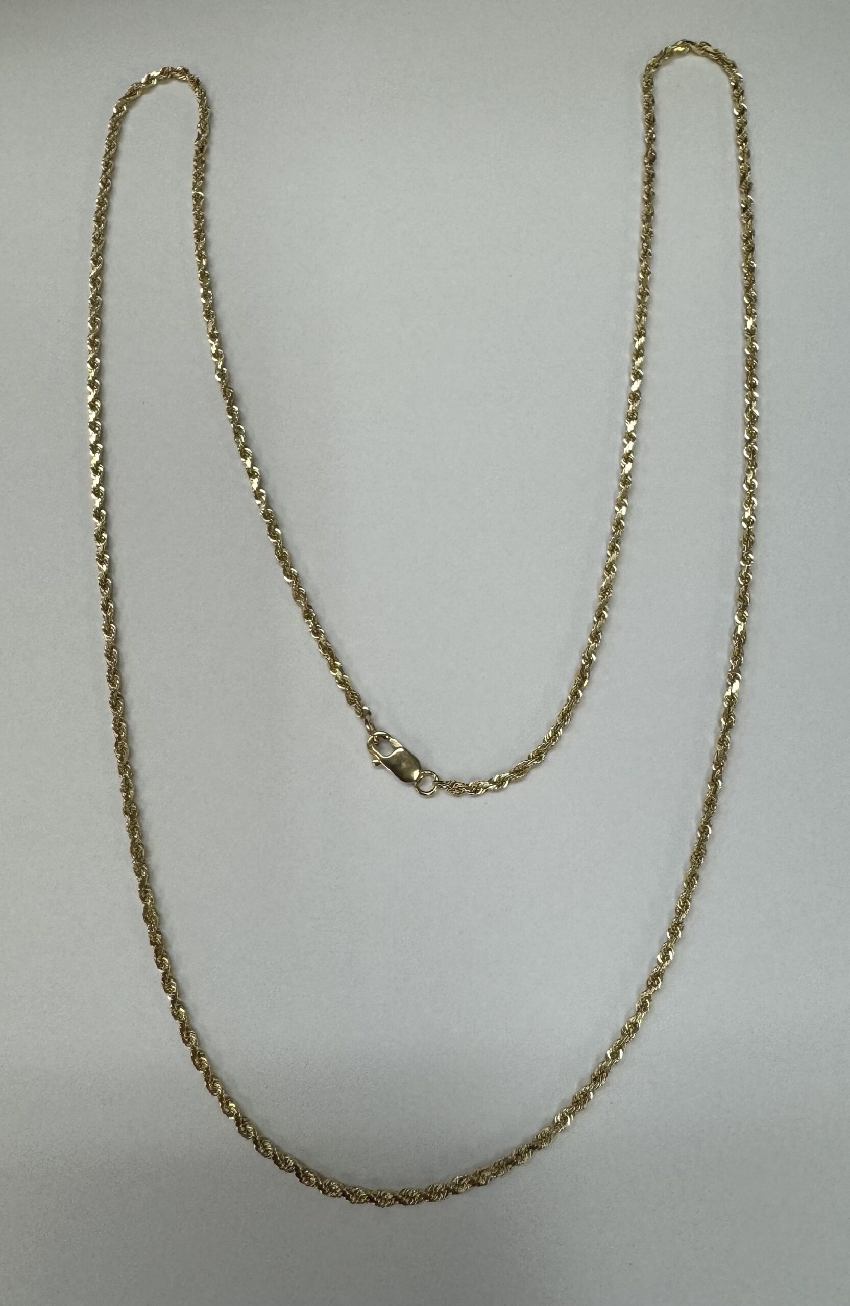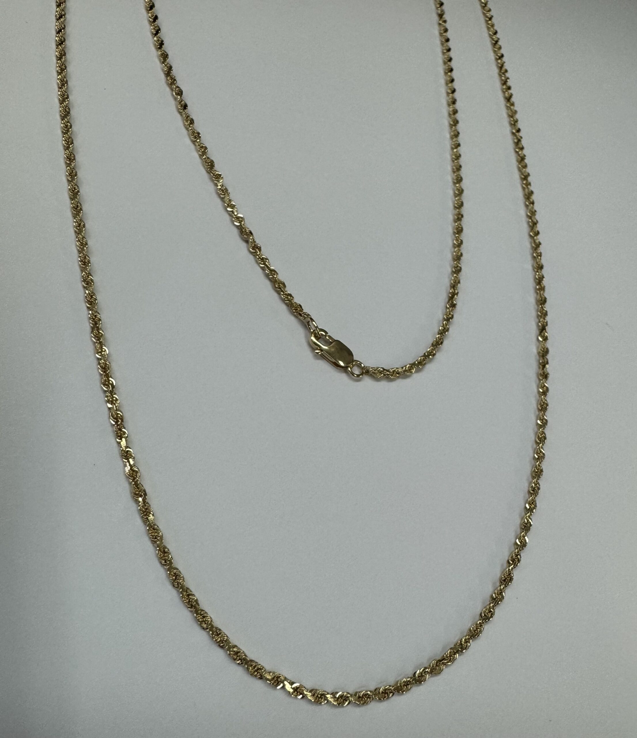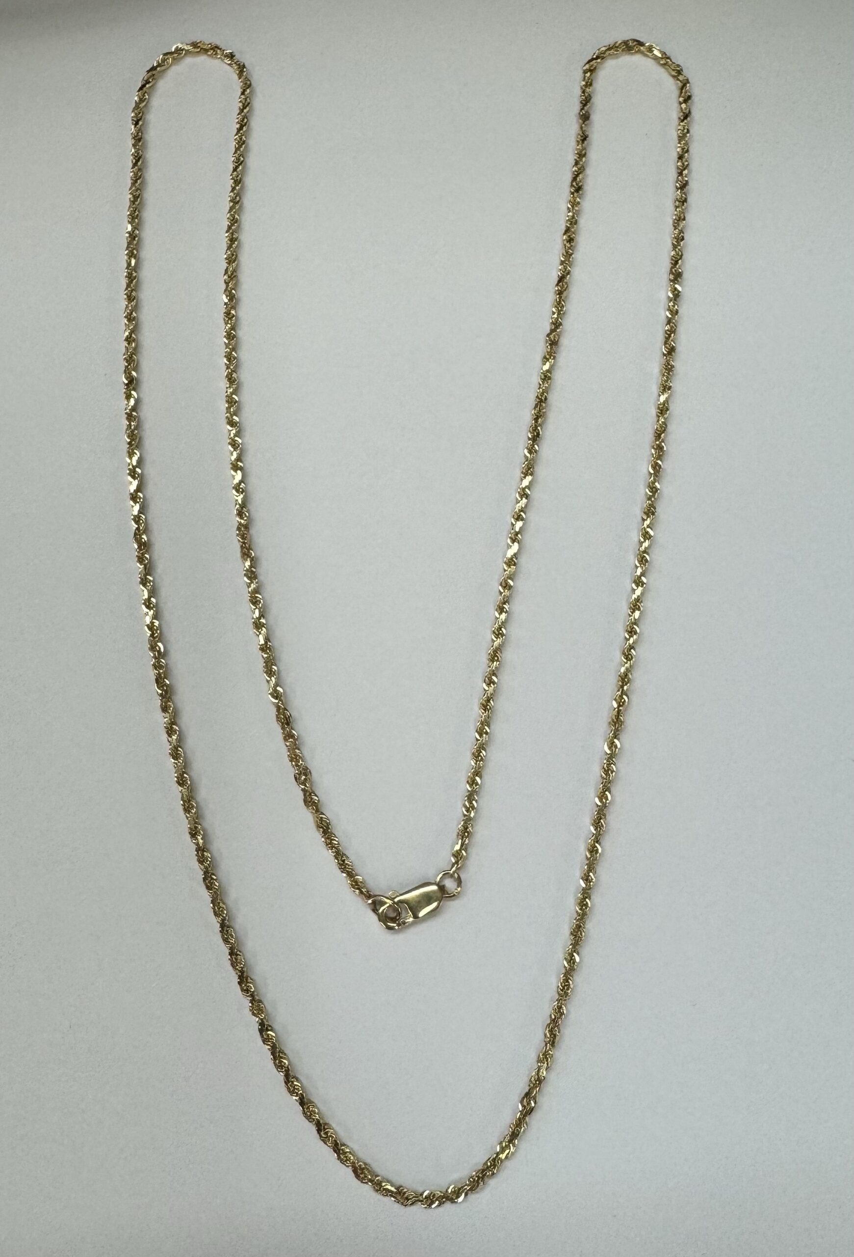 14k yellow gold 1.5 mm 22” rope chain with lobster claw clasp. This chain has an entire weight of 6.0 grams.