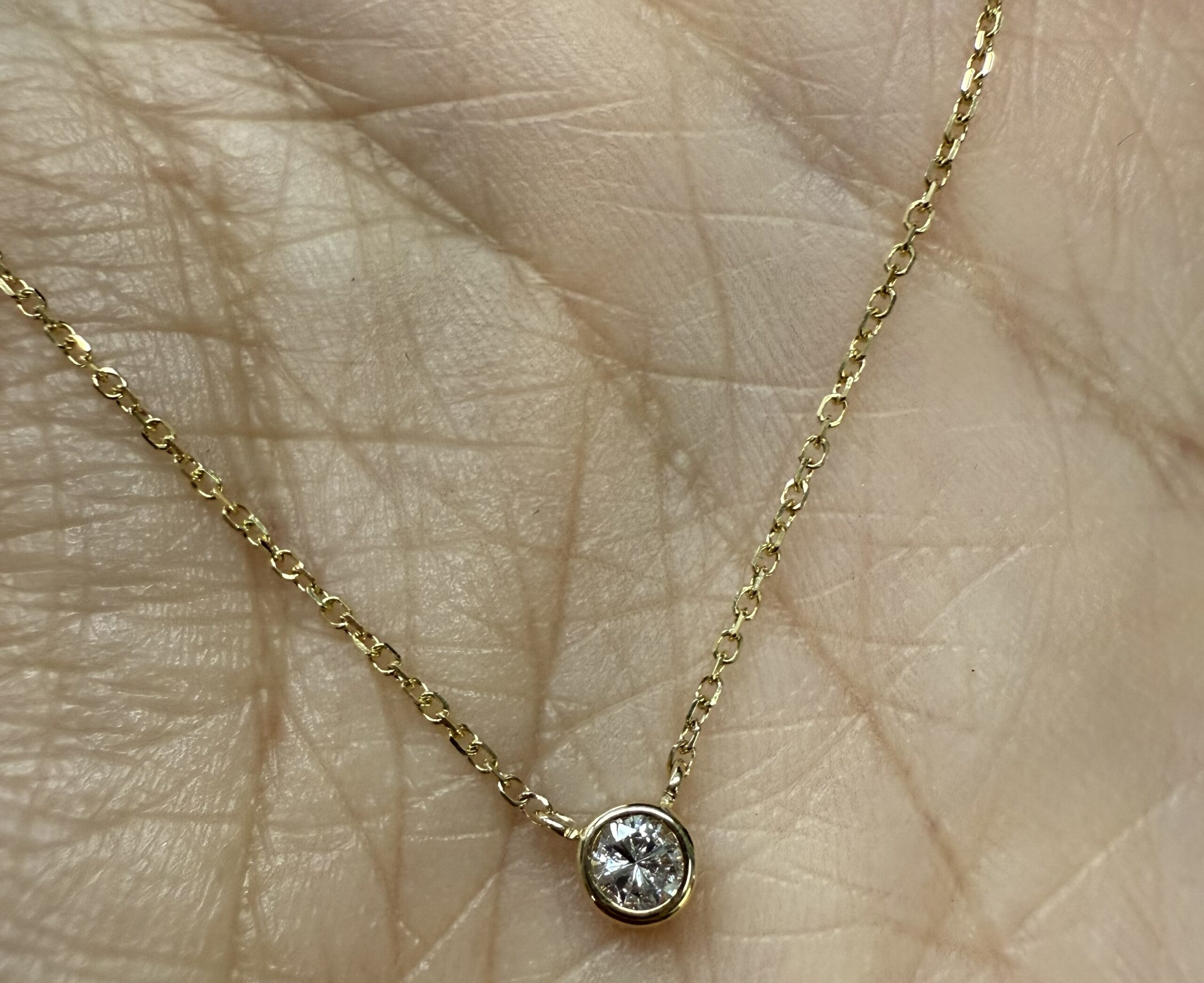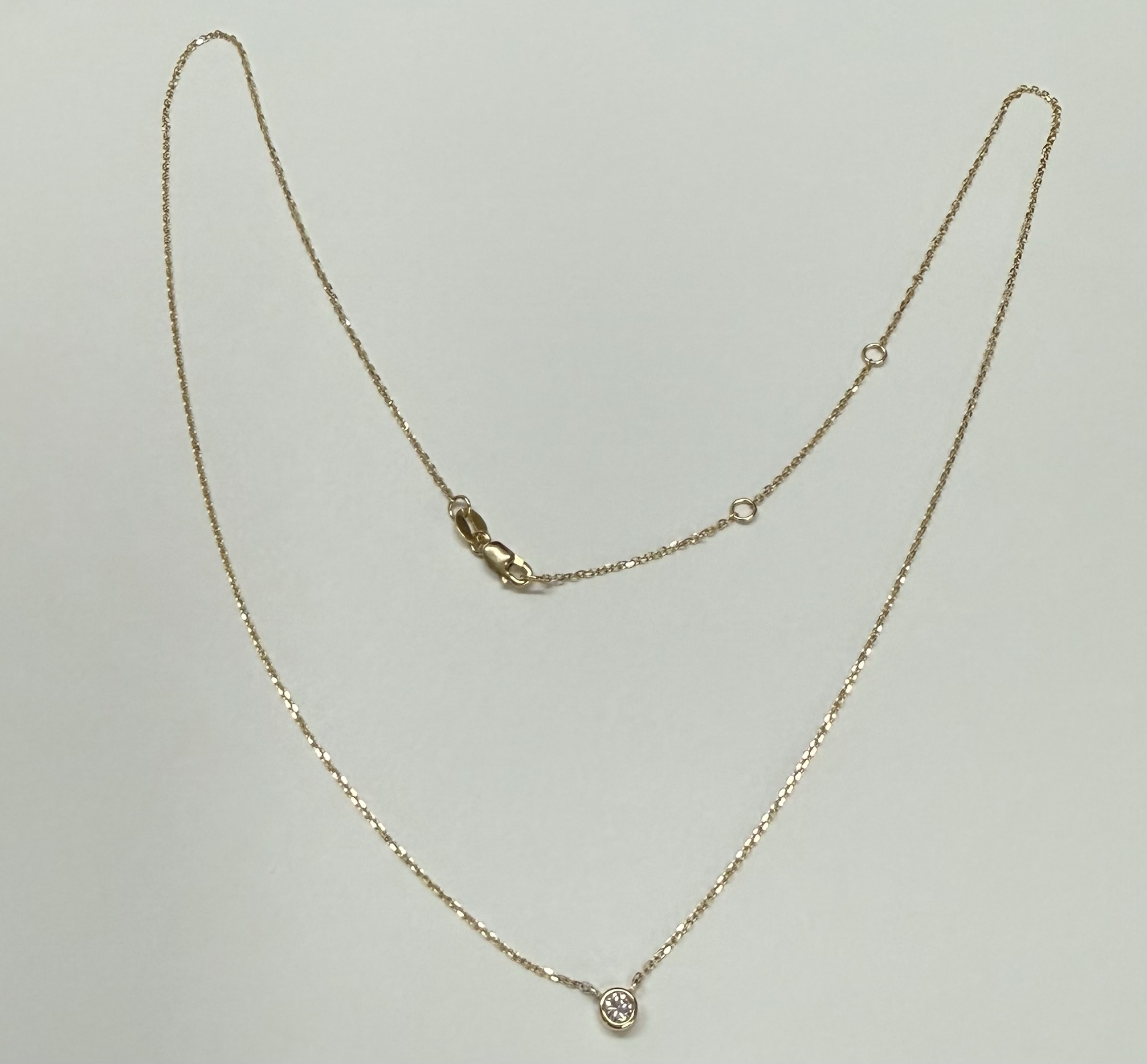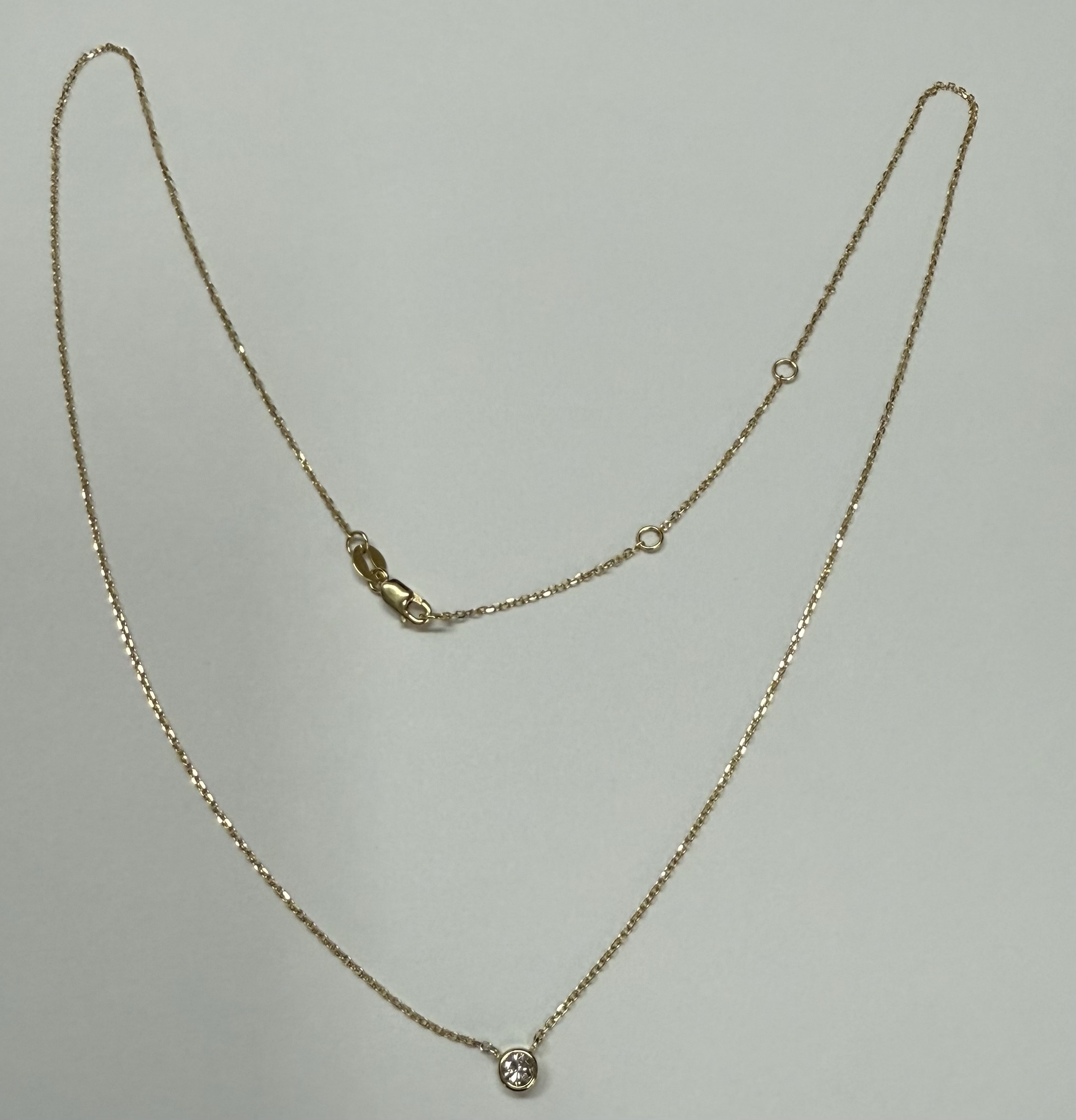 14k yellow gold genuine .11 cttw Round Brilliant Cut diamond fixed bezel pendant, adjustable 16-18″. This diamond has a color grade of G, and a clarity grade of SI1. This pendant has an entire weight of 1.3 grams.
