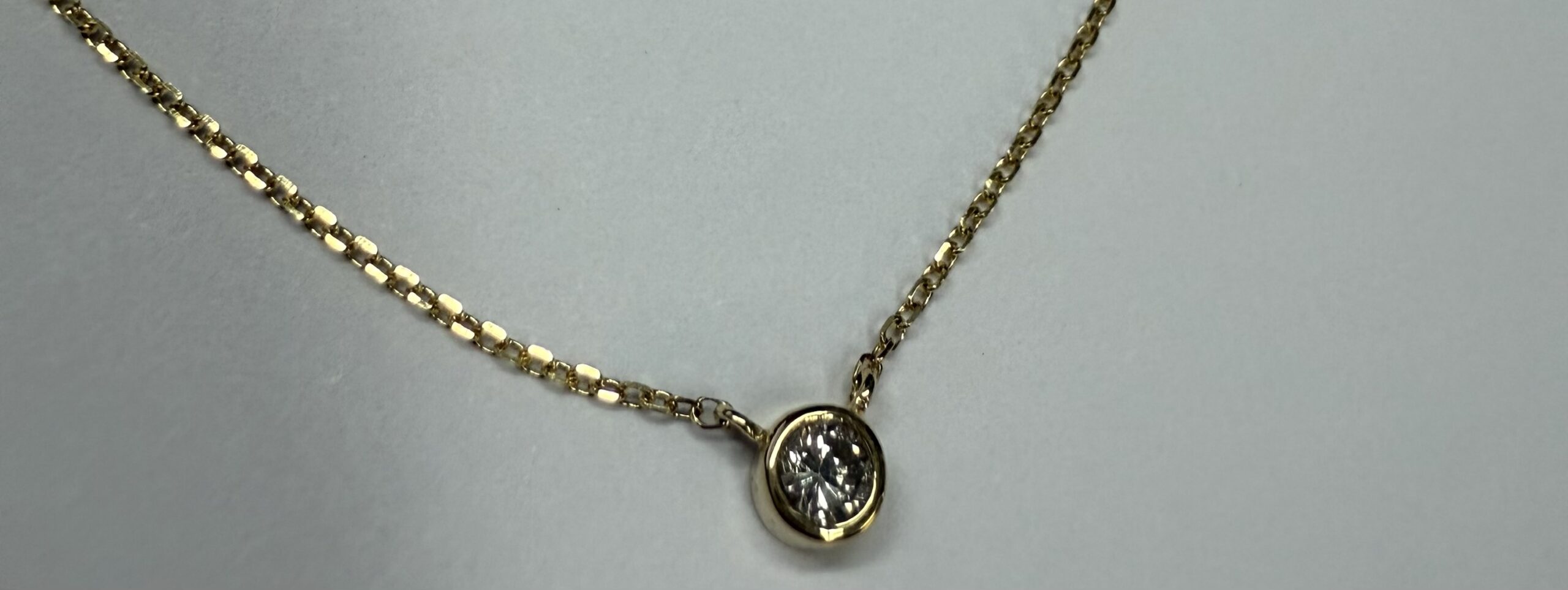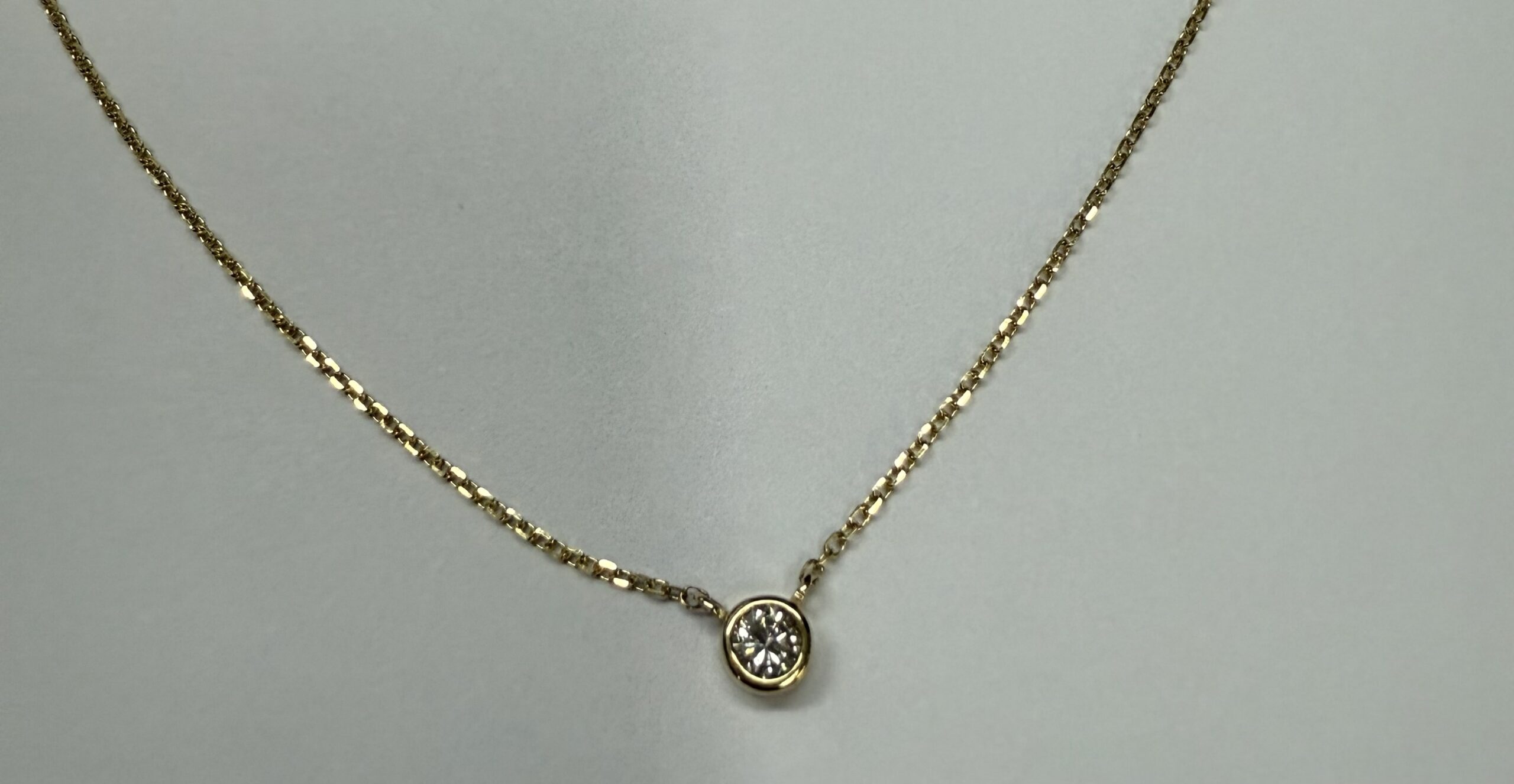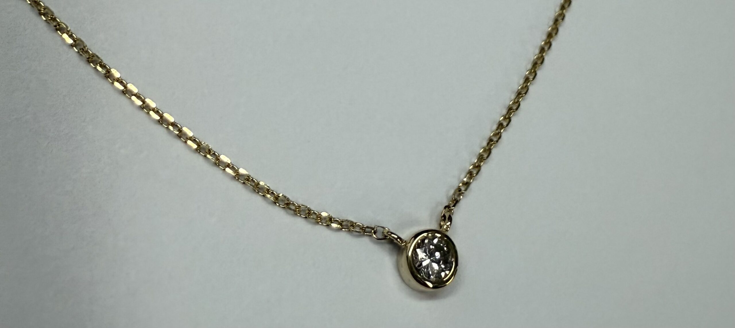 14k yellow gold genuine .11 cttw Round Brilliant Cut diamond fixed bezel pendant, adjustable 16-18″. This diamond has a color grade of G, and a clarity grade of SI1. This pendant has an entire weight of 1.3 grams.