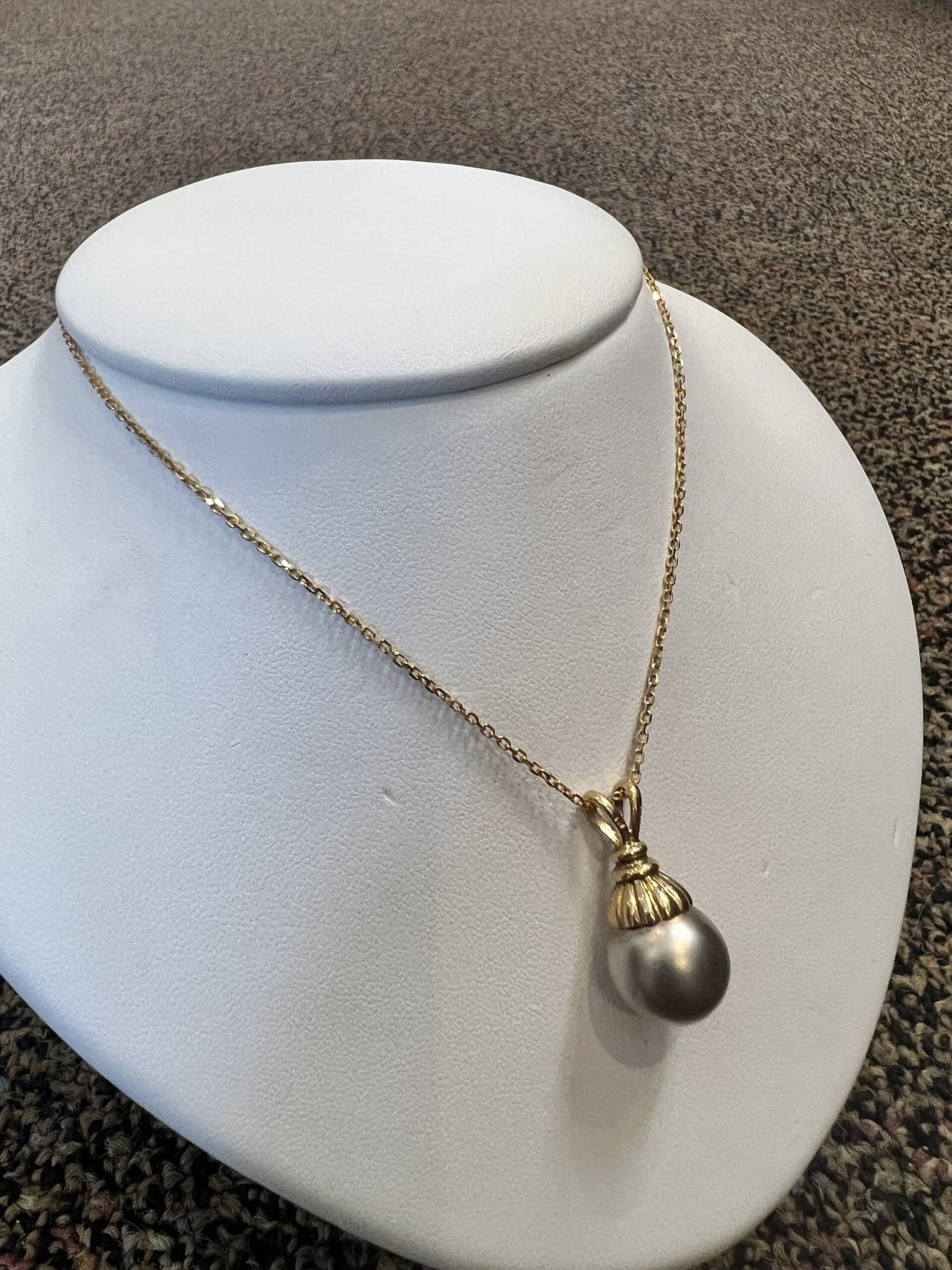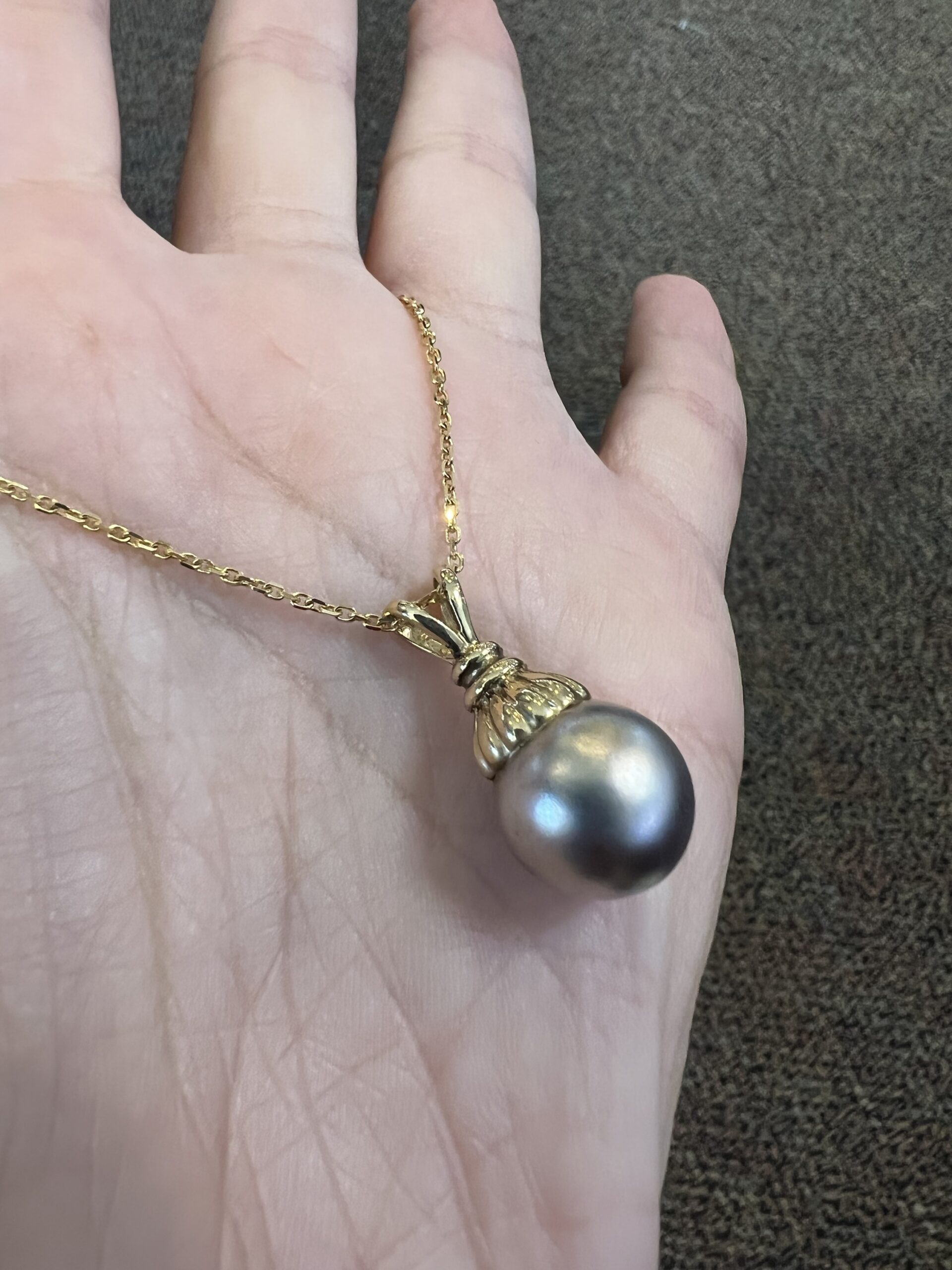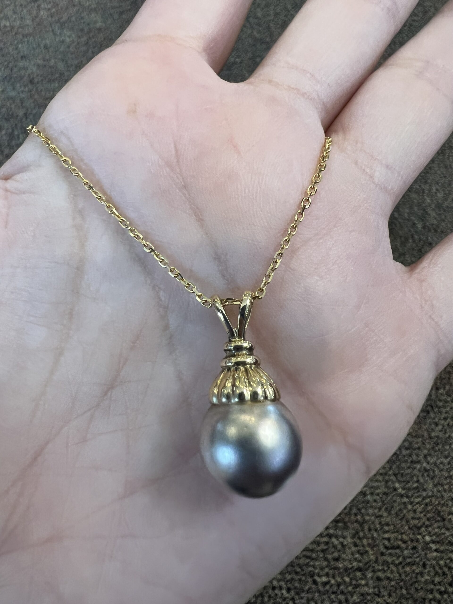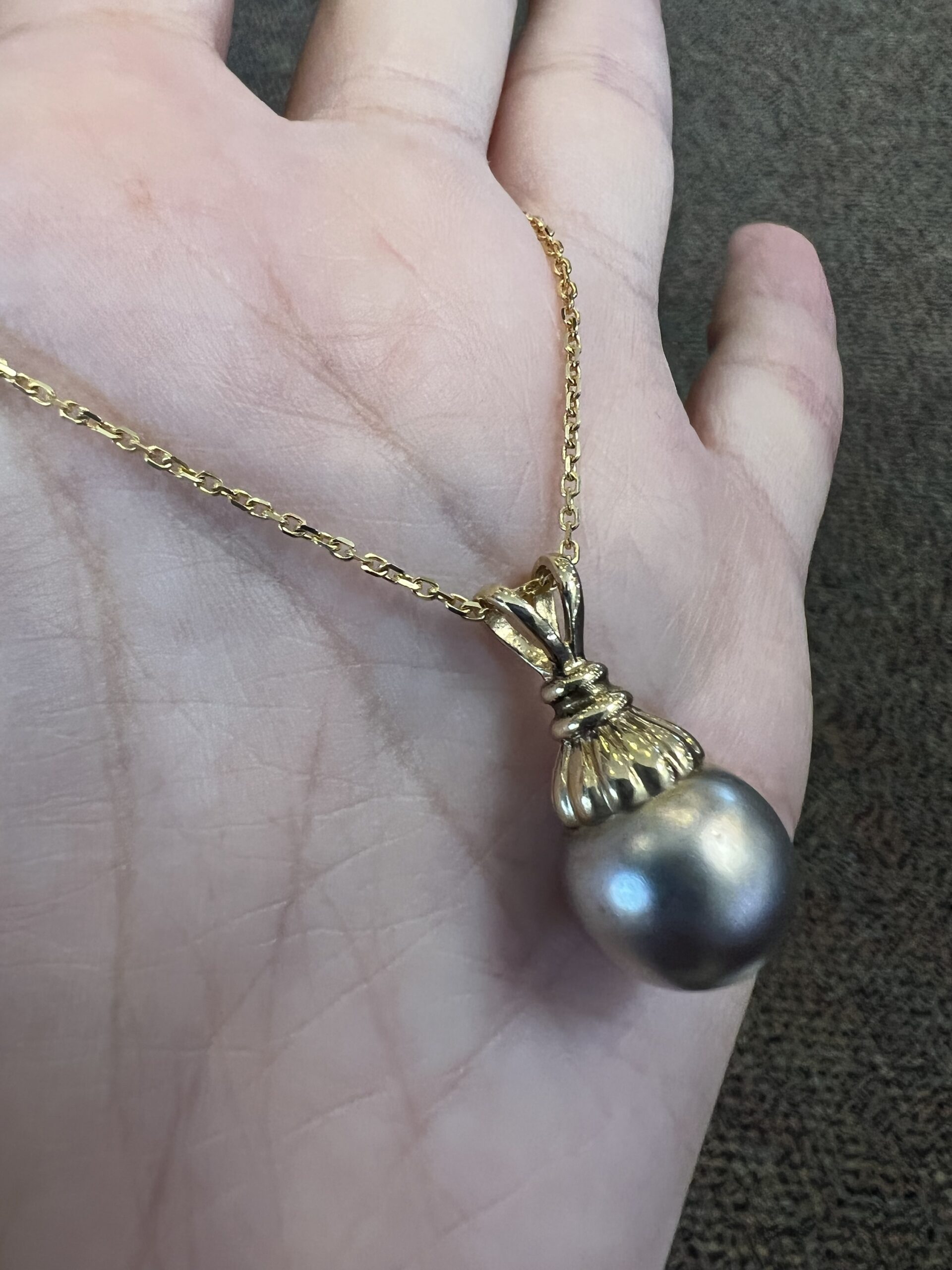 14k yellow gold 12.5 mm Tahitian pearl pendant, suspended from a 14k yellow gold 18″, 1.4 mm forzantina chain with lobster claw clasp. This piece has an entire weight of 5.1 grams.