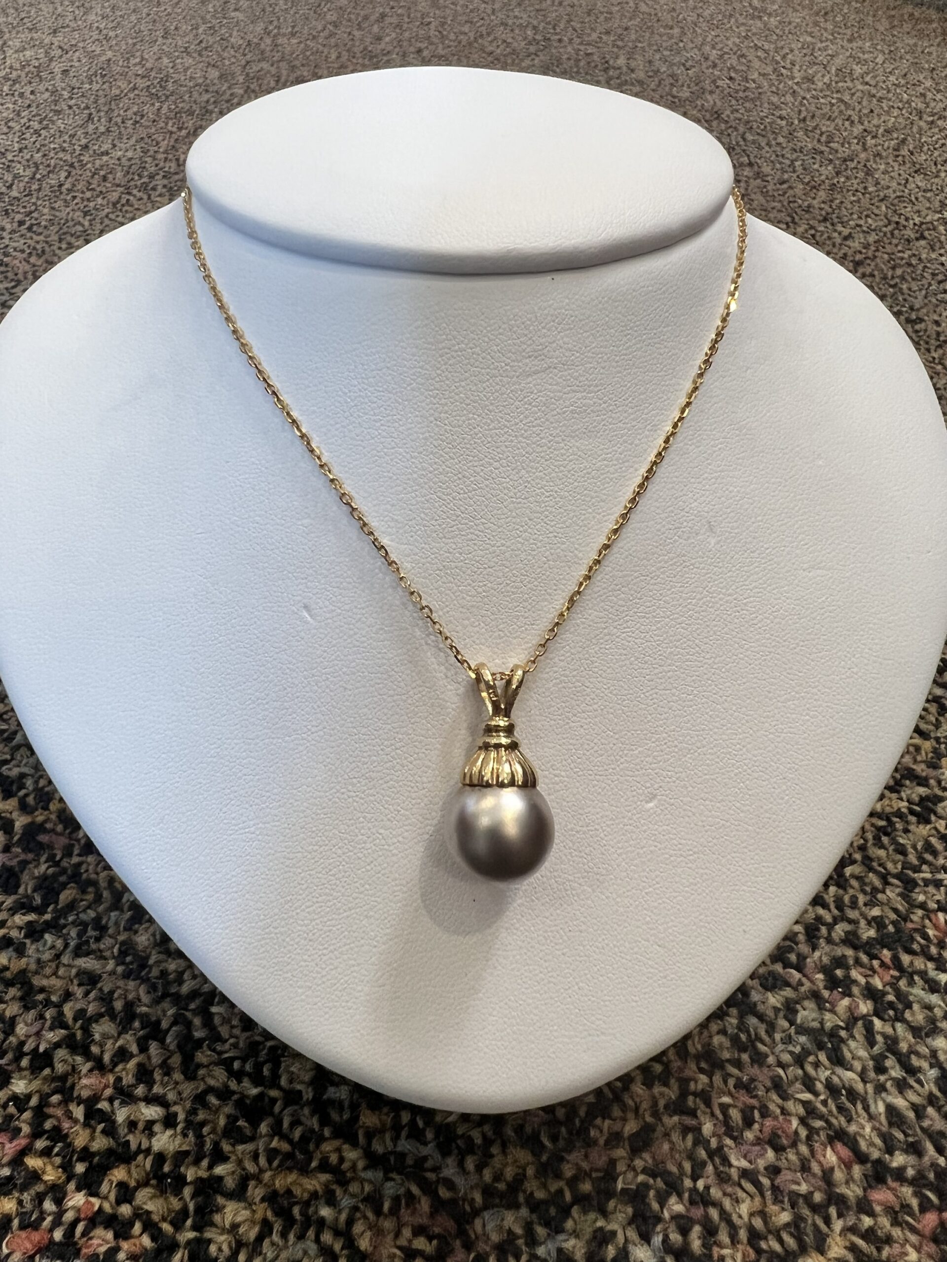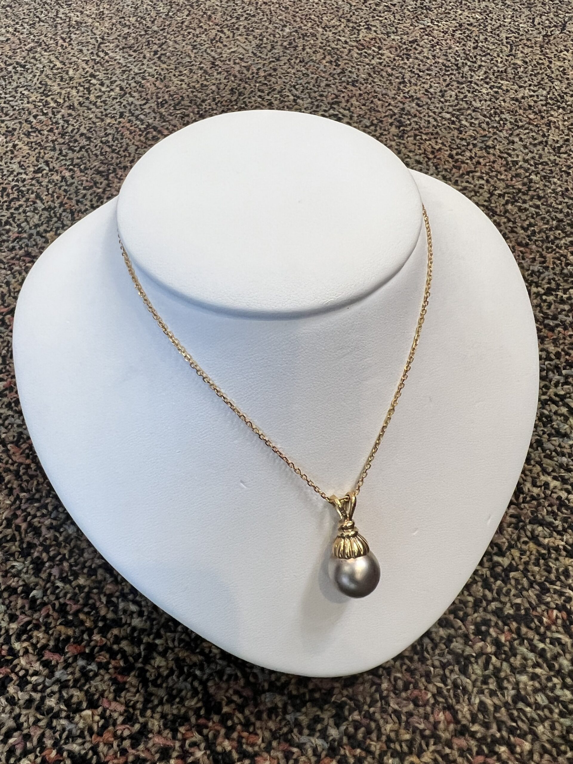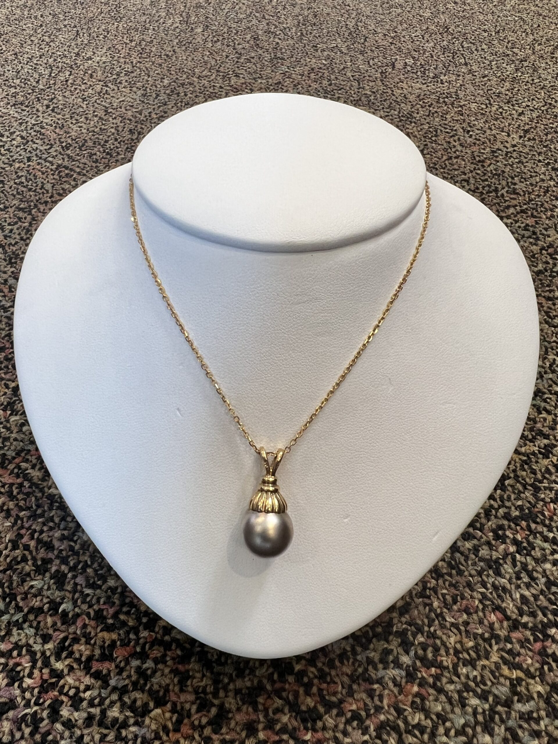 14k yellow gold 12.5 mm Tahitian pearl pendant, suspended from a 14k yellow gold 18″, 1.4 mm forzantina chain with lobster claw clasp. This piece has an entire weight of 5.1 grams.