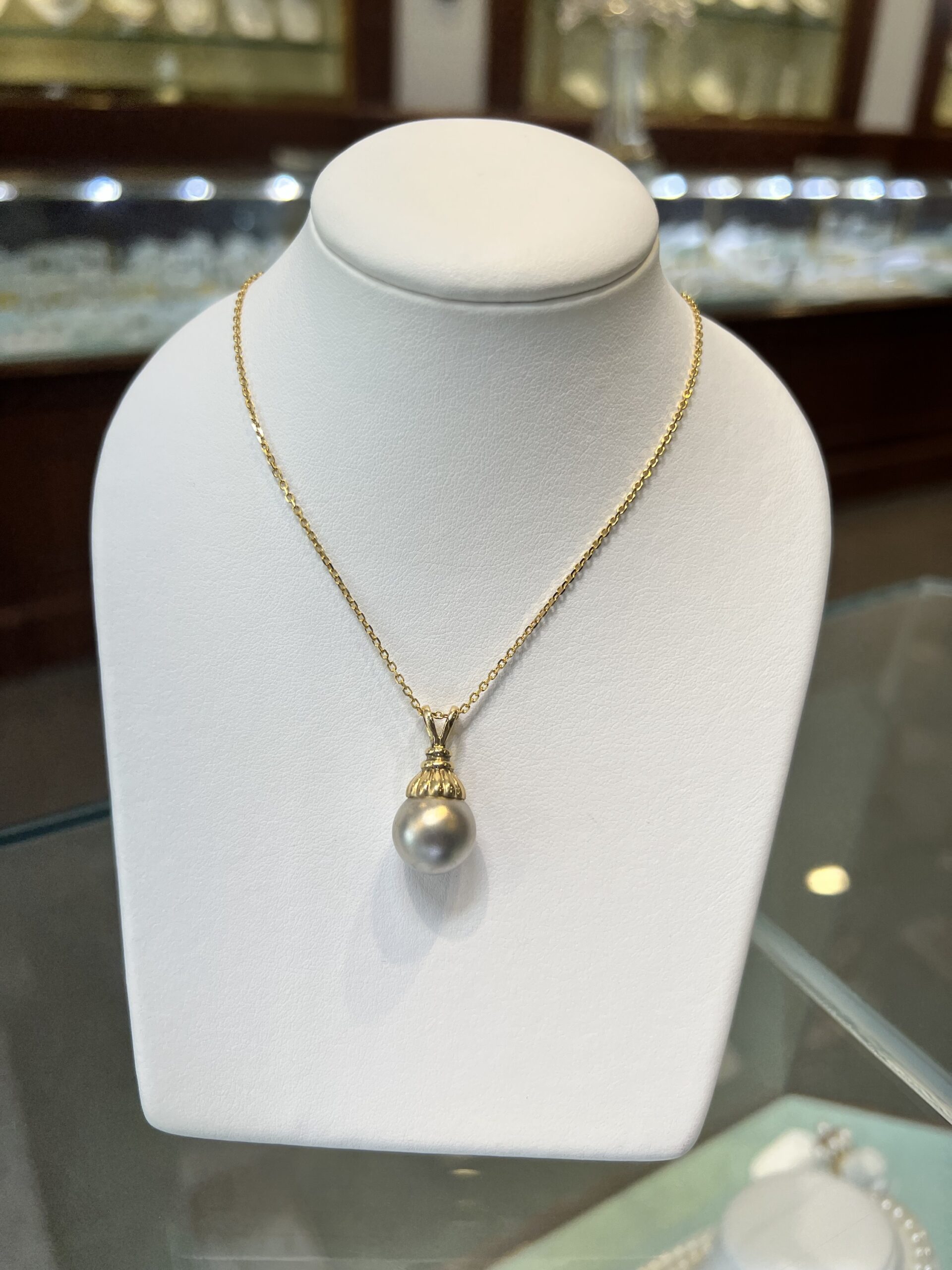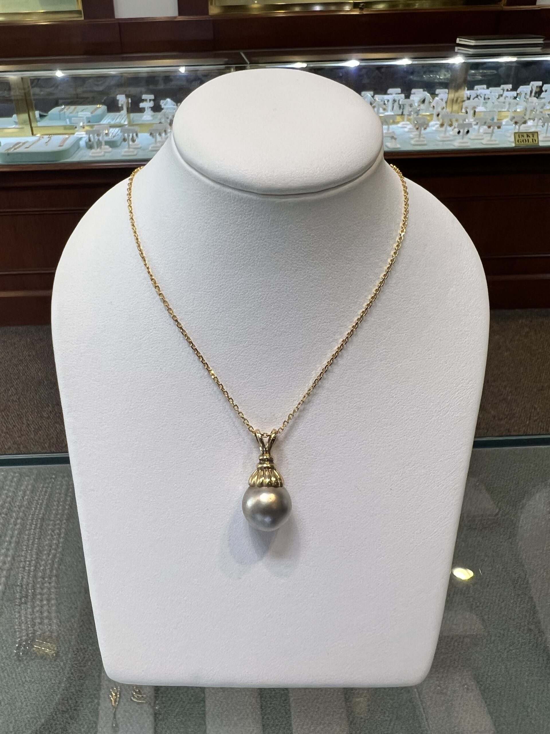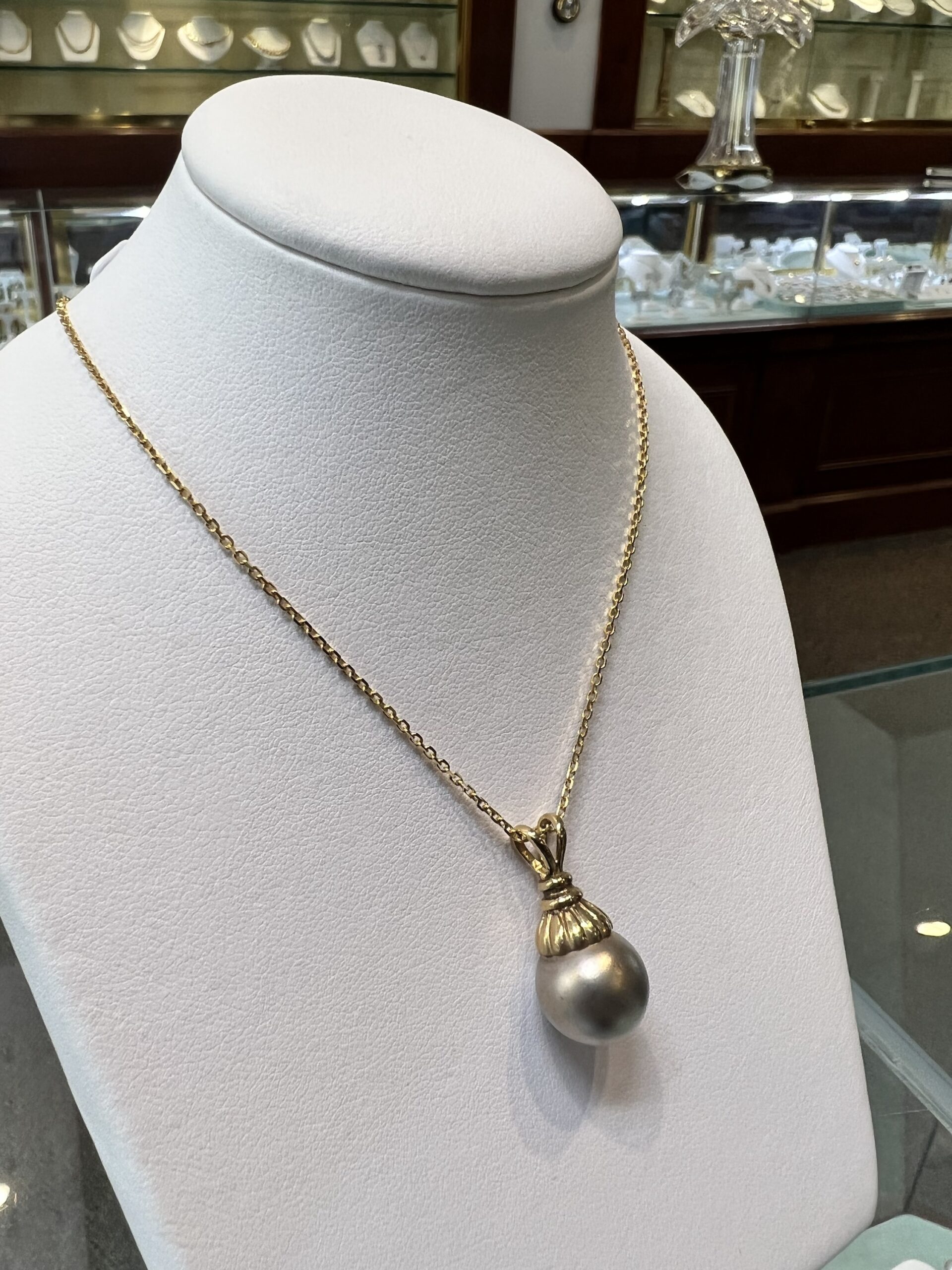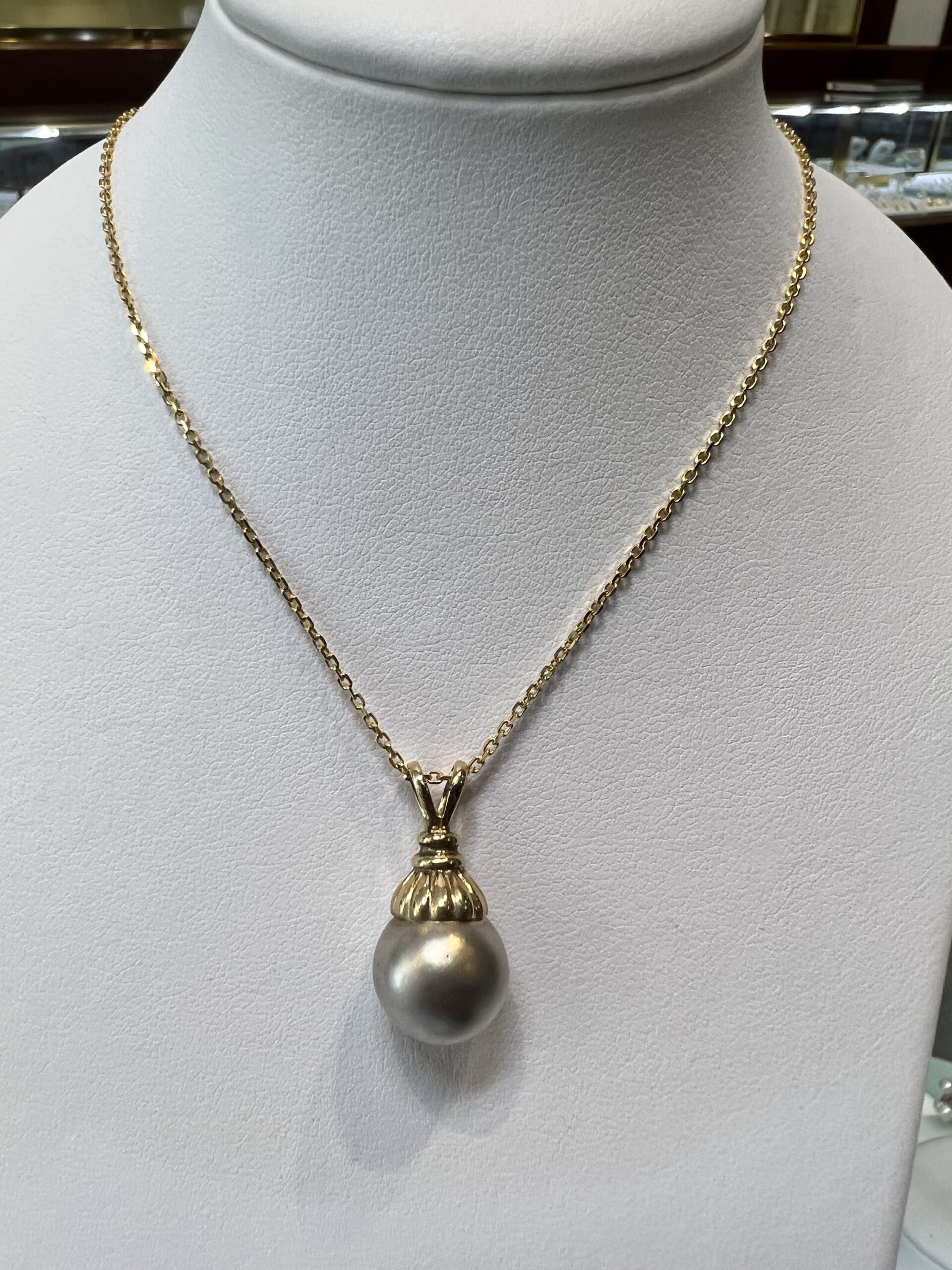 14k yellow gold 12.5 mm Tahitian pearl pendant, suspended from a 14k yellow gold 18″, 1.4 mm forzantina chain with lobster claw clasp. This piece has an entire weight of 5.1 grams.