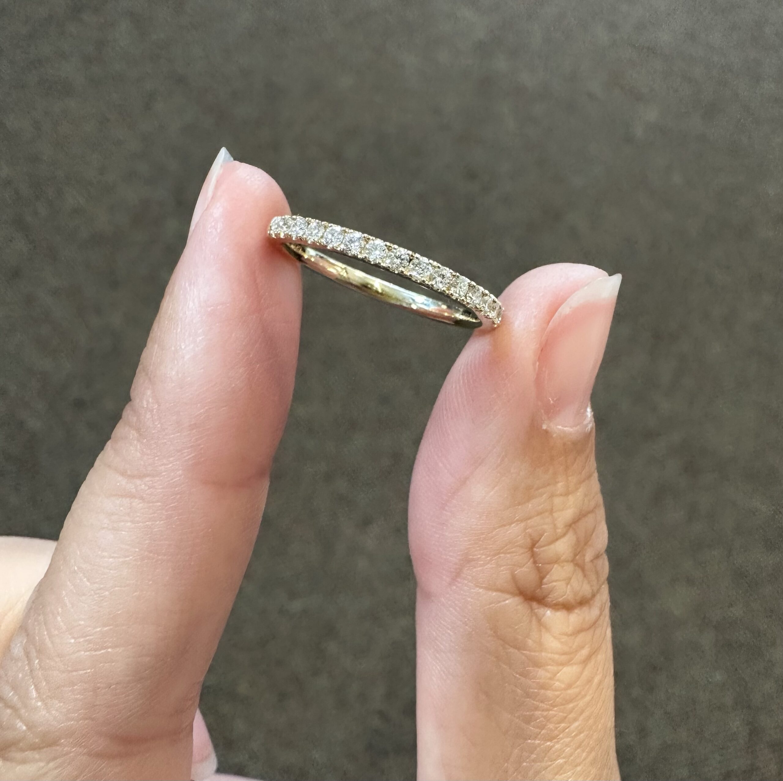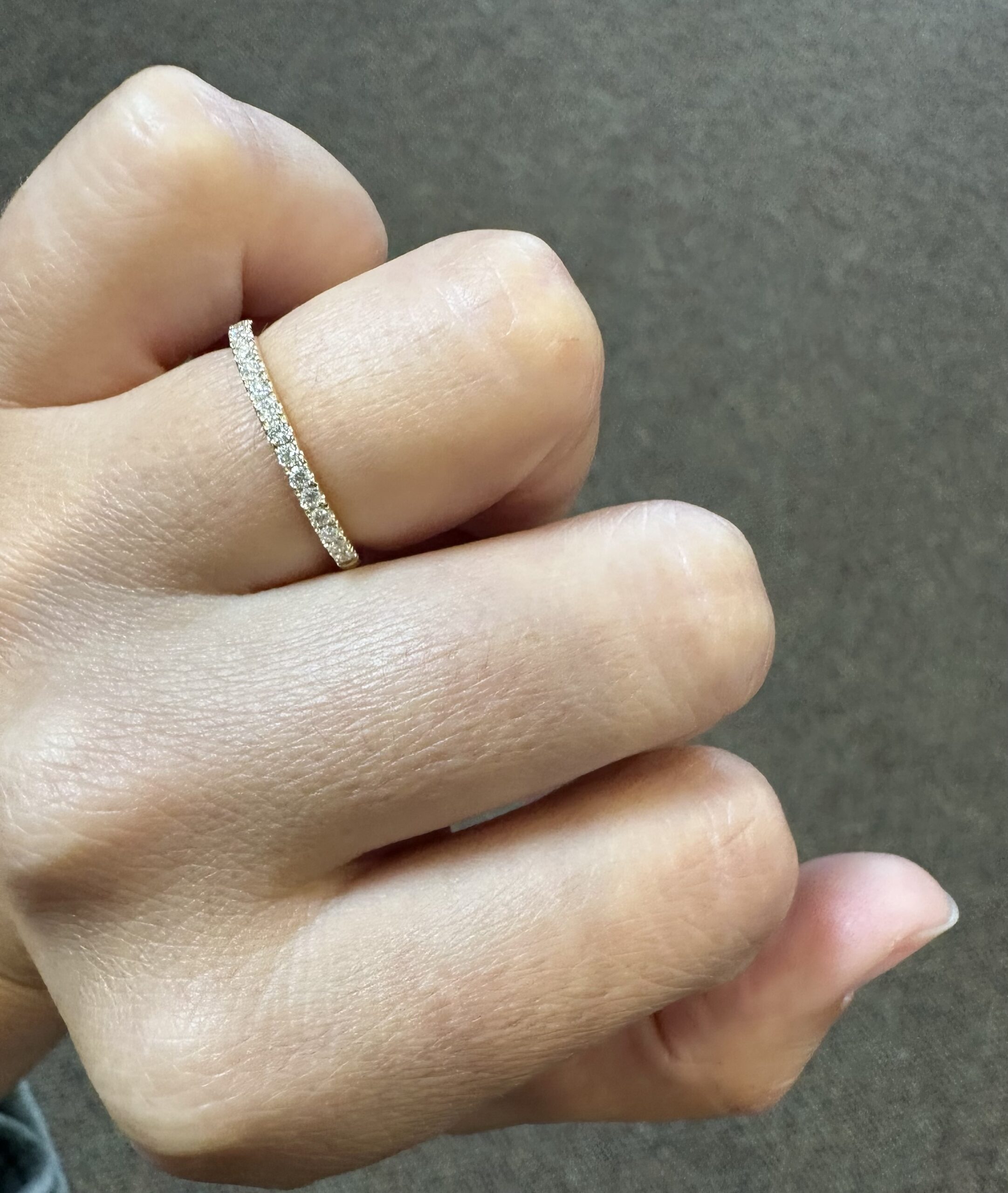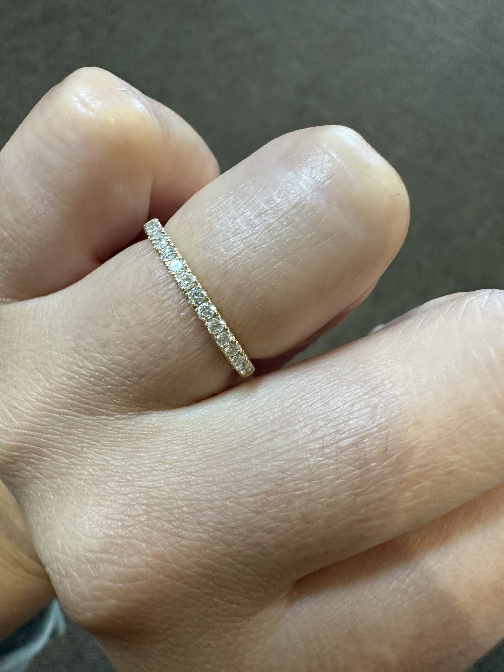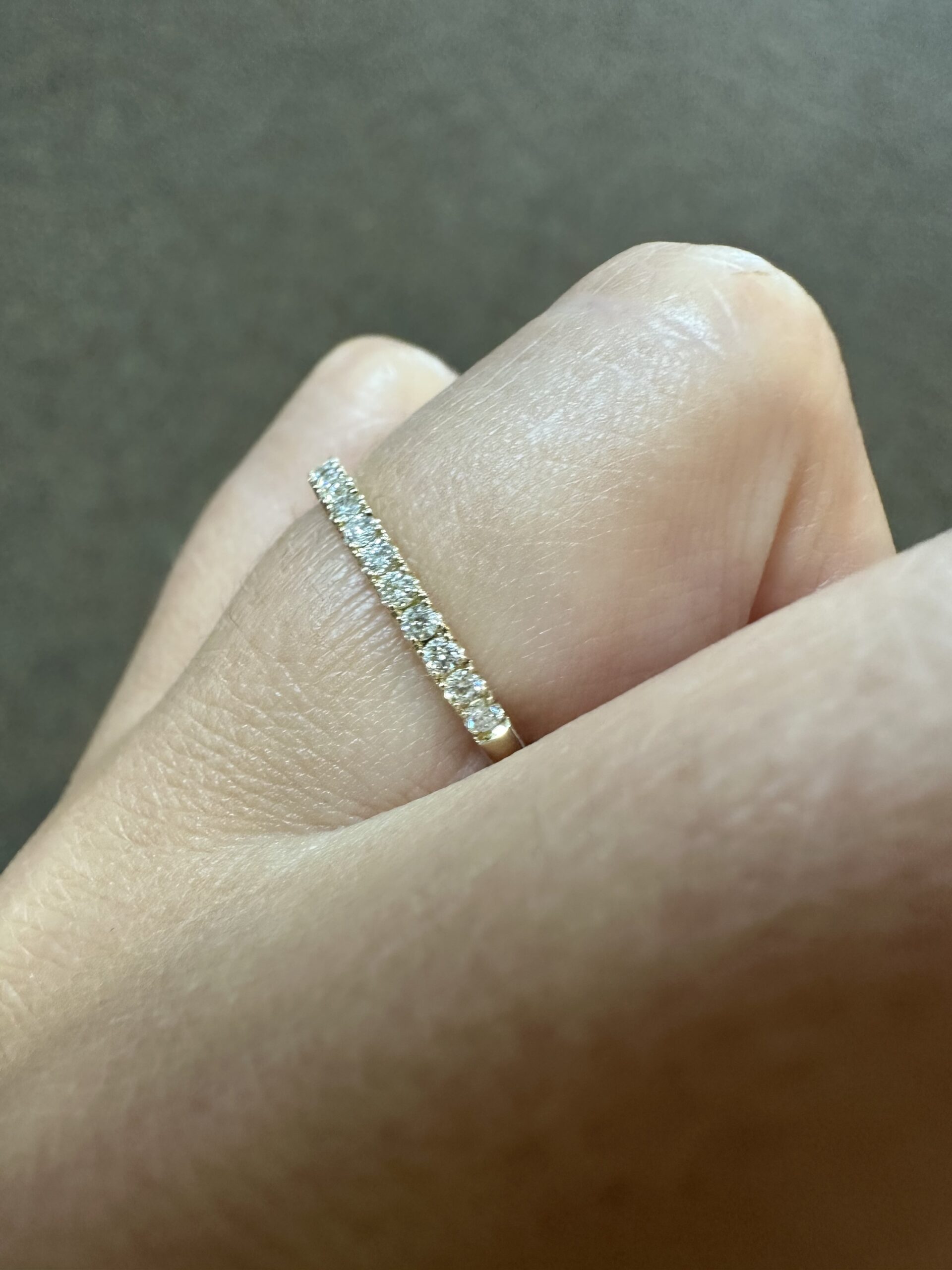 Our best-selling 14k yellow gold low-profile 17 stone genuine .25 cttw Round Brilliant Cut diamond band. These diamonds average F-G in color and VS2 in clarity. These diamonds are nicely proportioned and well finished. This ring is a finger size 6, but it can be reasonably sized. Please make note of the finger size in the comments section at checkout. This ring has an entire weight of 1.8 grams.