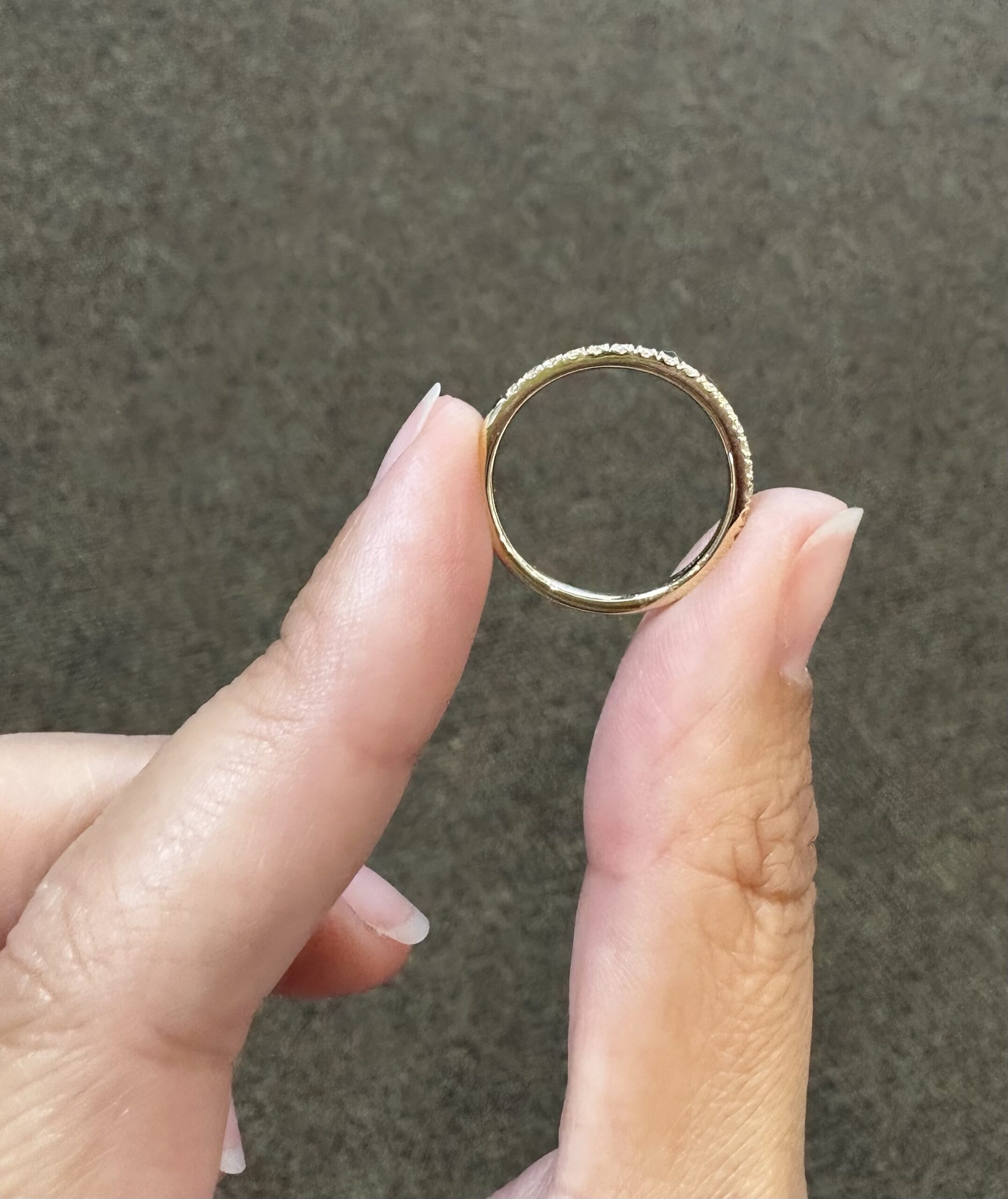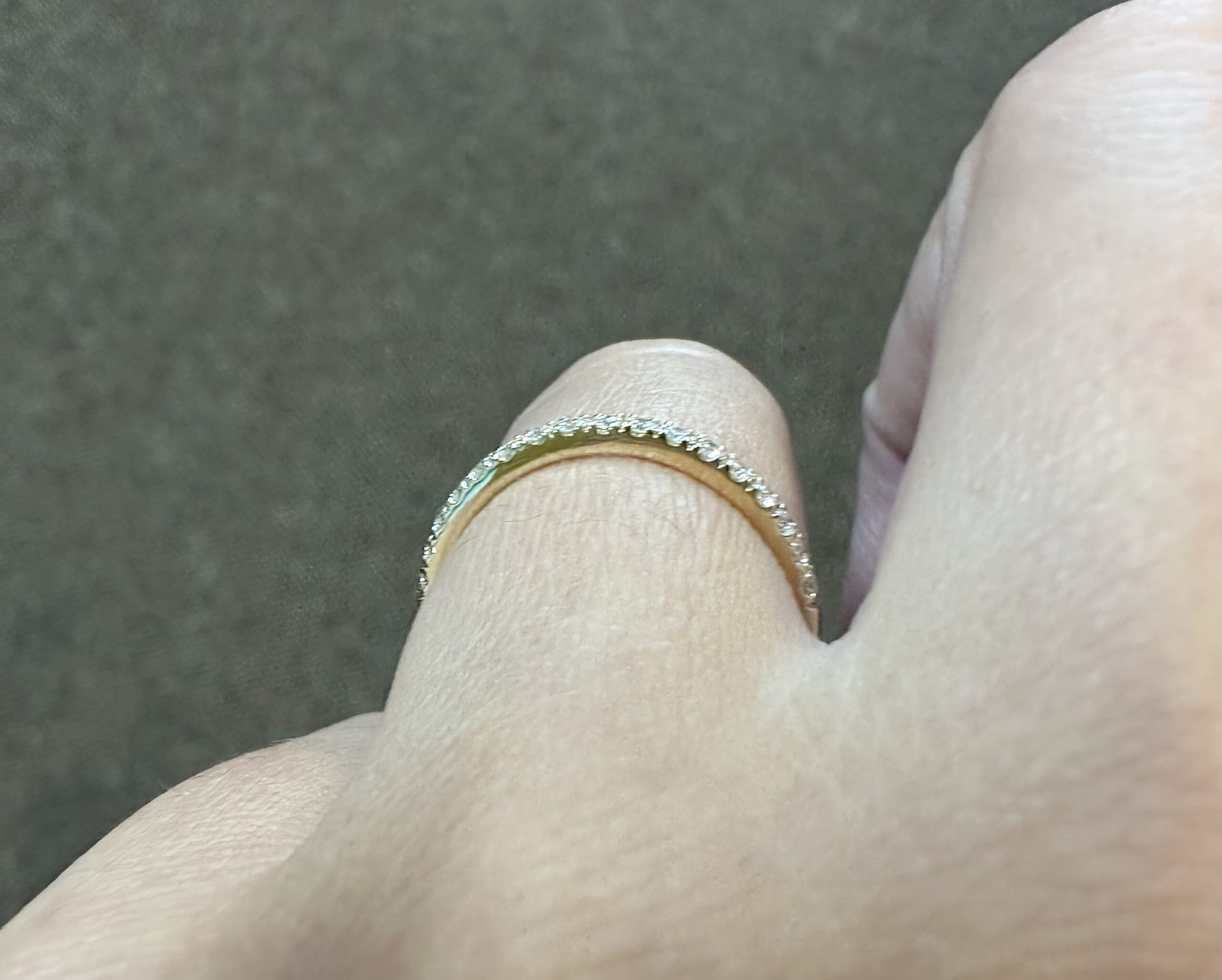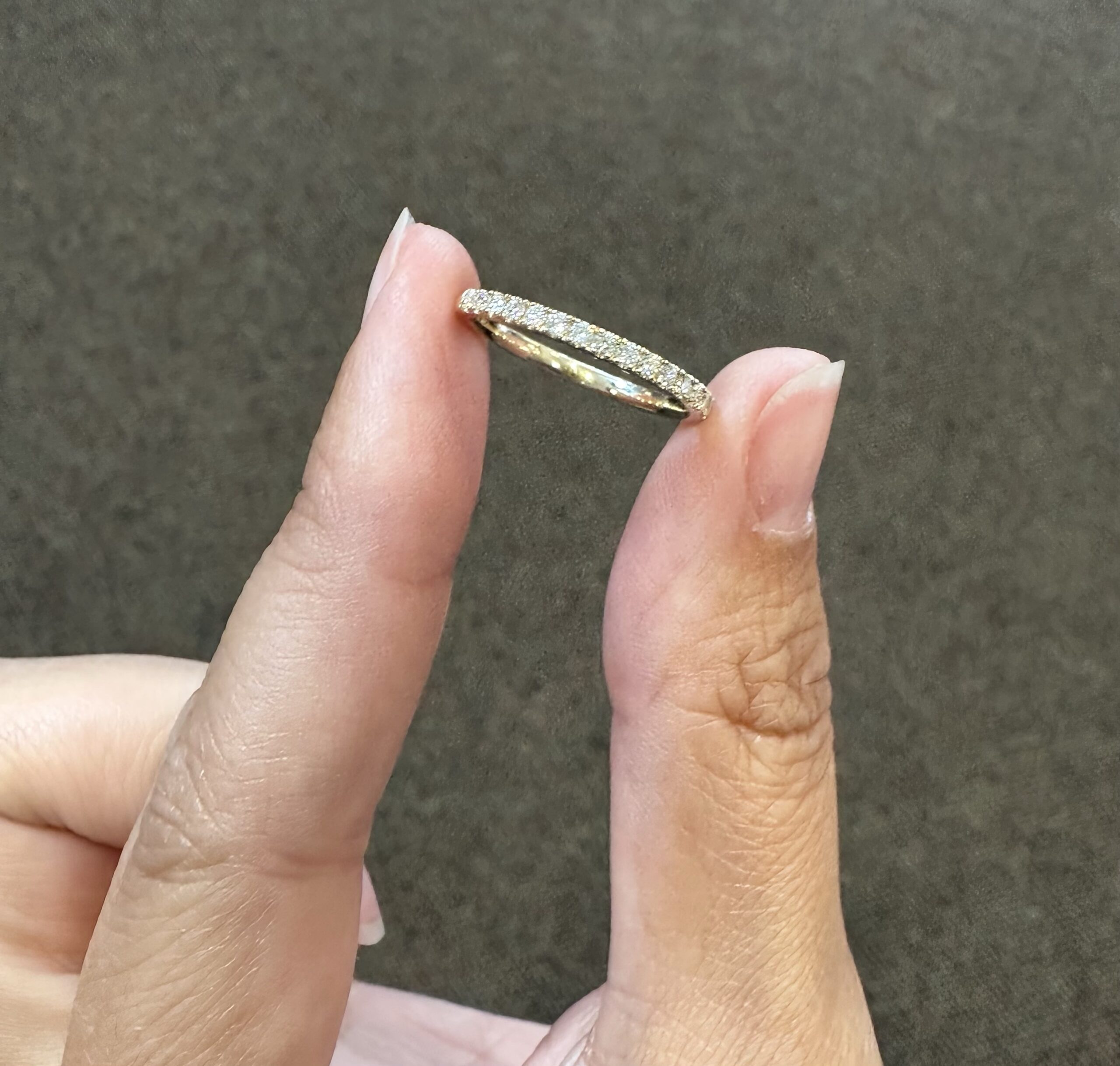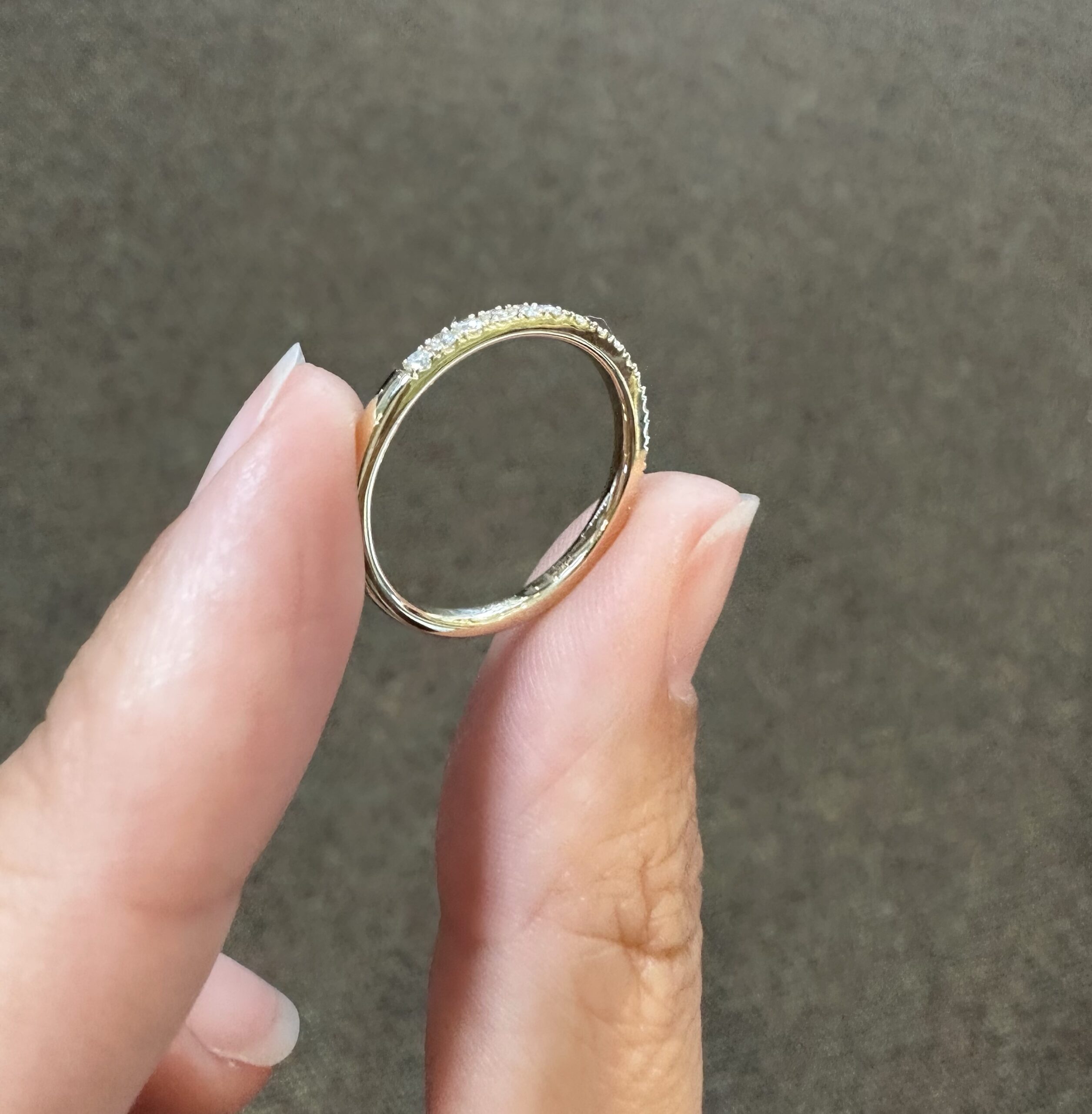 Our best-selling 14k yellow gold low-profile 17 stone genuine .25 cttw Round Brilliant Cut diamond band. These diamonds average F-G in color and VS2 in clarity. These diamonds are nicely proportioned and well finished. This ring is a finger size 6, but it can be reasonably sized. Please make note of the finger size in the comments section at checkout. This ring has an entire weight of 1.8 grams.
