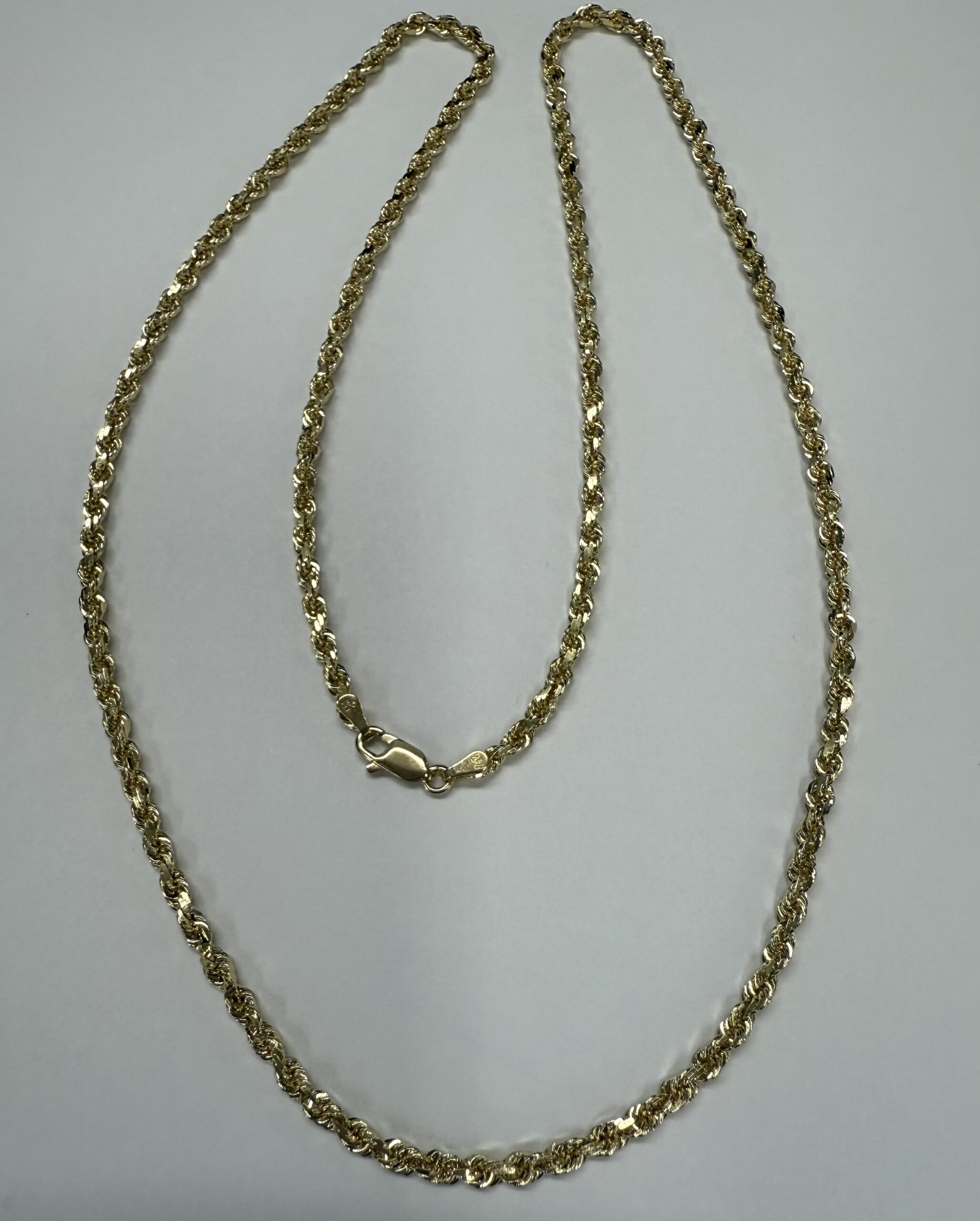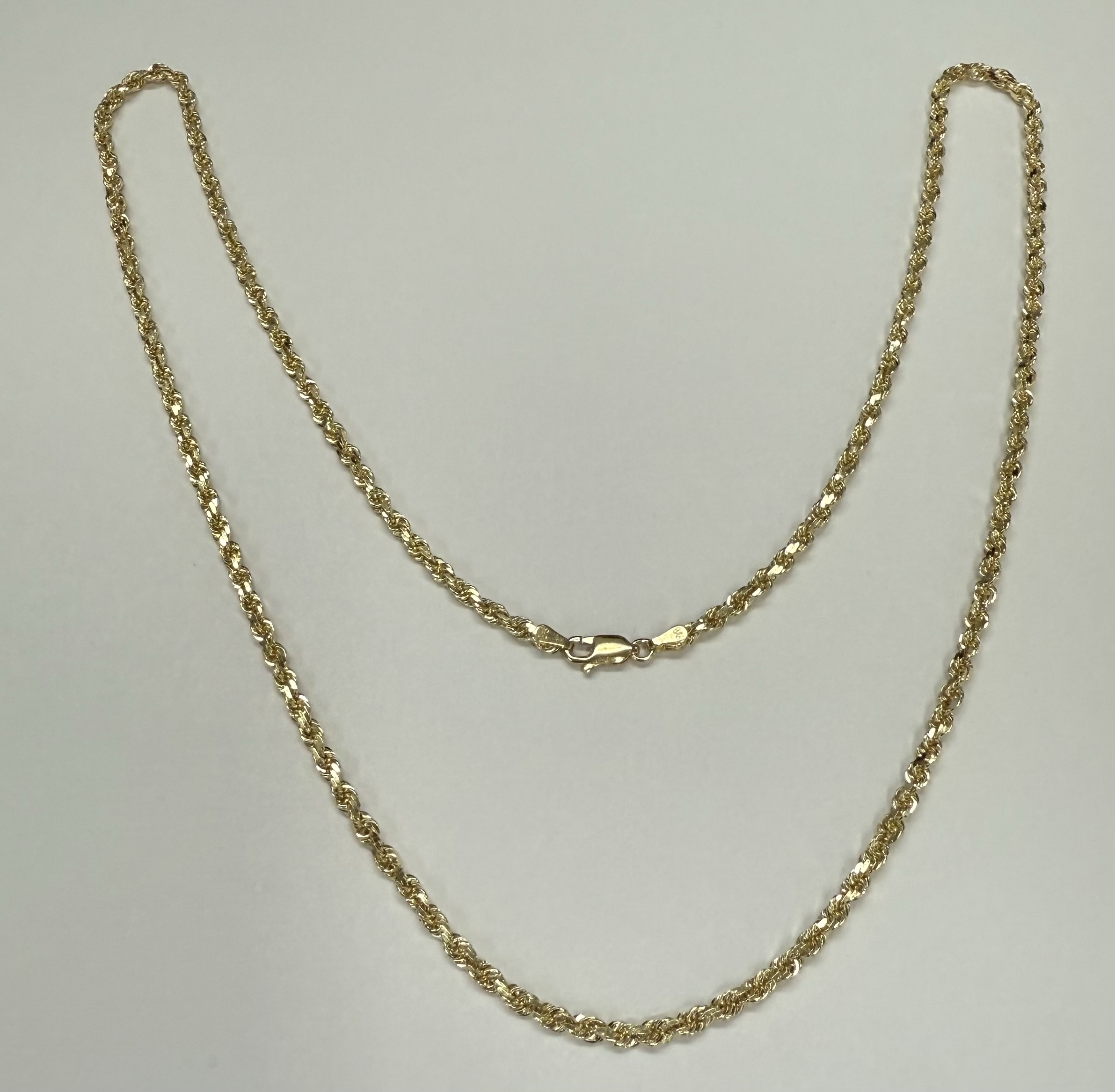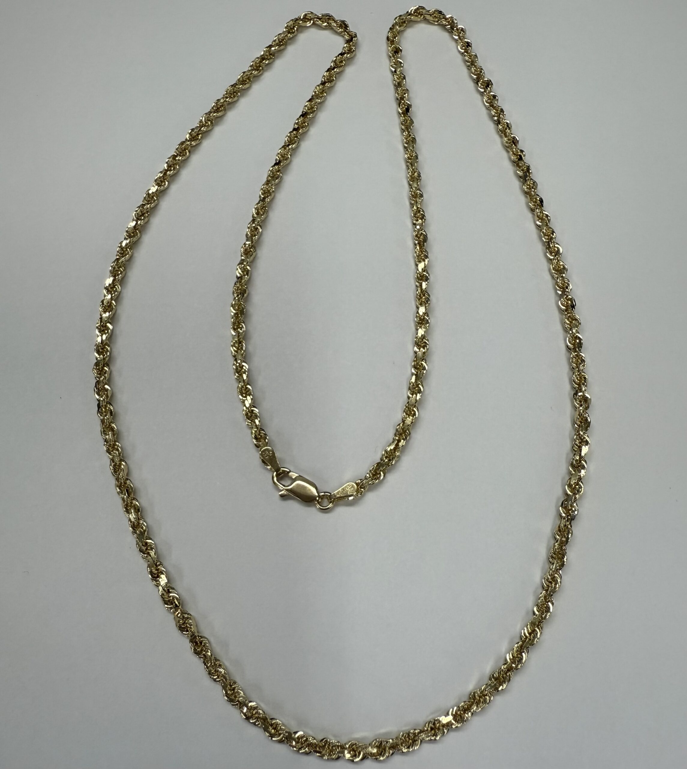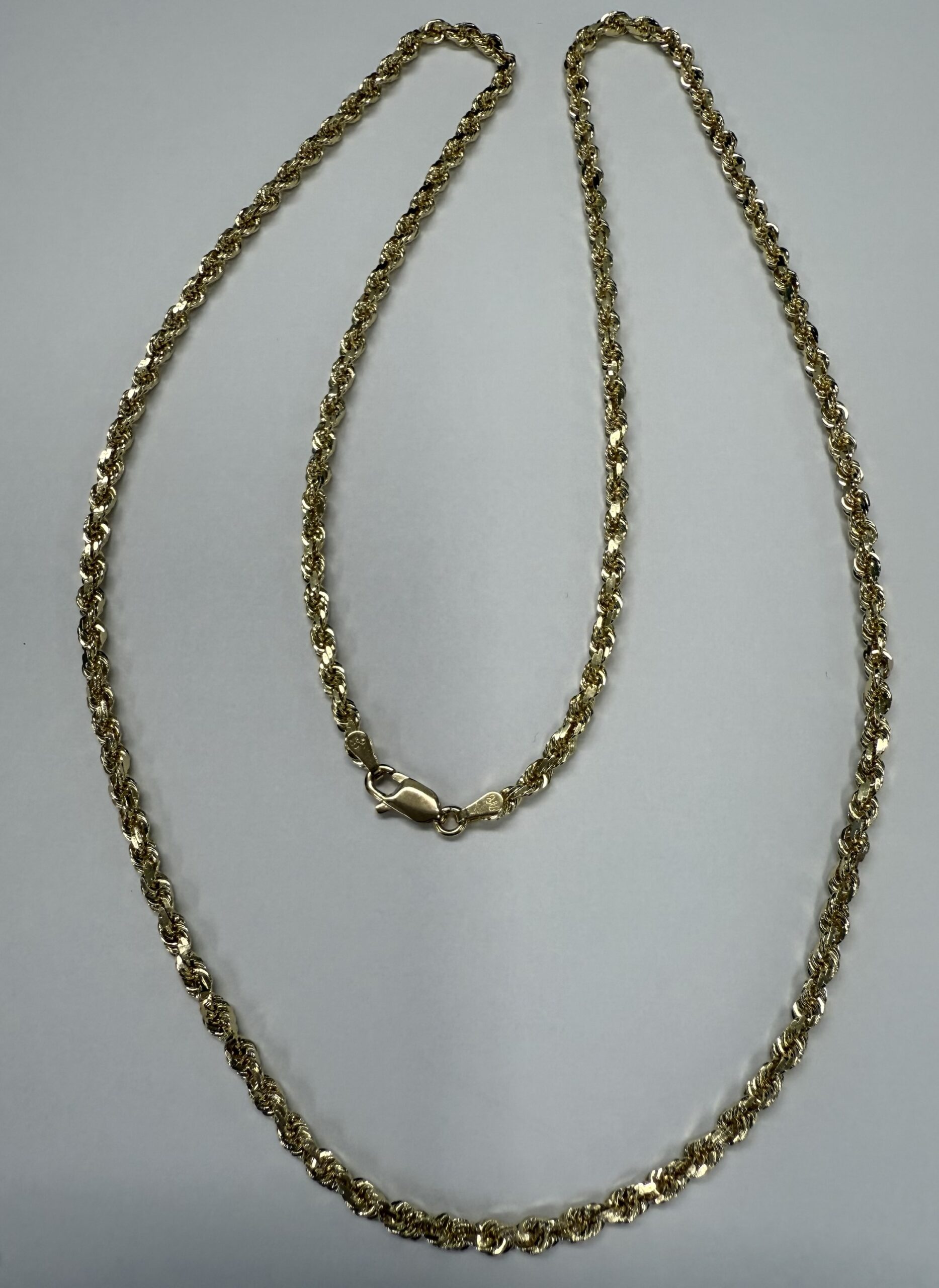 A 14k yellow gold 3 mm 24″ rope chain with a lobster claw clasp. This chain has an entire weight of 19.12 grams.