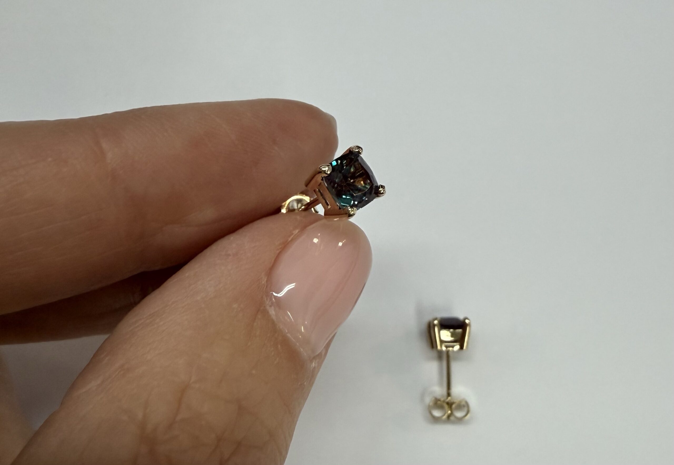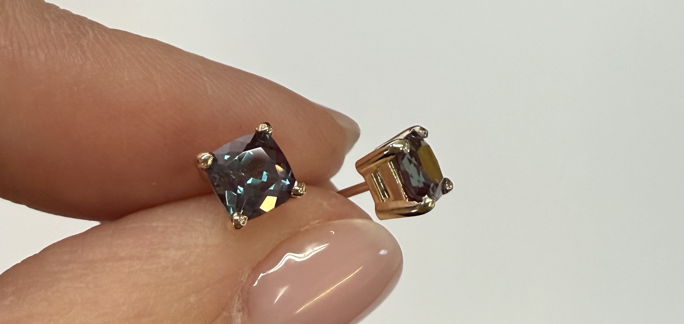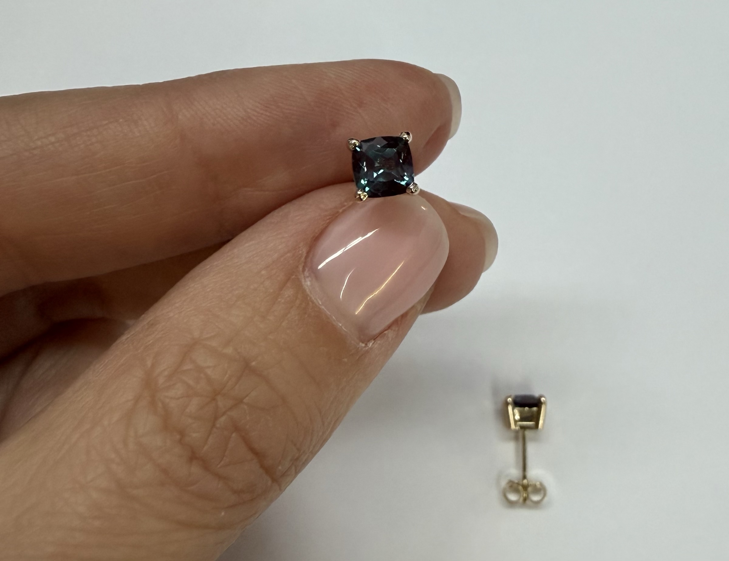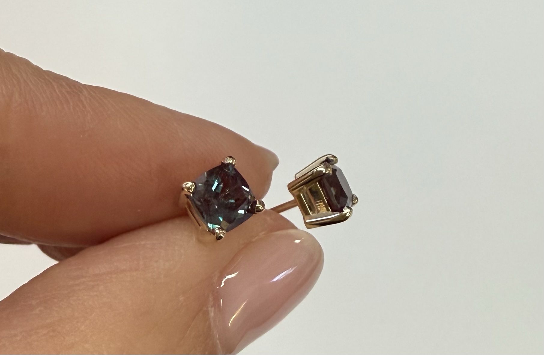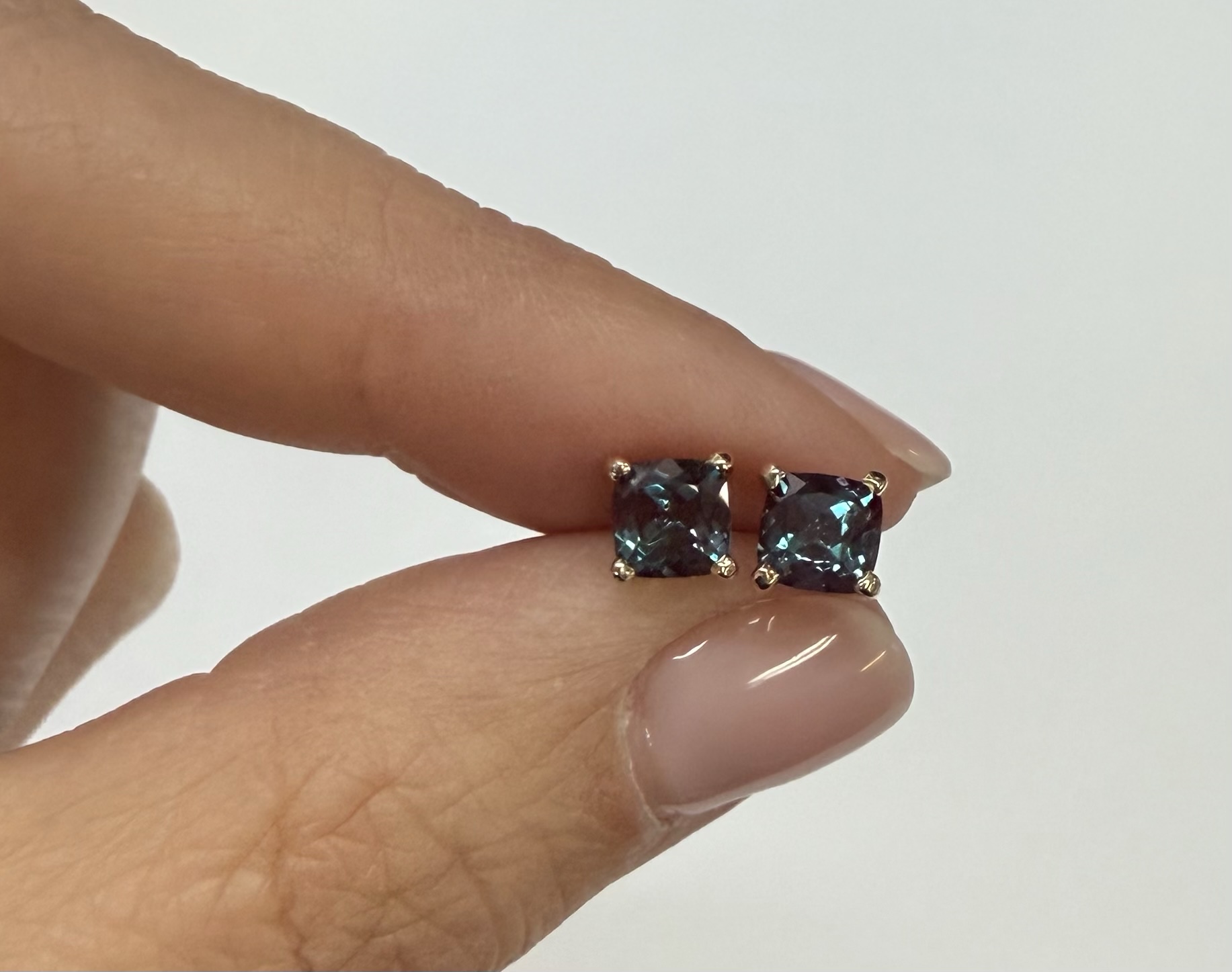 14k yellow gold cushion shaped 5.5 mm Lab Grown Alexandrite (June birthstone) basket set stud earrings. These earrings have an entire weight of 1.2 grams.