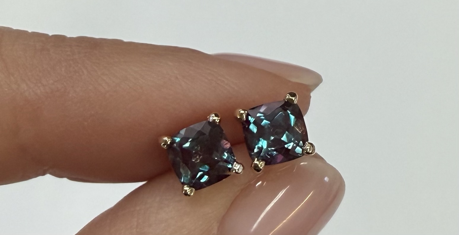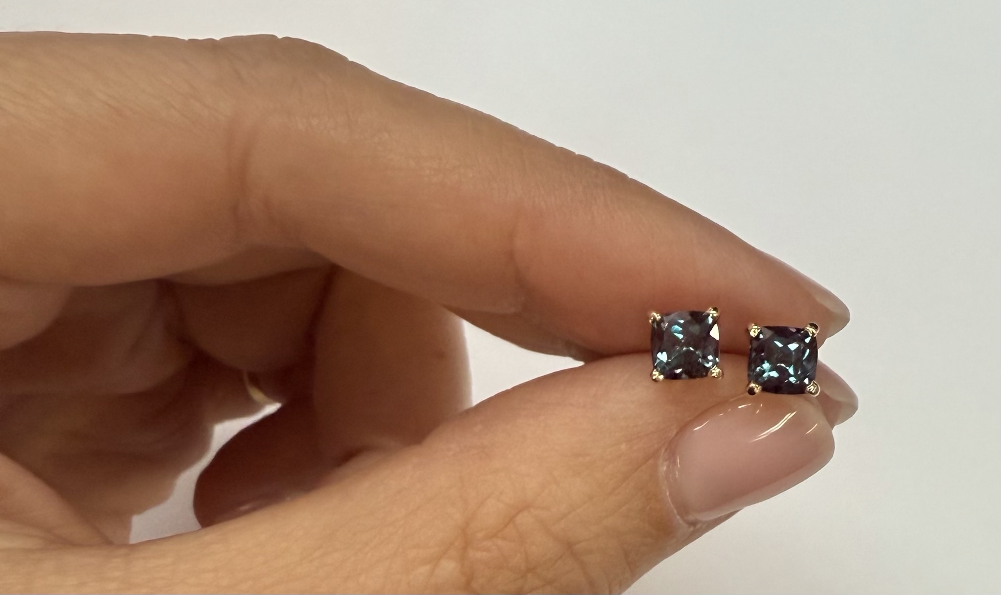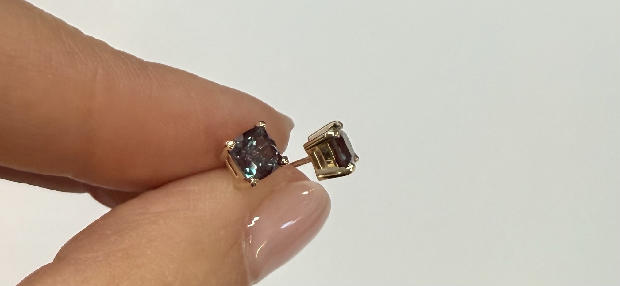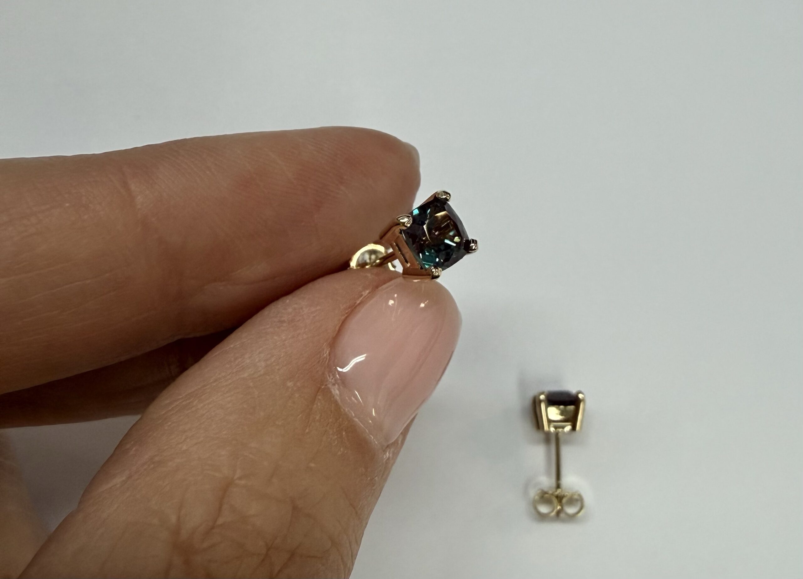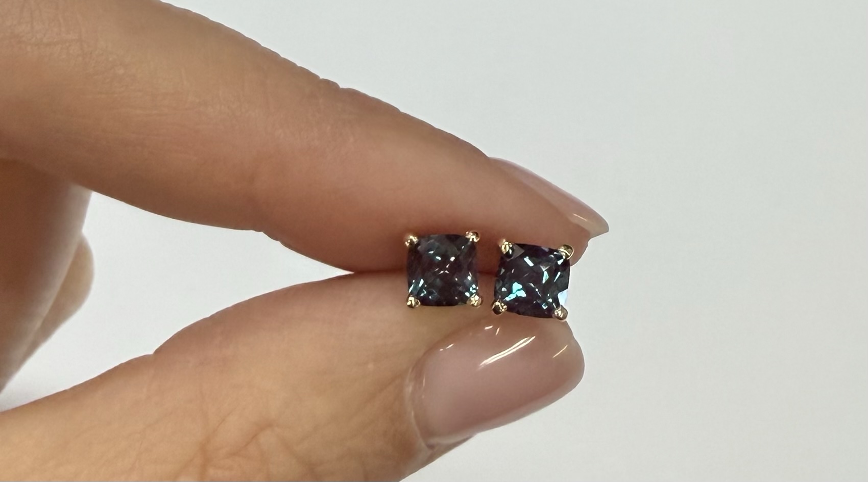 14k yellow gold cushion shaped 5.5 mm Lab Grown Alexandrite (June birthstone) basket set stud earrings. These earrings have an entire weight of 1.2 grams.
