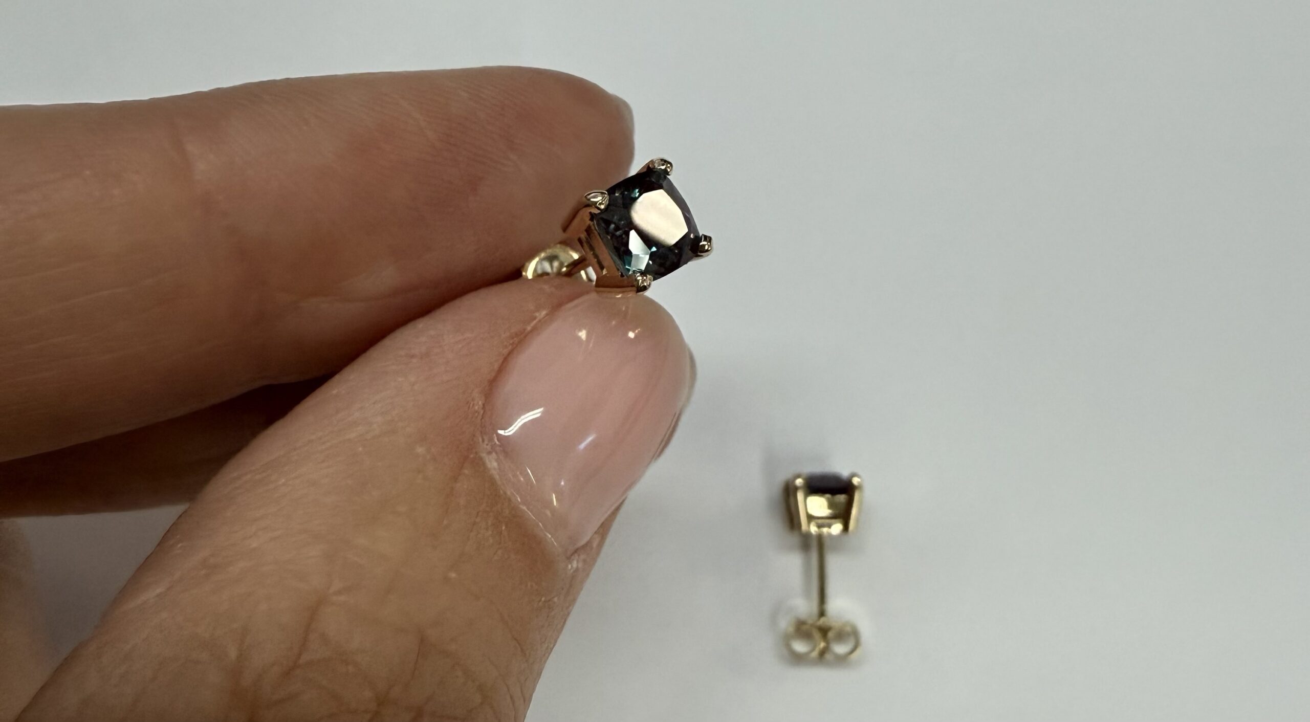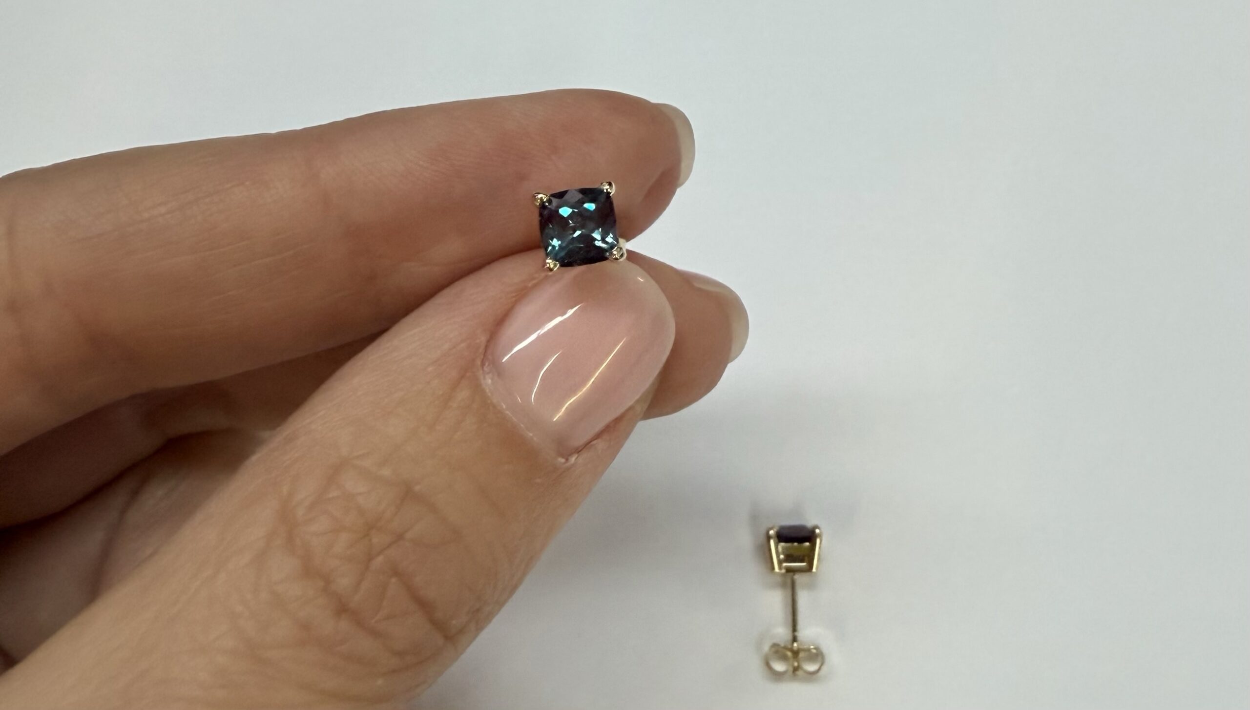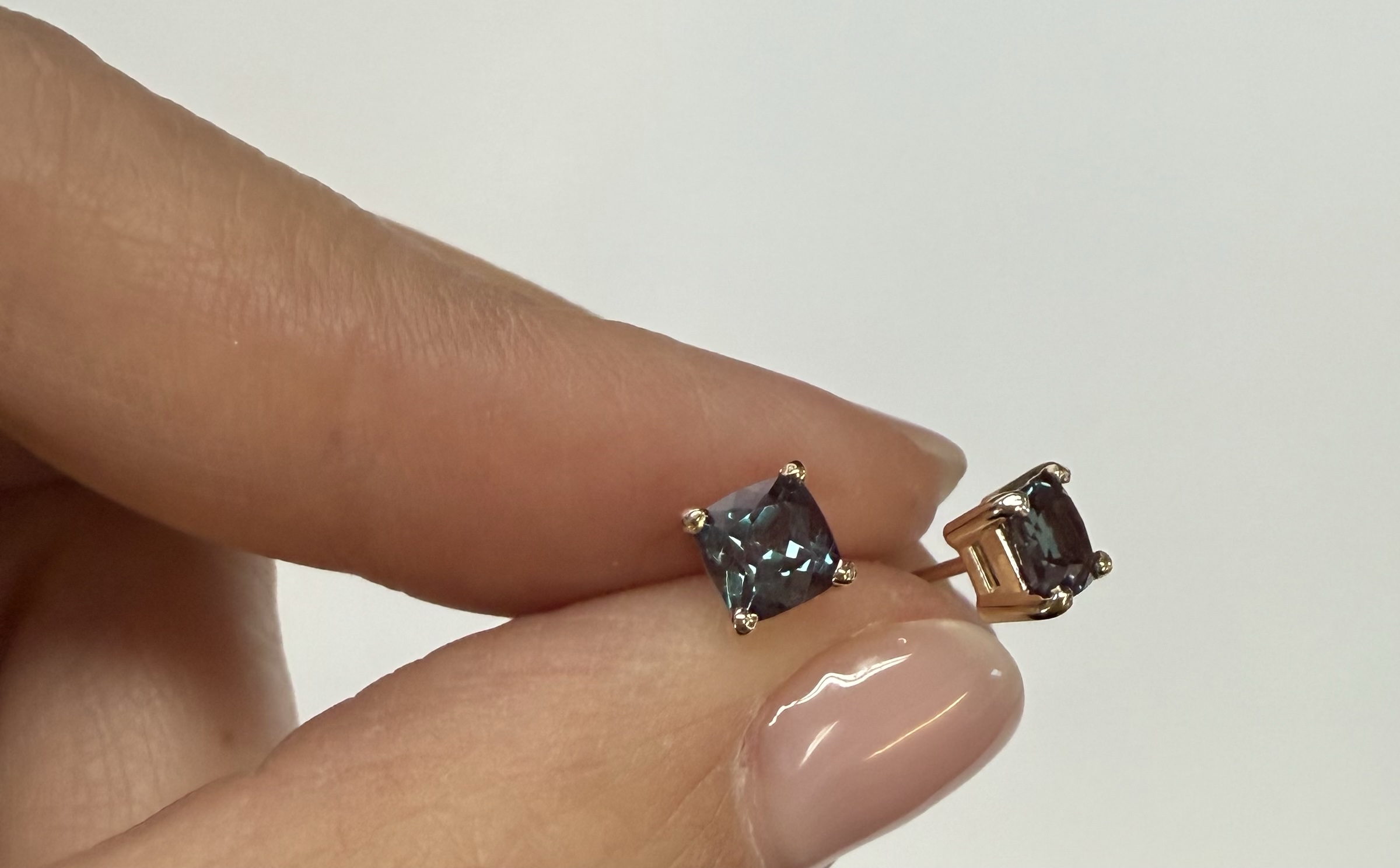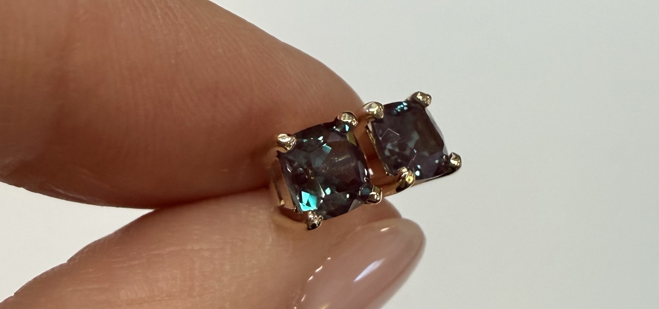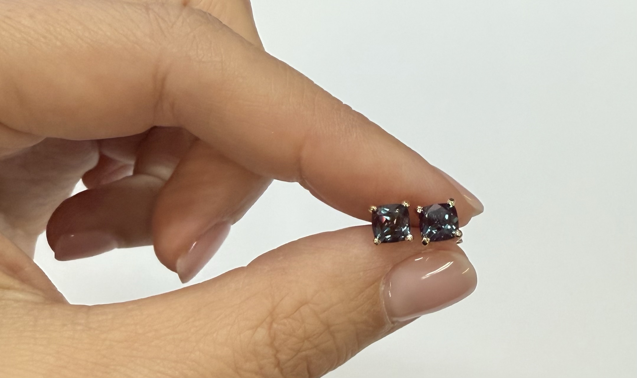 14k yellow gold cushion shaped 5.5 mm Lab Grown Alexandrite (June birthstone) basket set stud earrings. These earrings have an entire weight of 1.2 grams.