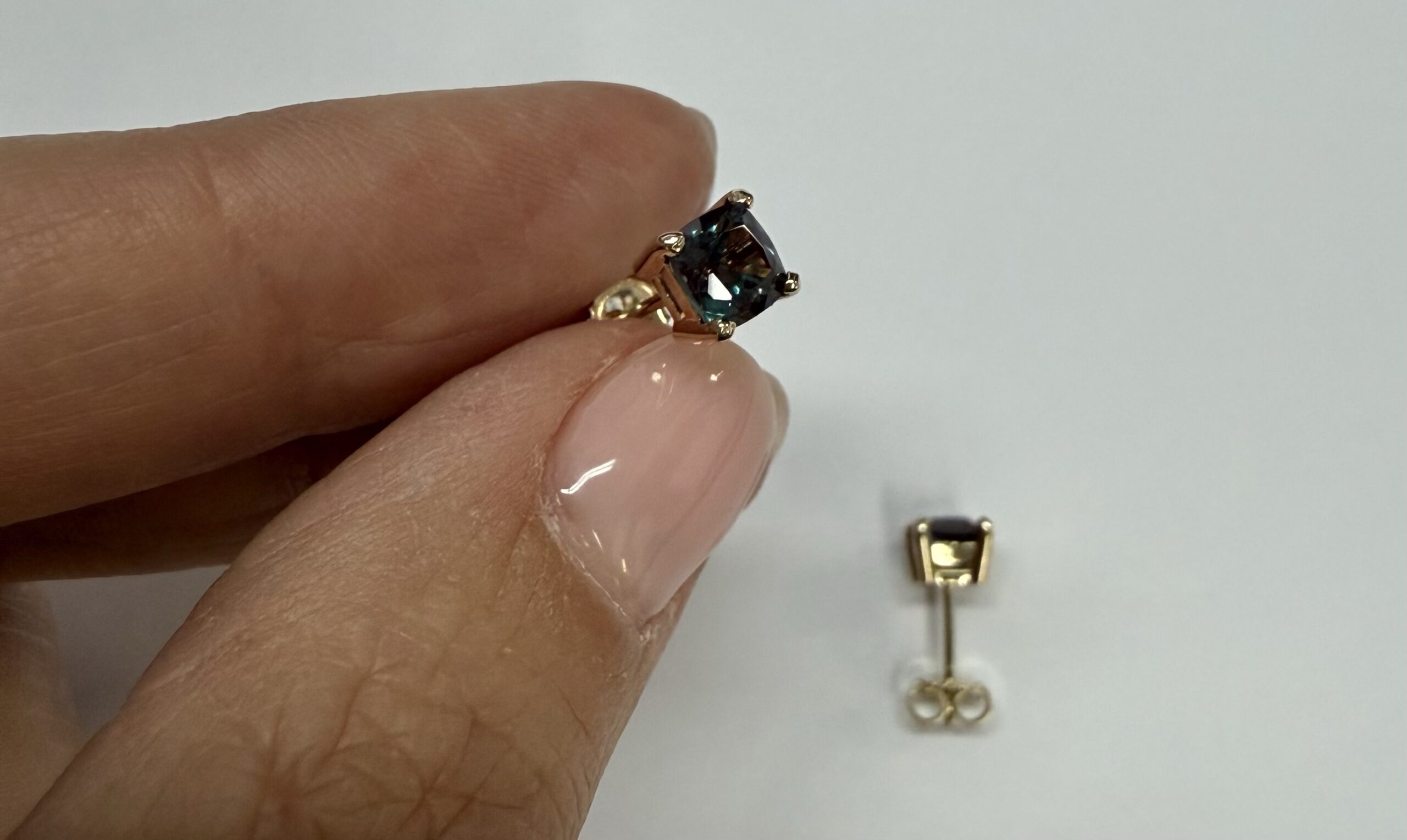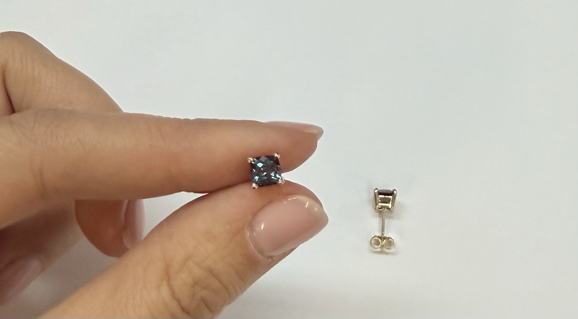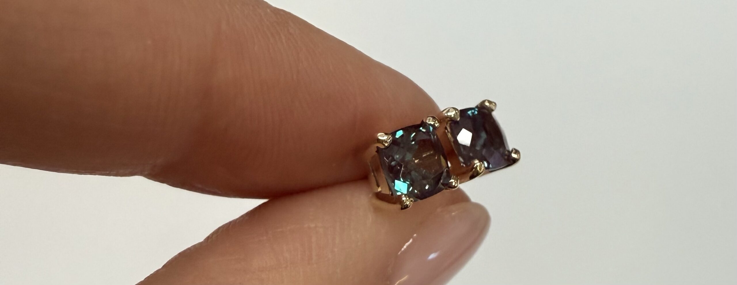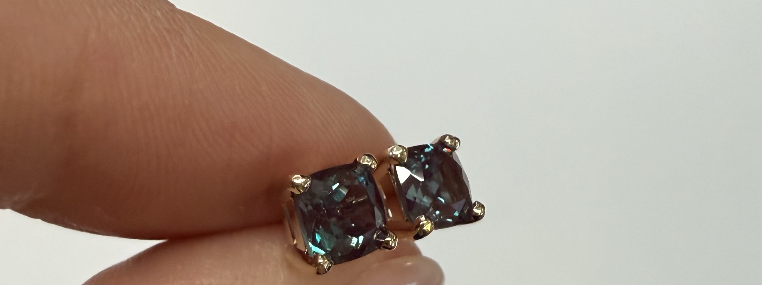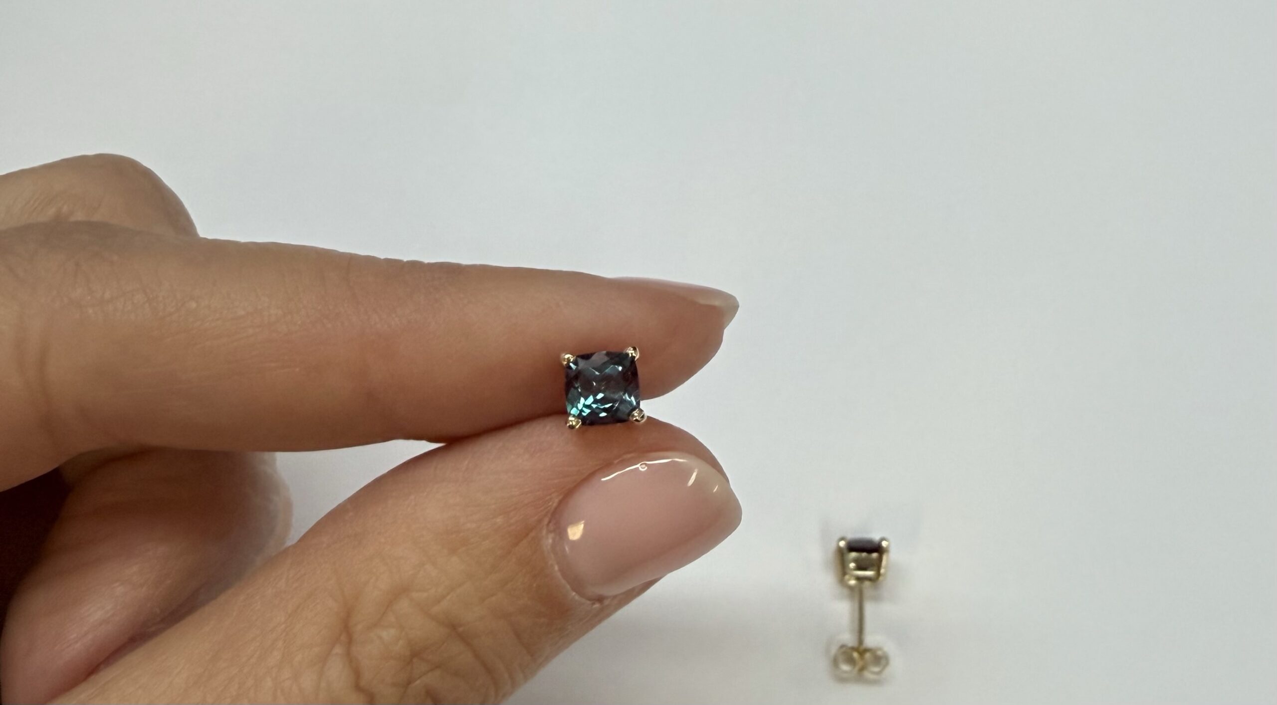 14k yellow gold cushion shaped 5.5 mm Lab Grown Alexandrite (June birthstone) basket set stud earrings. These earrings have an entire weight of 1.2 grams.