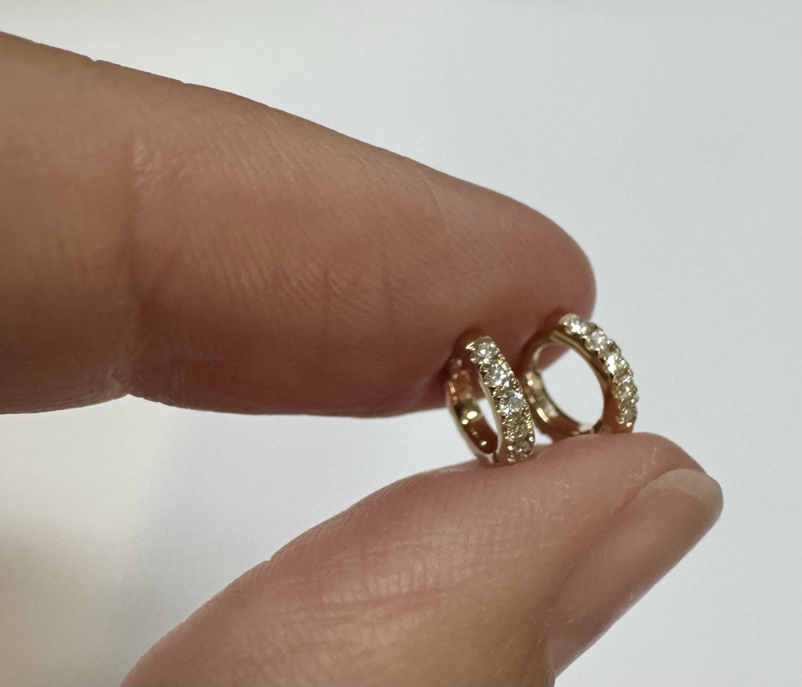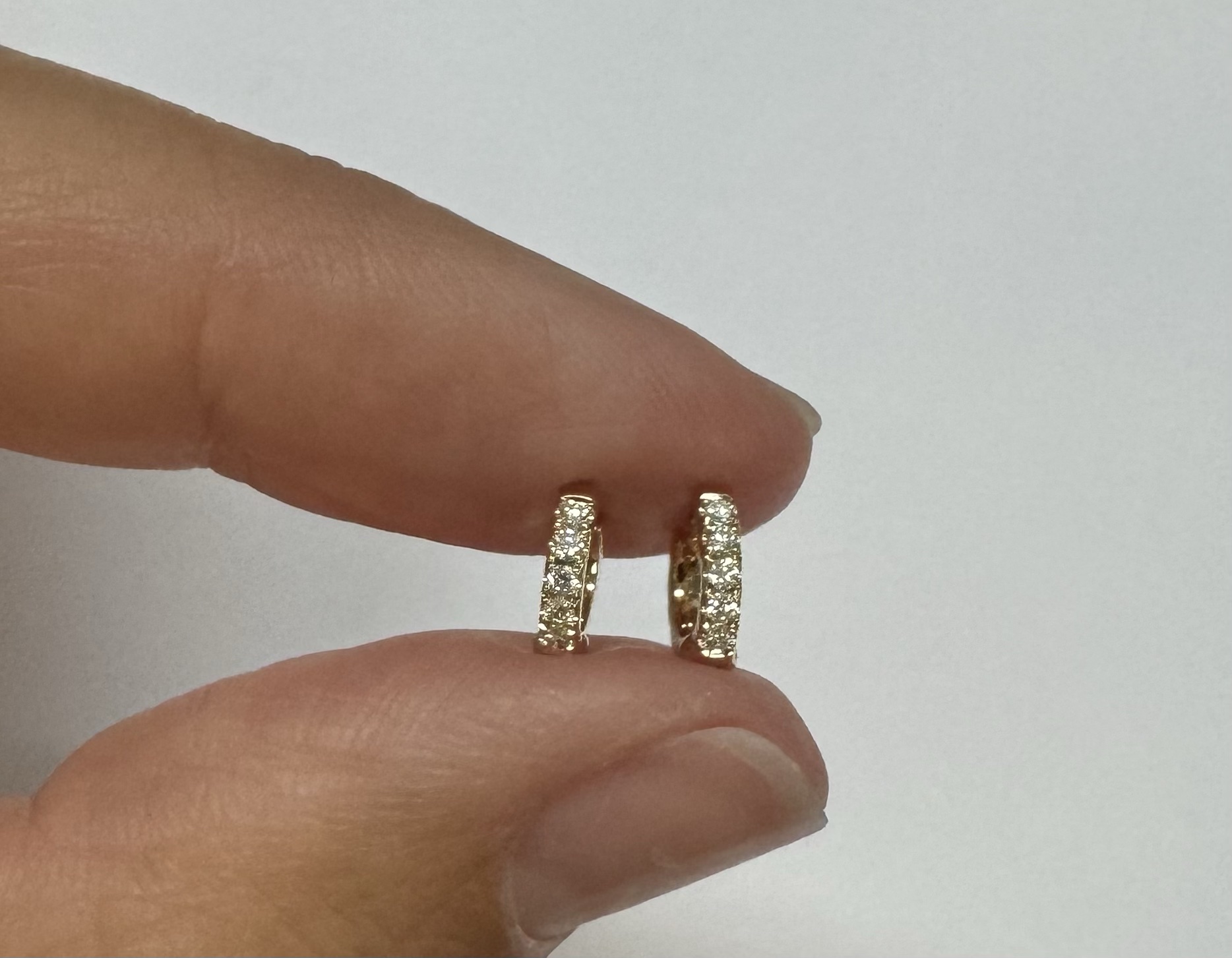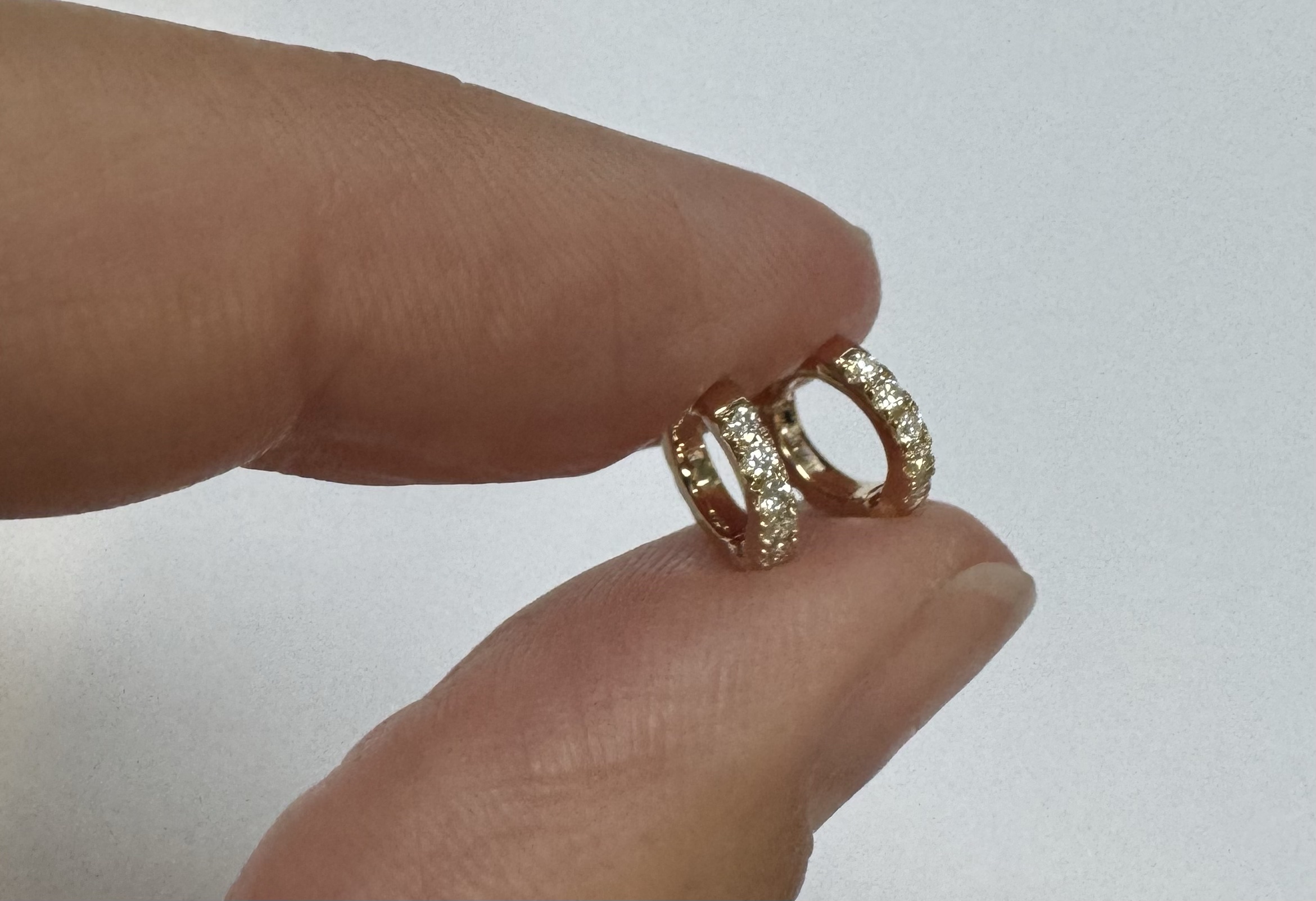 14k yellow gold 5 mm genuine .07 cttw Round Brilliant Cut diamond single hinged hoop earring. These diamonds average G-H in color and SI1 in clarity. This single hoop earring has an entire weight of 0.3 grams. Also available in 14k white gold. Note: photos show a pair, which is available for $500. If you’d like to purchase a pair please contact us directly.