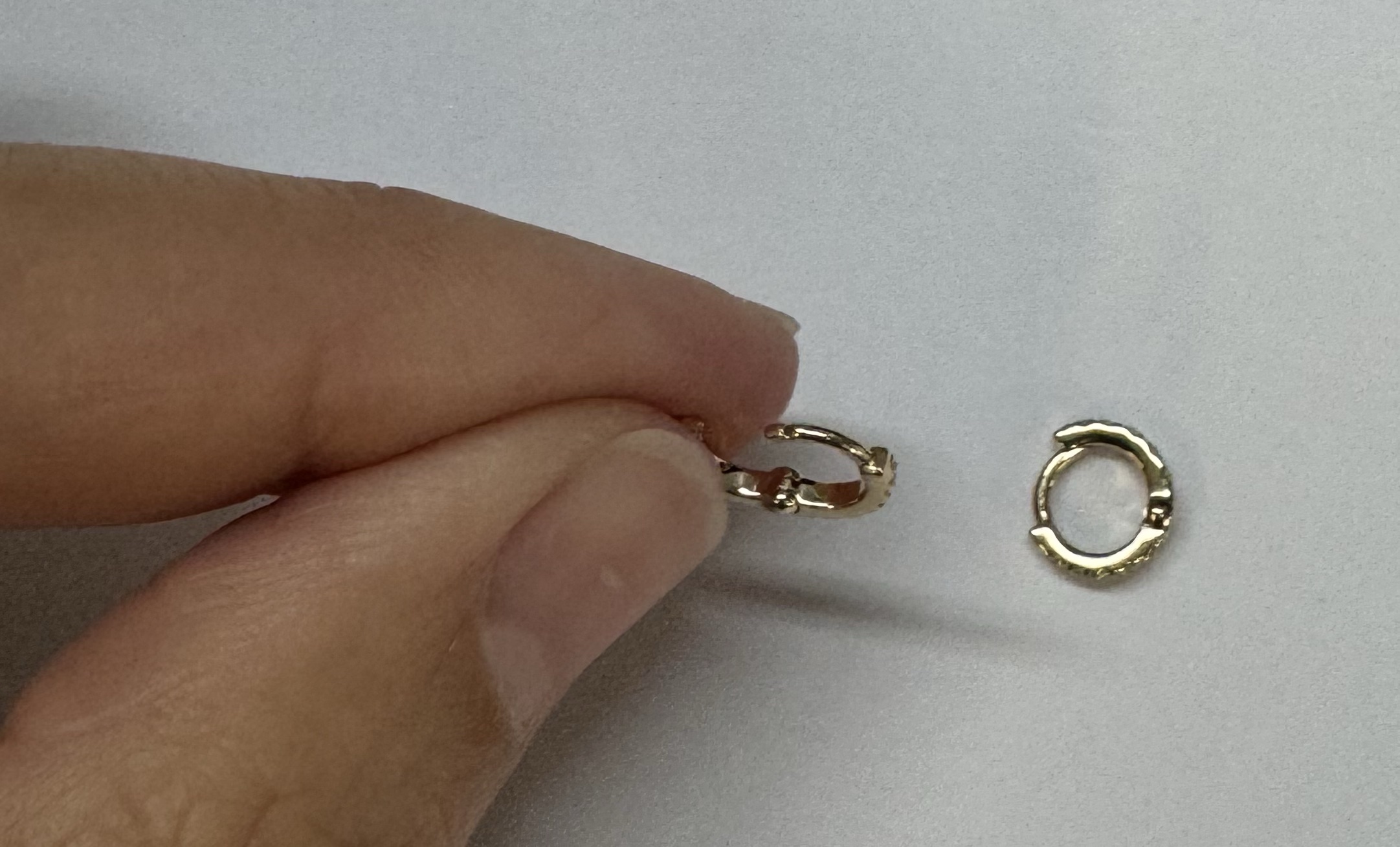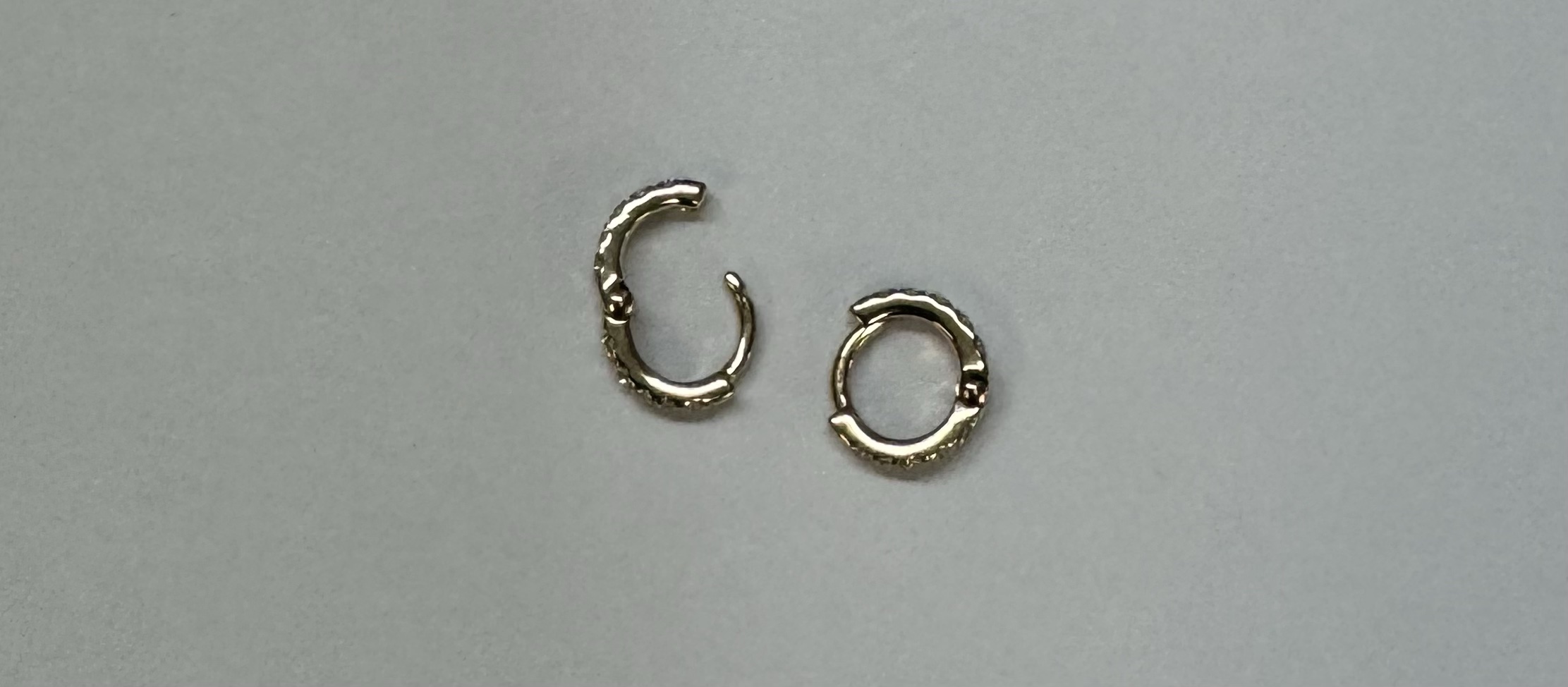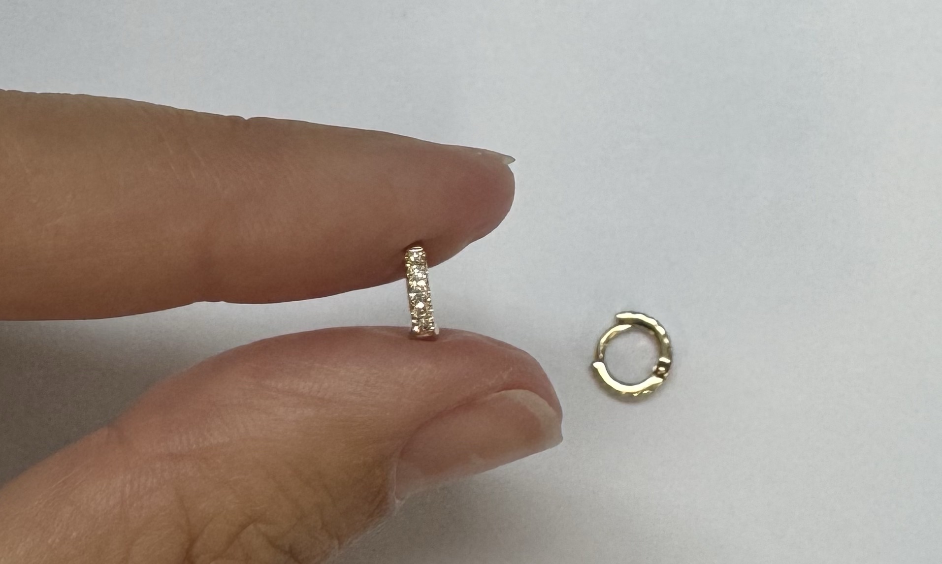 14k yellow gold 5 mm genuine .07 cttw Round Brilliant Cut diamond single hinged hoop earring. These diamonds average G-H in color and SI1 in clarity. This single hoop earring has an entire weight of 0.3 grams. Also available in 14k white gold. Note: photos show a pair, which is available for $500. If you’d like to purchase a pair please contact us directly.