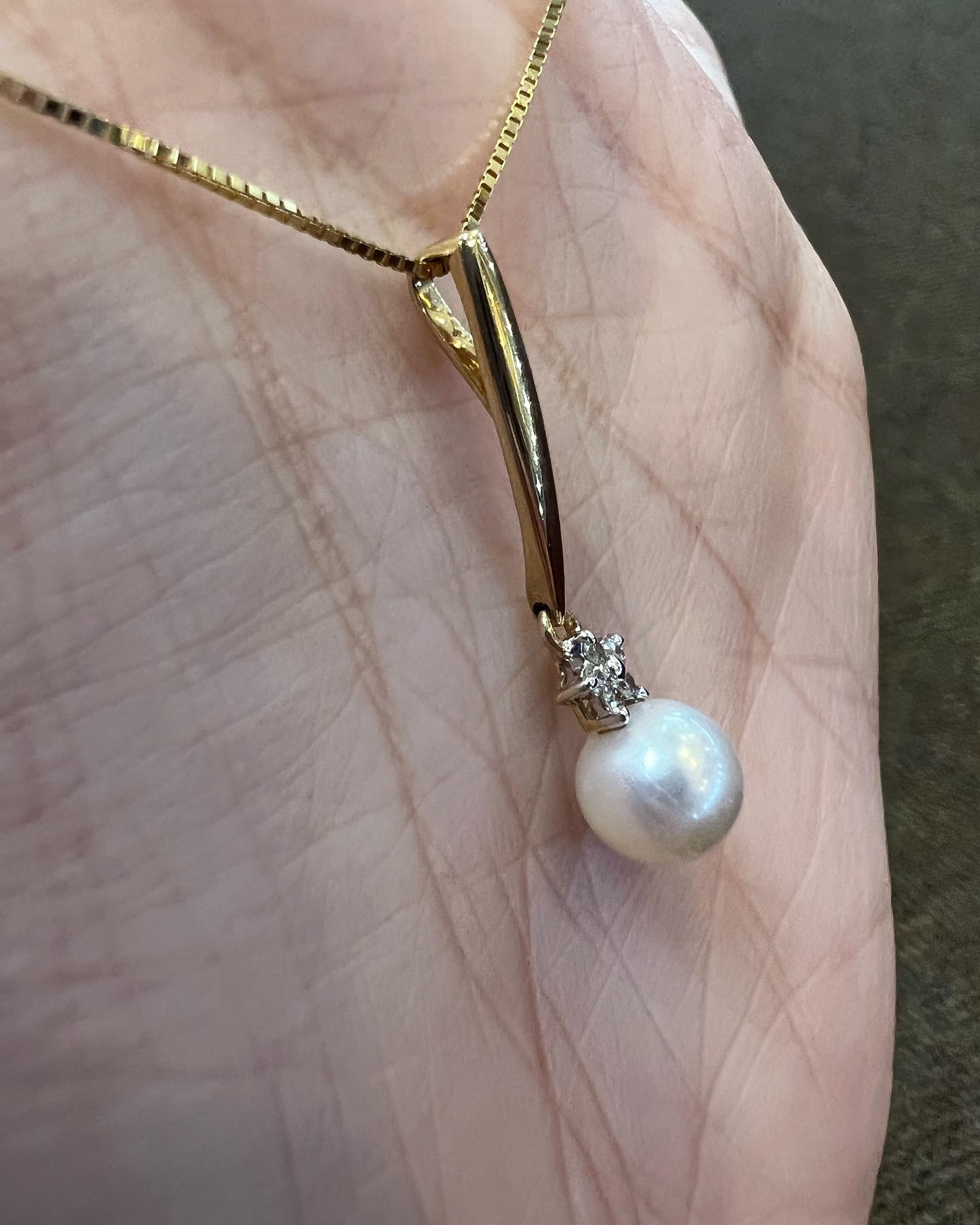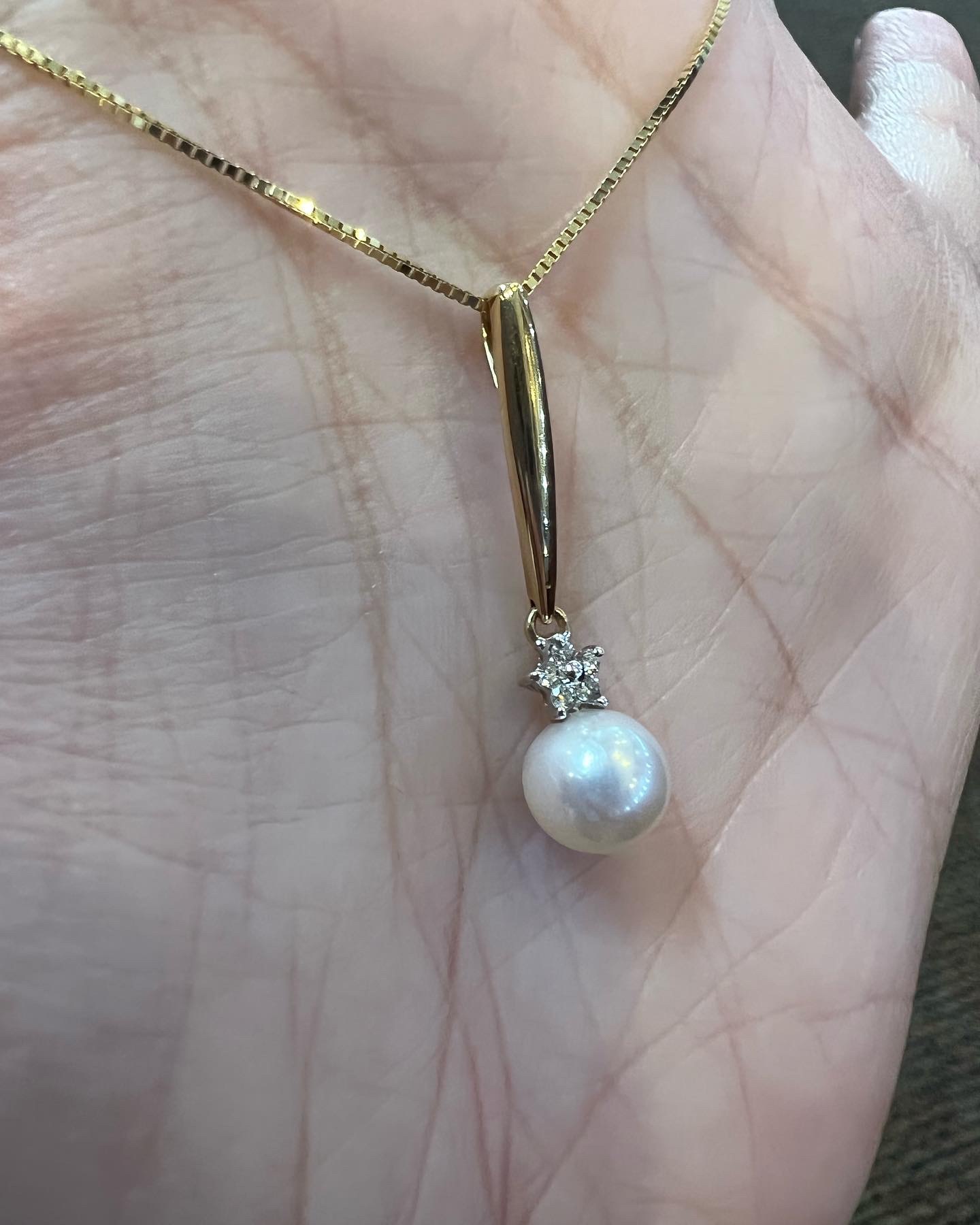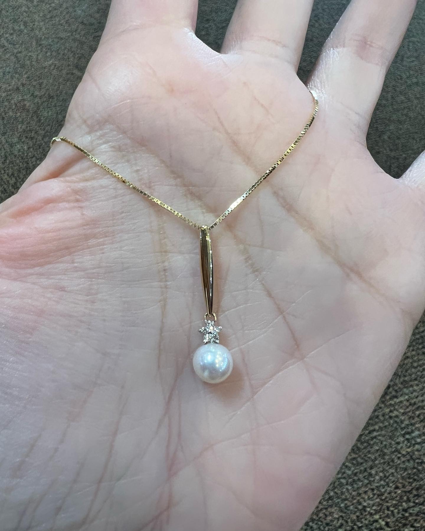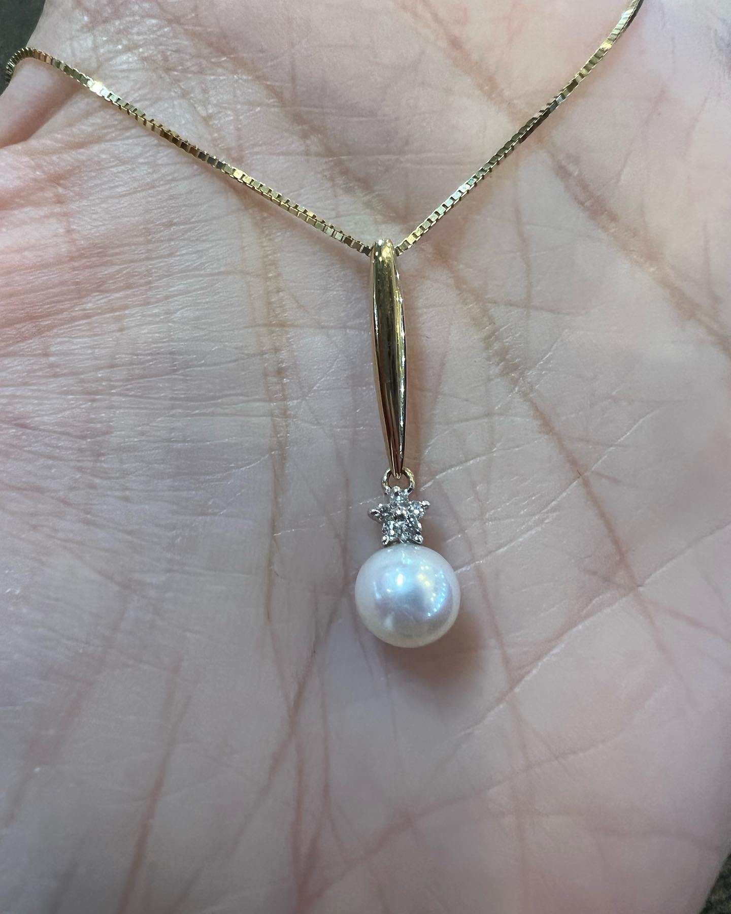 This vintage one is just so sweet & such a steal! 14k yellow gold 6.5 mm cultured saltwater pearl & .03 cttw genuine Round Brilliant Cut diamond dangle pendant, of a star motif, adjustable at 1″ and 18″.