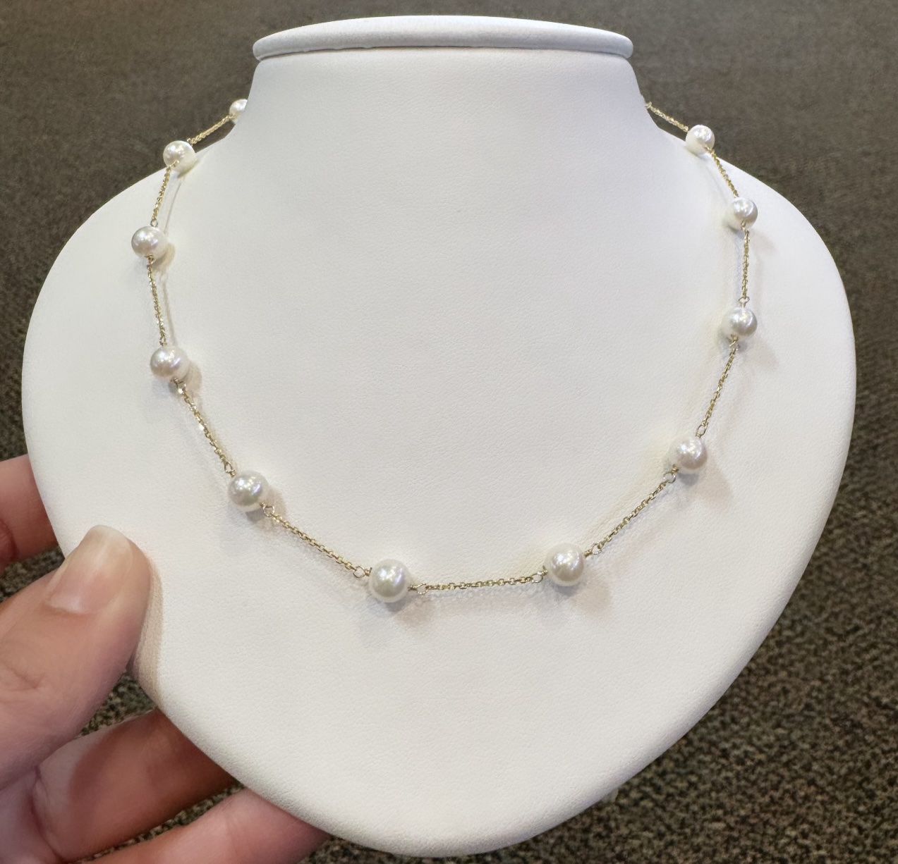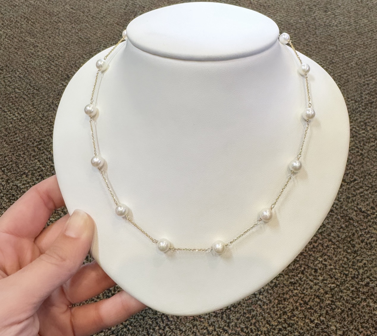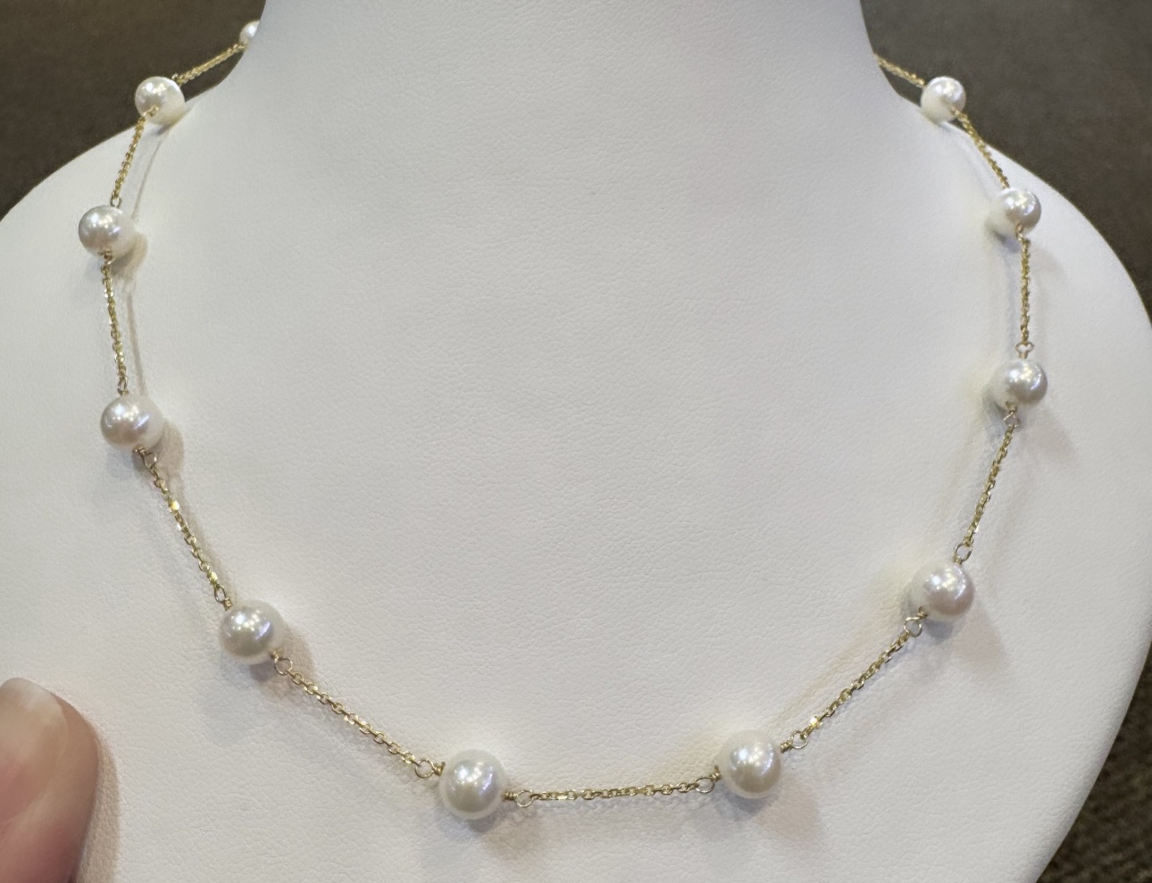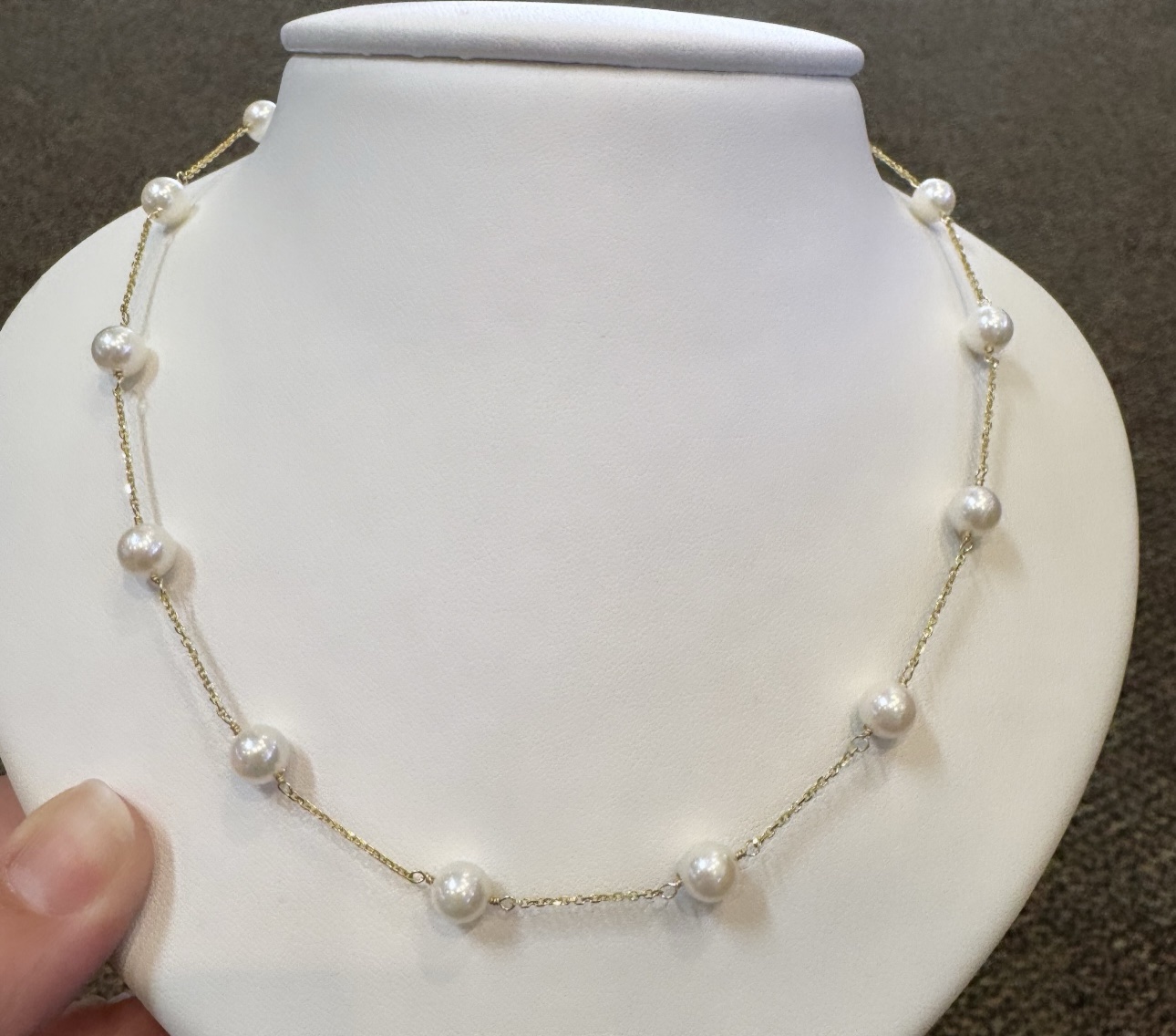 14k yellow gold cultured 6-6.4 mm Akoya pearl “Tin Cup” 14 bead necklace, adjustable 16-18″. This necklace has an entire weight of 6.66 grams.