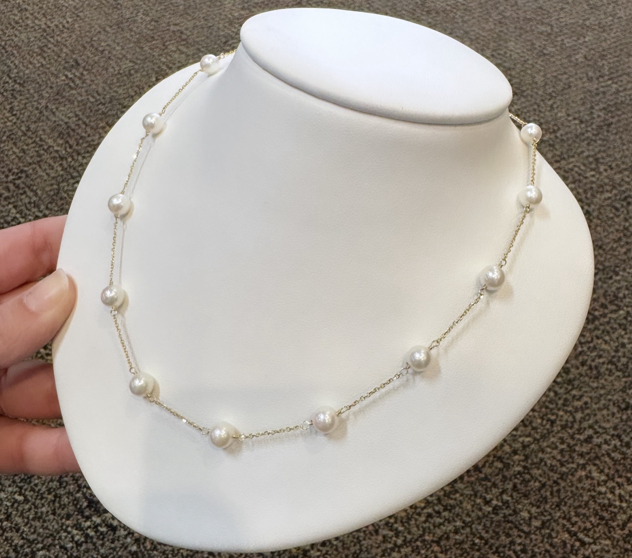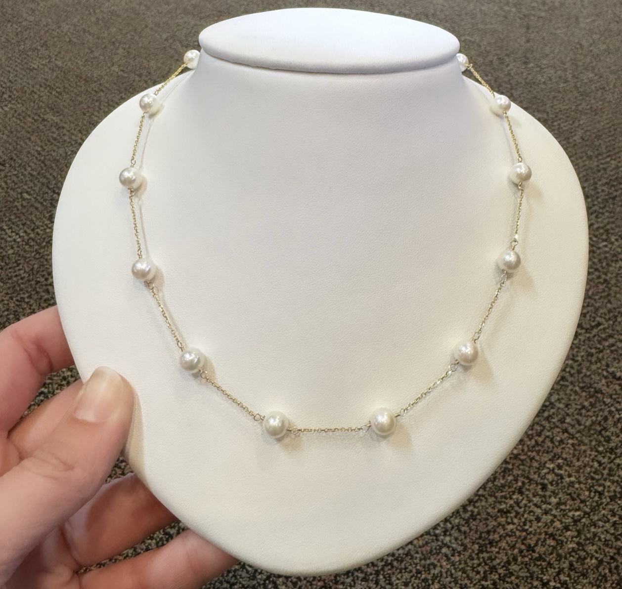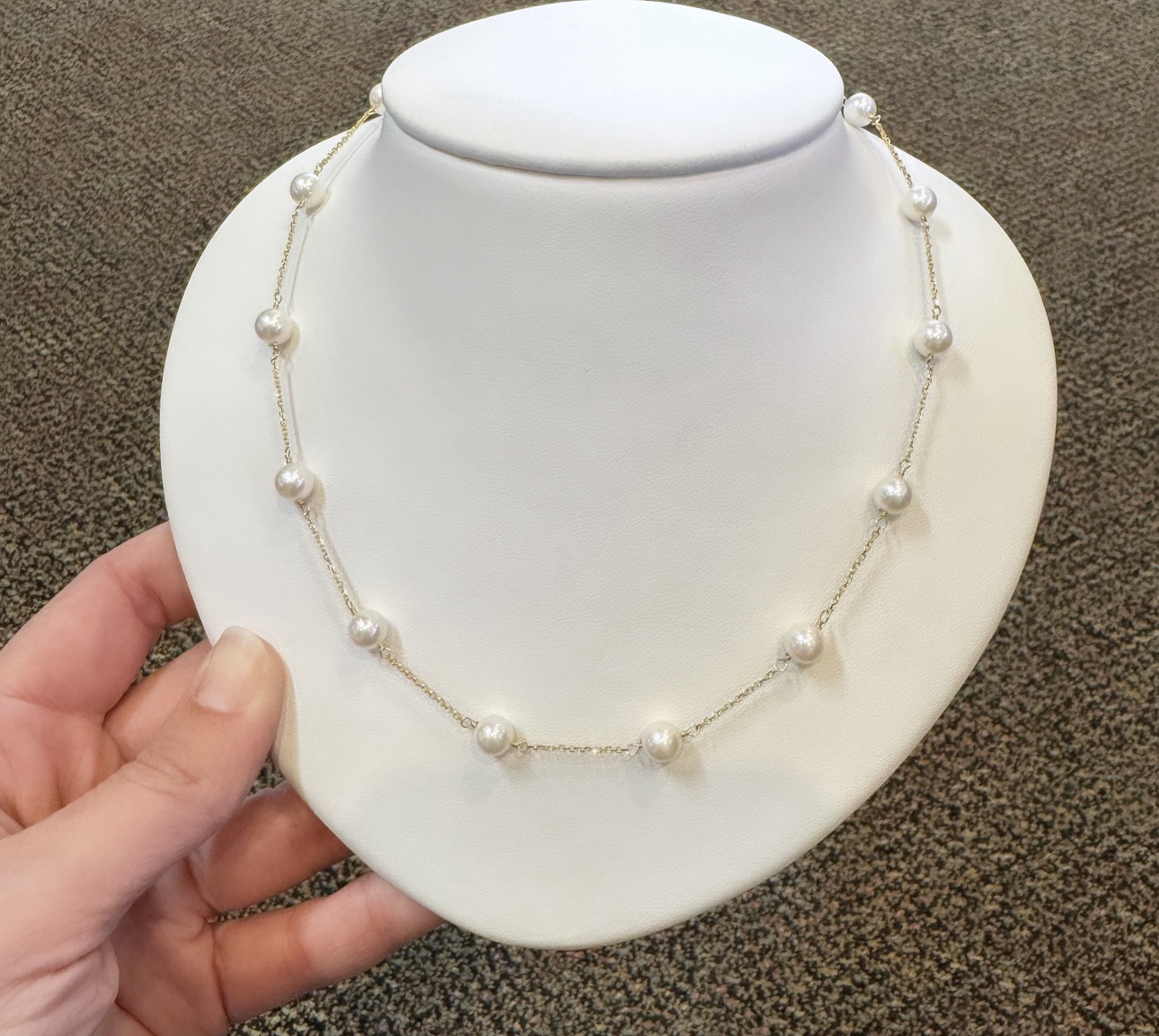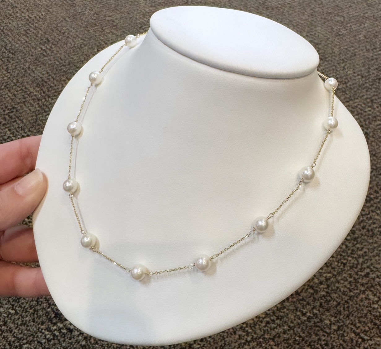 14k yellow gold cultured 6-6.4 mm Akoya pearl “Tin Cup” 14 bead necklace, adjustable 16-18″. This necklace has an entire weight of 6.66 grams.