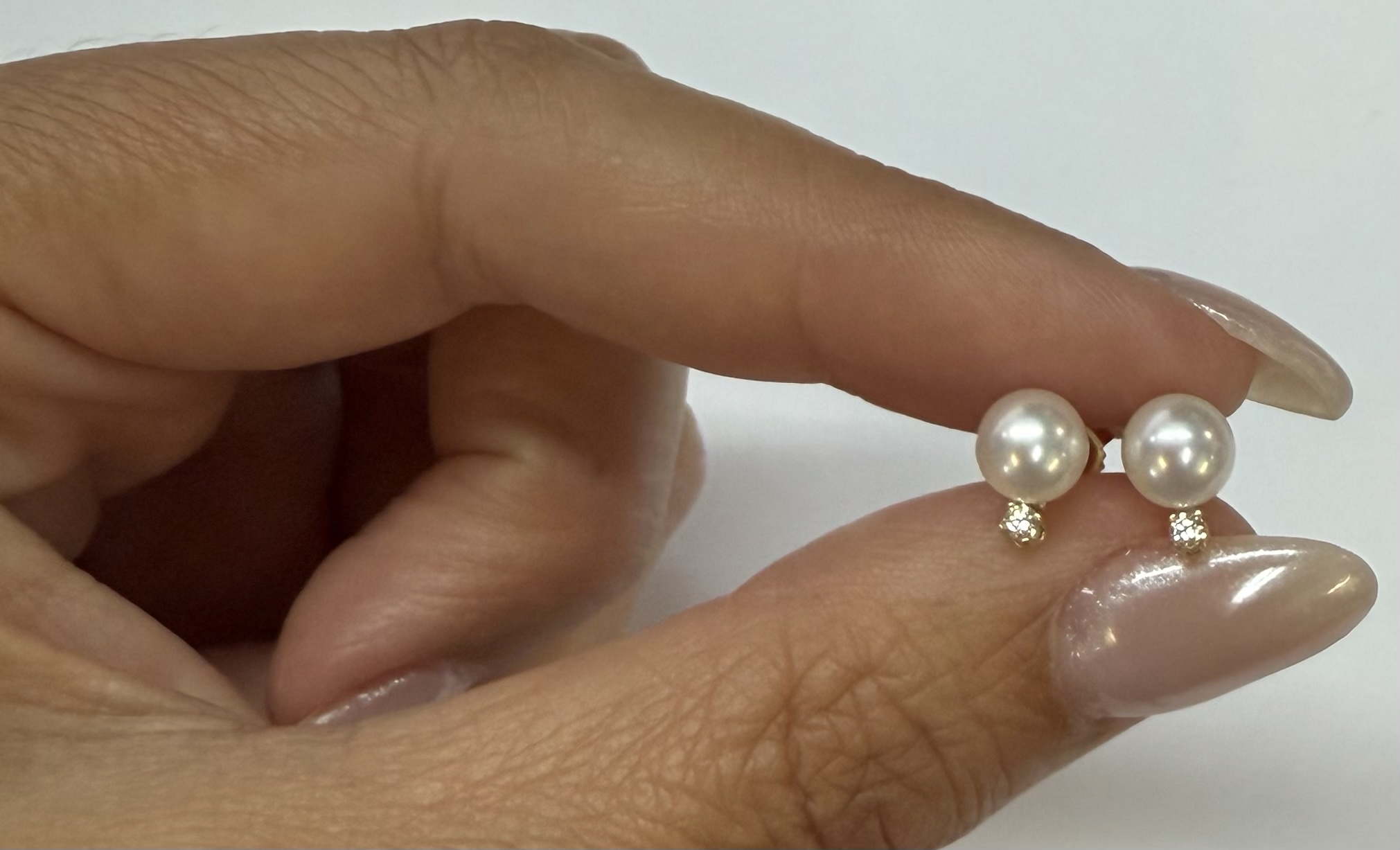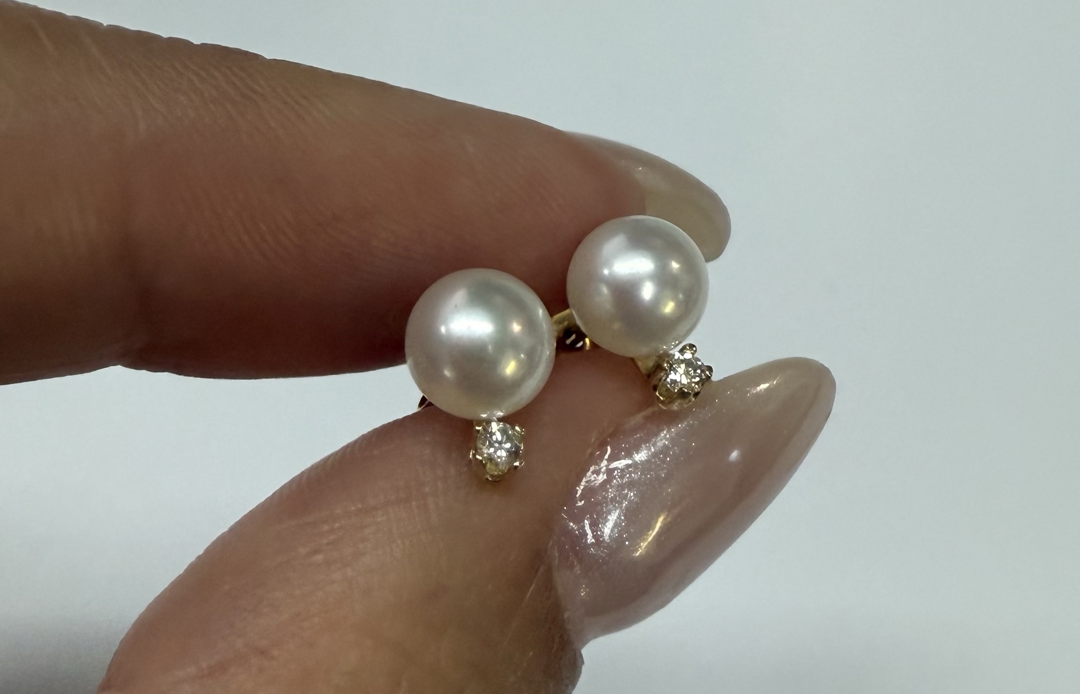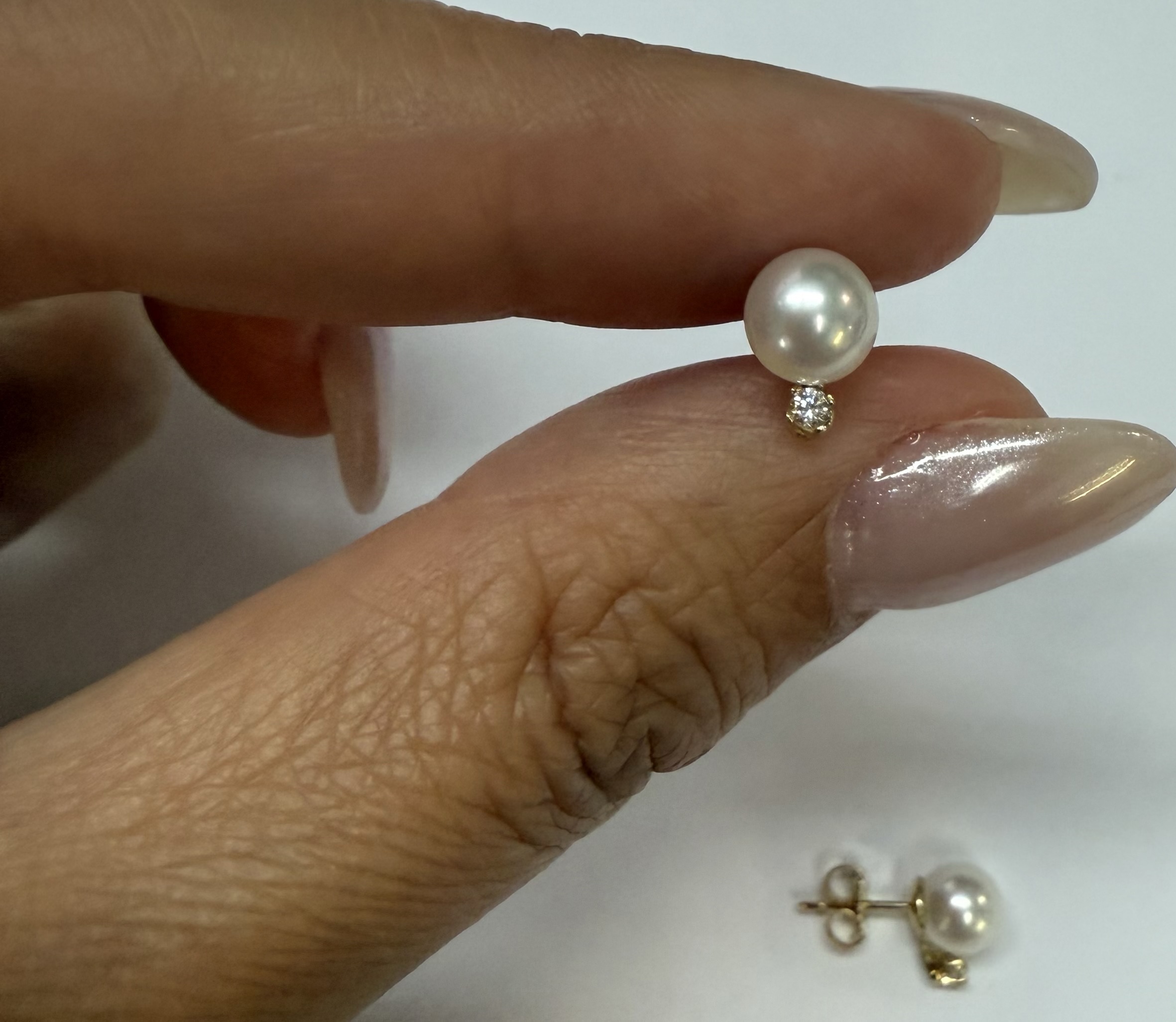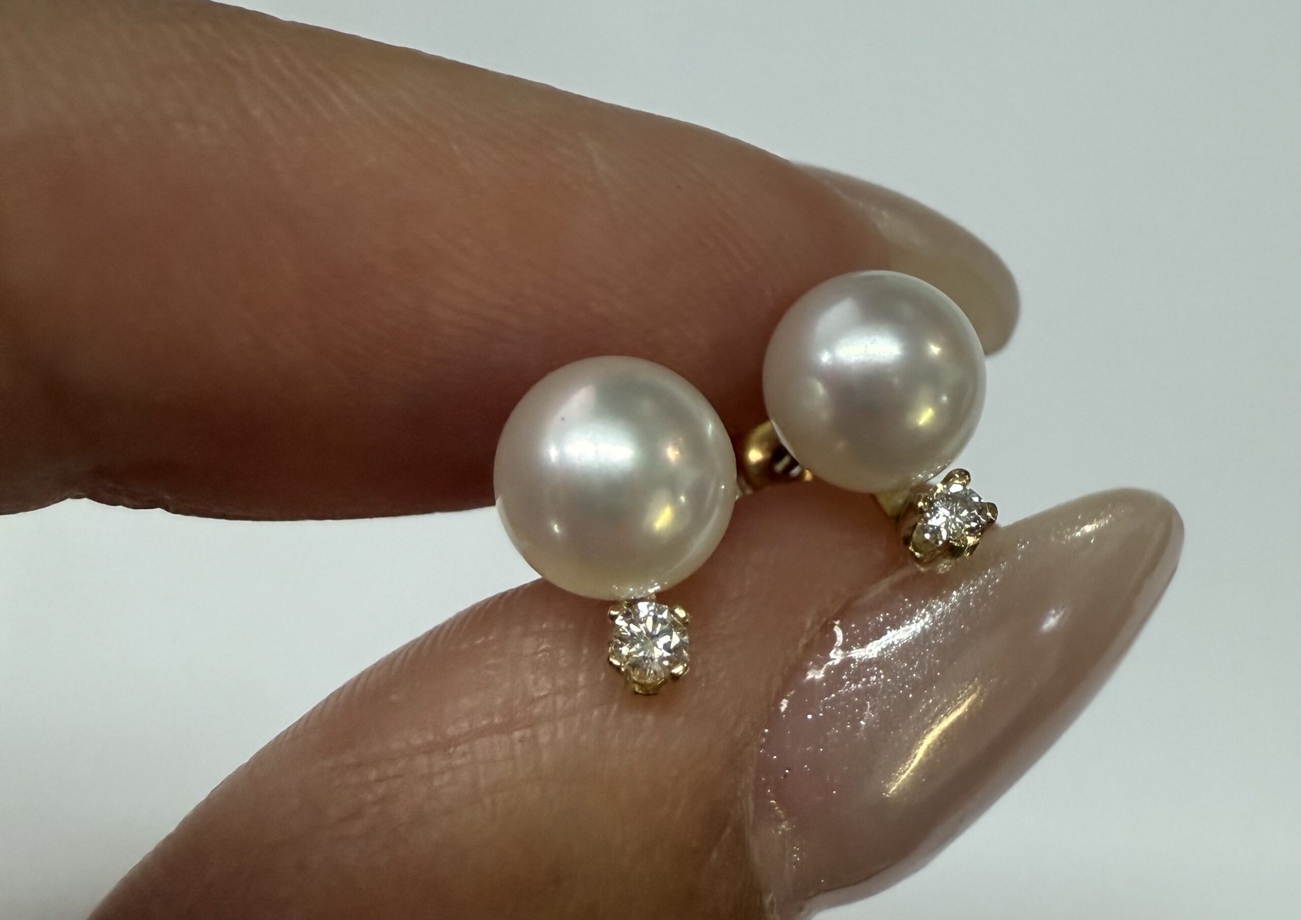 14k yellow gold 6 mm cultured saltwater pearl and genuine .06 cttw Round Brilliant Cut diamond stud earrings. These diamonds average G in color and SI1 in clarity. These earrings have an entire weight of 1.1 grams.