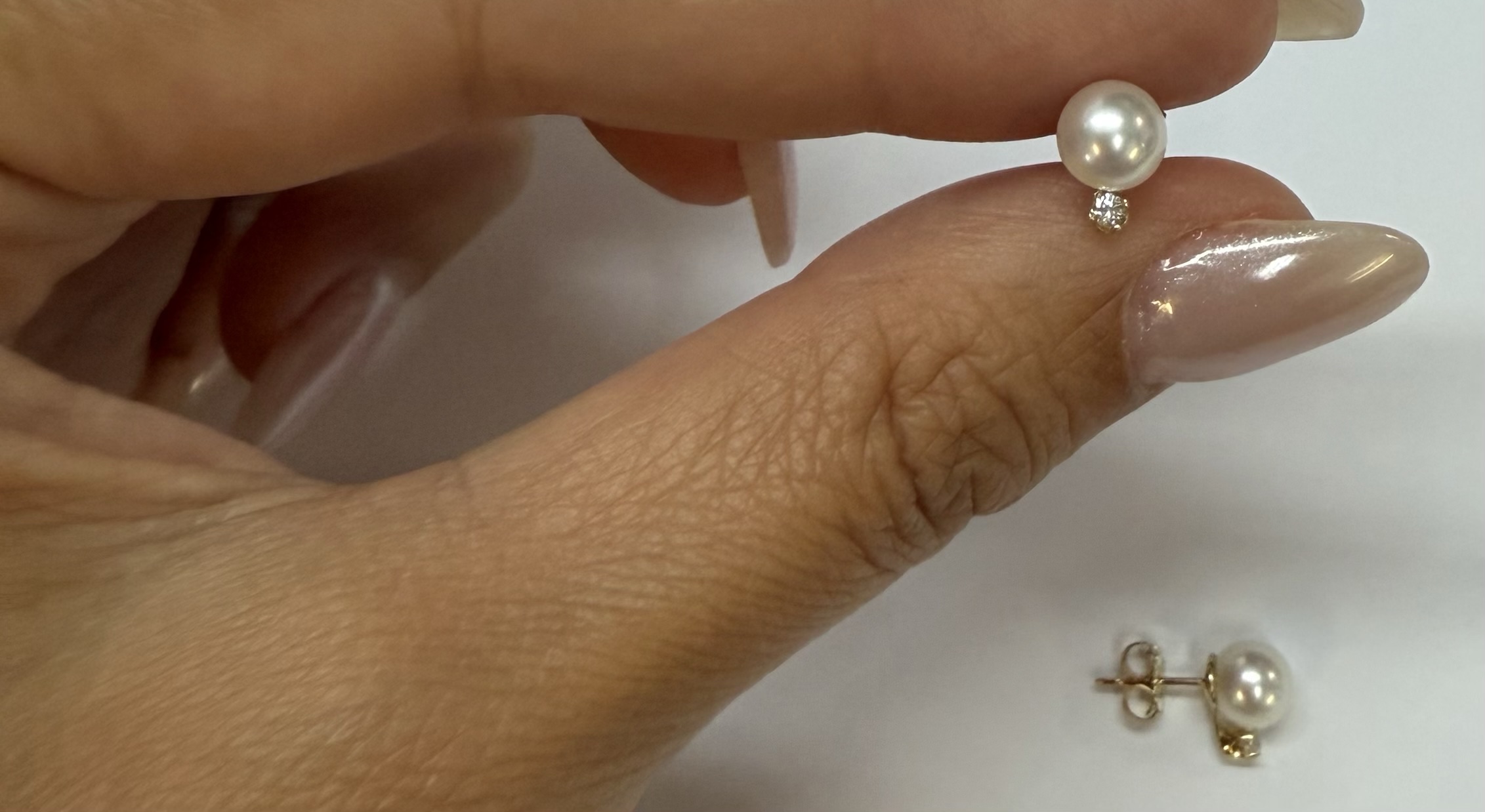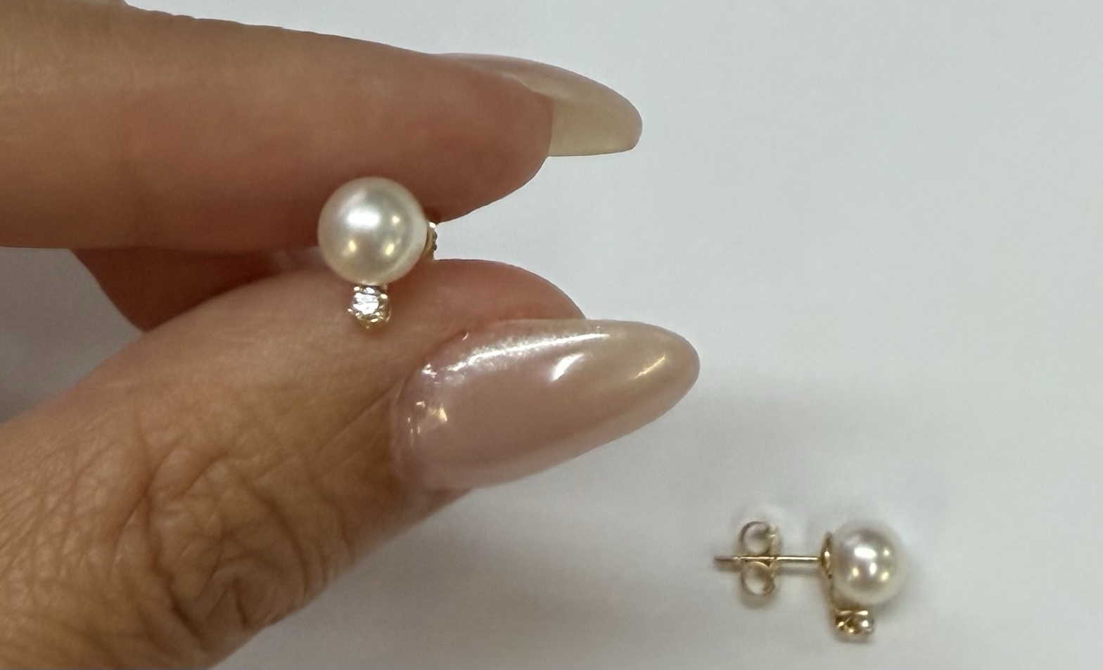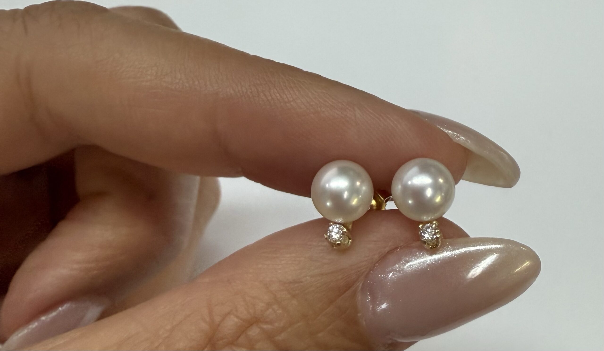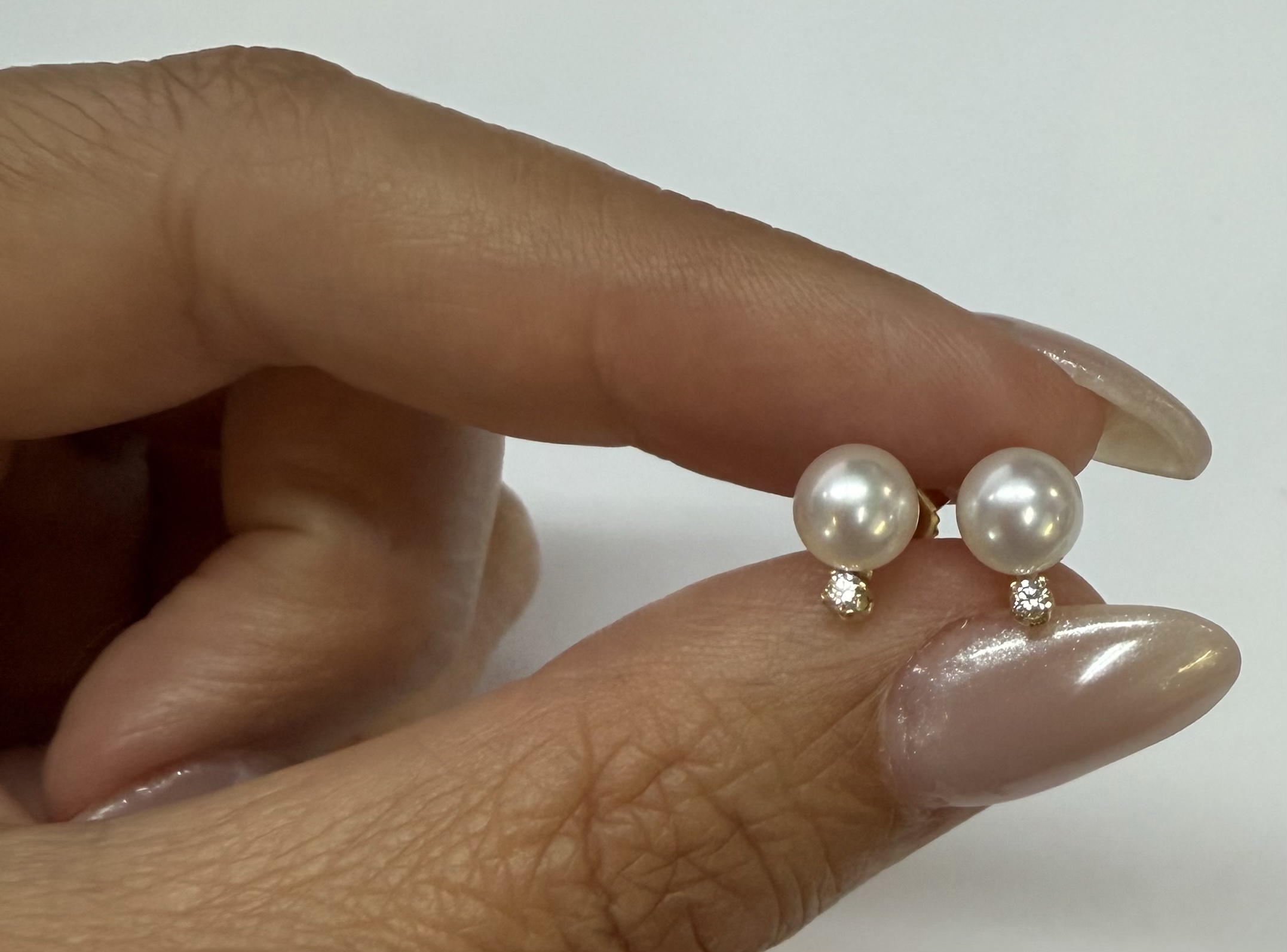 14k yellow gold 6 mm cultured saltwater pearl and genuine .06 cttw Round Brilliant Cut diamond stud earrings. These diamonds average G in color and SI1 in clarity. These earrings have an entire weight of 1.1 grams.