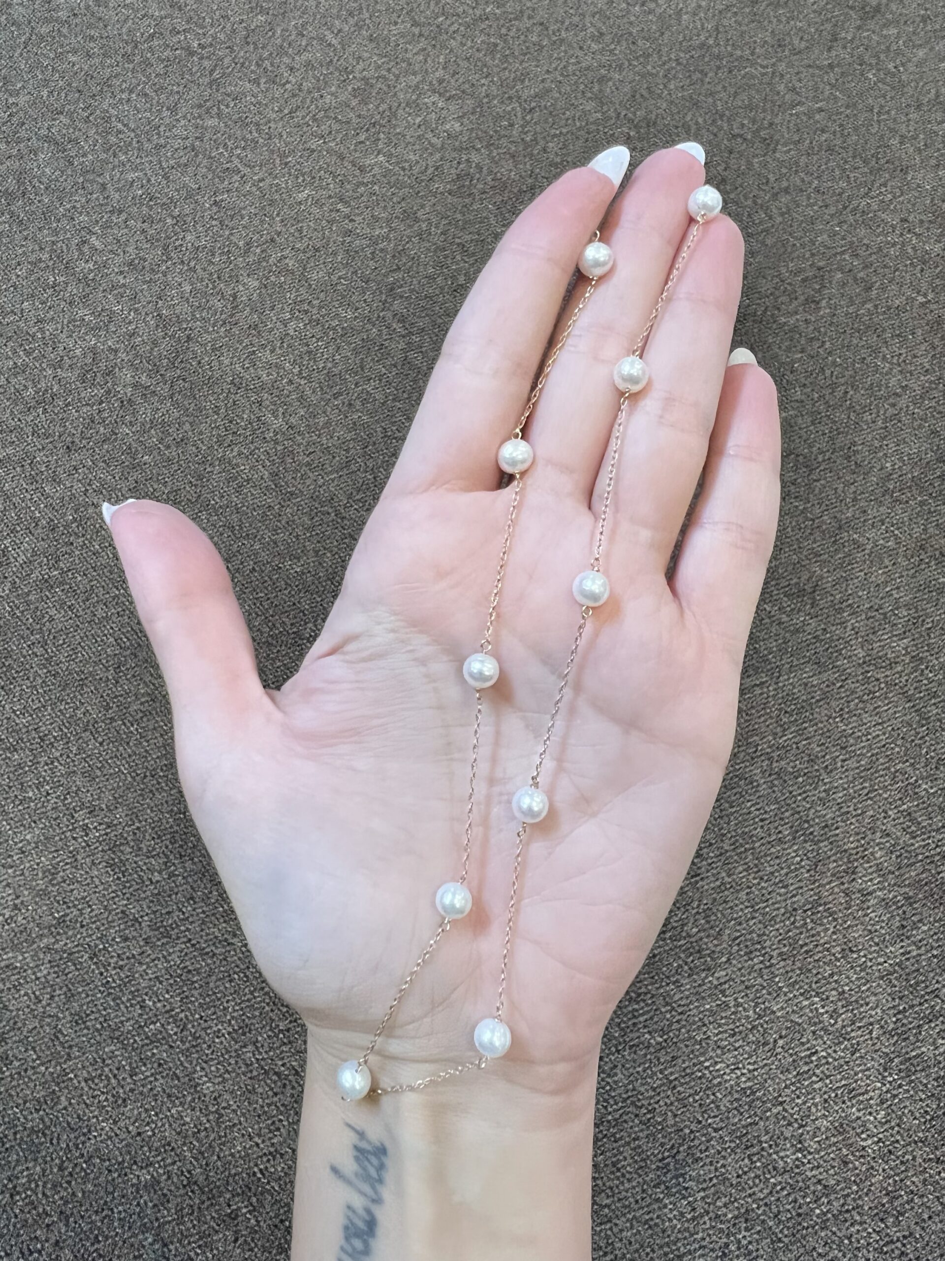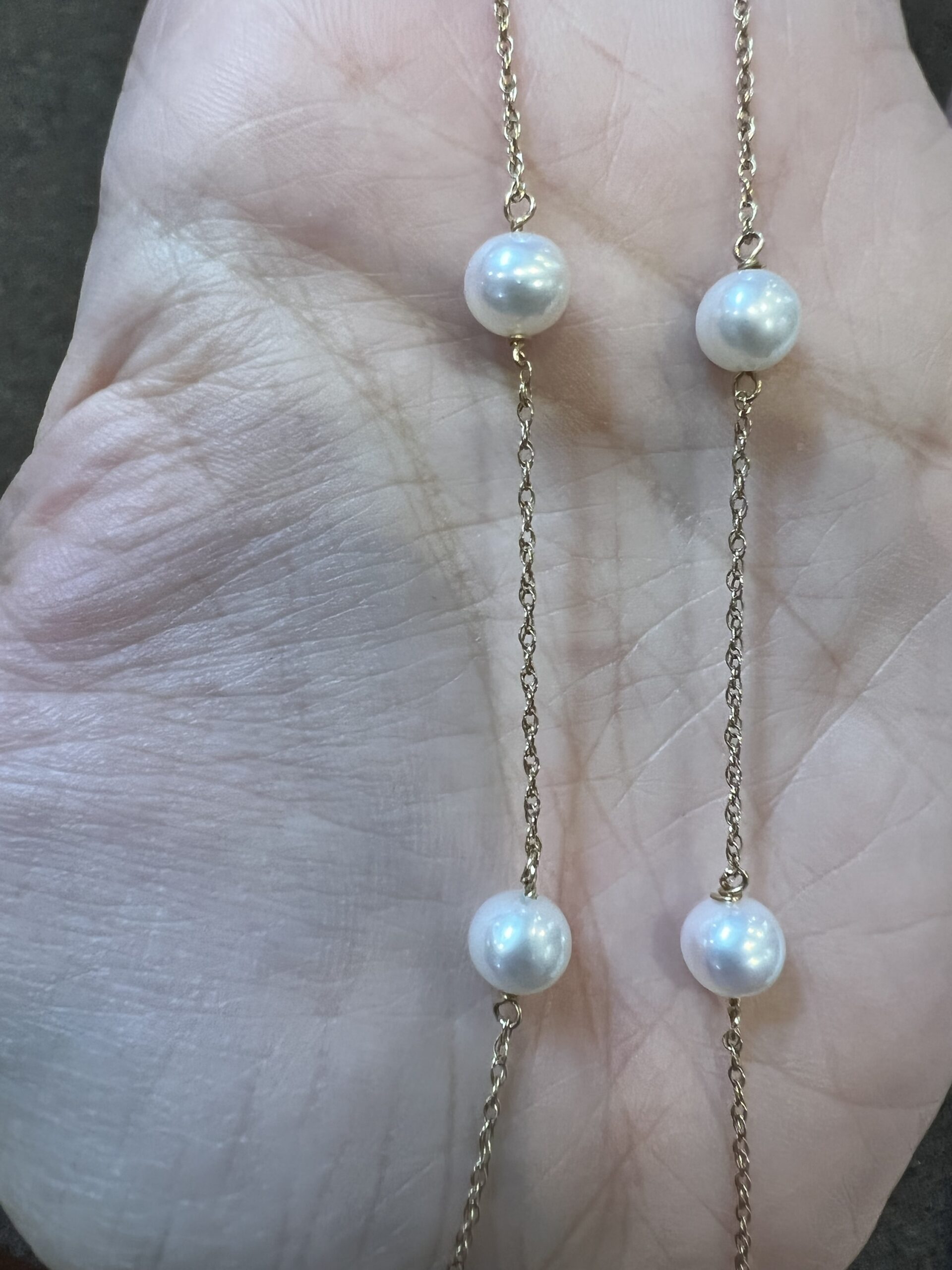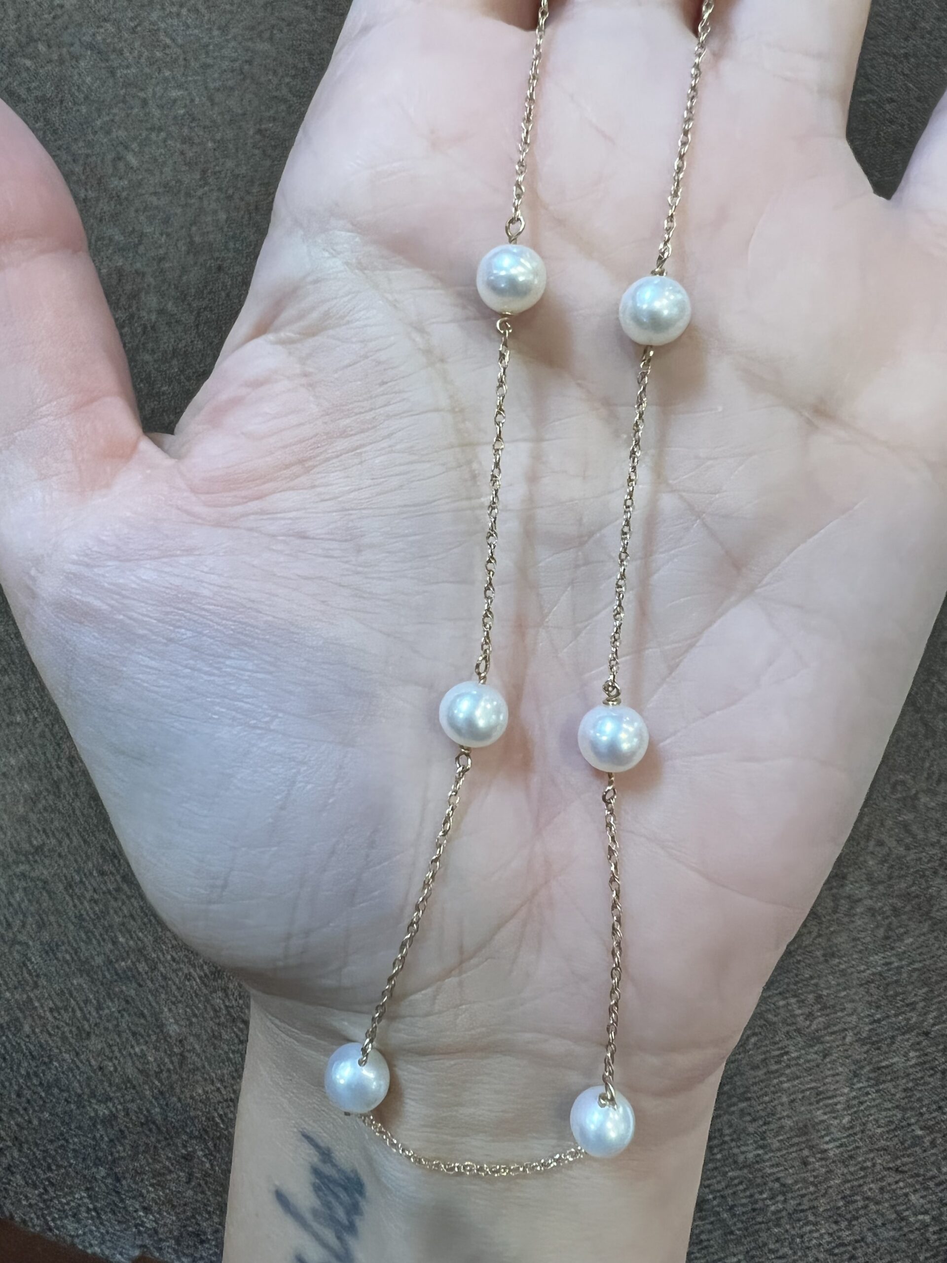 14k yellow gold 18″ 6 mm cultured freshwater pearl tin cup necklace. This necklace has an entire weight of 5.0 grams.