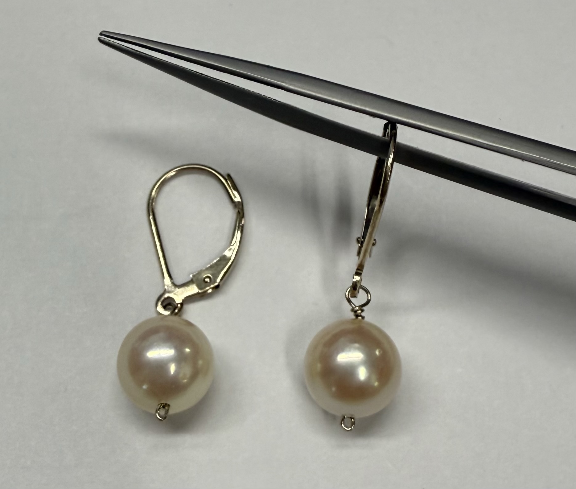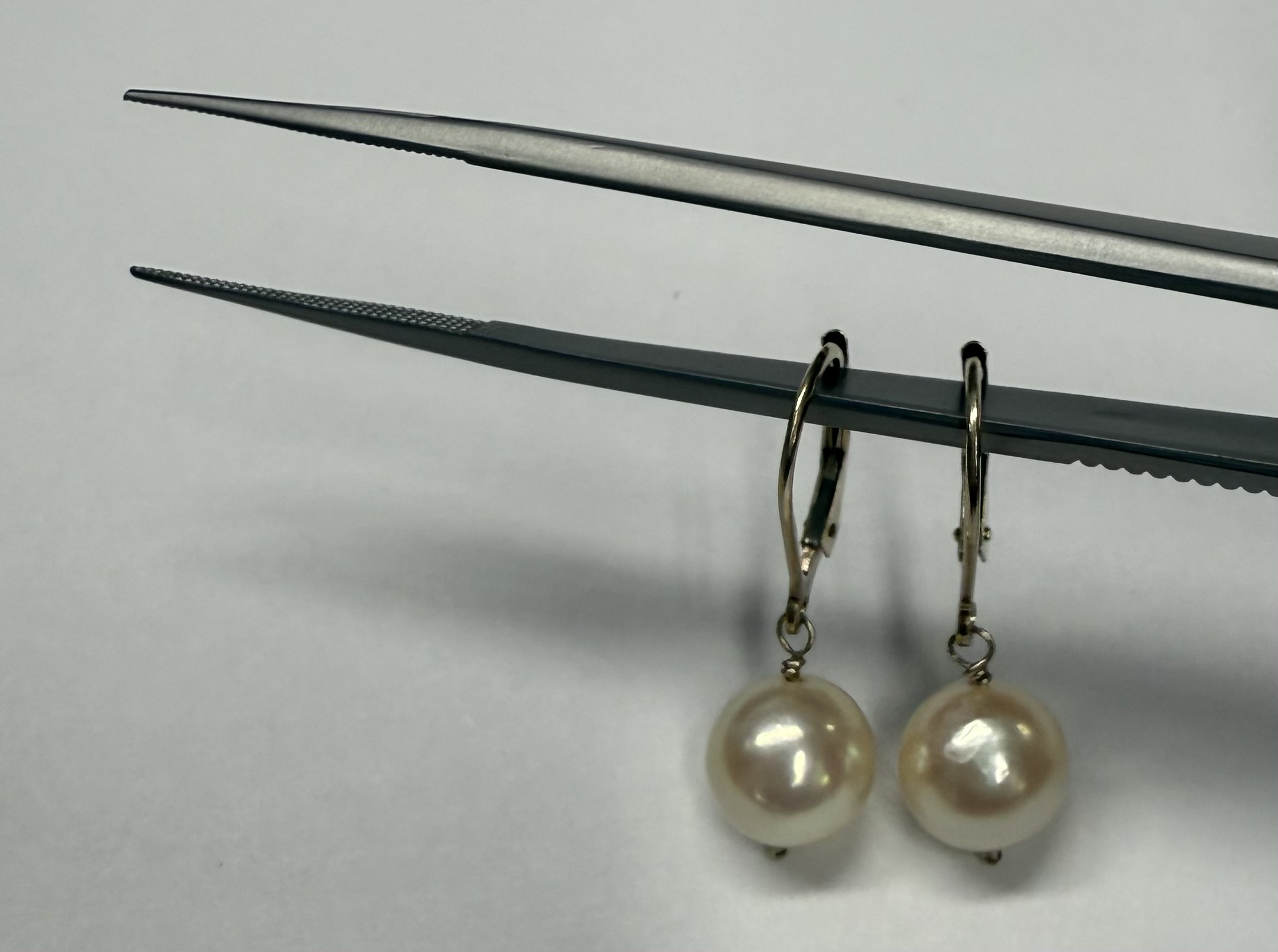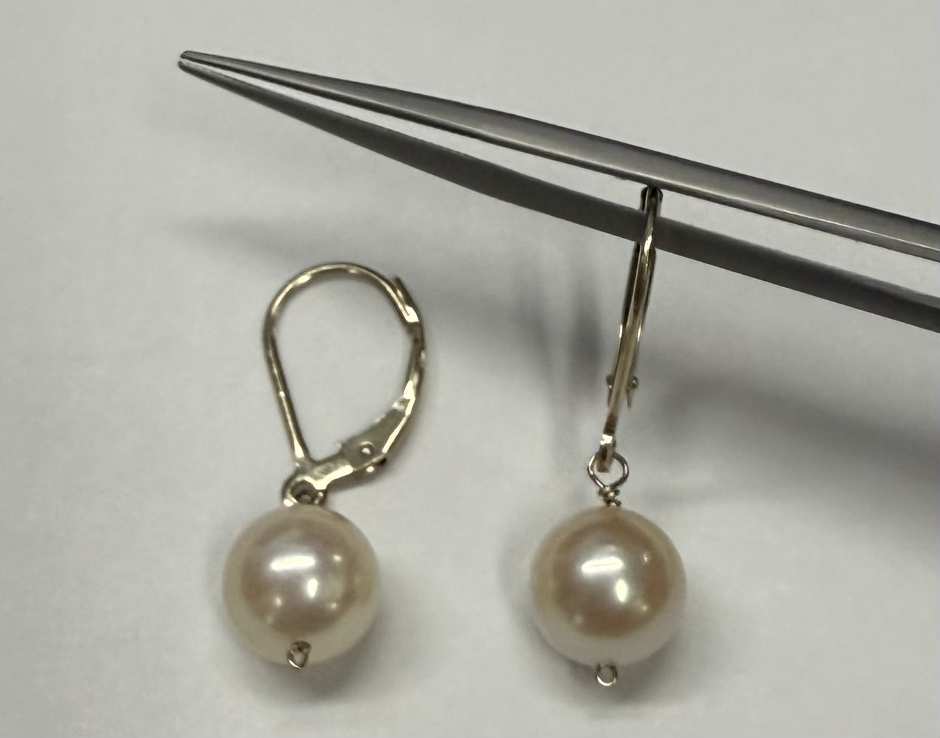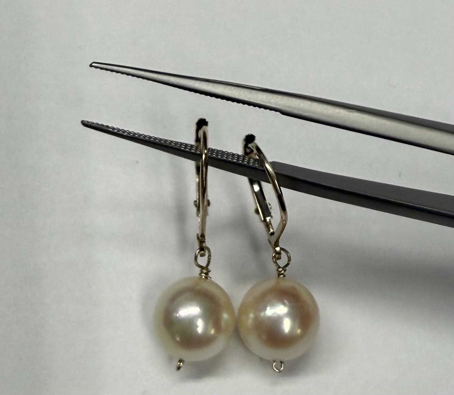 14k yellow gold 8.5 mm cultured saltwater Akoya pearl lever back dangle earrings. These earrings have an entire weight of 2.6 grams.