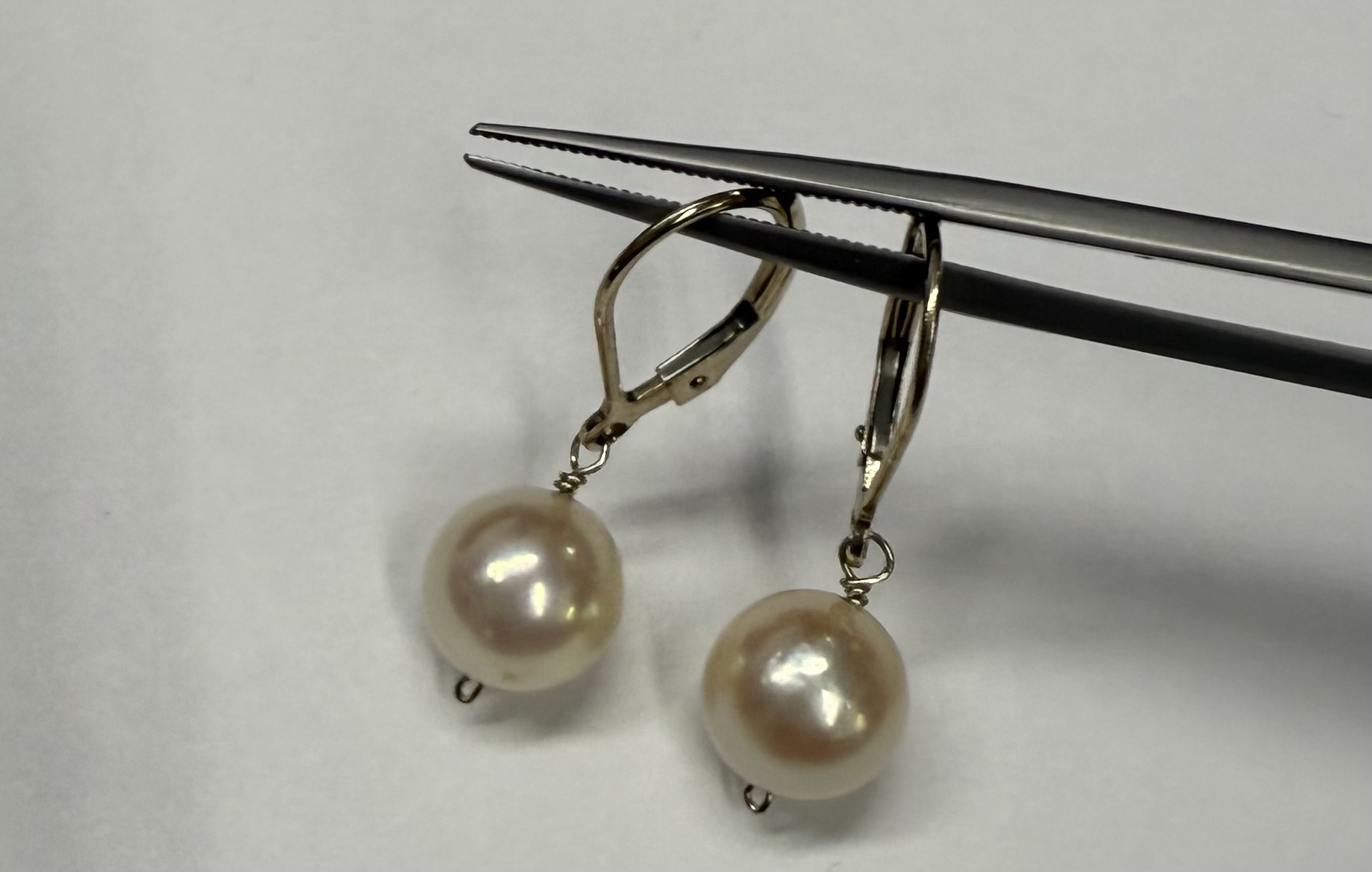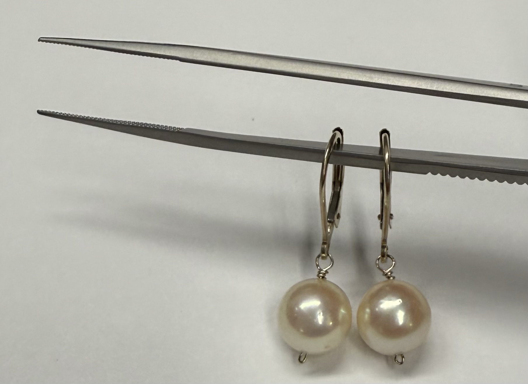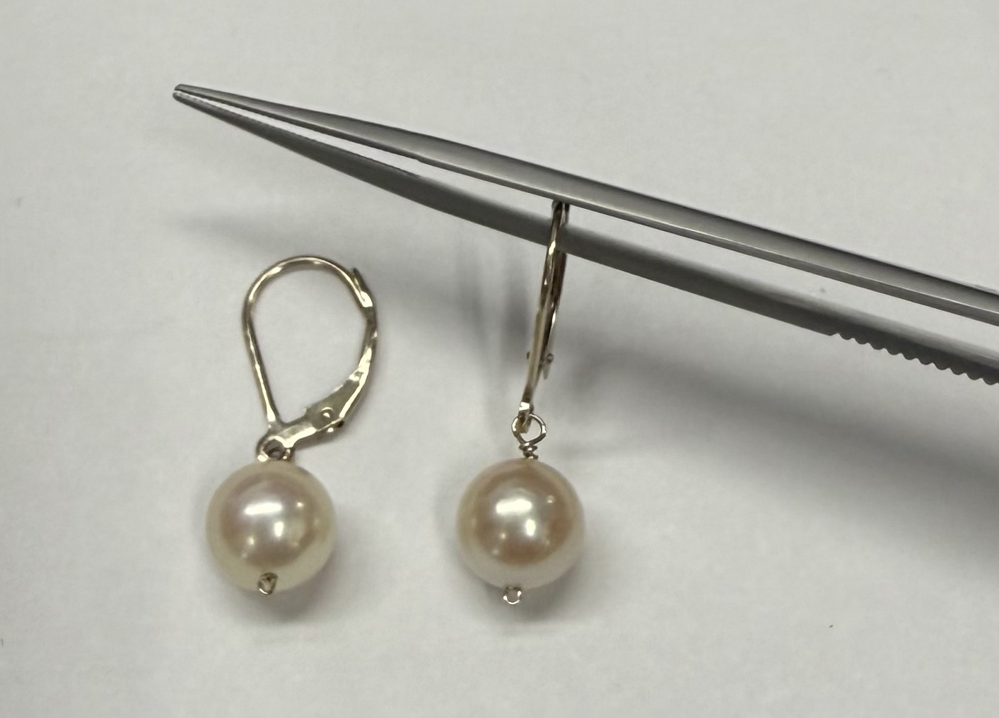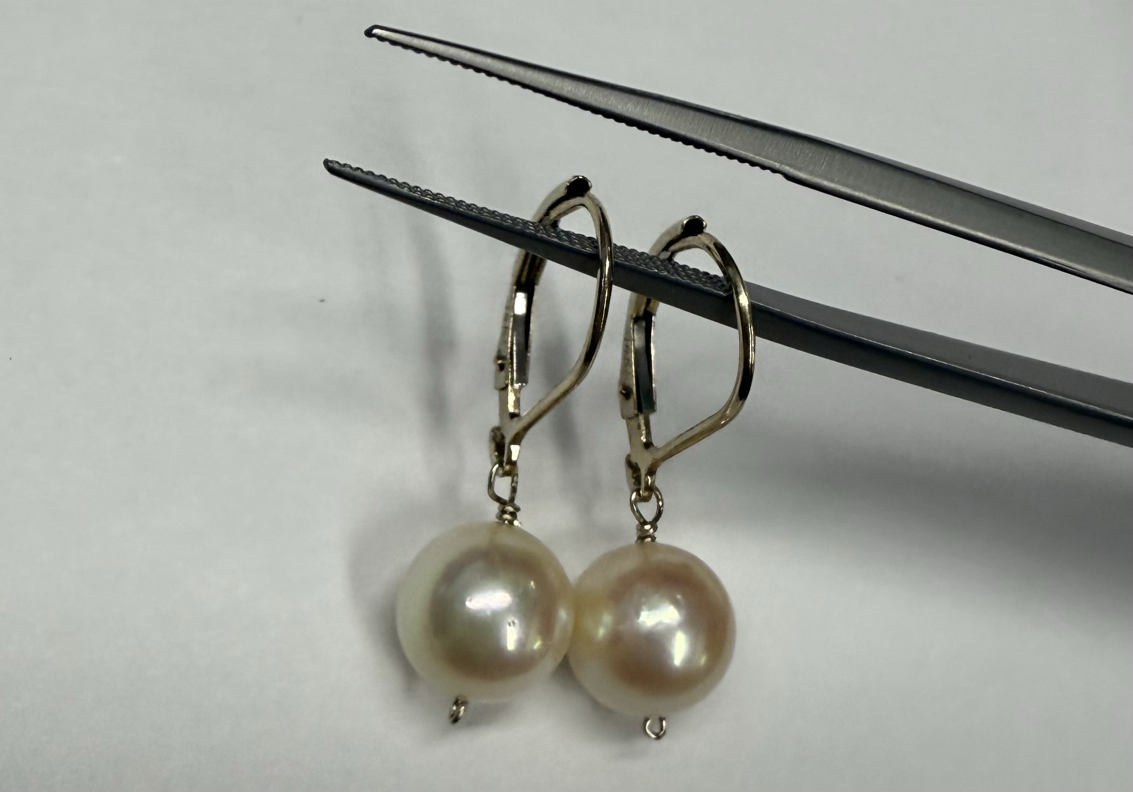 14k yellow gold 8.5 mm cultured saltwater Akoya pearl lever back dangle earrings. These earrings have an entire weight of 2.6 grams.