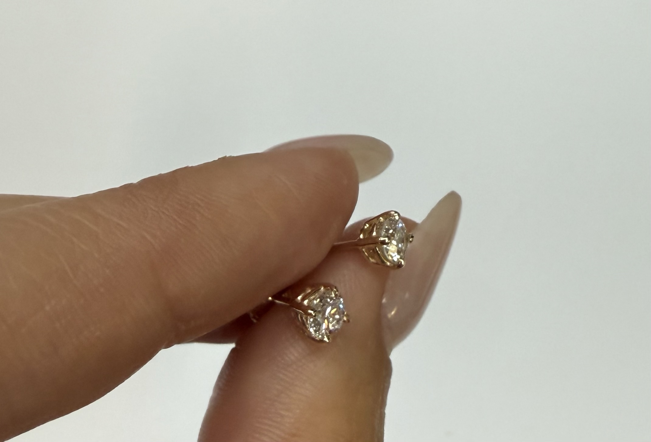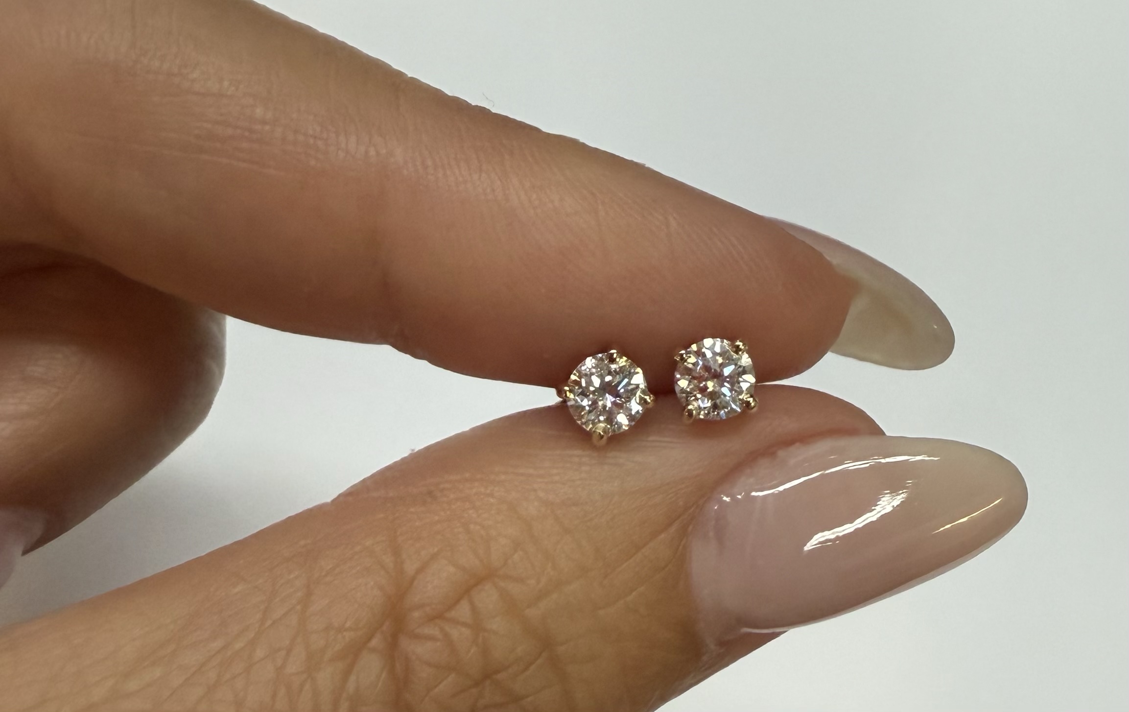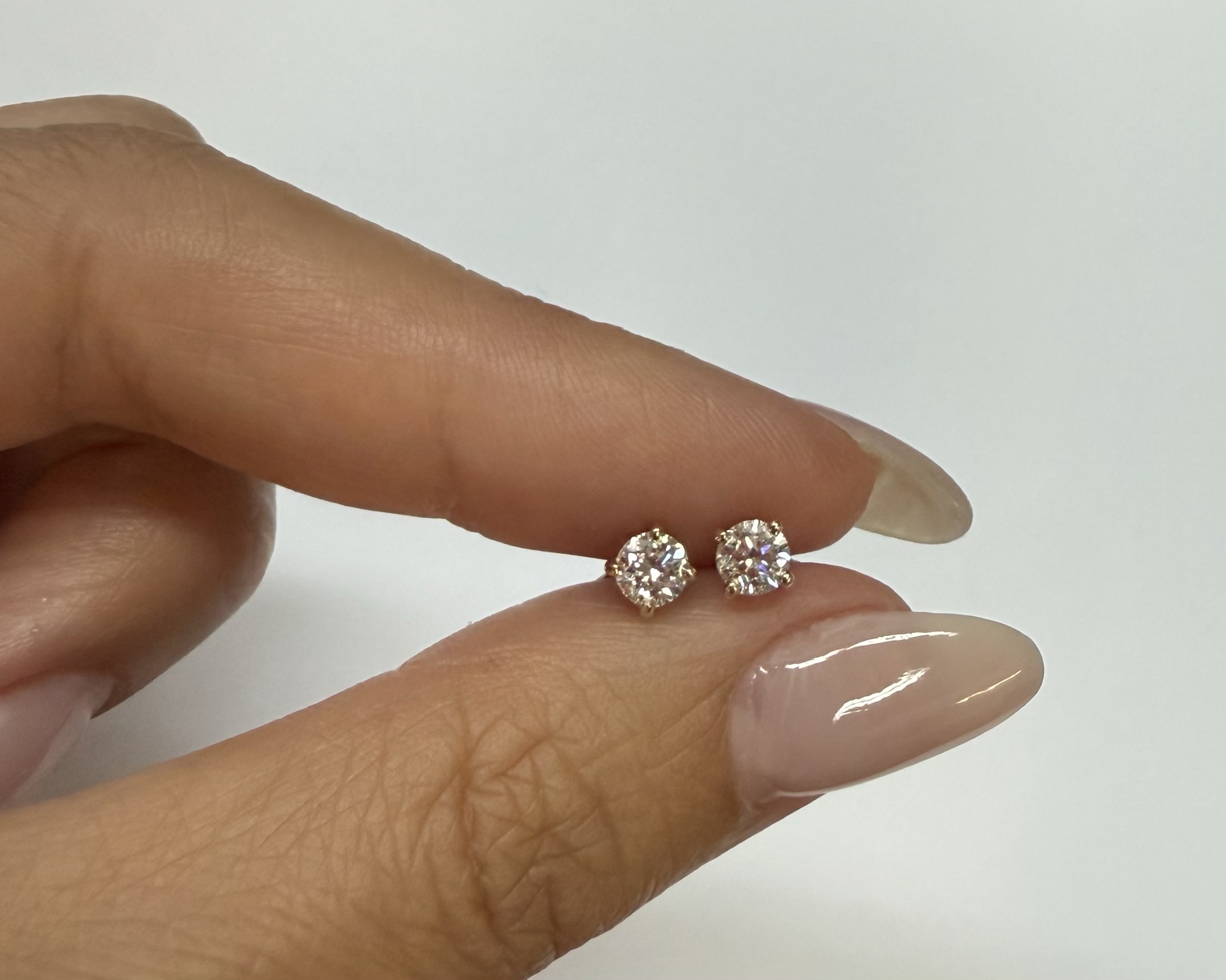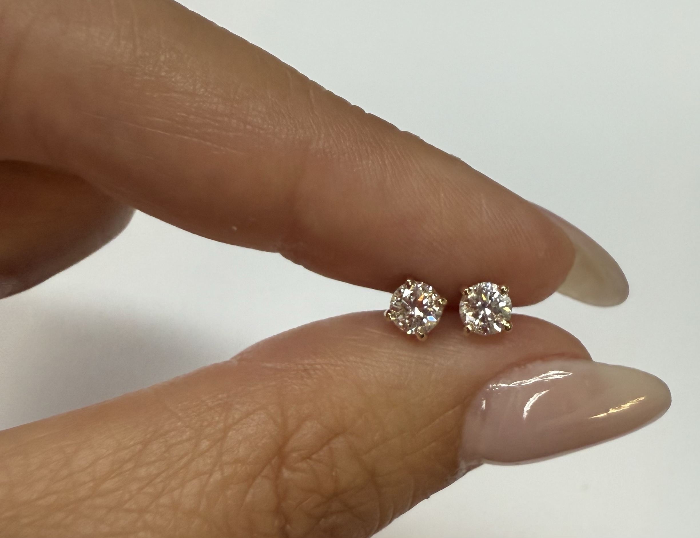 14k yellow gold four prong basket set genuine 1/2 cttw Lab Grown Round Brilliant Cut diamond stud earrings with F color, VS2 clarity. These earrings have an entire weight of 0.7 grams.