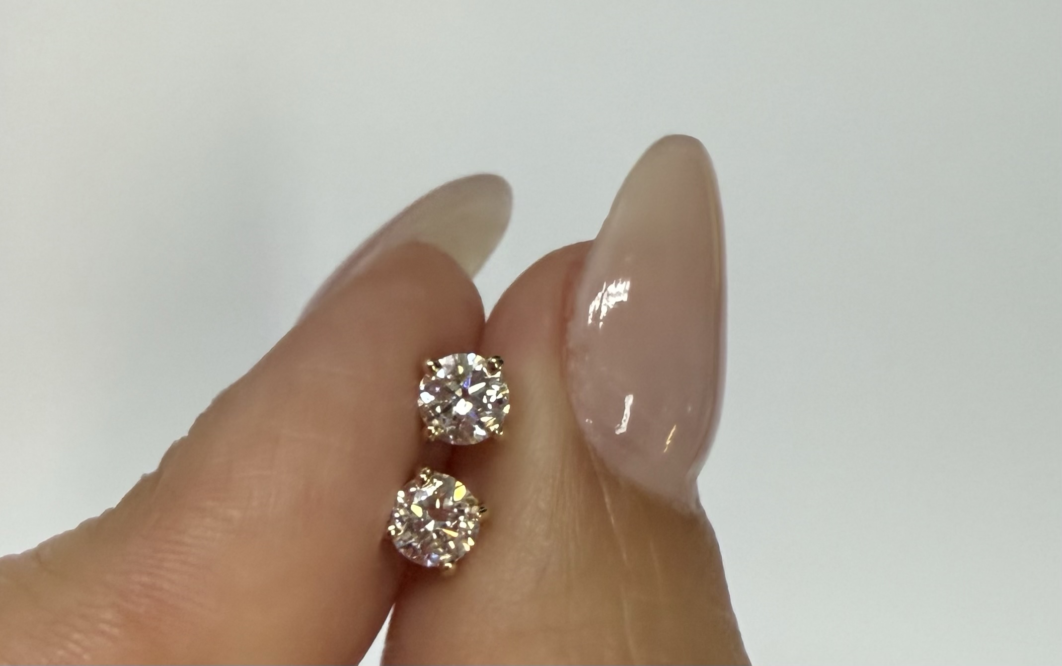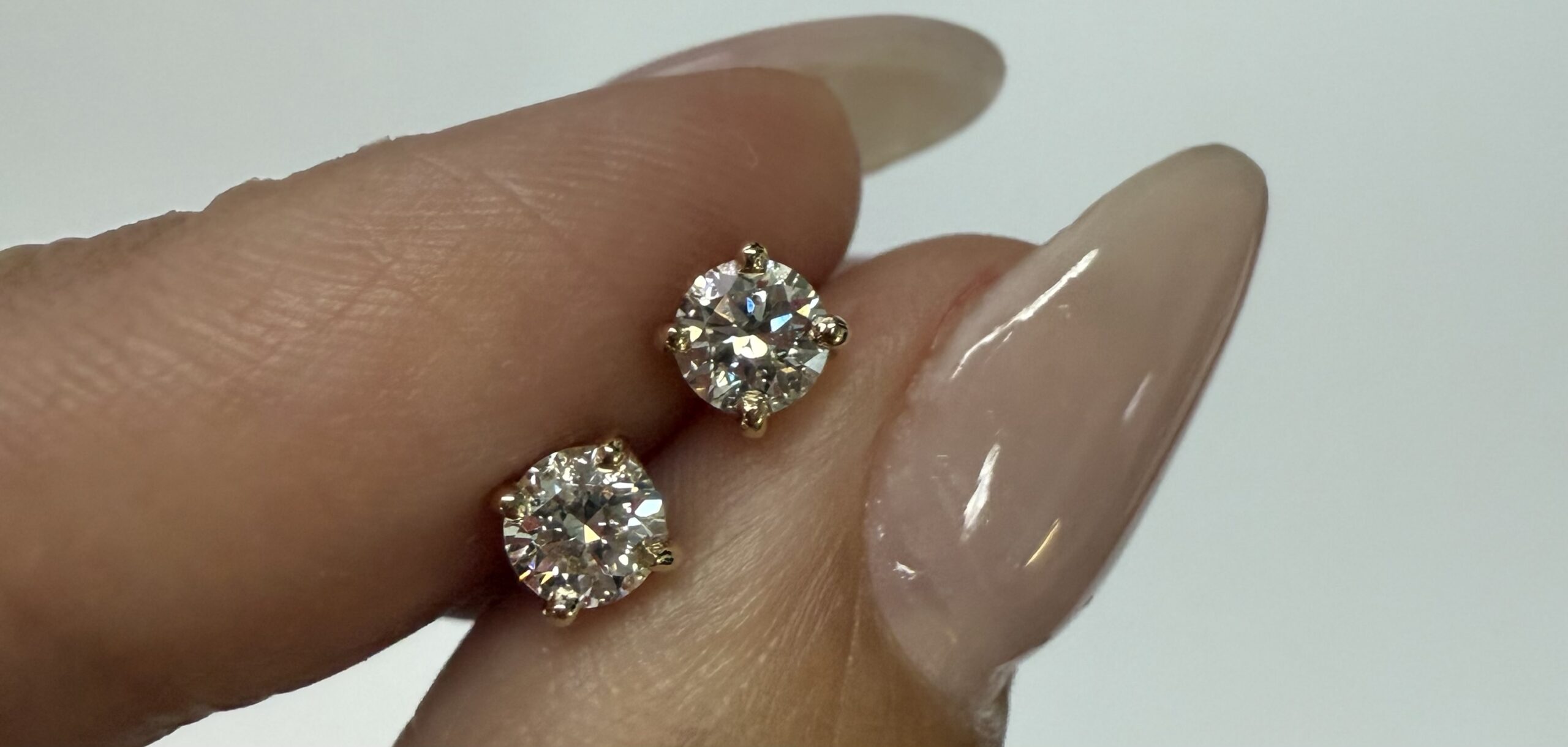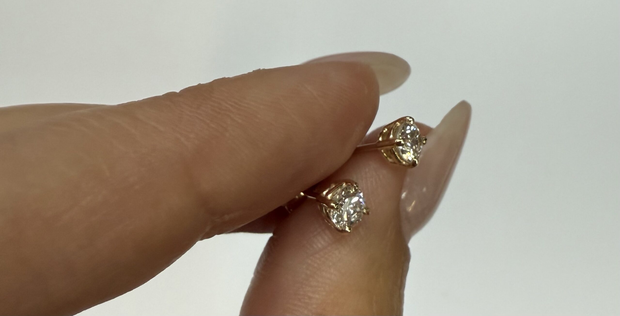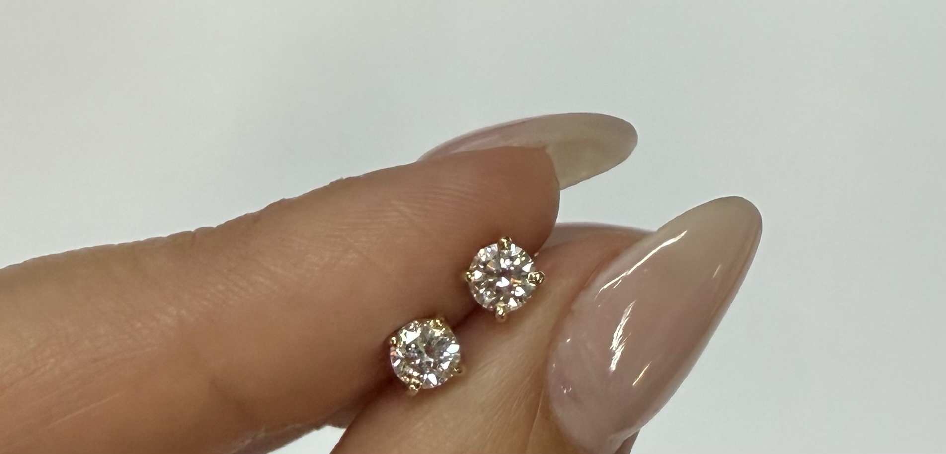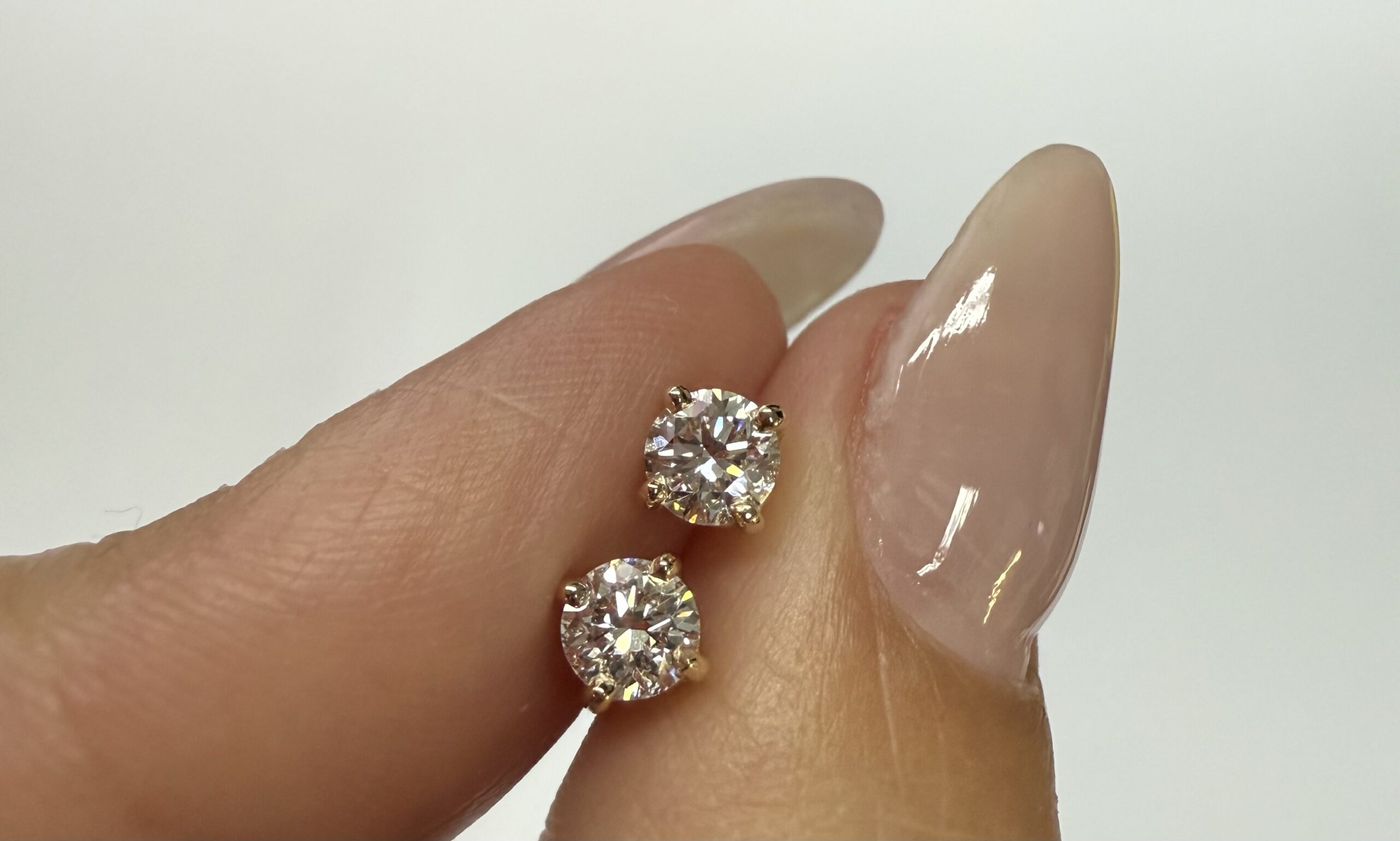 14k yellow gold four prong basket set genuine 1/2 cttw Lab Grown Round Brilliant Cut diamond stud earrings with F color, VS2 clarity. These earrings have an entire weight of 0.7 grams.
