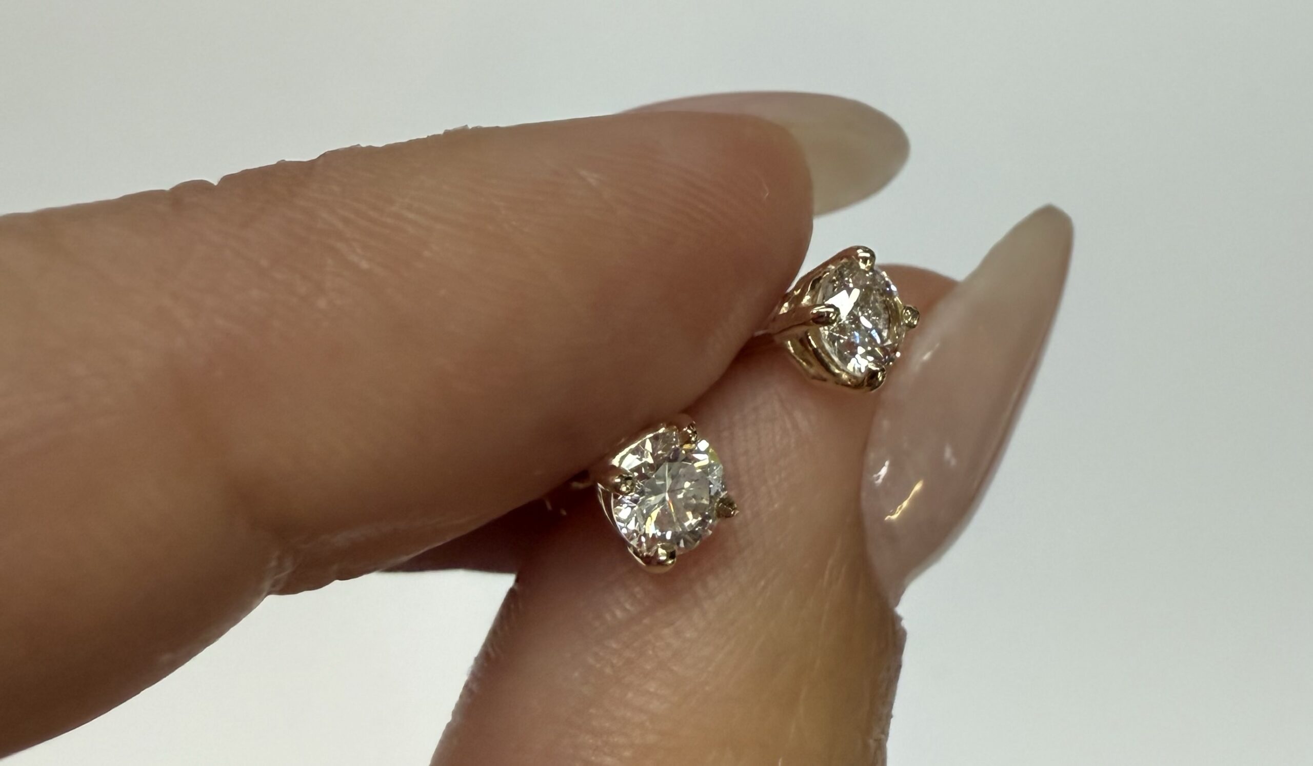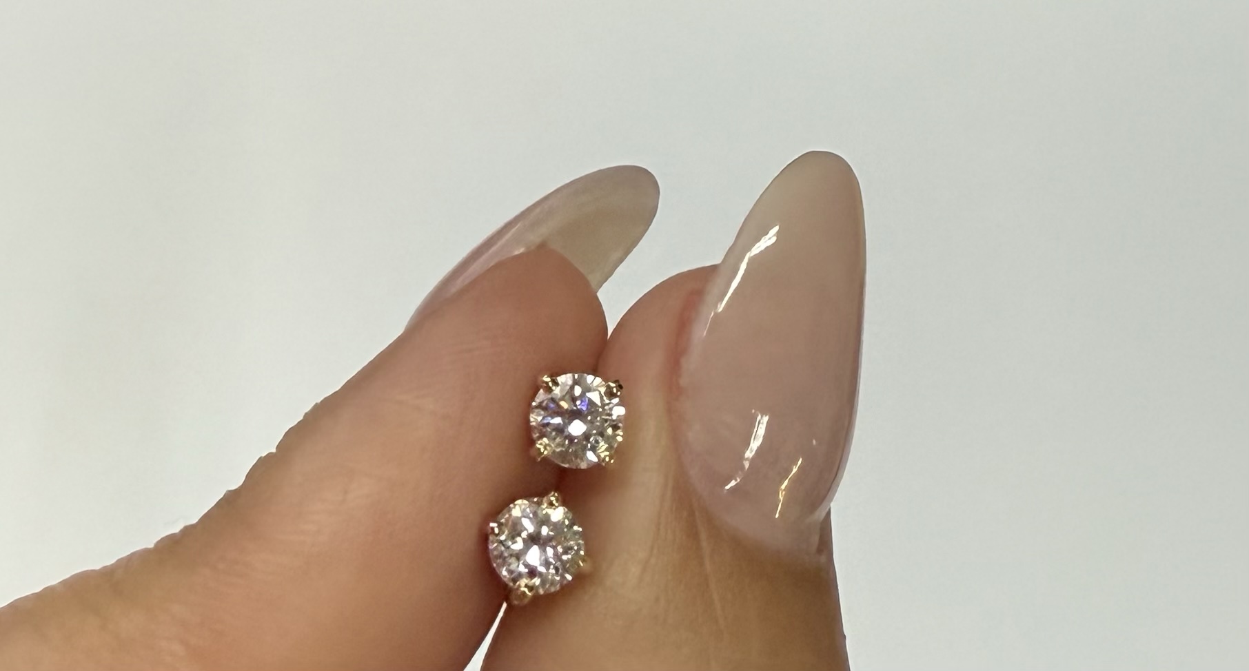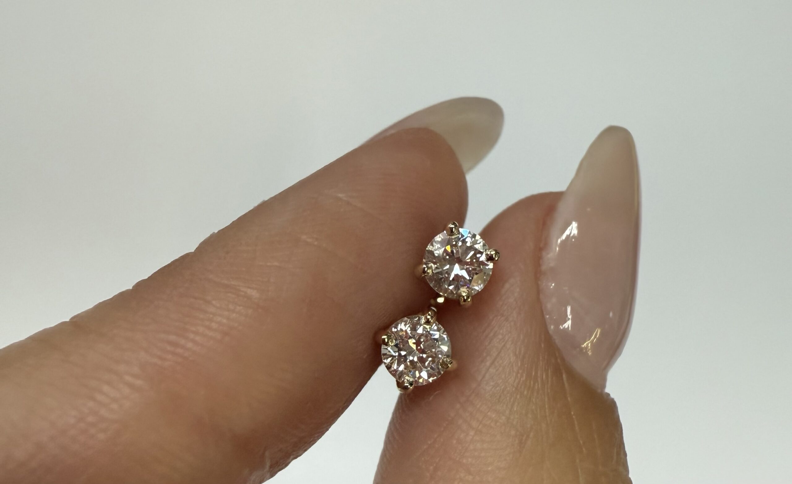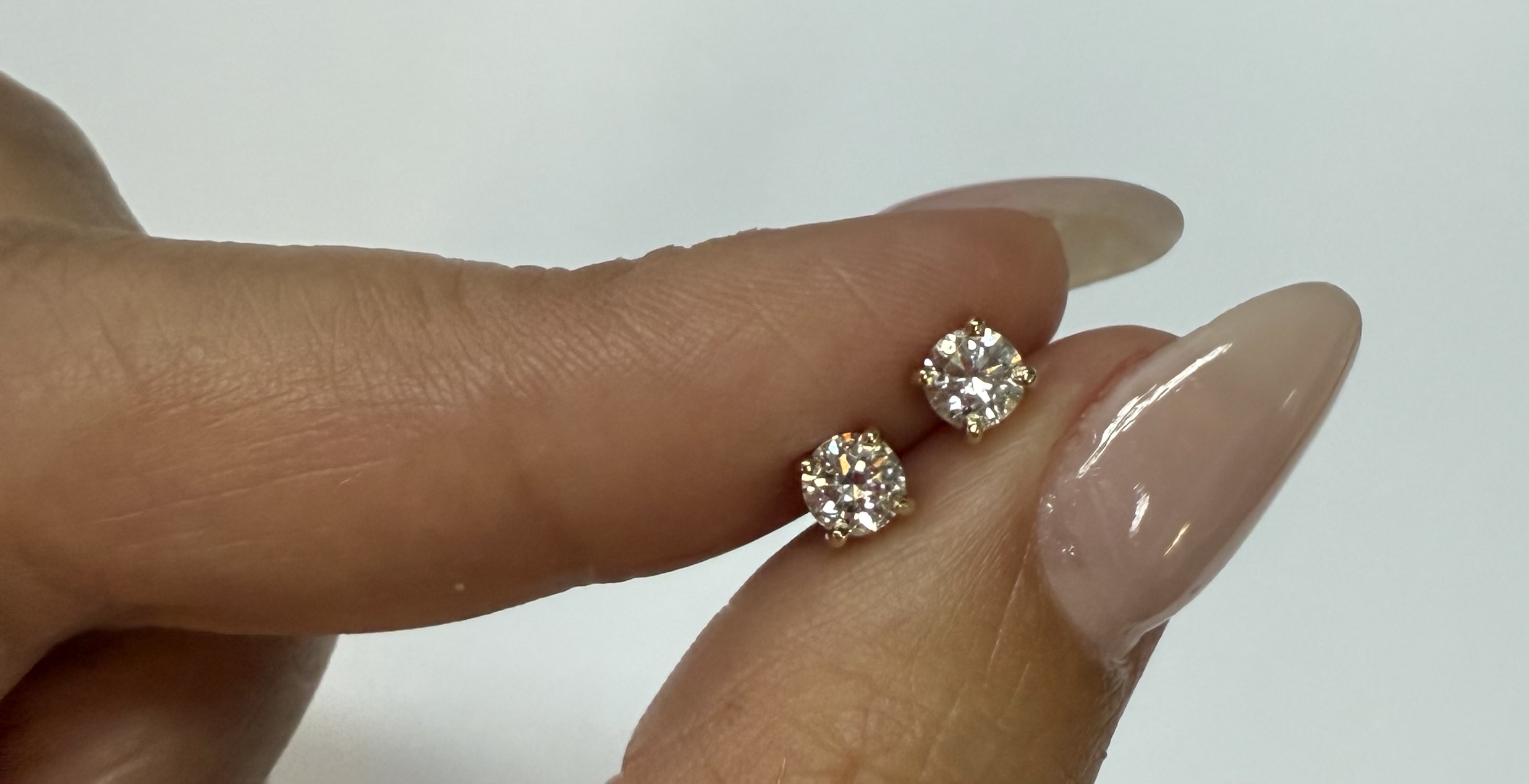 14k yellow gold four prong basket set genuine 1/2 cttw Lab Grown Round Brilliant Cut diamond stud earrings with F color, VS2 clarity. These earrings have an entire weight of 0.7 grams.