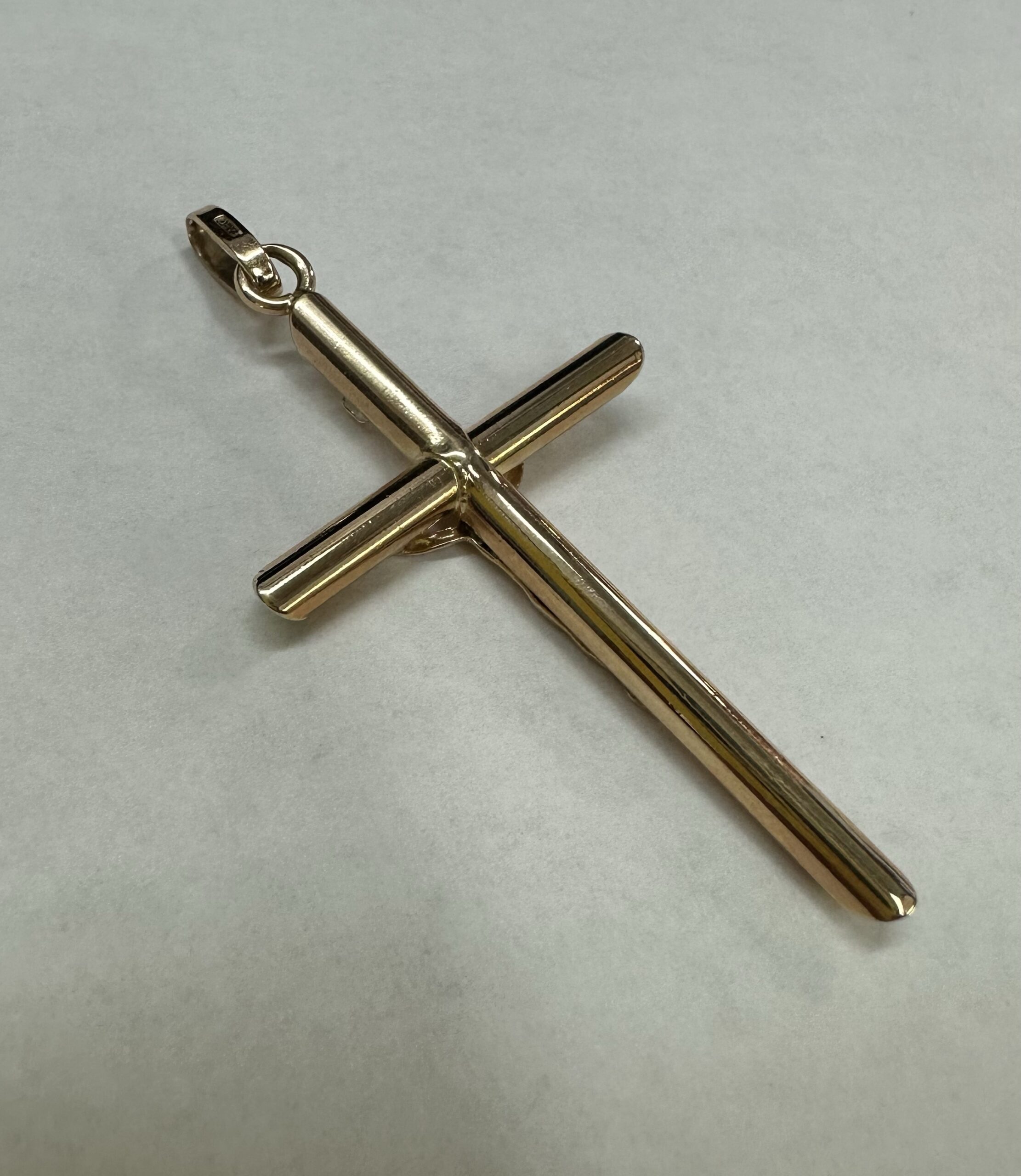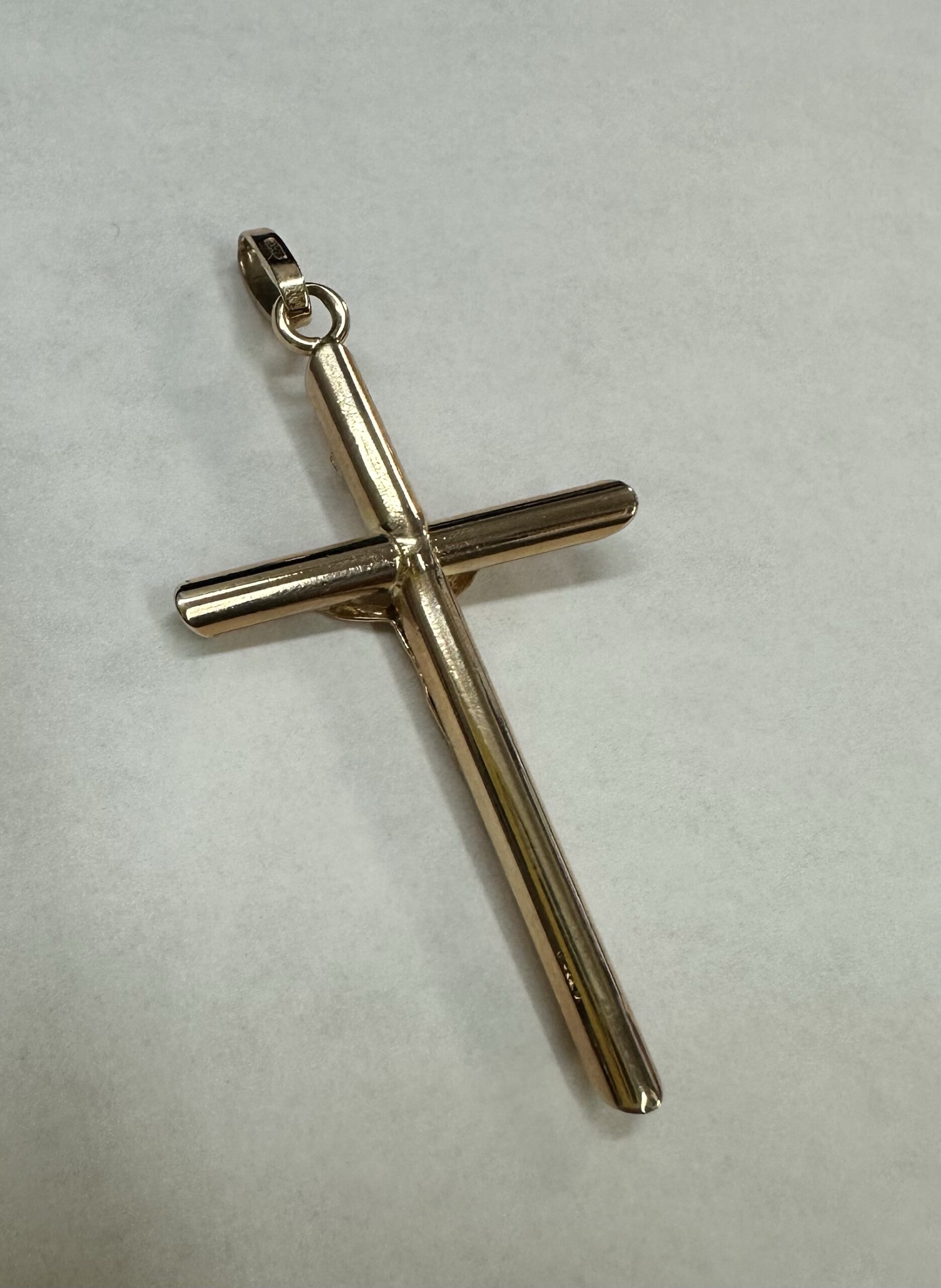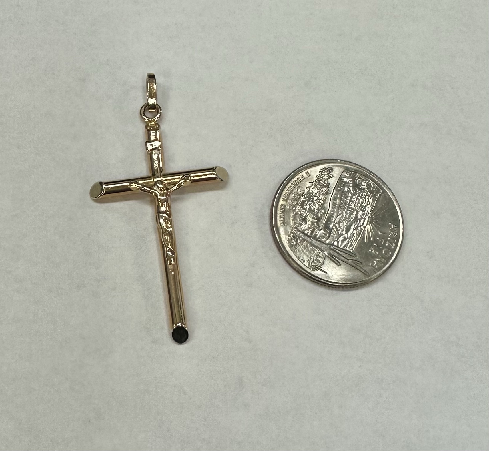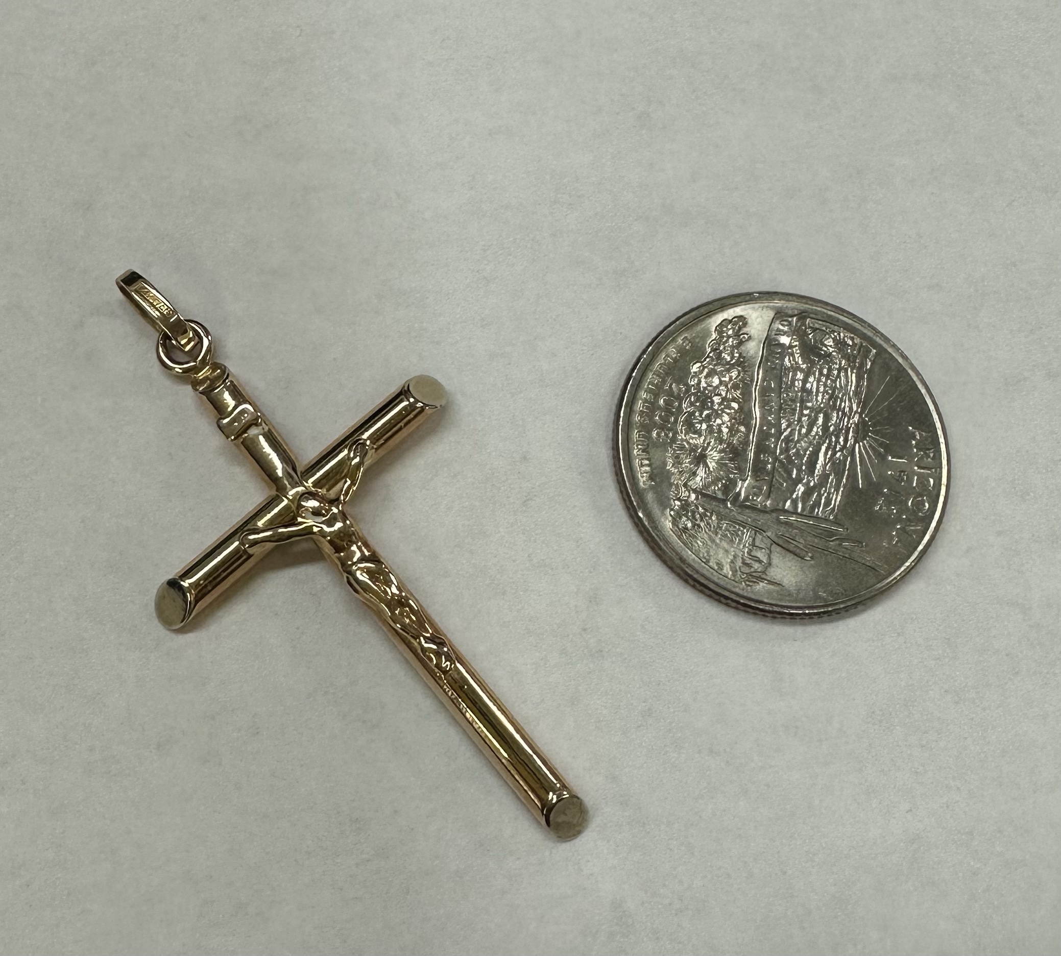 Vintage 14k yellow gold hollow crucifix. This crucifix measures 2” in length including the nail and 1” in width. This cross has an entire weight of 3.2 grams.