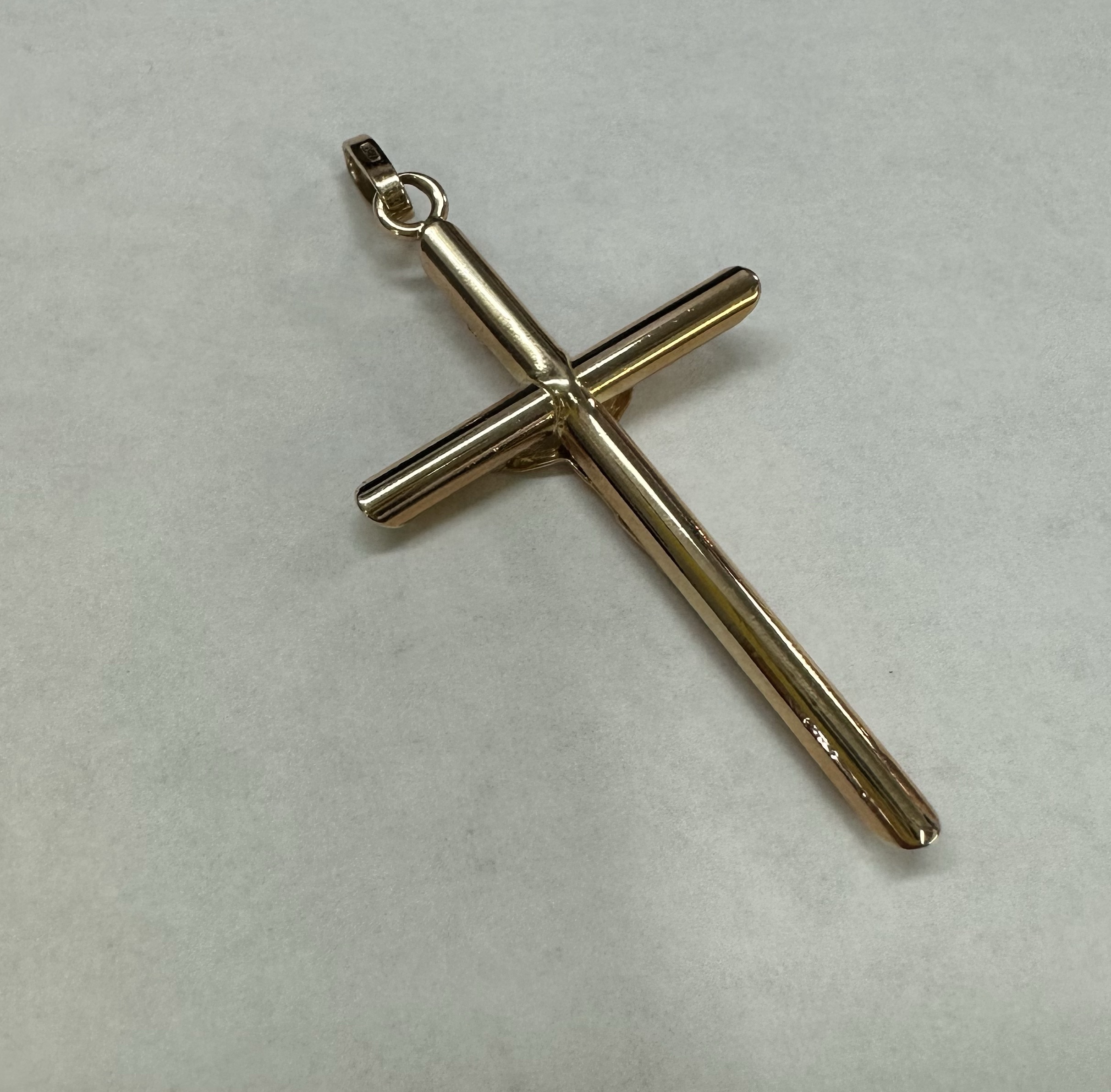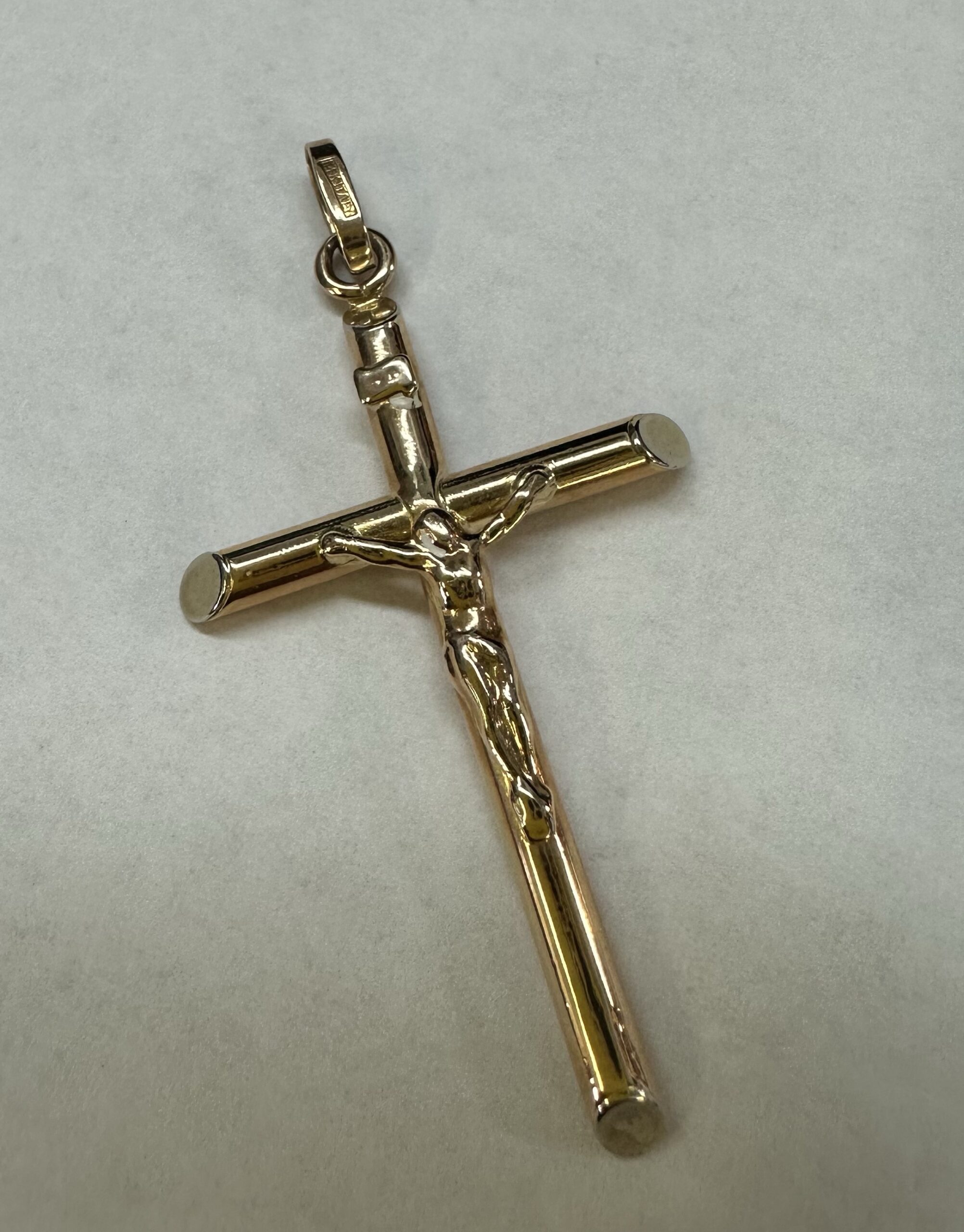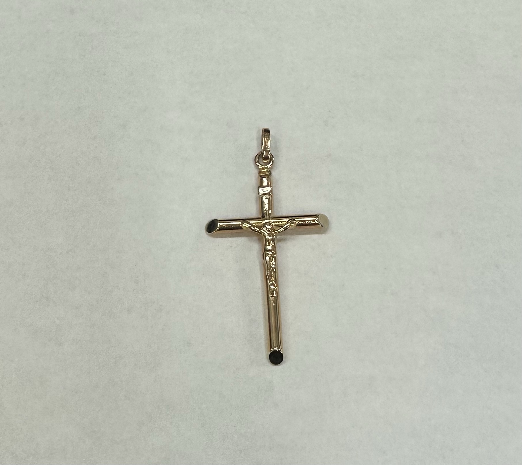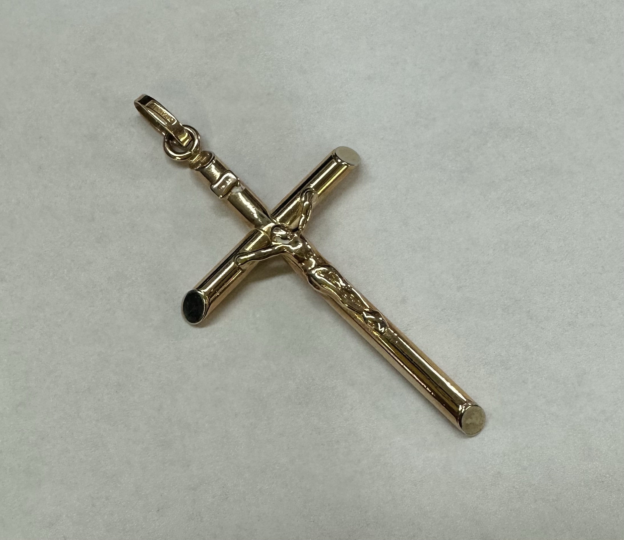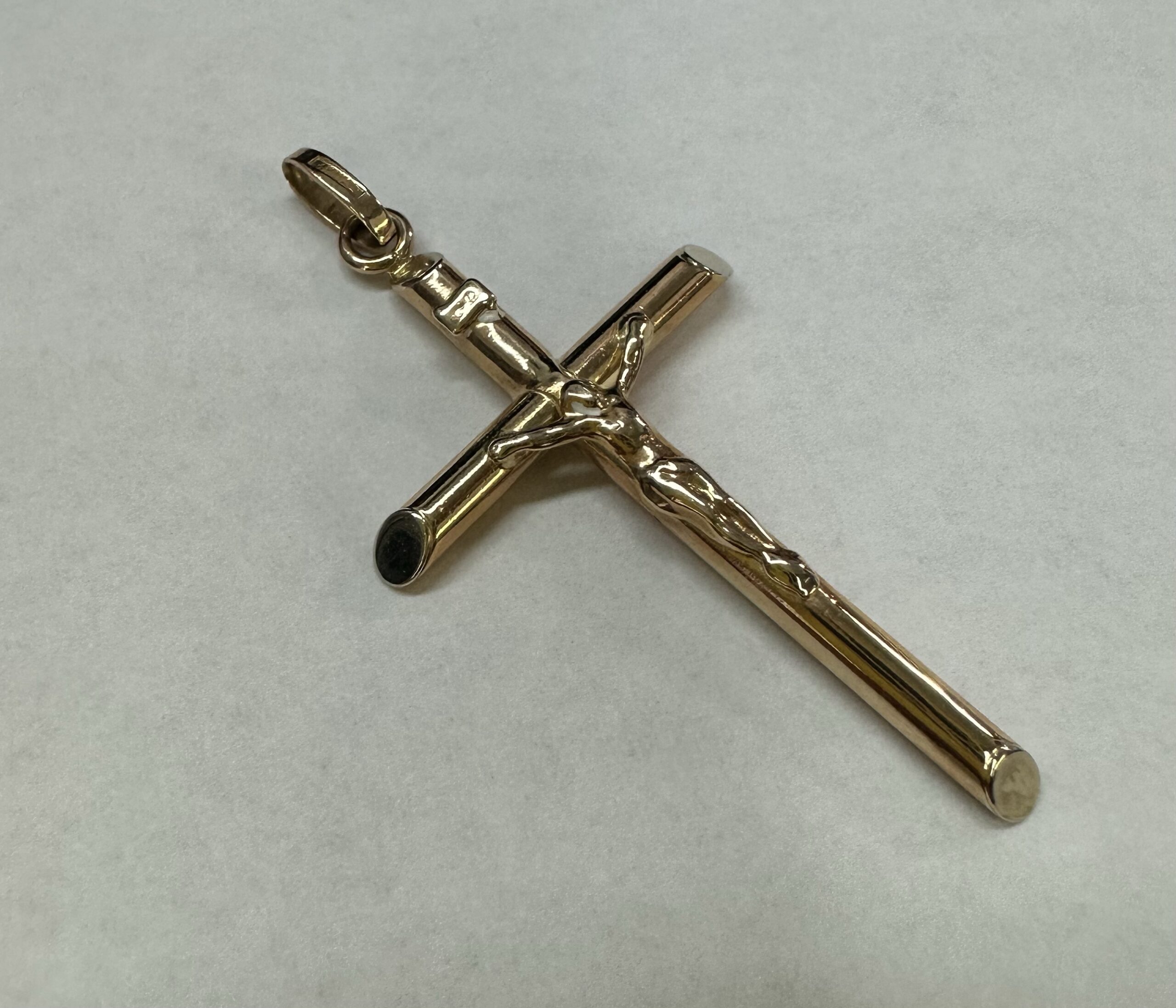 Vintage 14k yellow gold hollow crucifix. This crucifix measures 2” in length including the nail and 1” in width. This cross has an entire weight of 3.2 grams.