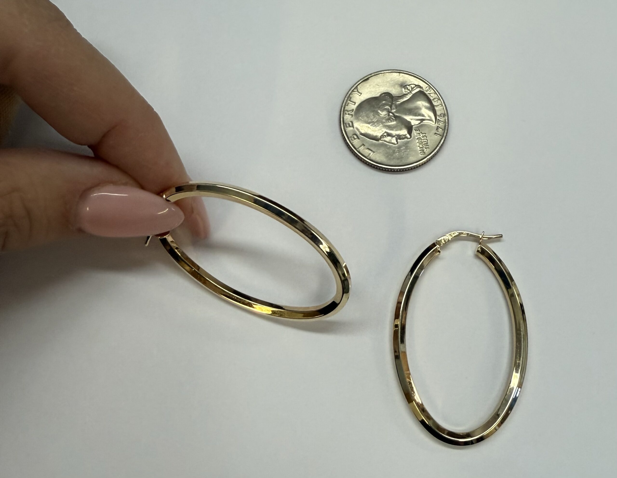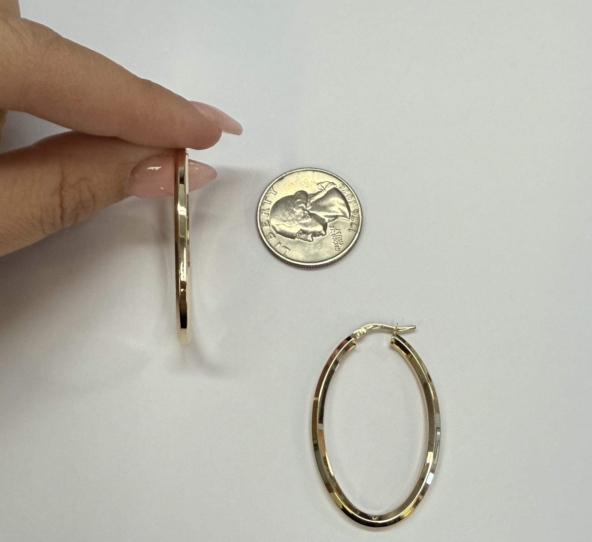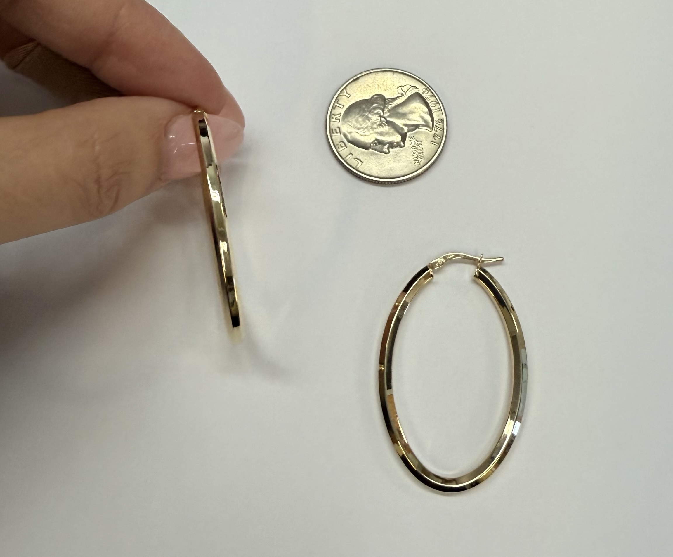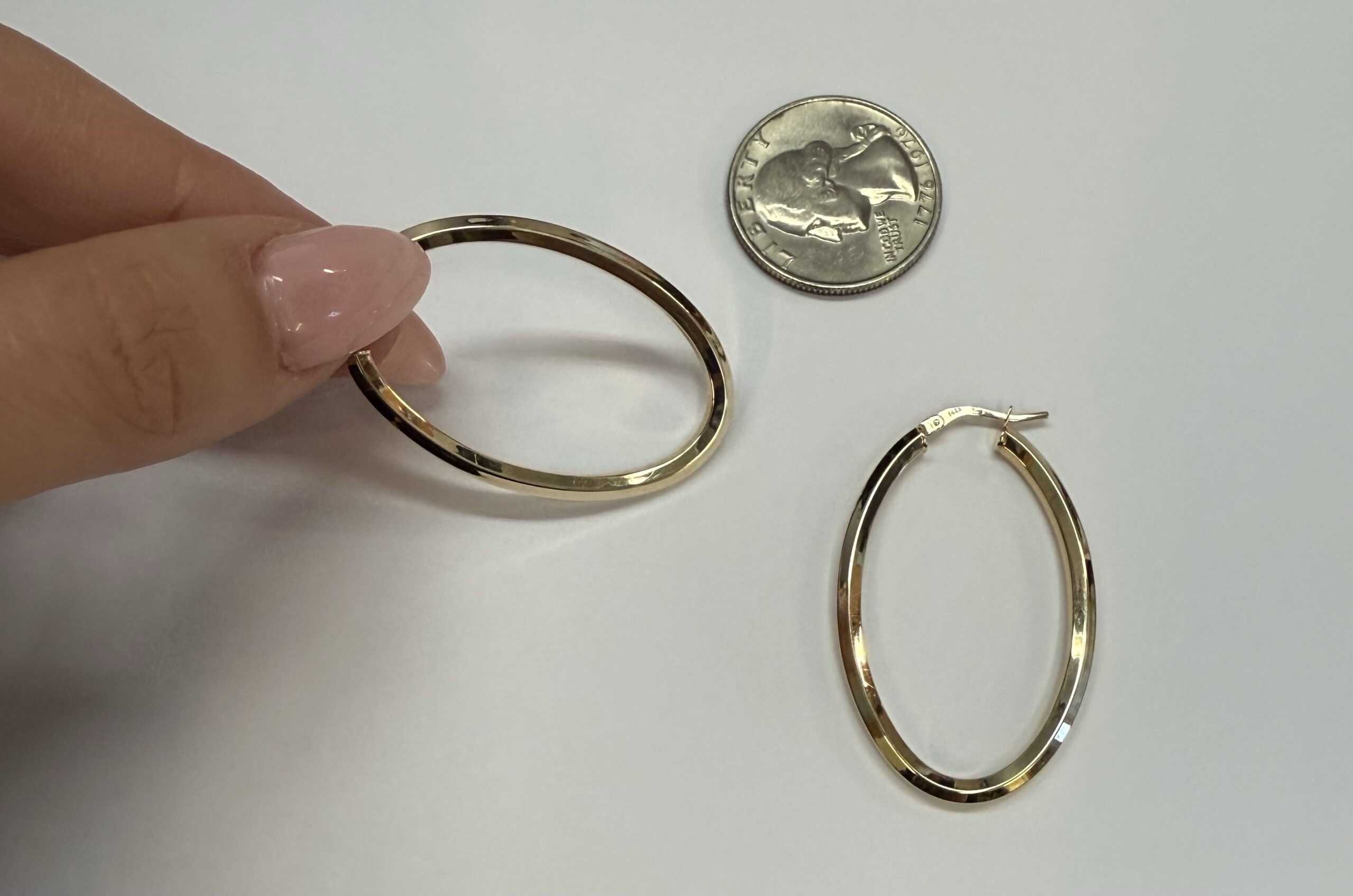 14k yellow gold delicate oval shaped 3 mm hoop earrings. These earrings have an entire weight of 2.6 grams.