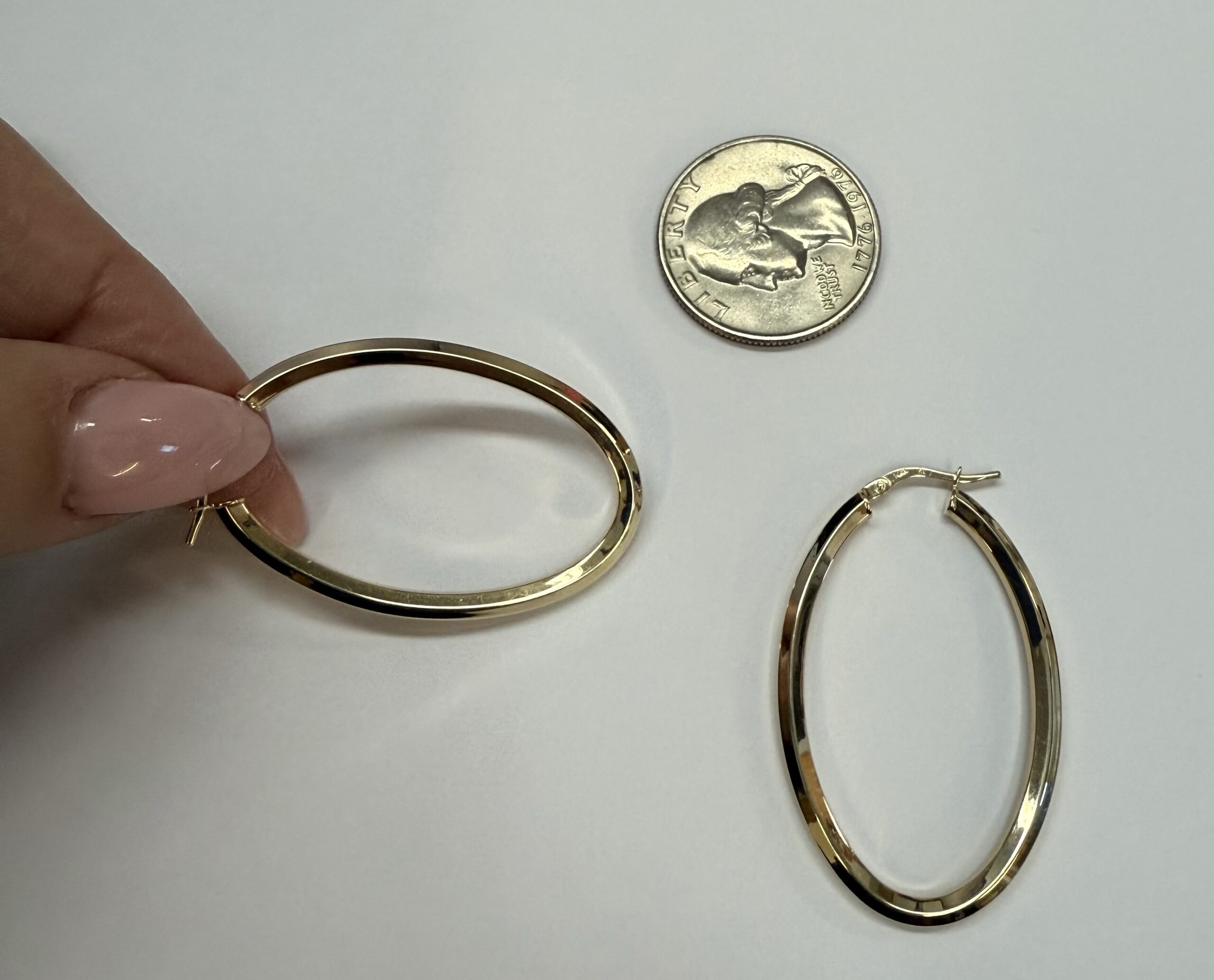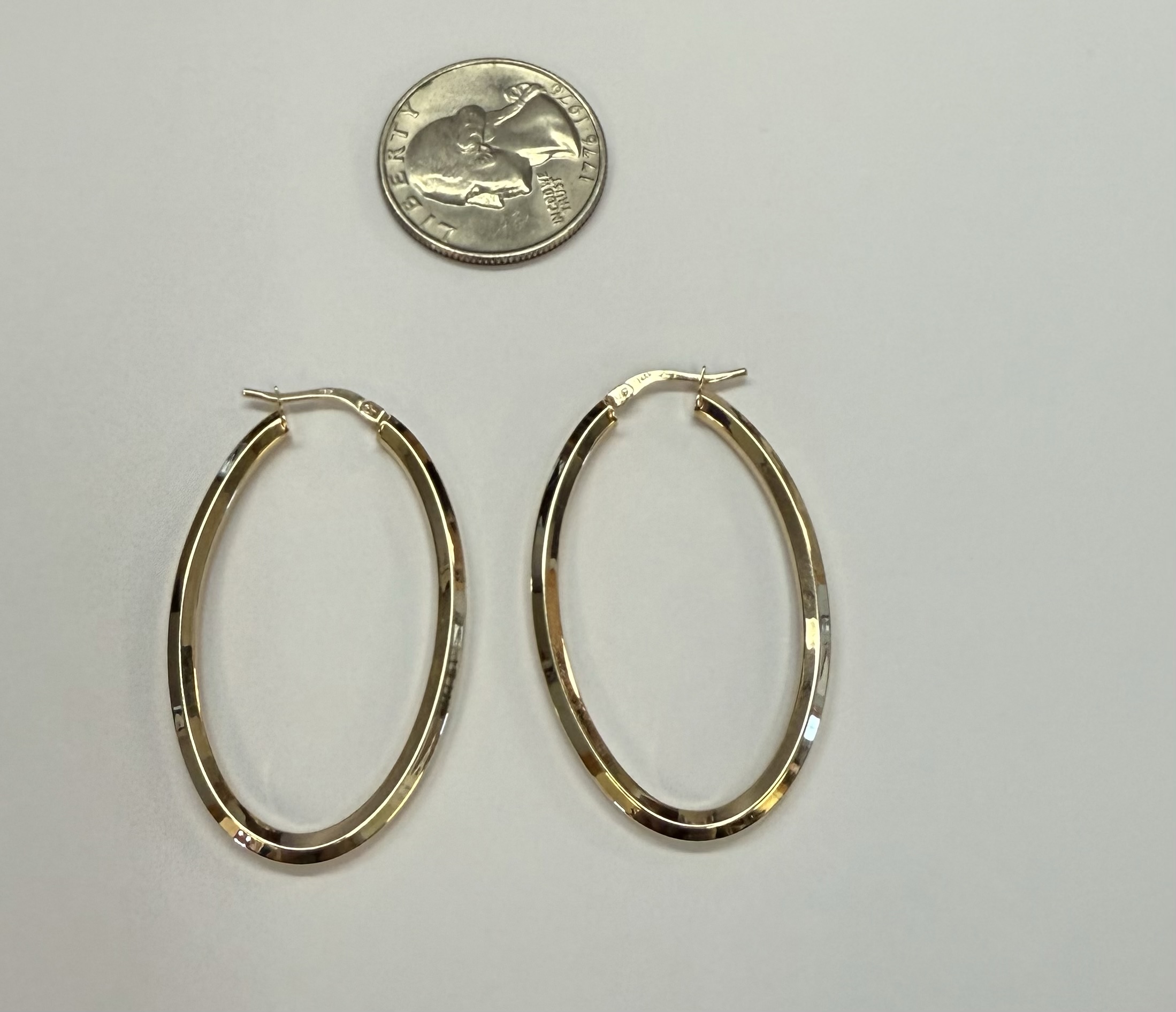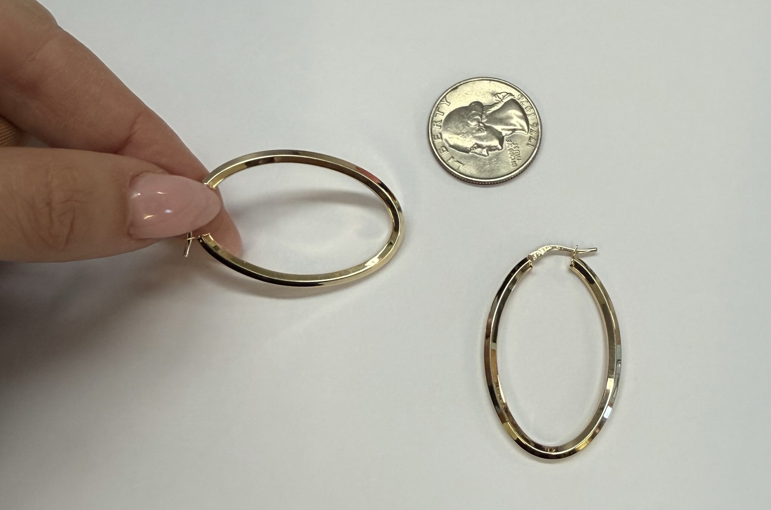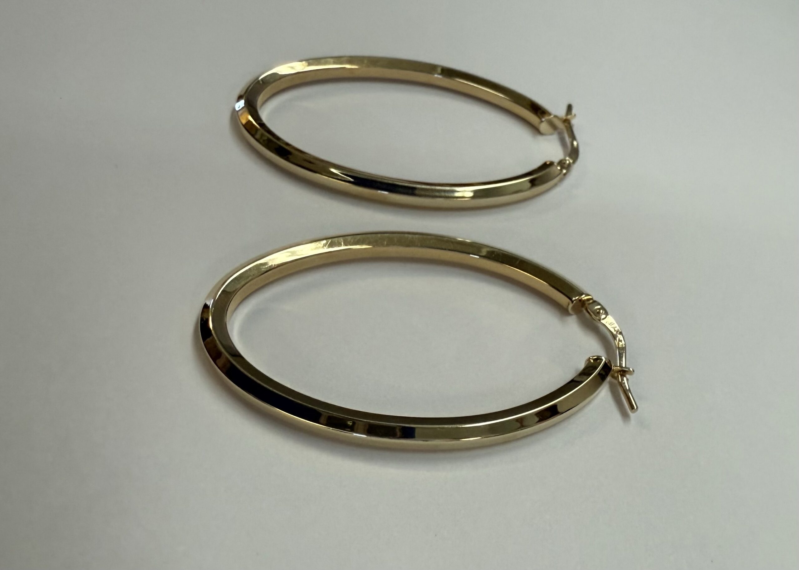 14k yellow gold delicate oval shaped 3 mm hoop earrings. These earrings have an entire weight of 2.6 grams.