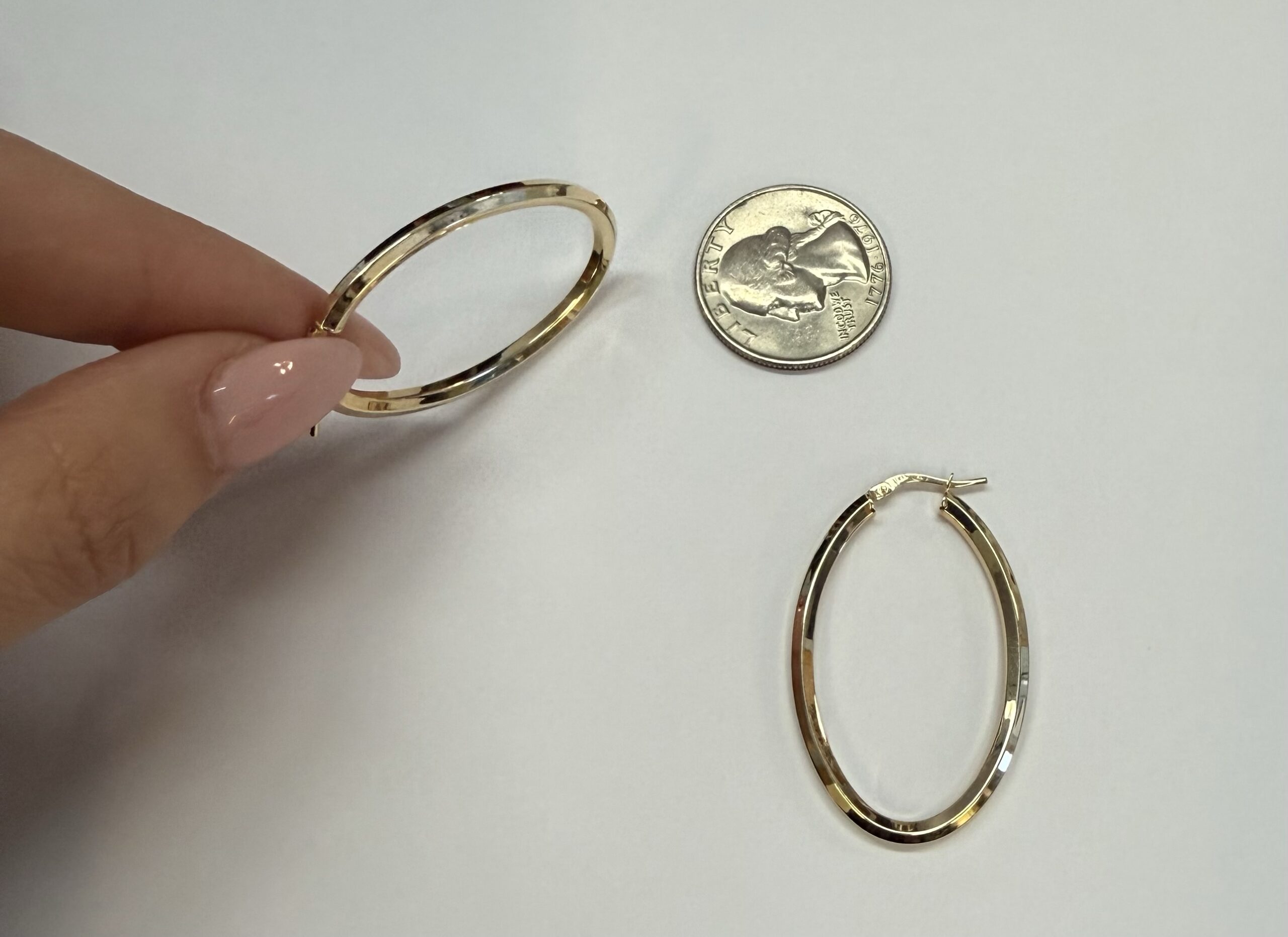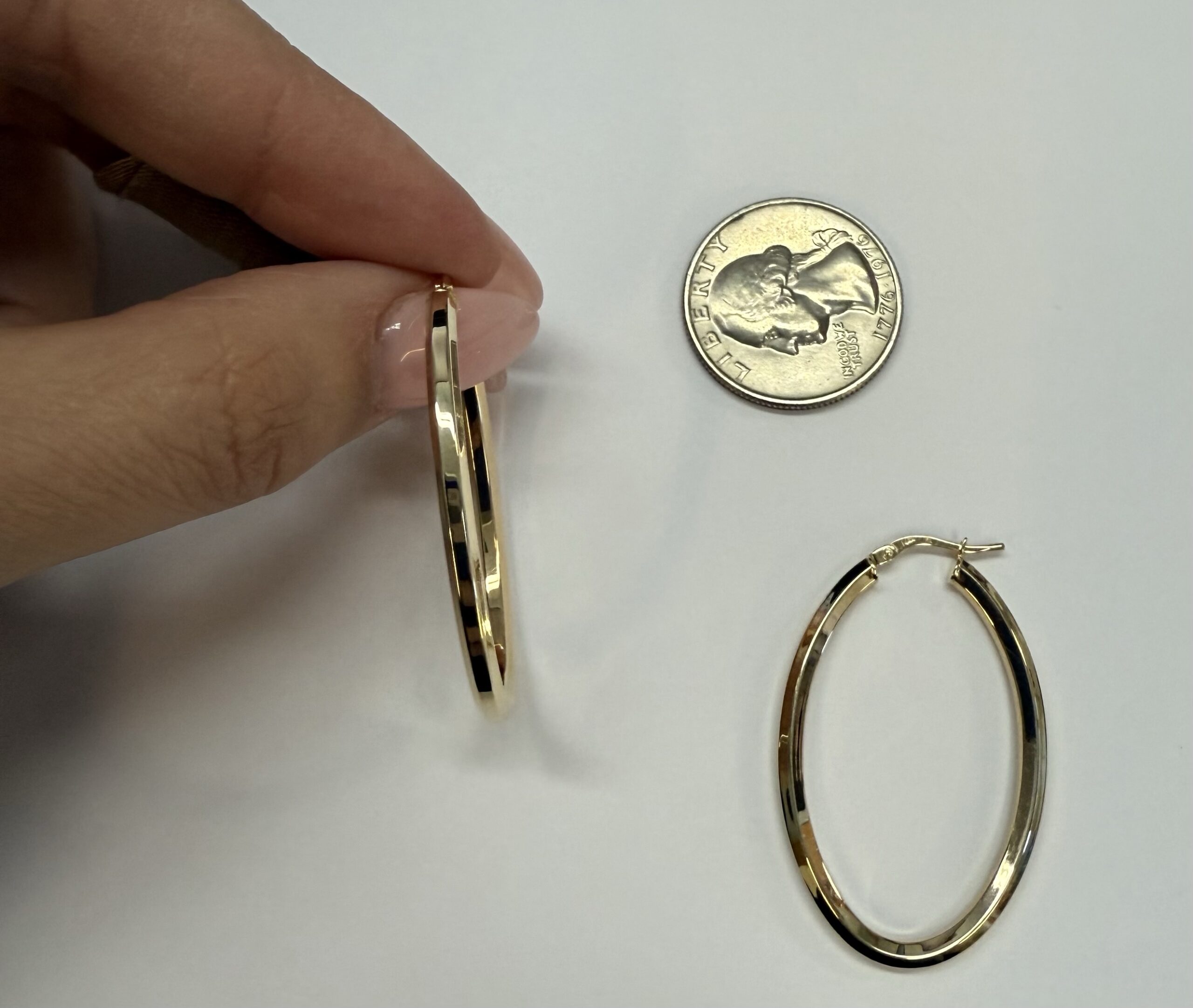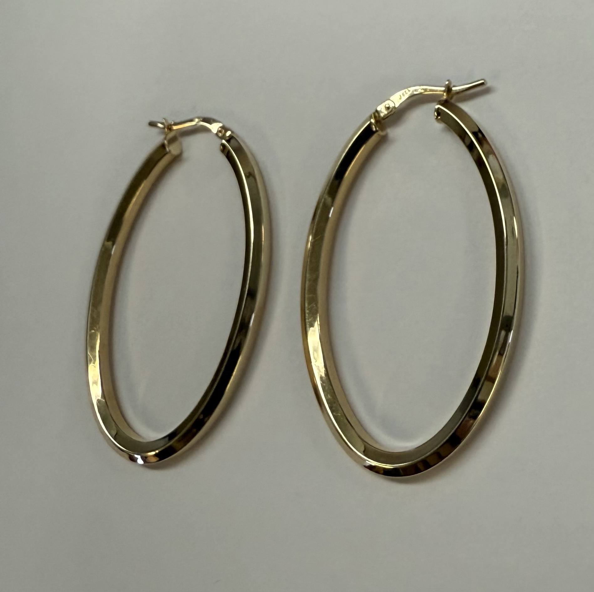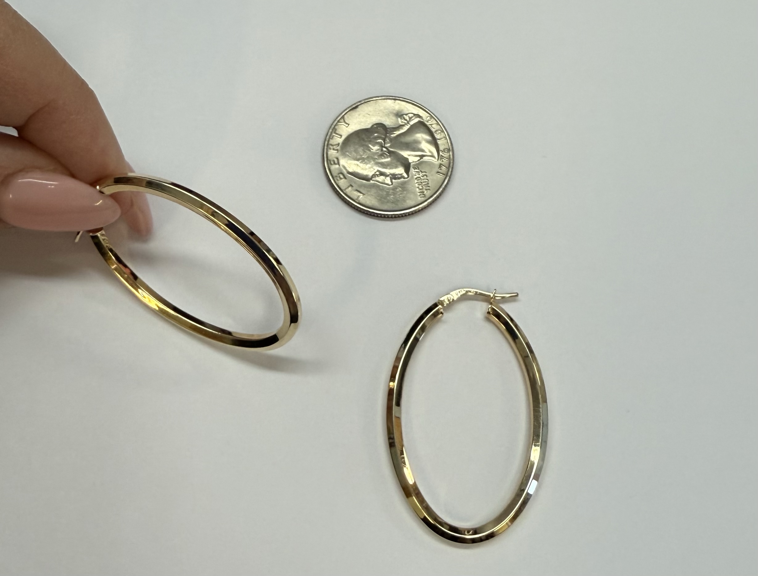 14k yellow gold delicate oval shaped 3 mm hoop earrings. These earrings have an entire weight of 2.6 grams.