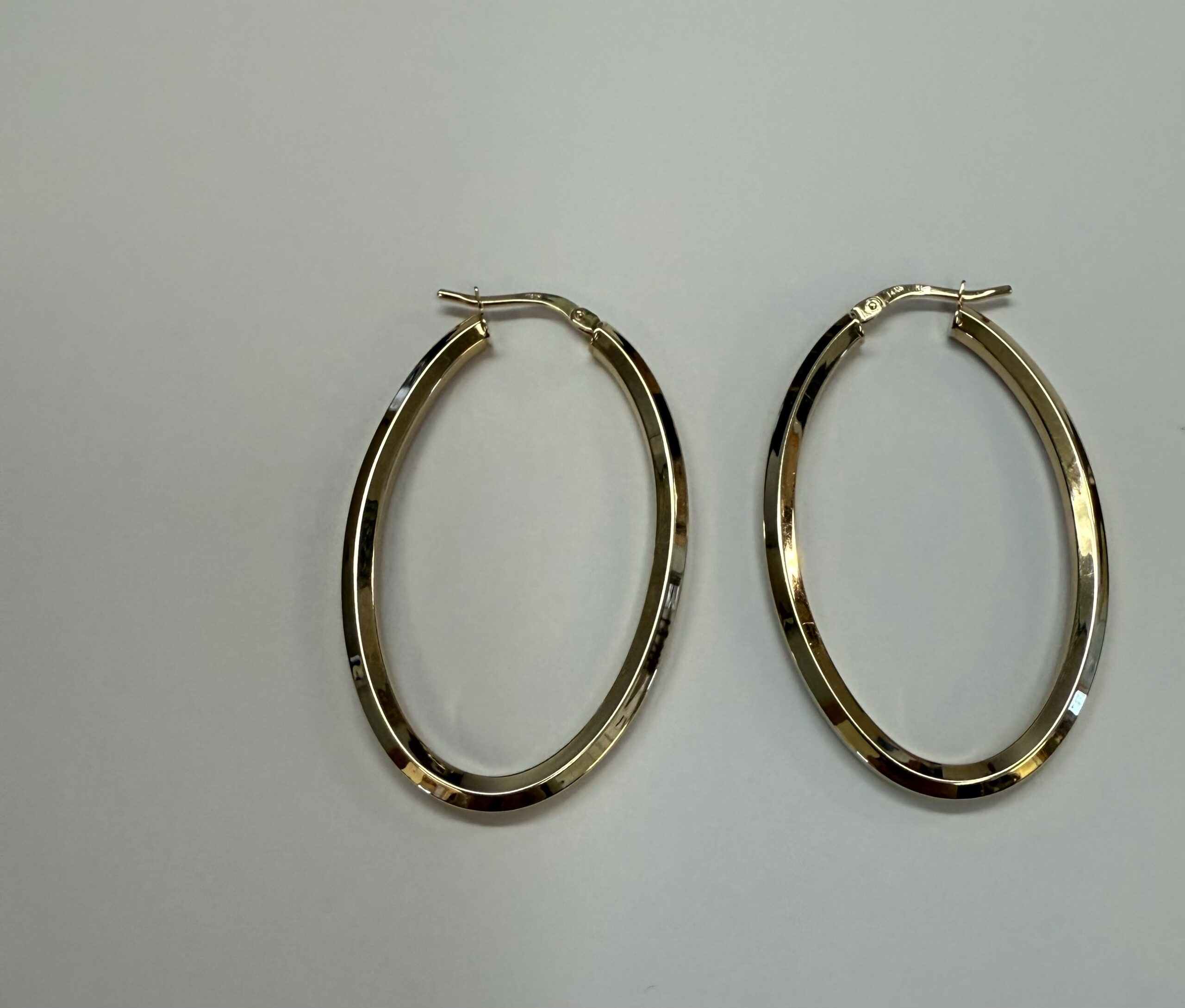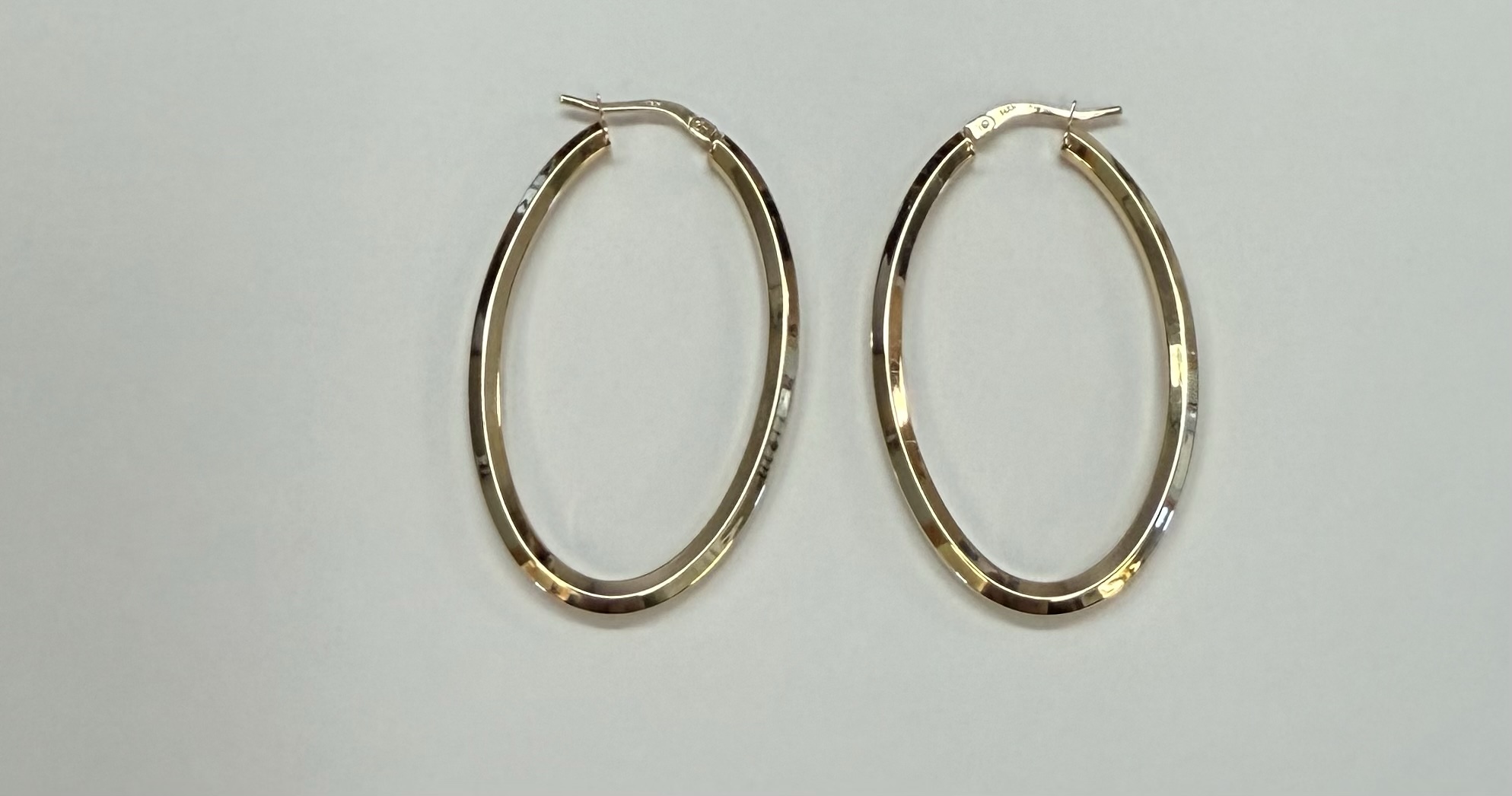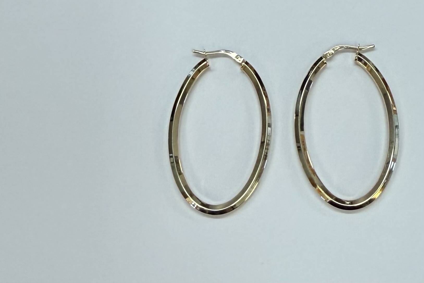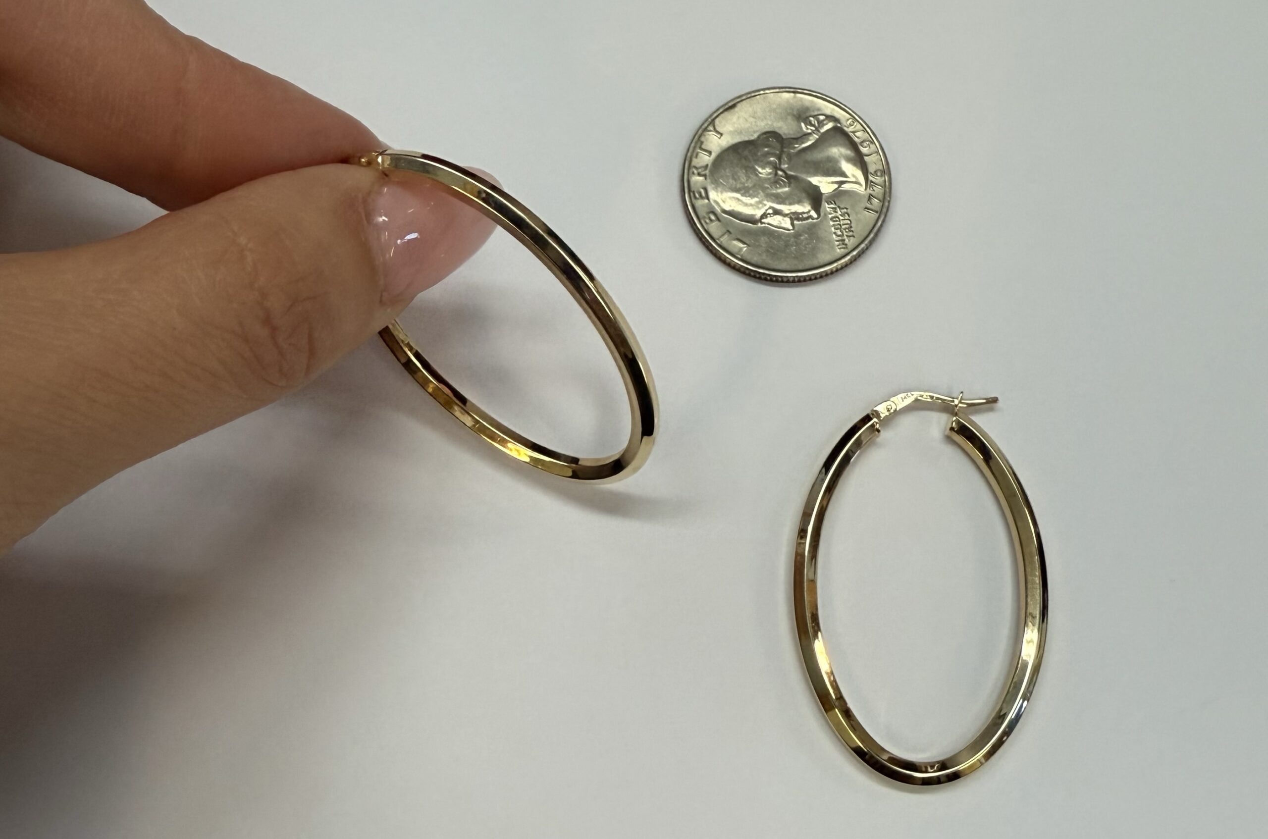 14k yellow gold delicate oval shaped 3 mm hoop earrings. These earrings have an entire weight of 2.6 grams.