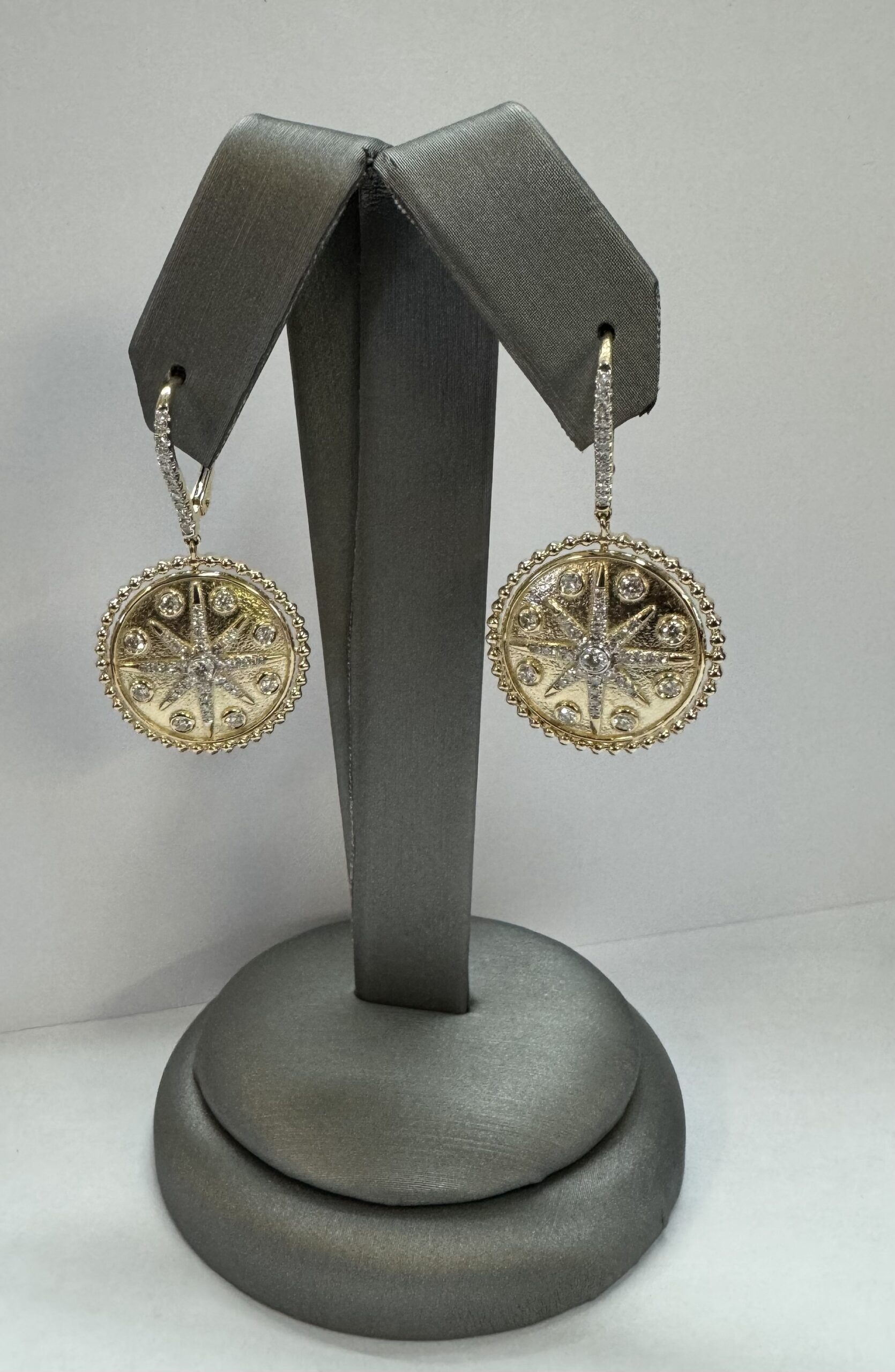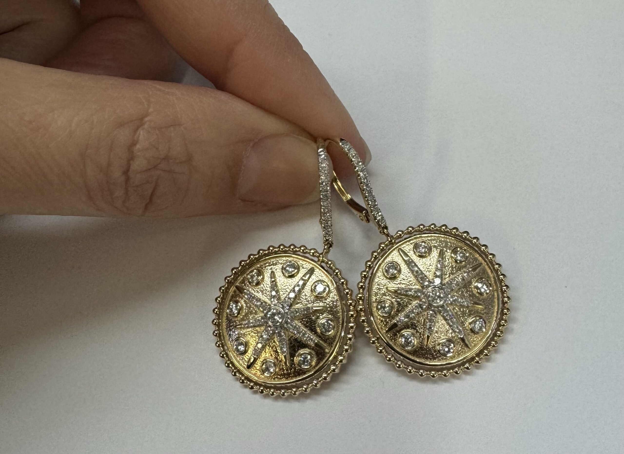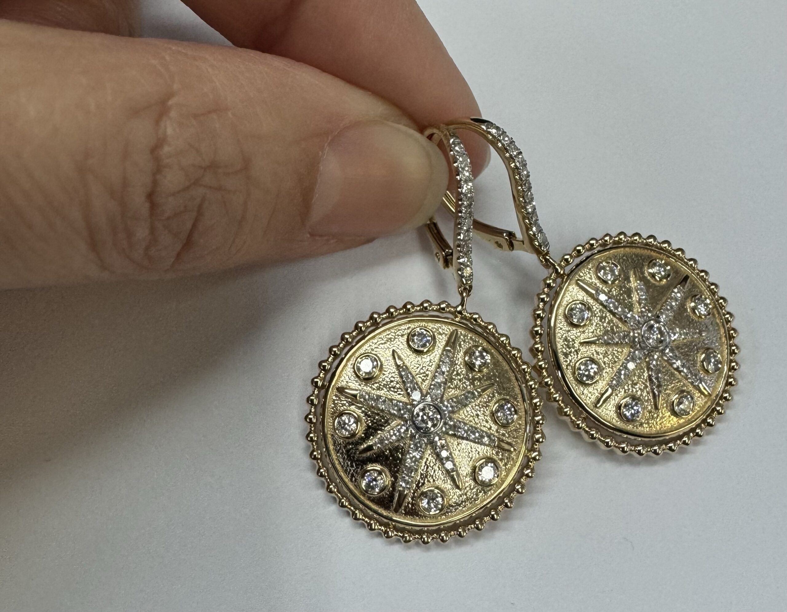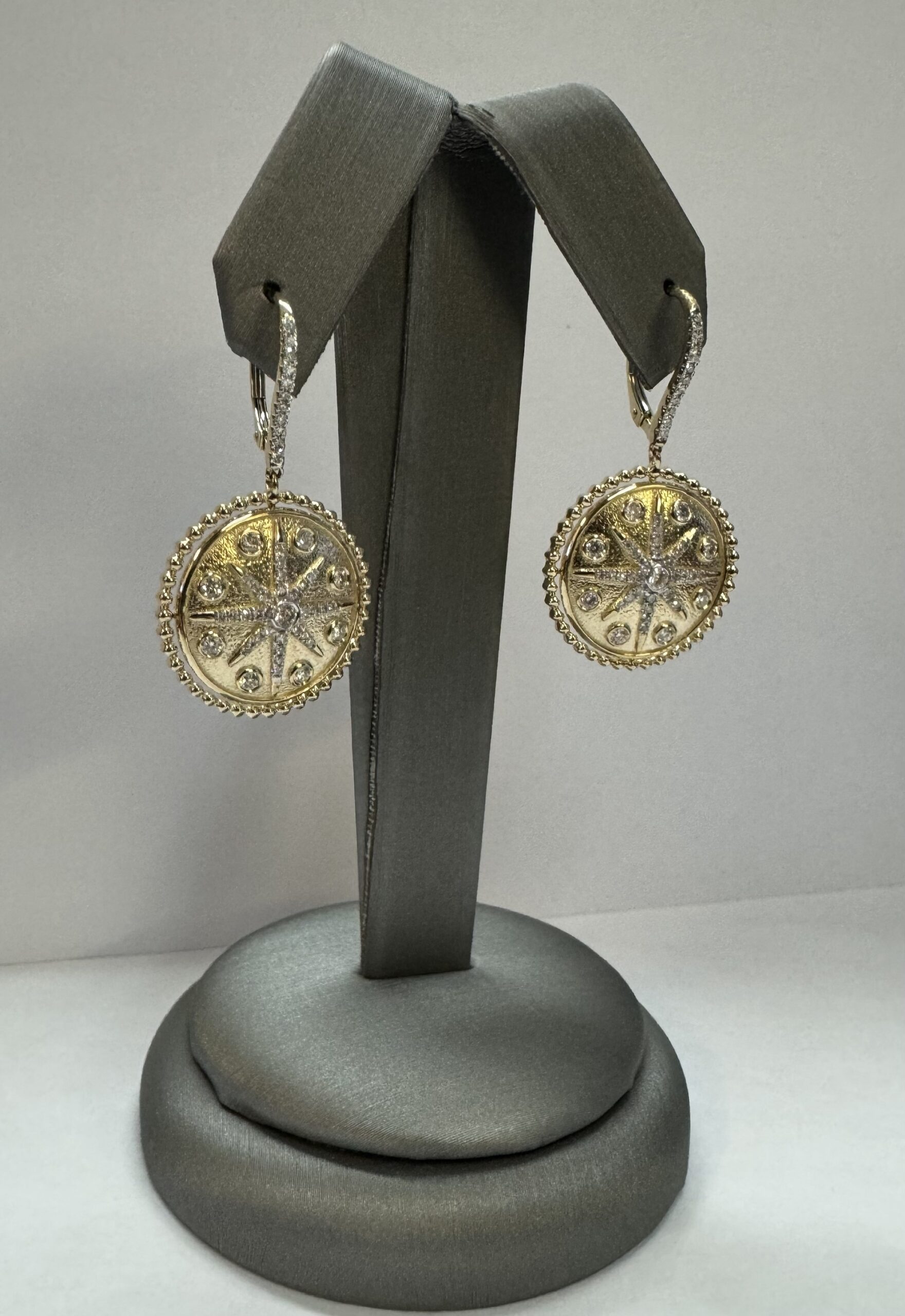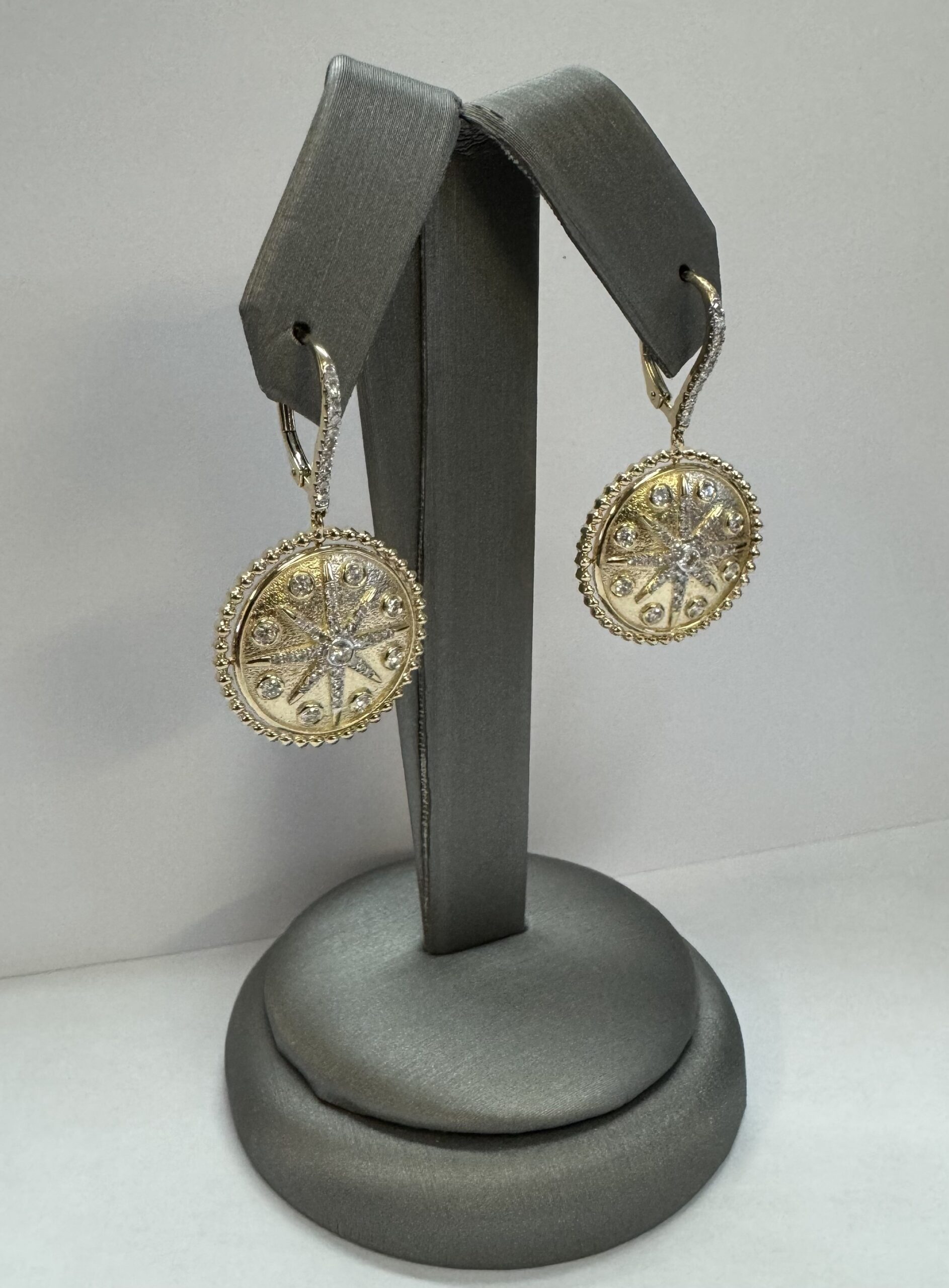 Ugh, THESE ones are just stunning! 14k yellow gold 21 mm disc dangle lever back earrings enhanced with .41 cttw of genuine Full Cut diamonds & .33 cttw of genuine Single Cut diamonds. These average G in color and SI1 in clarity. These earrings have an entire weight of 7.5 grams. Only one pair available.