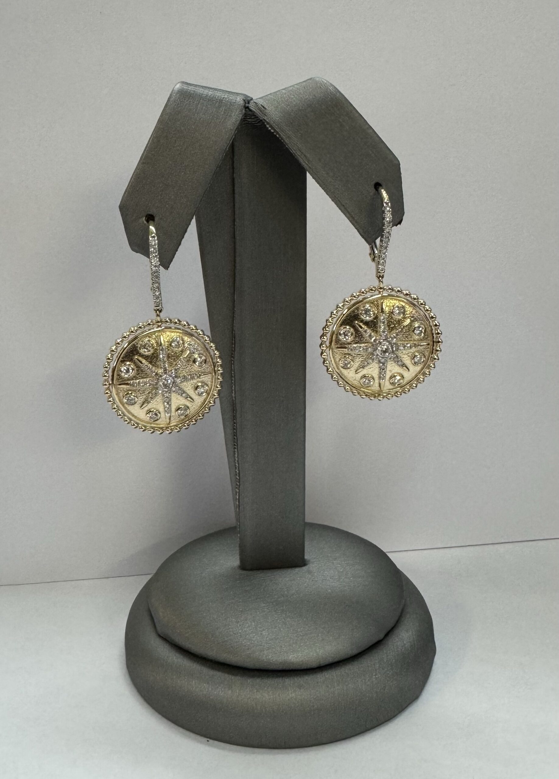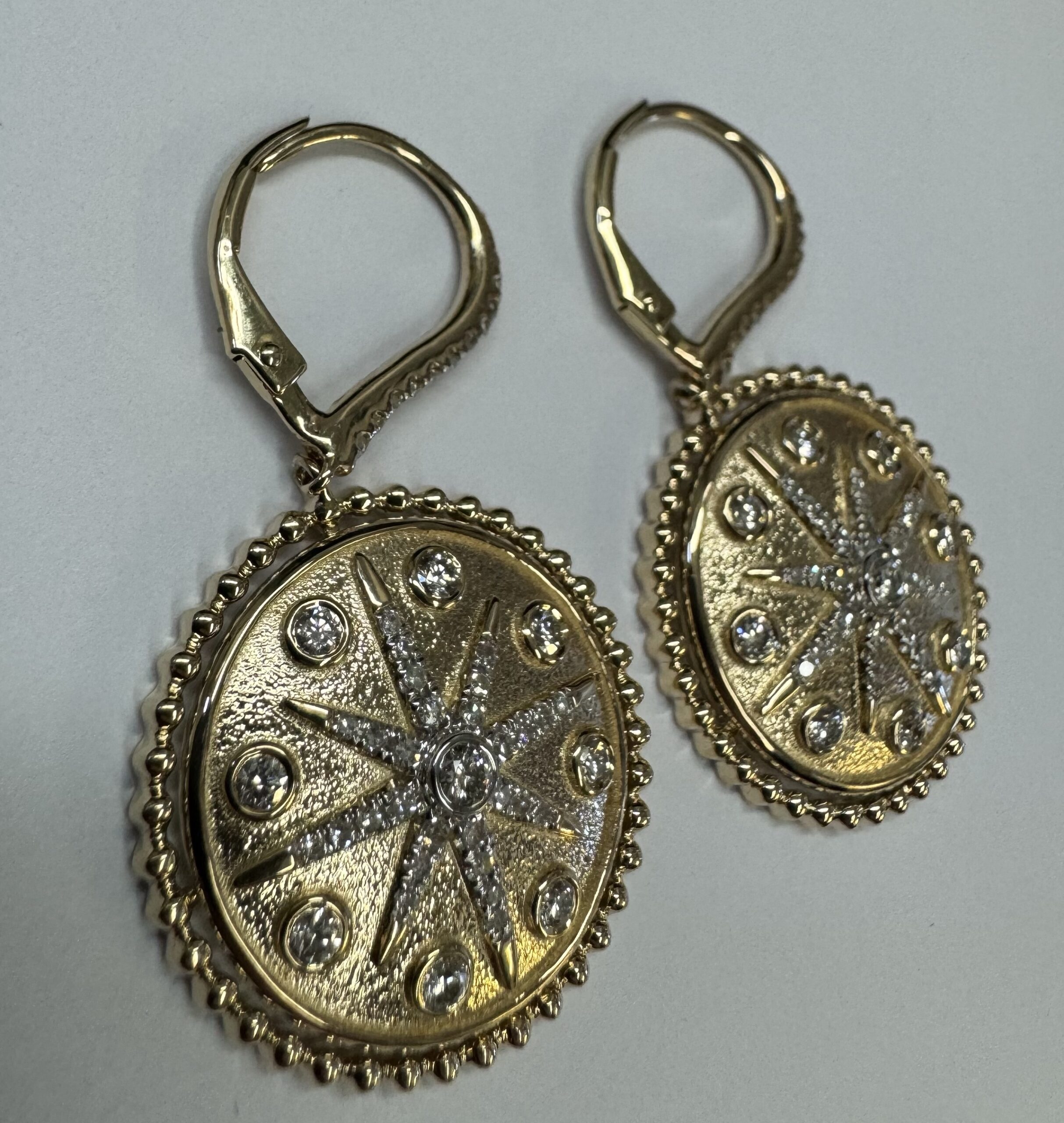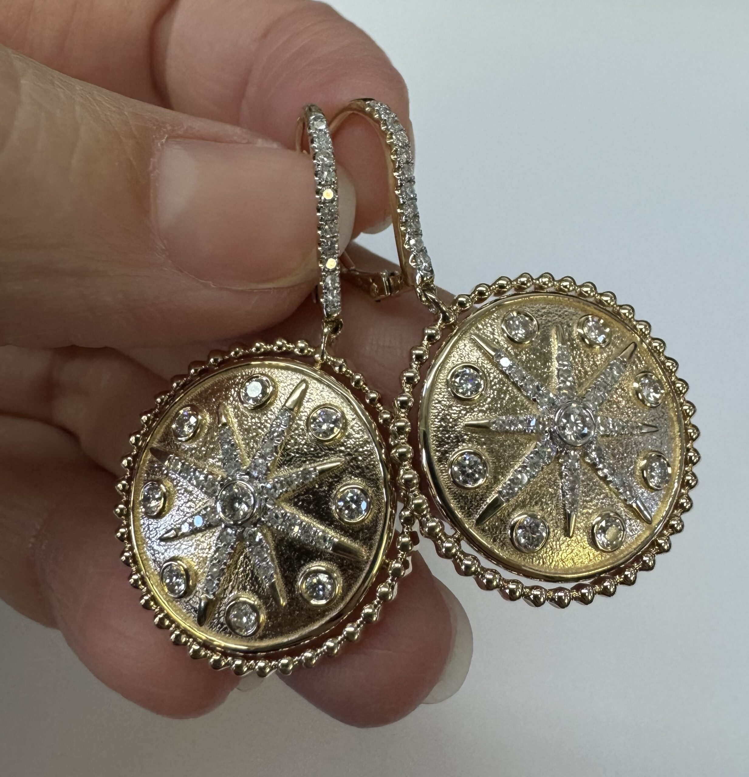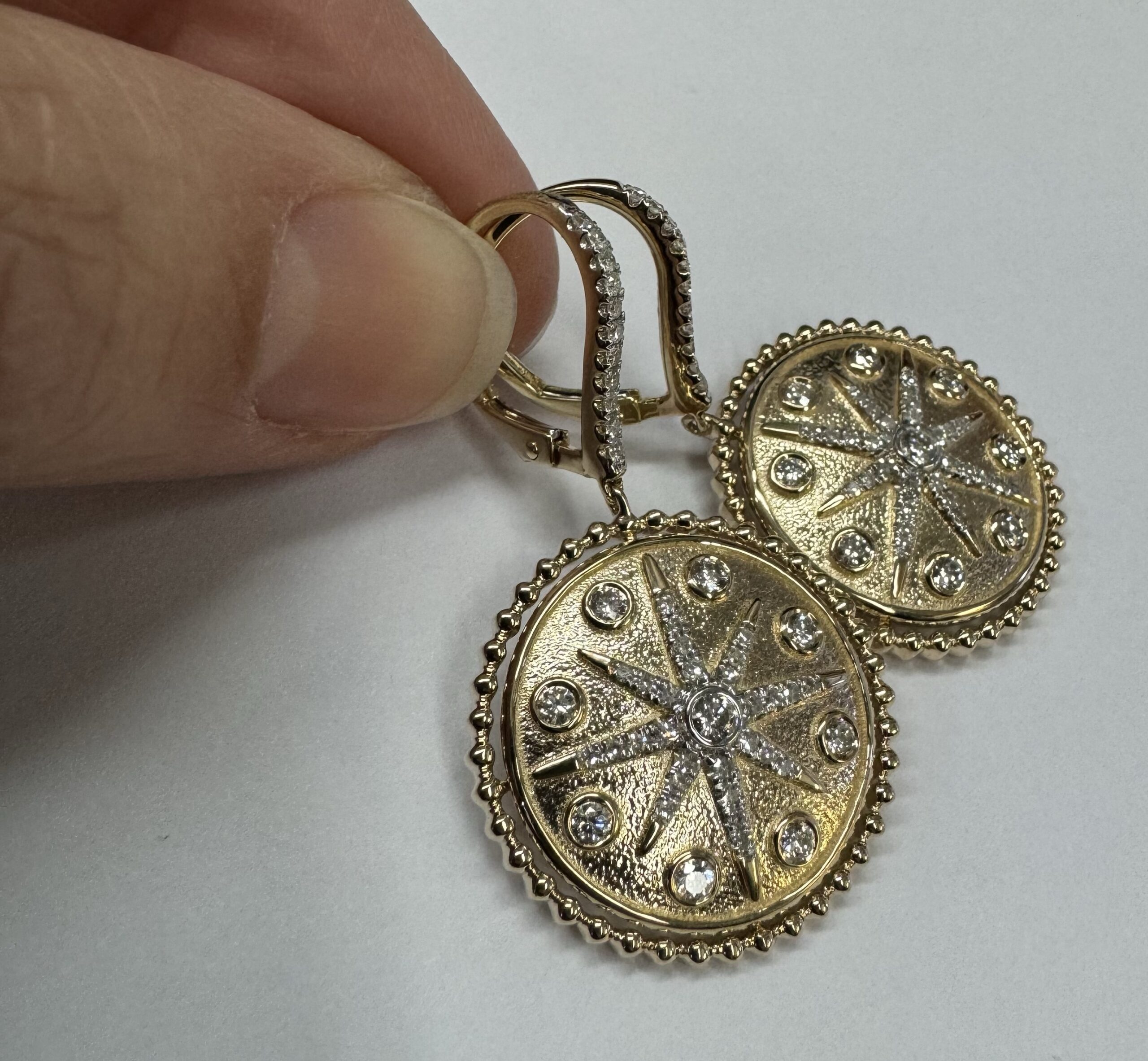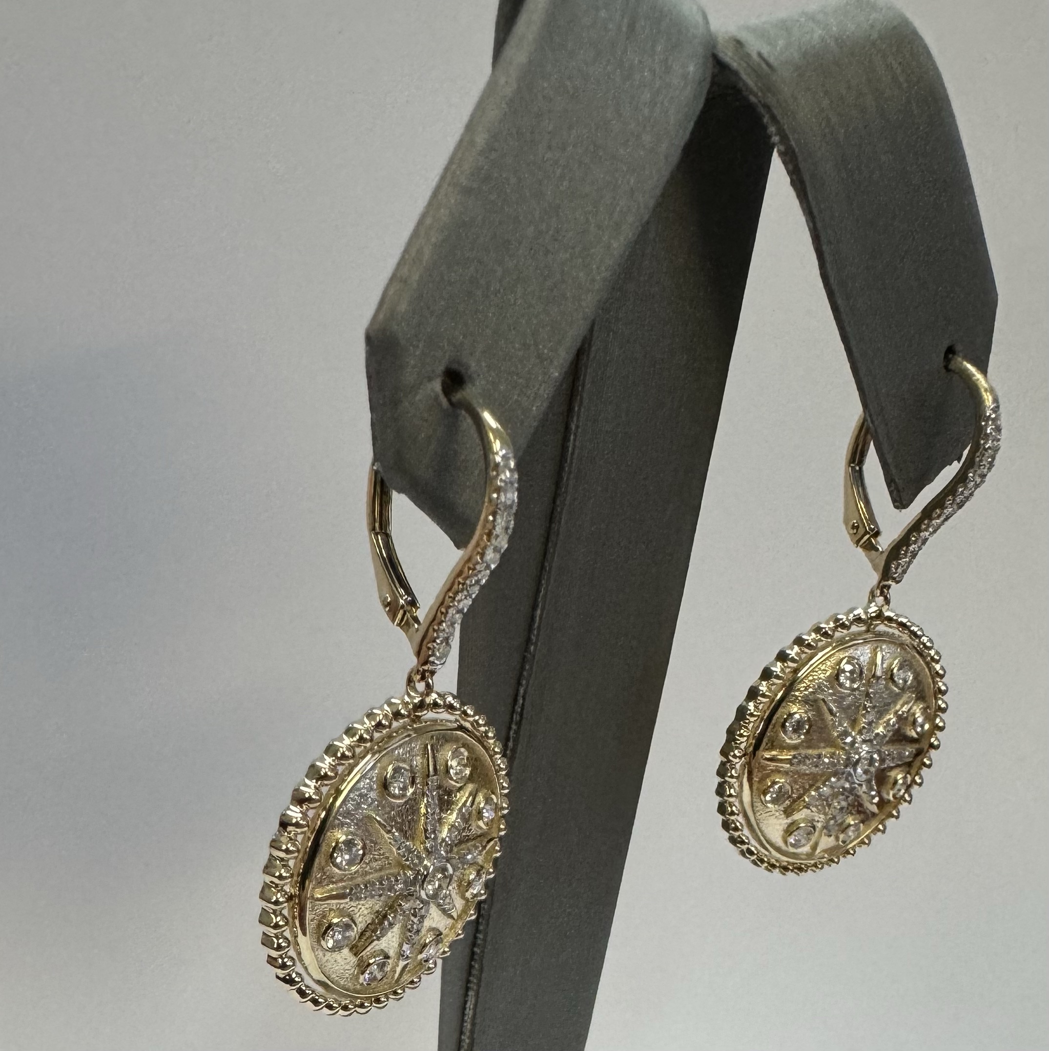 Ugh, THESE ones are just stunning! 14k yellow gold 21 mm disc dangle lever back earrings enhanced with .41 cttw of genuine Full Cut diamonds & .33 cttw of genuine Single Cut diamonds. These average G in color and SI1 in clarity. These earrings have an entire weight of 7.5 grams. Only one pair available.