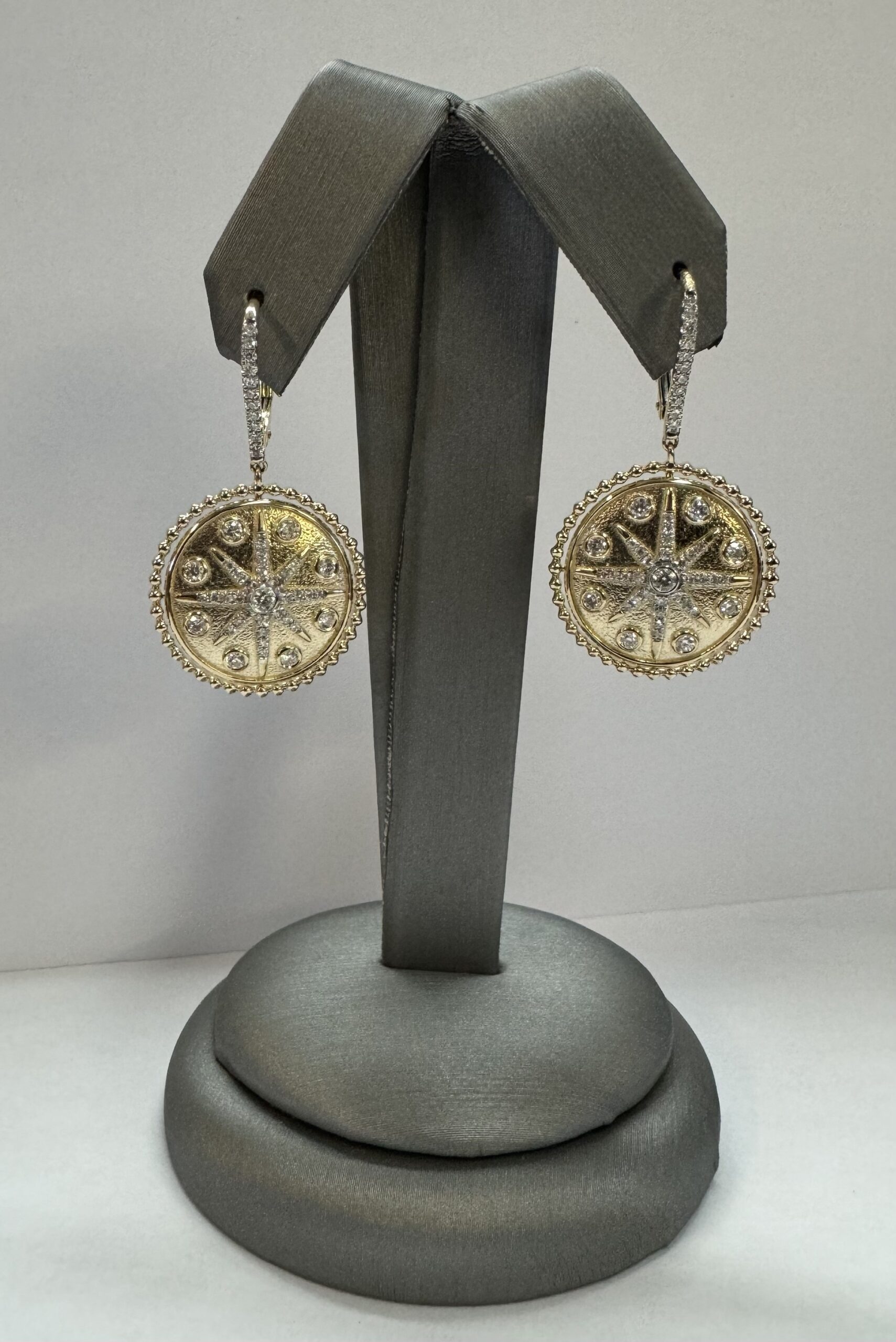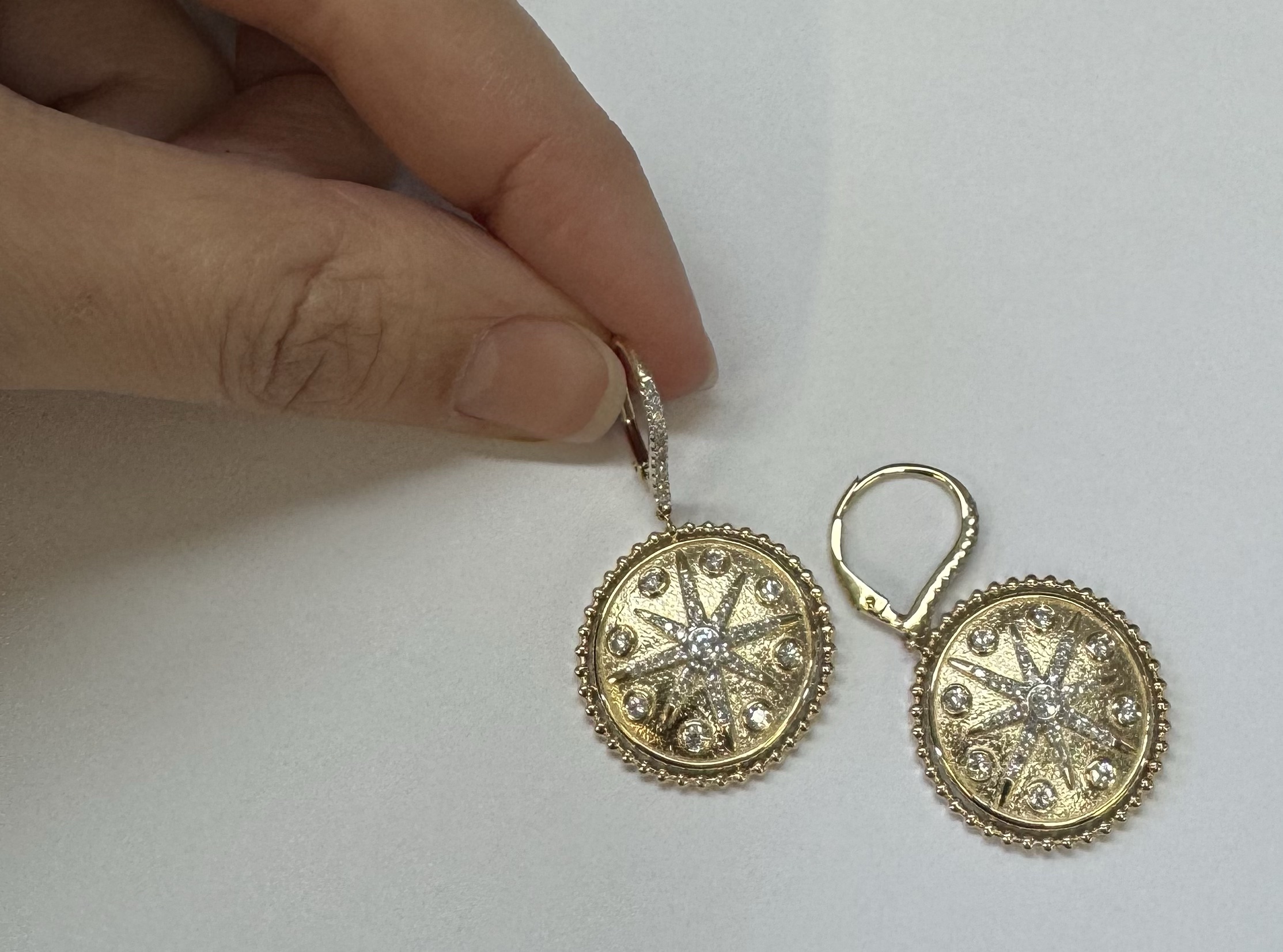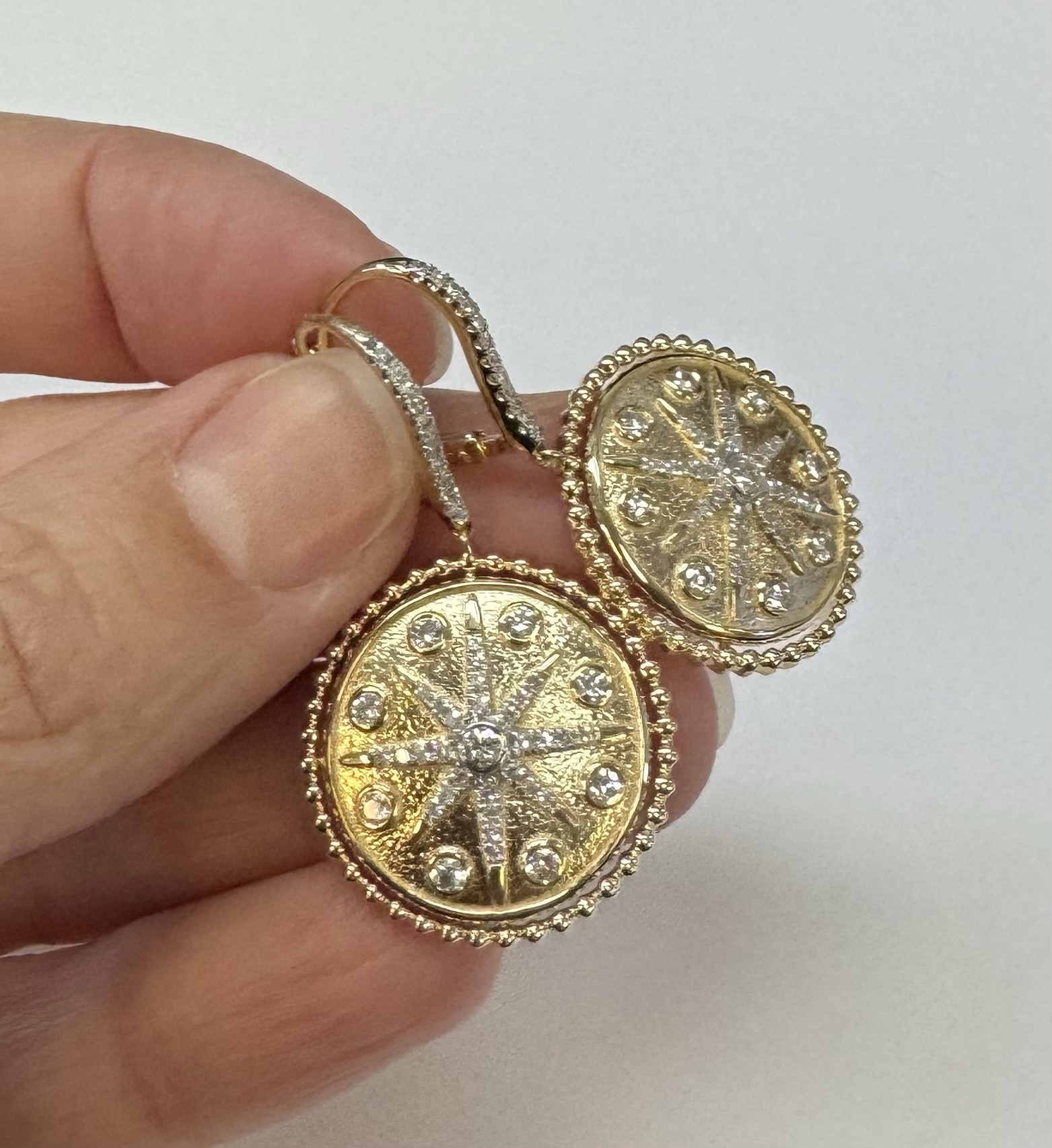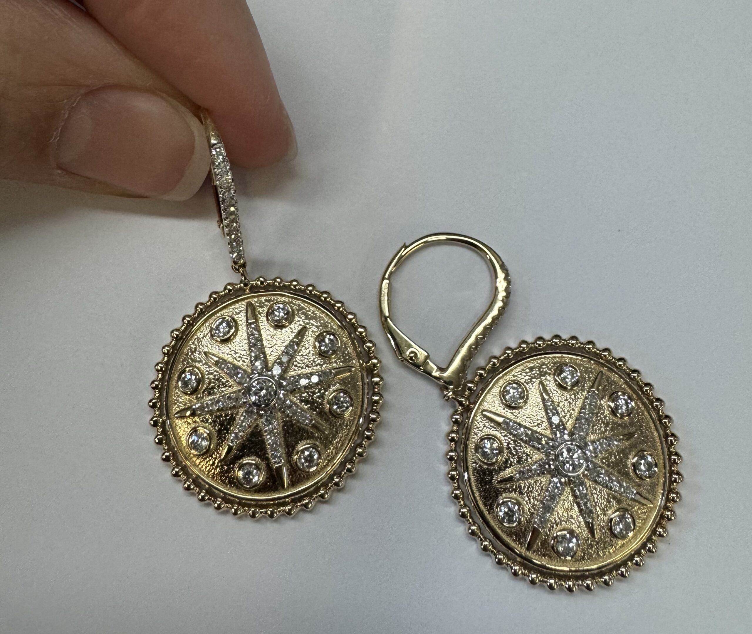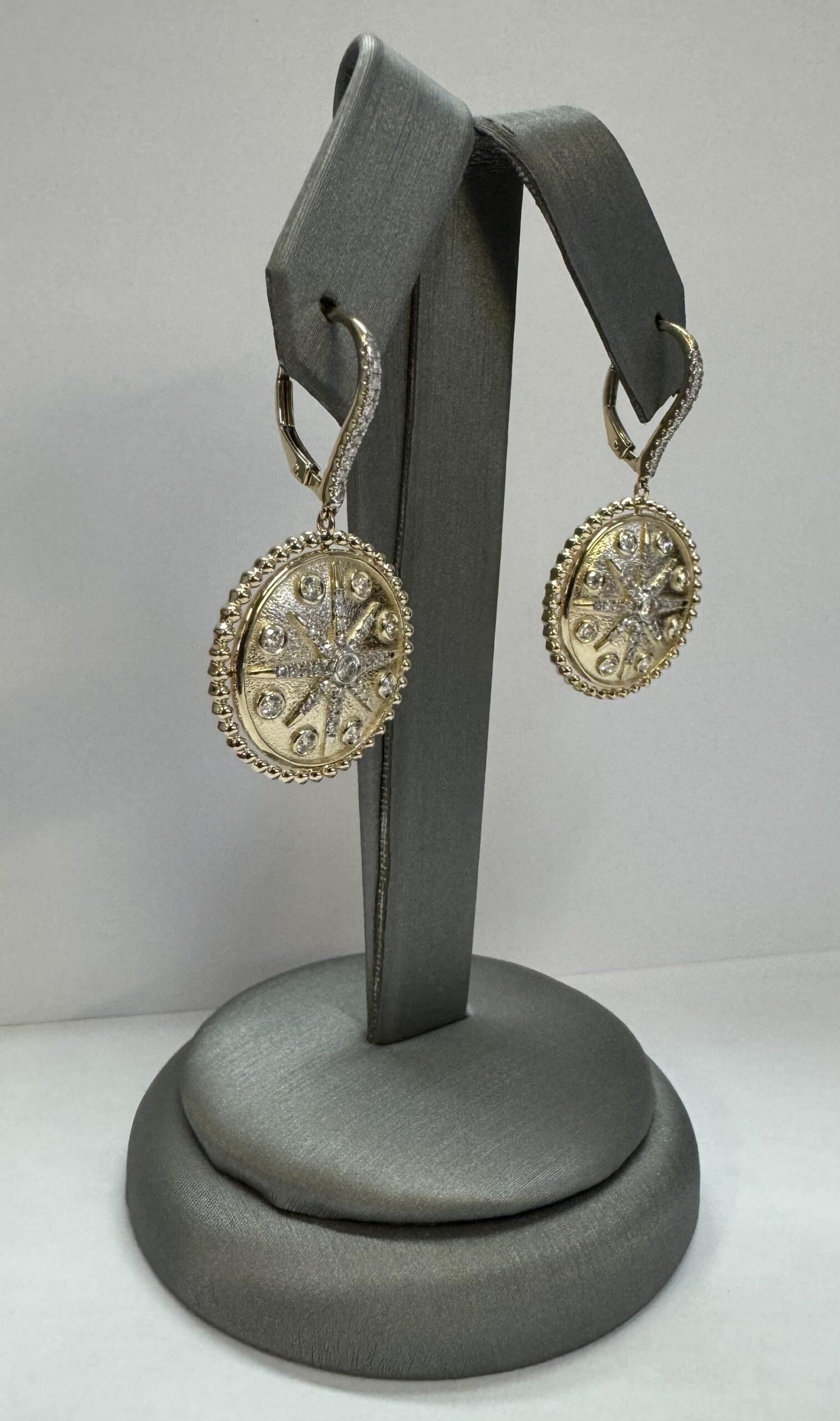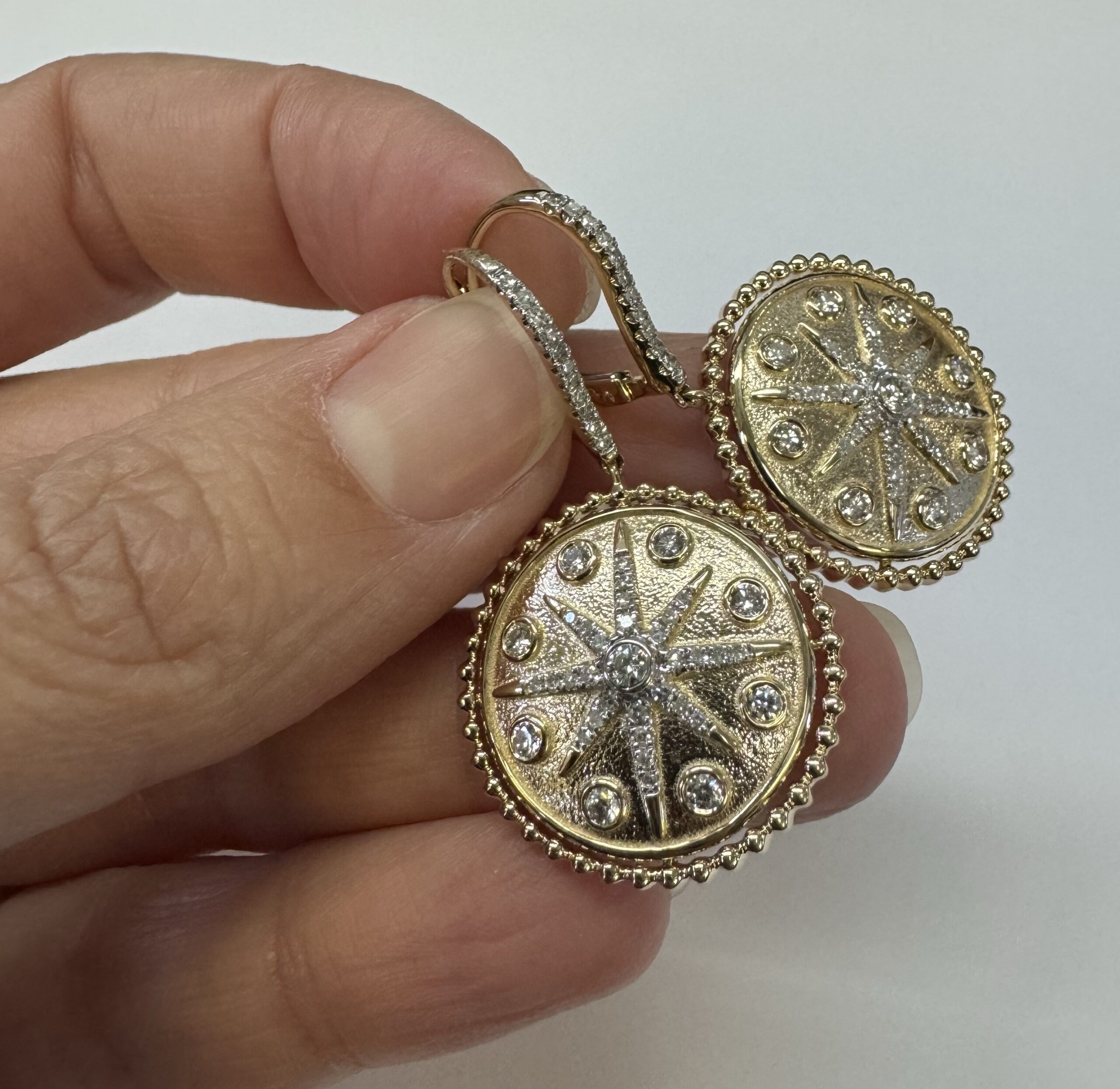 Ugh, THESE ones are just stunning! 14k yellow gold 21 mm disc dangle lever back earrings enhanced with .41 cttw of genuine Full Cut diamonds & .33 cttw of genuine Single Cut diamonds. These average G in color and SI1 in clarity. These earrings have an entire weight of 7.5 grams. Only one pair available.