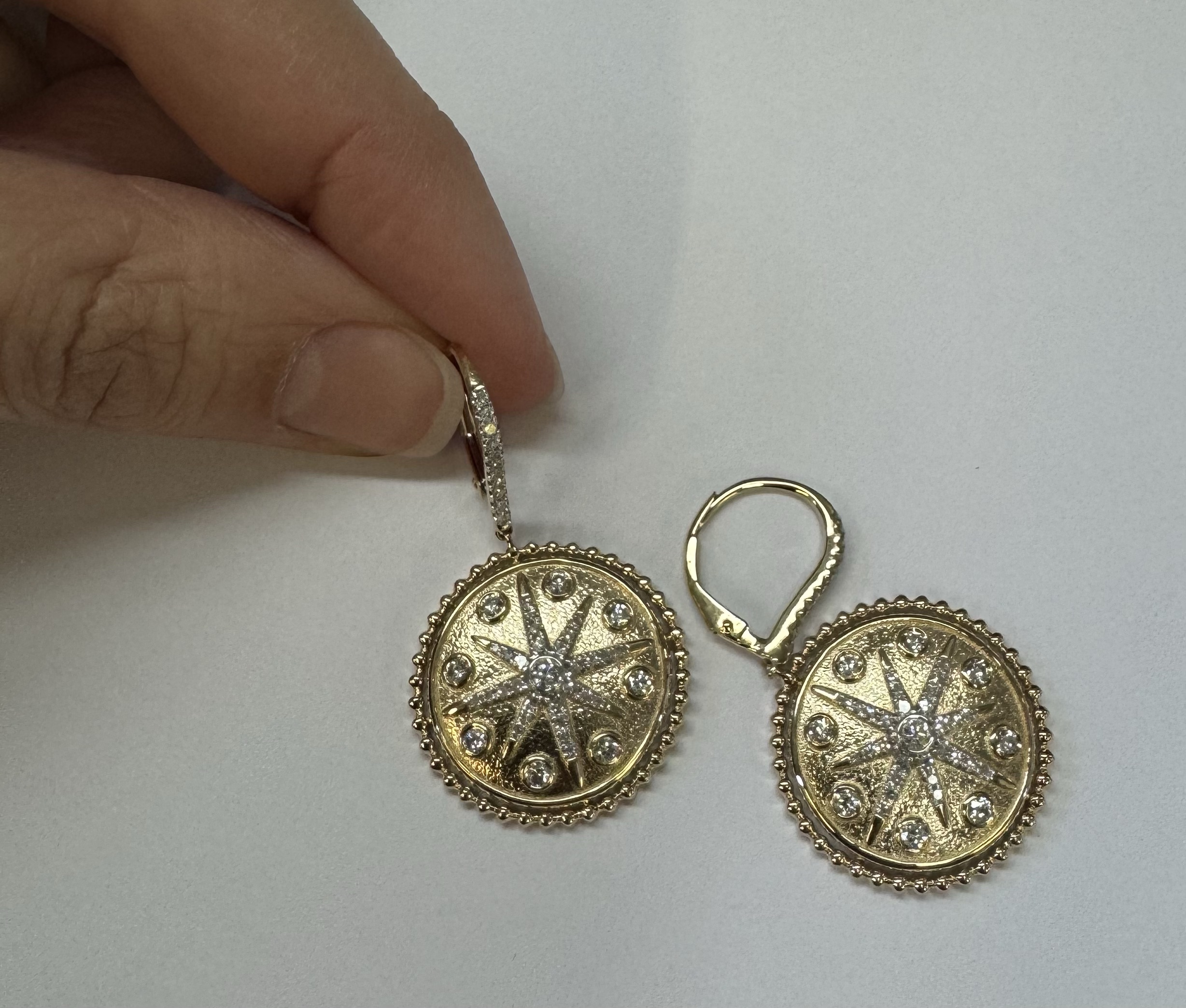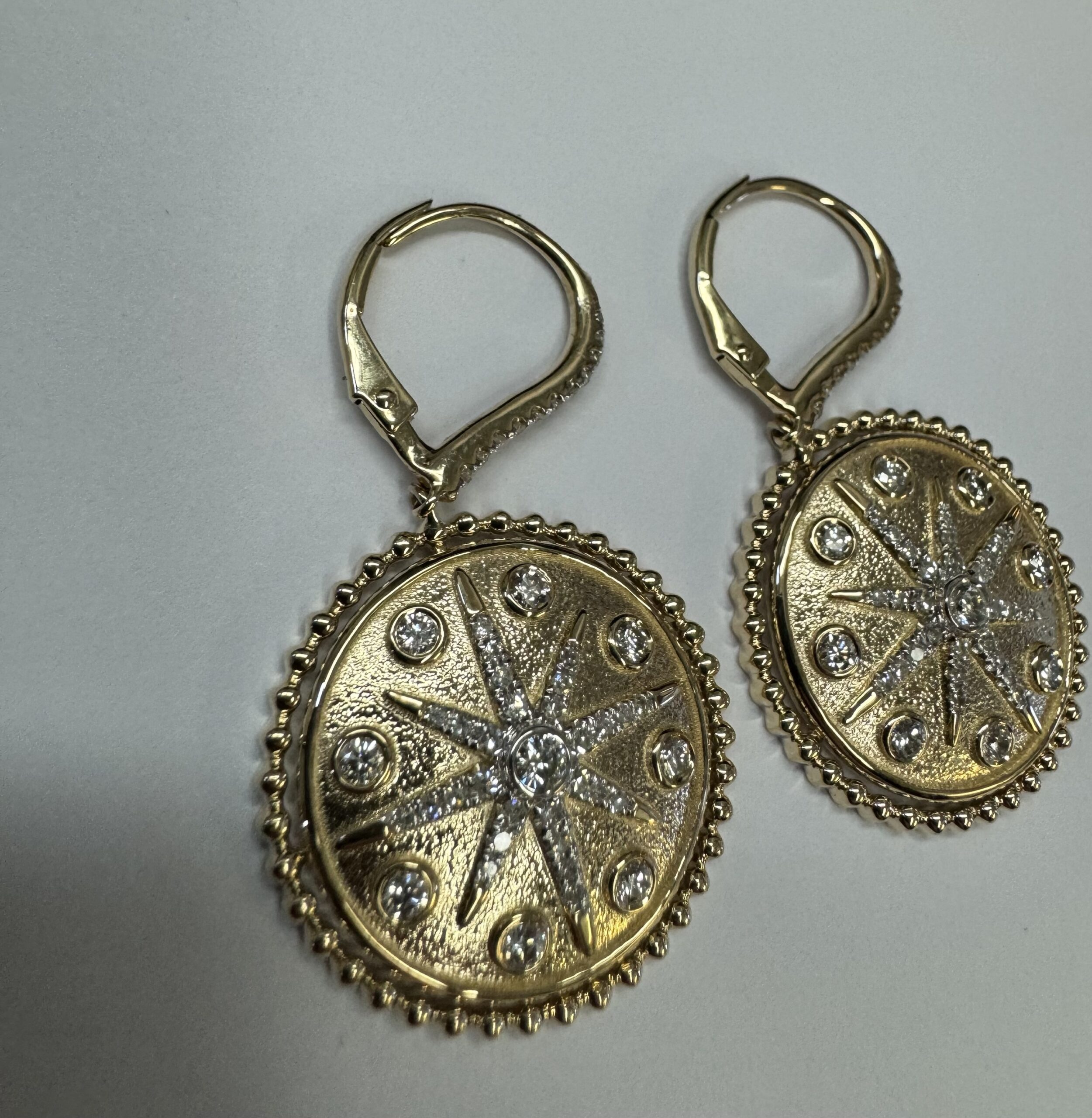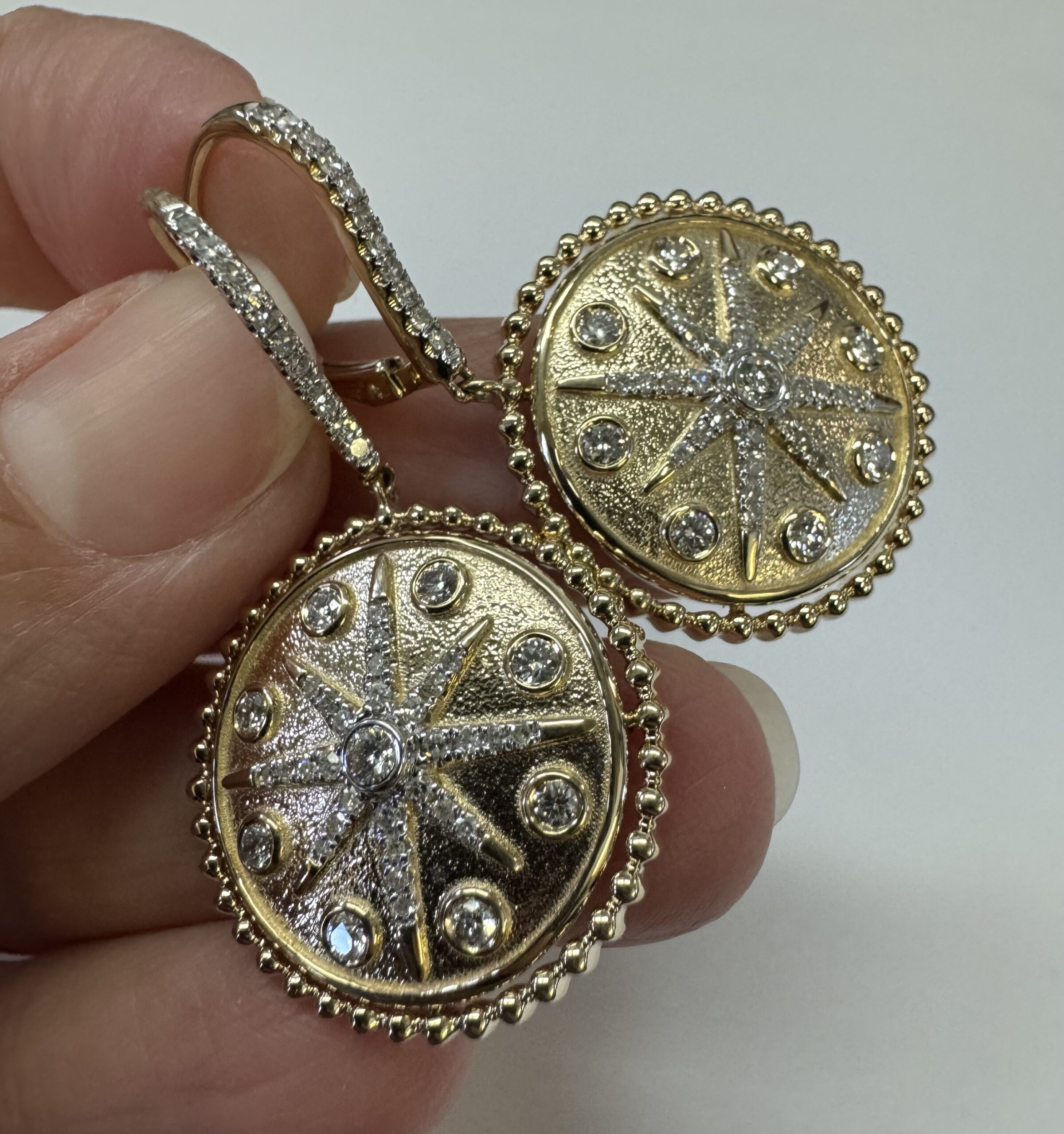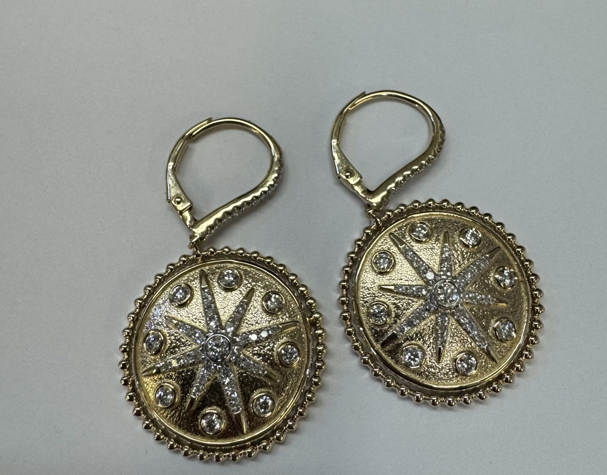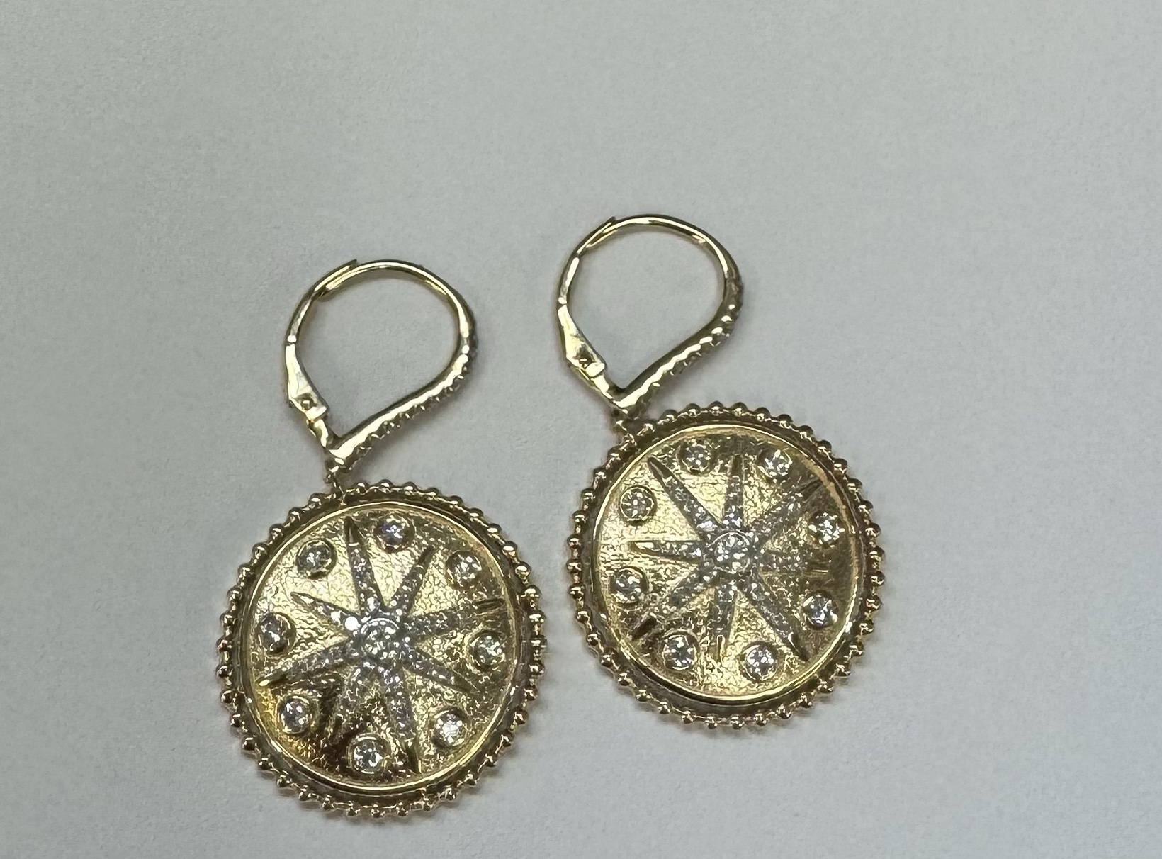 Ugh, THESE ones are just stunning! 14k yellow gold 21 mm disc dangle lever back earrings enhanced with .41 cttw of genuine Full Cut diamonds & .33 cttw of genuine Single Cut diamonds. These average G in color and SI1 in clarity. These earrings have an entire weight of 7.5 grams. Only one pair available.