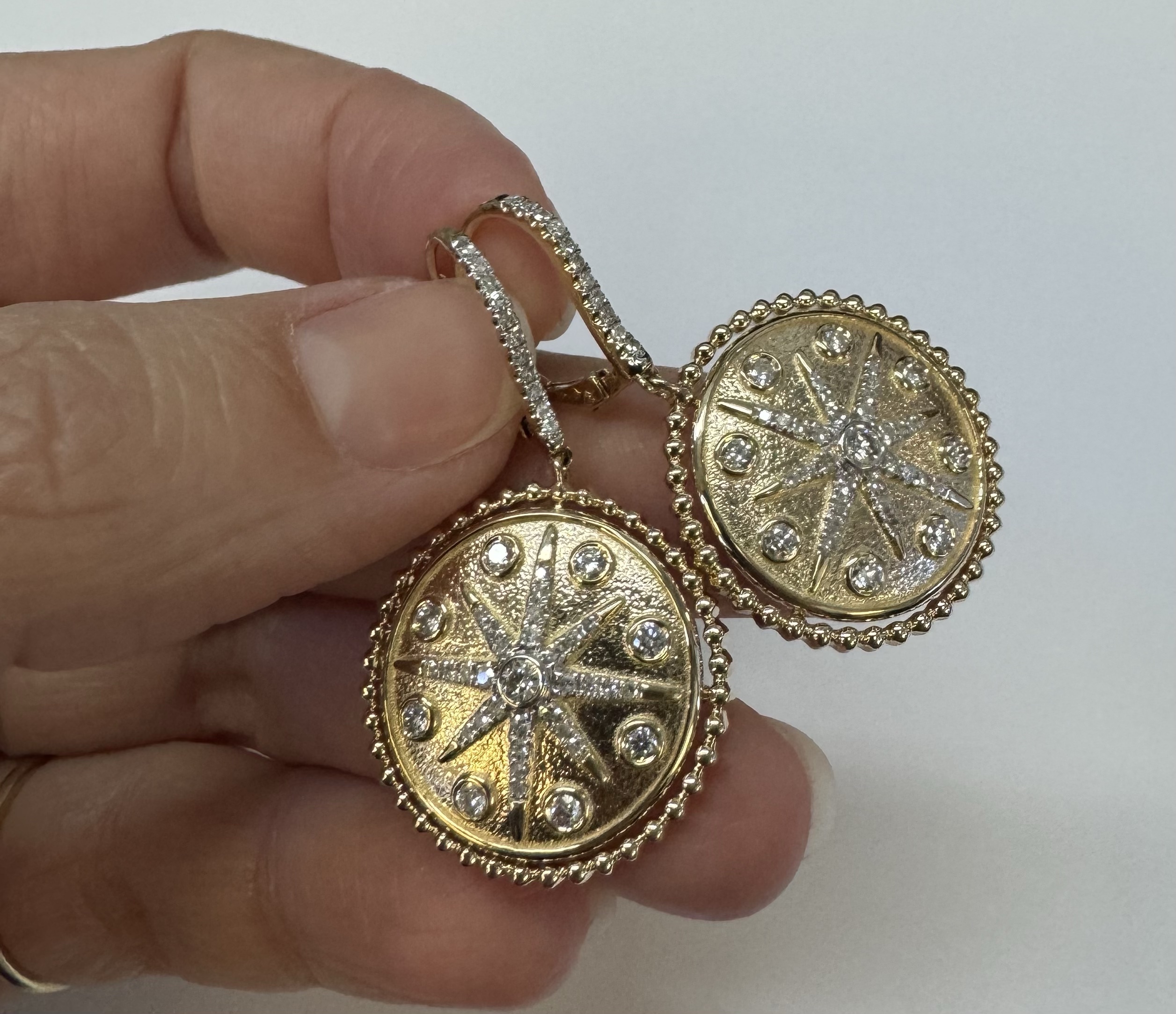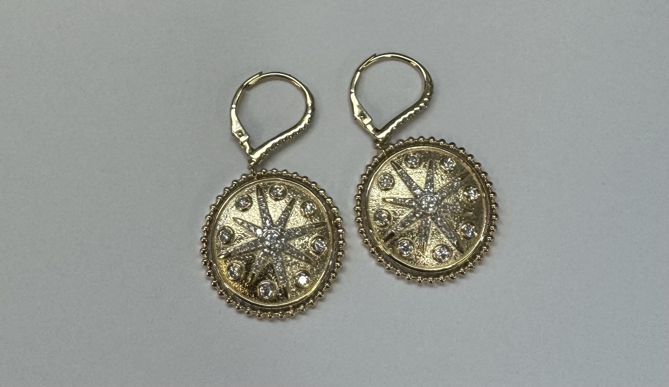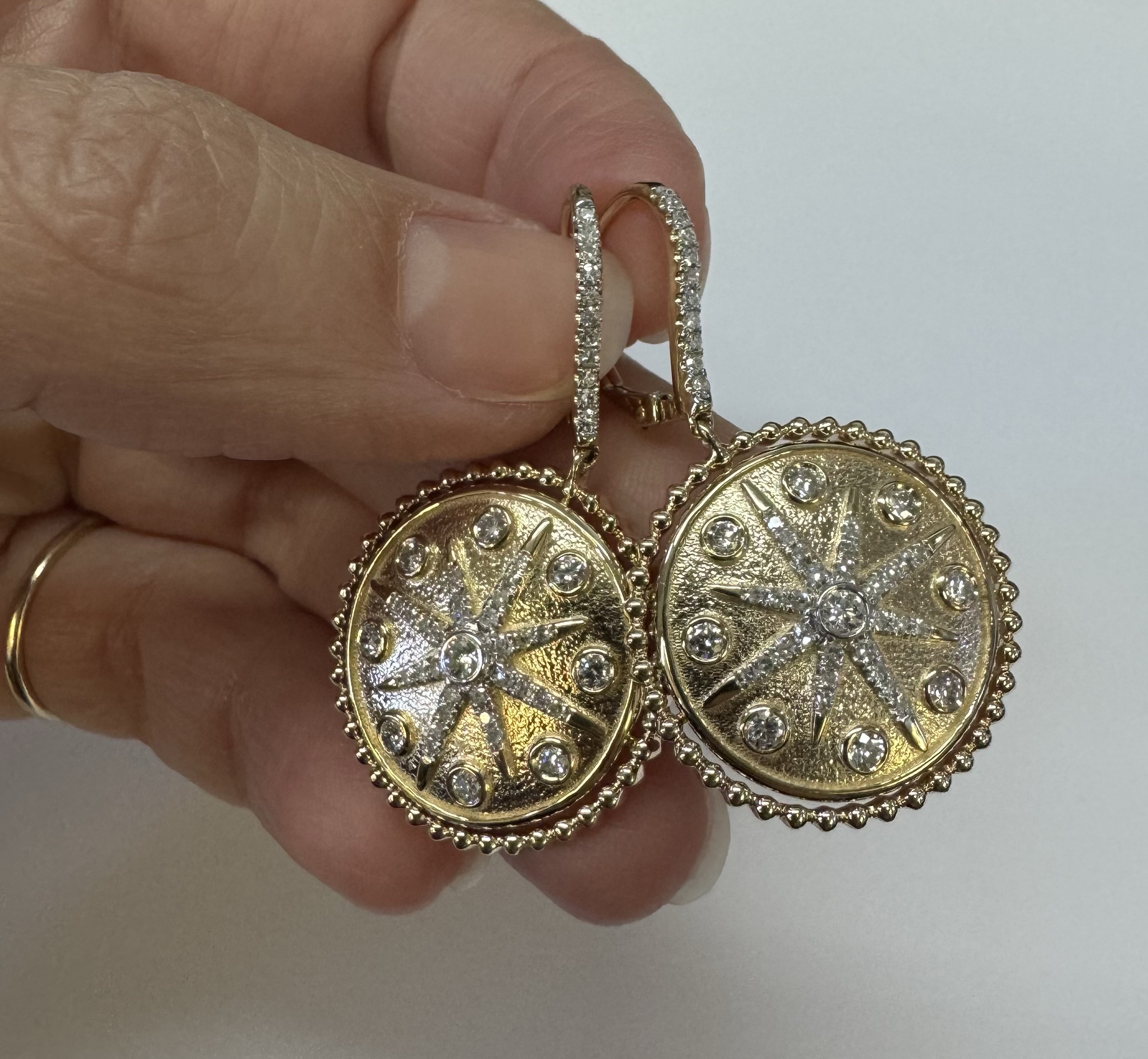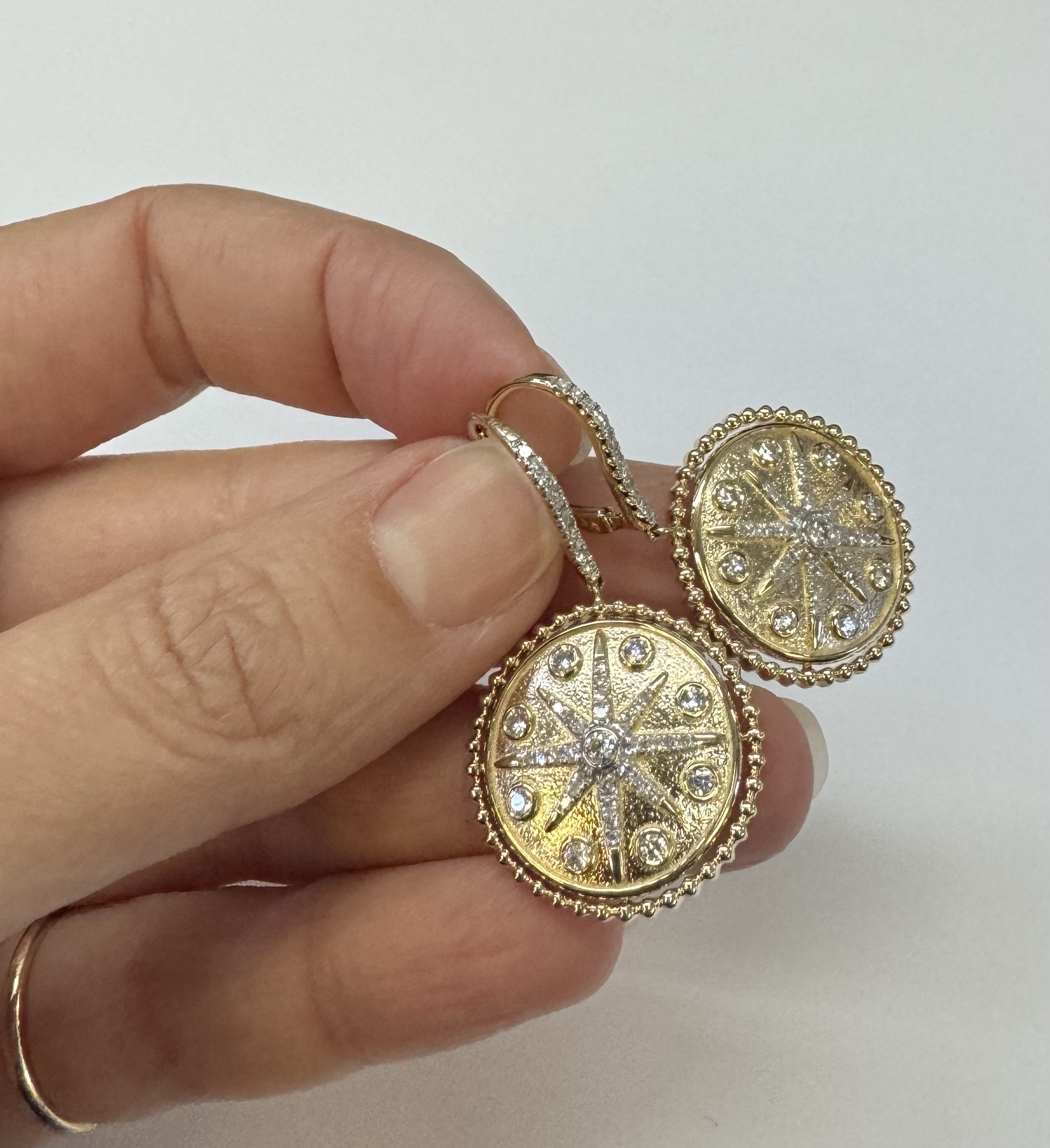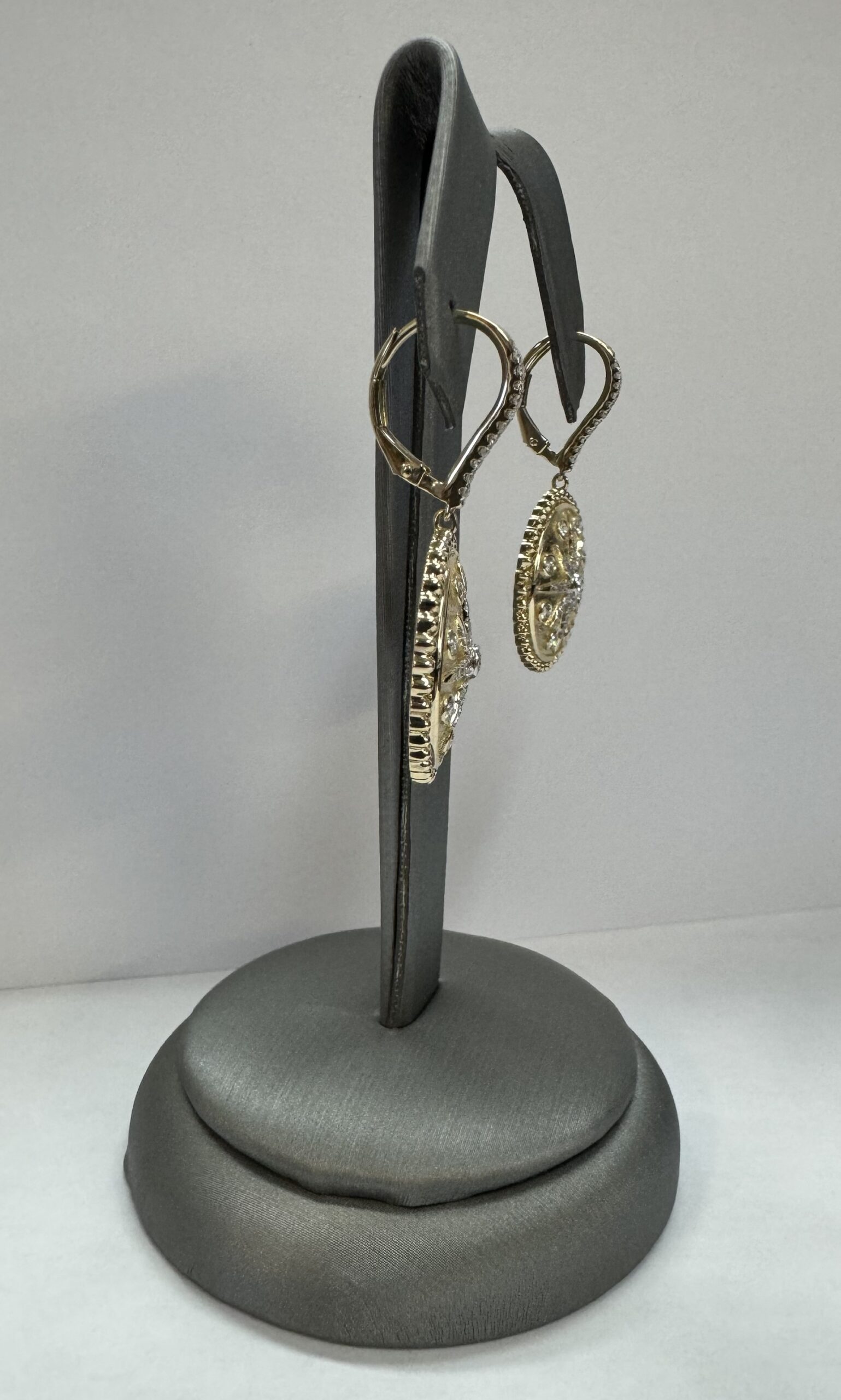 Ugh, THESE ones are just stunning! 14k yellow gold 21 mm disc dangle lever back earrings enhanced with .41 cttw of genuine Full Cut diamonds & .33 cttw of genuine Single Cut diamonds. These average G in color and SI1 in clarity. These earrings have an entire weight of 7.5 grams. Only one pair available.